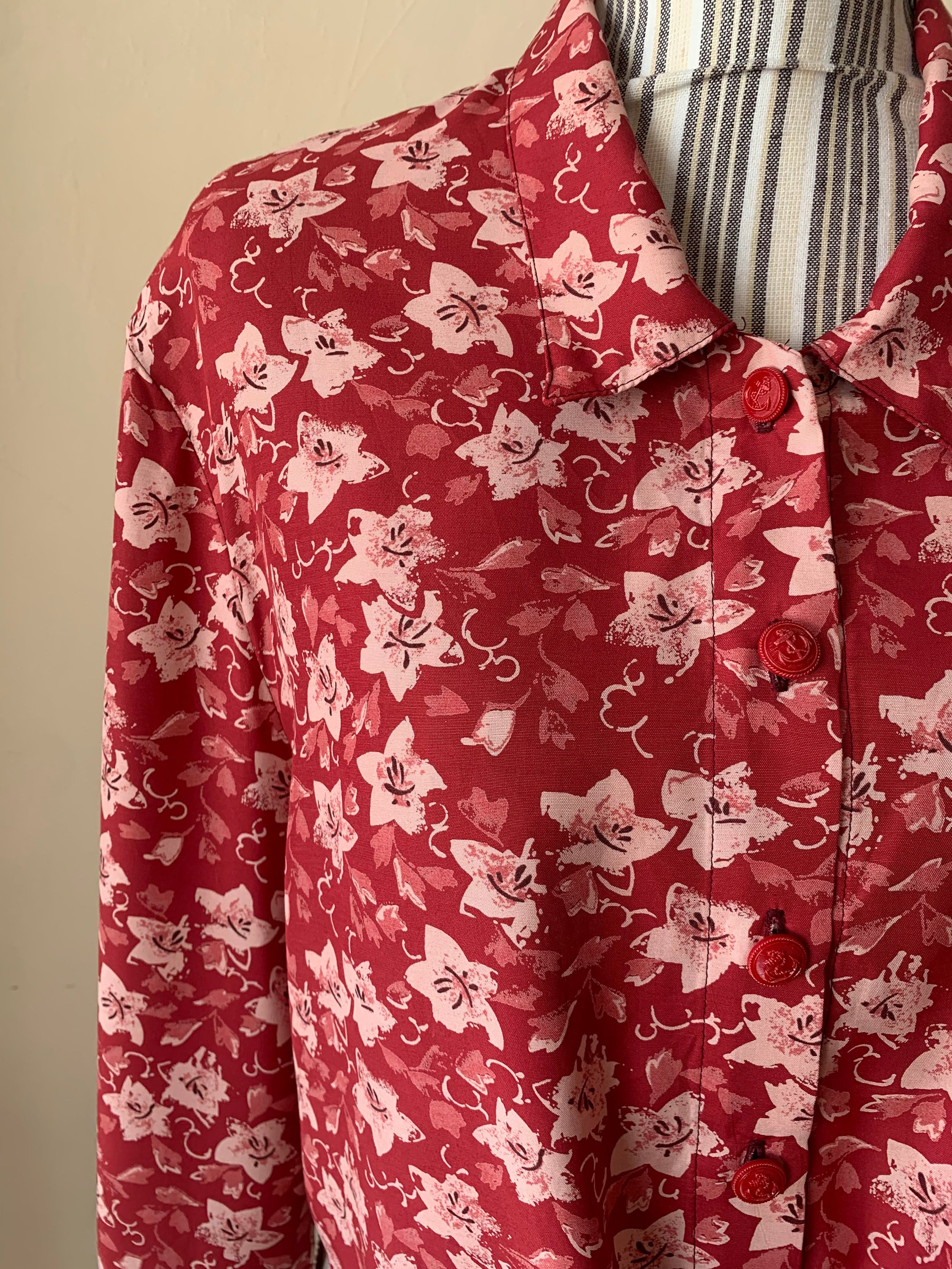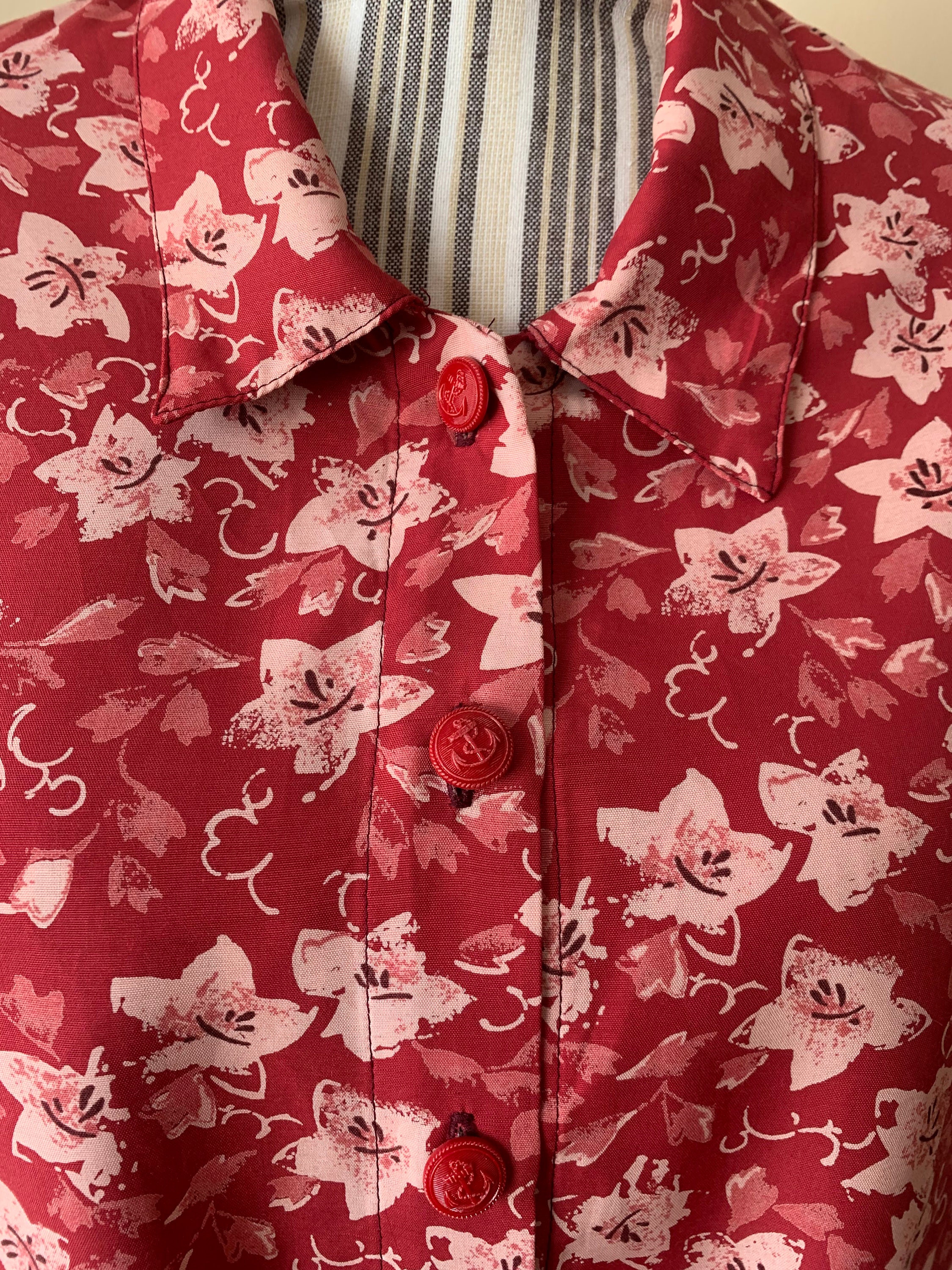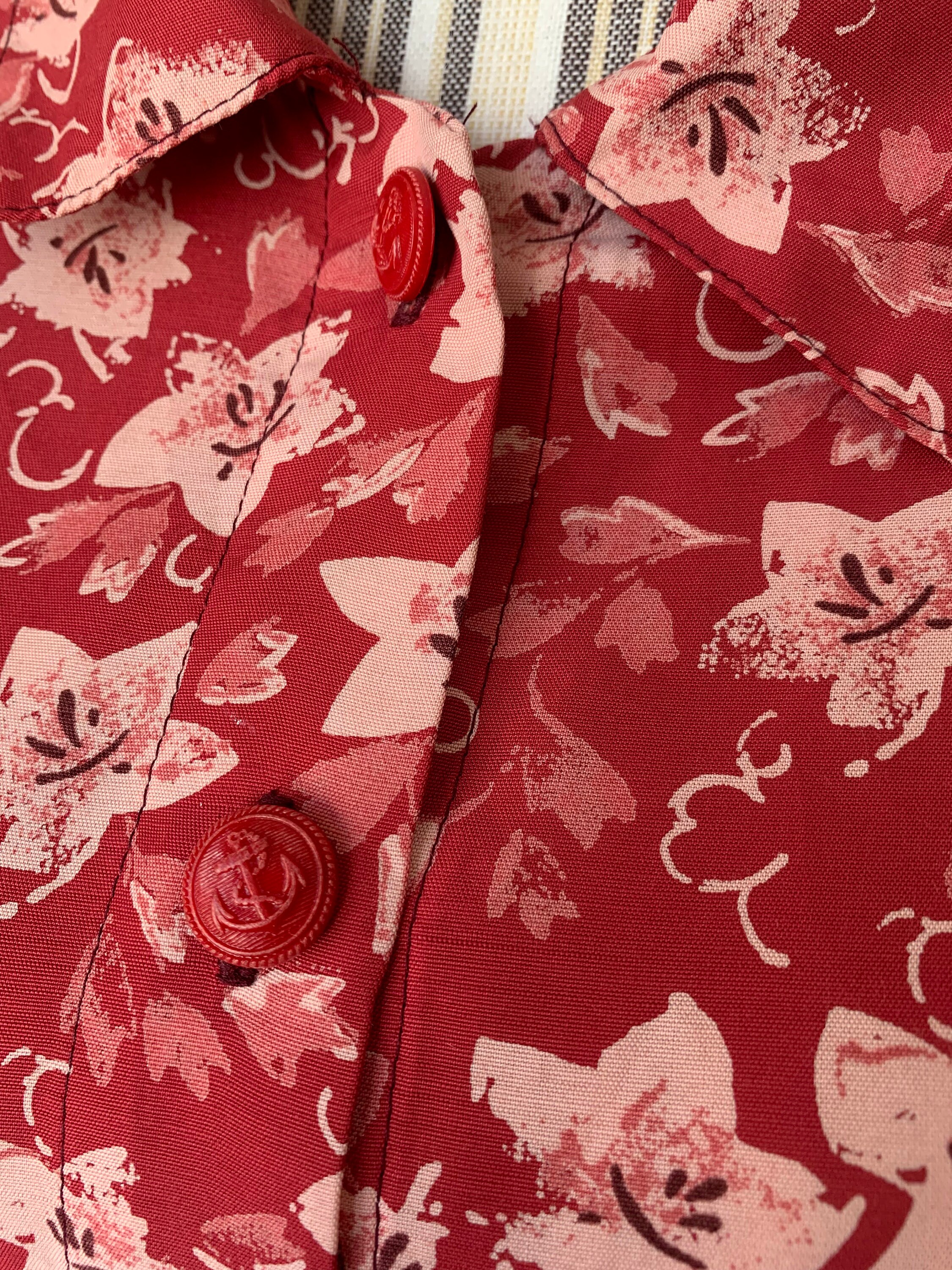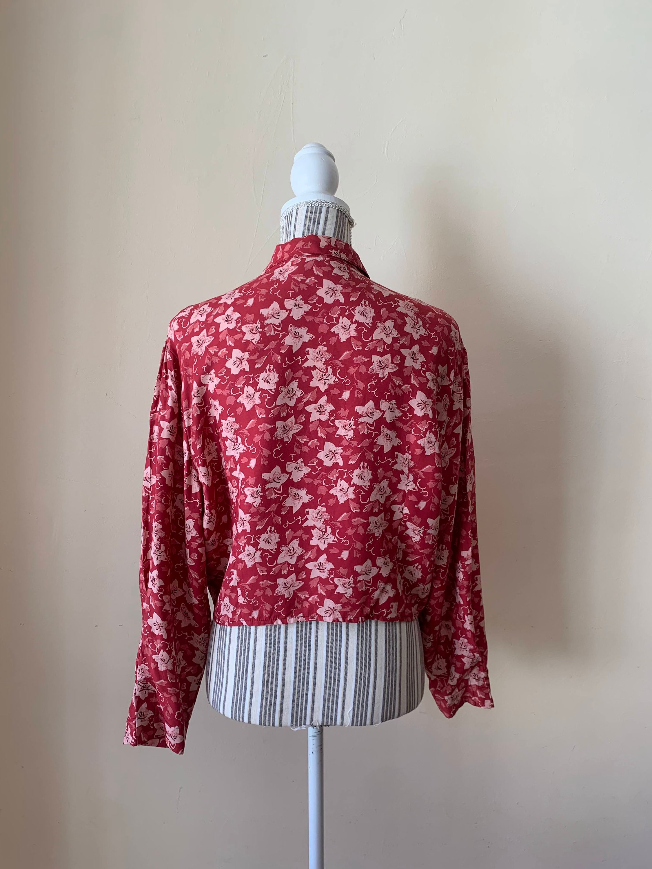 This is a vintage 90s red floral button front shirt for women which ties at the front. Be unique and get all eyes on you with this pretty sexy button front cropped shirt. This tie front crop top has cut red buttons with anchors. The print of this long sleeve collared shirt represents small pink flowers on bold red background. The silhouette of this red button front top is relaxed. This loose fit blouse has no tags or labels. The fabric feels like viscose, it is lightweight and has a nice flow, it is perfect for the spring summer season. There is no size marked, however this tropical print shirt fits like size M or L.
