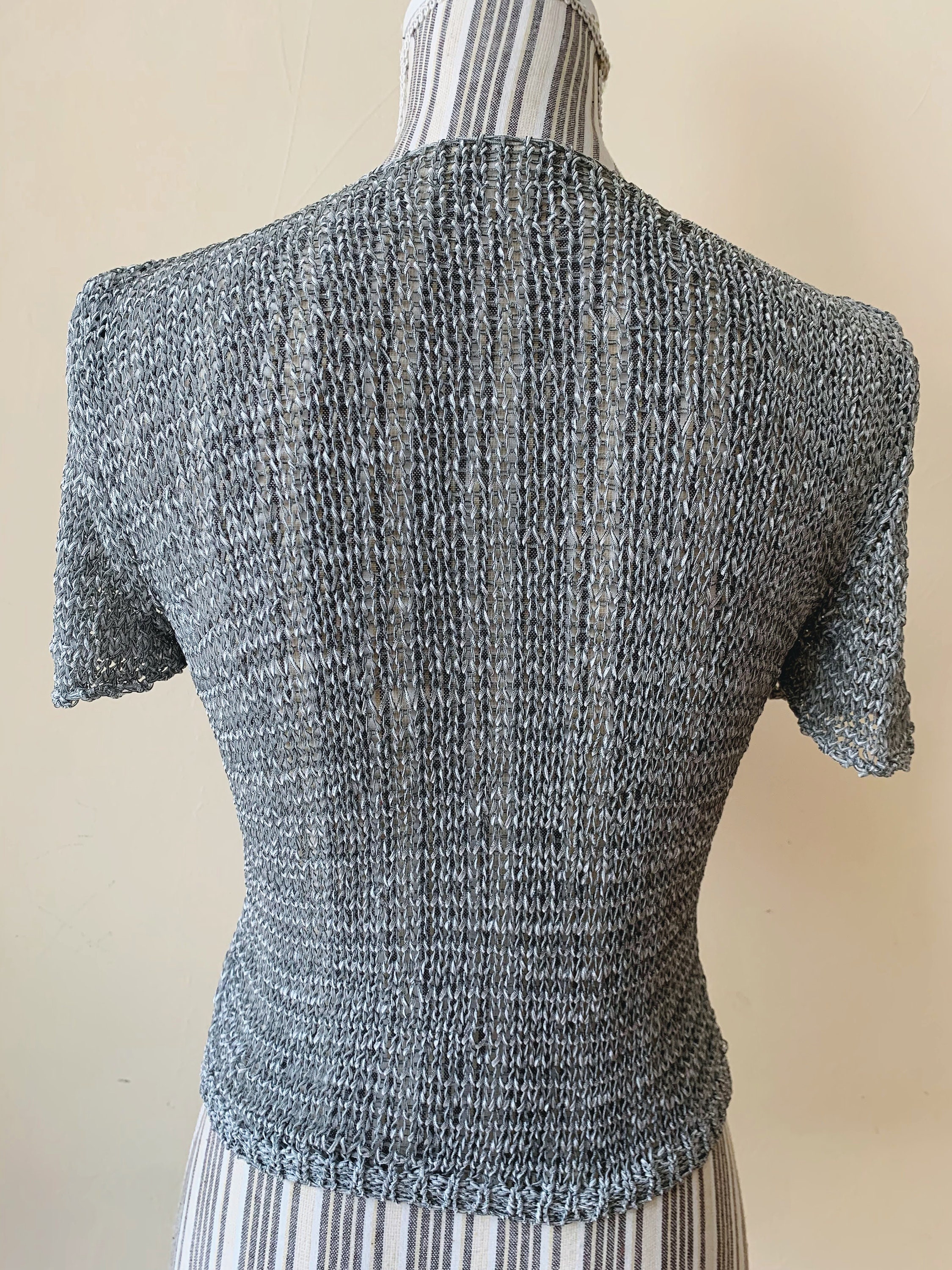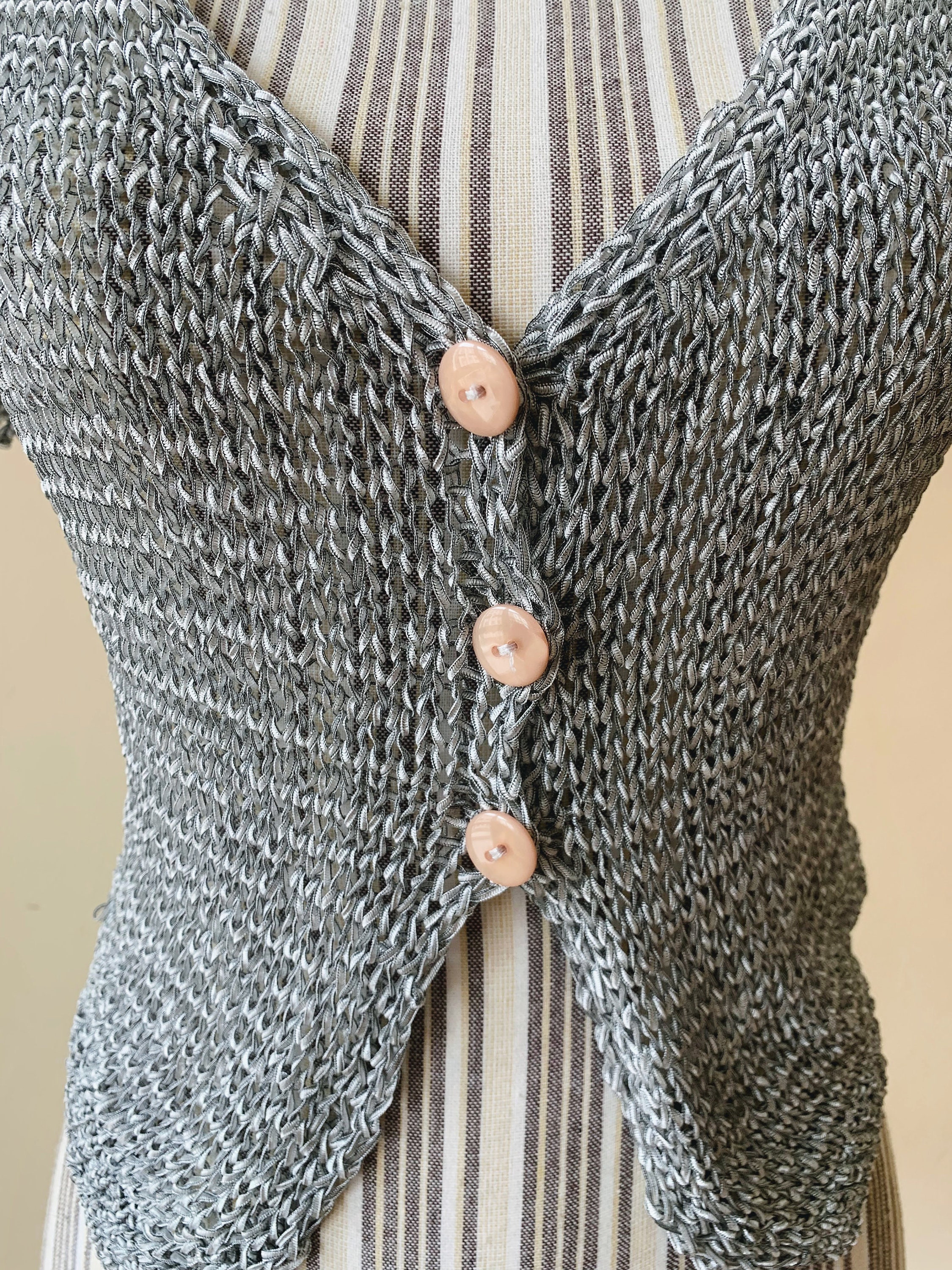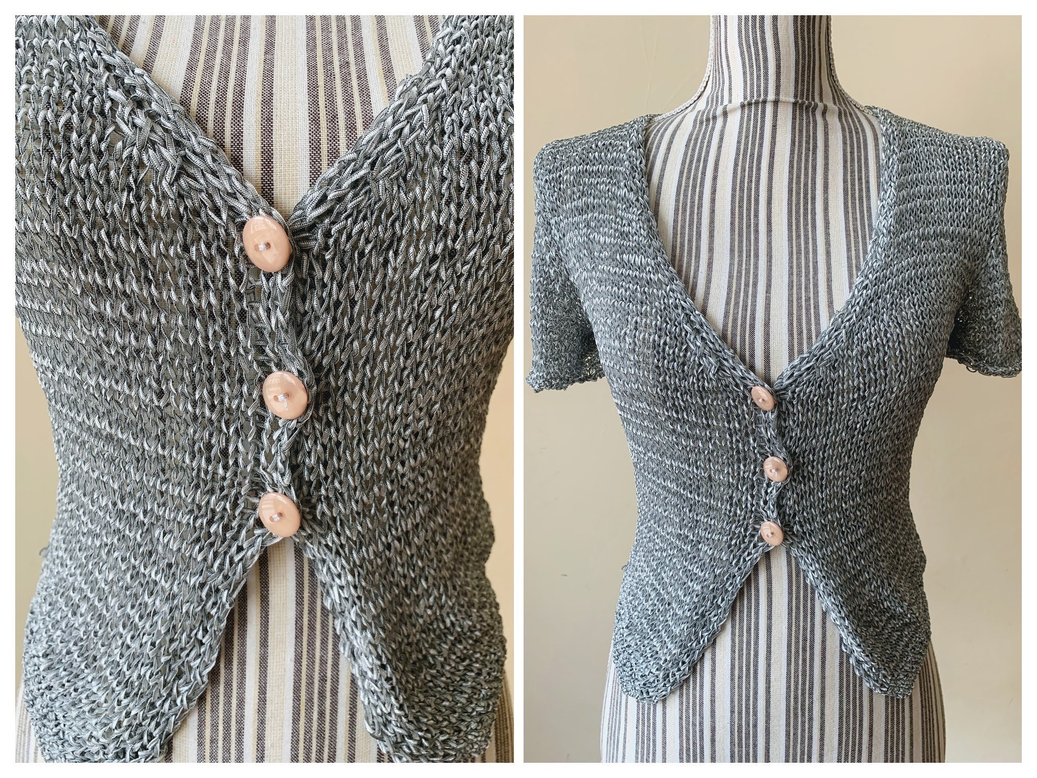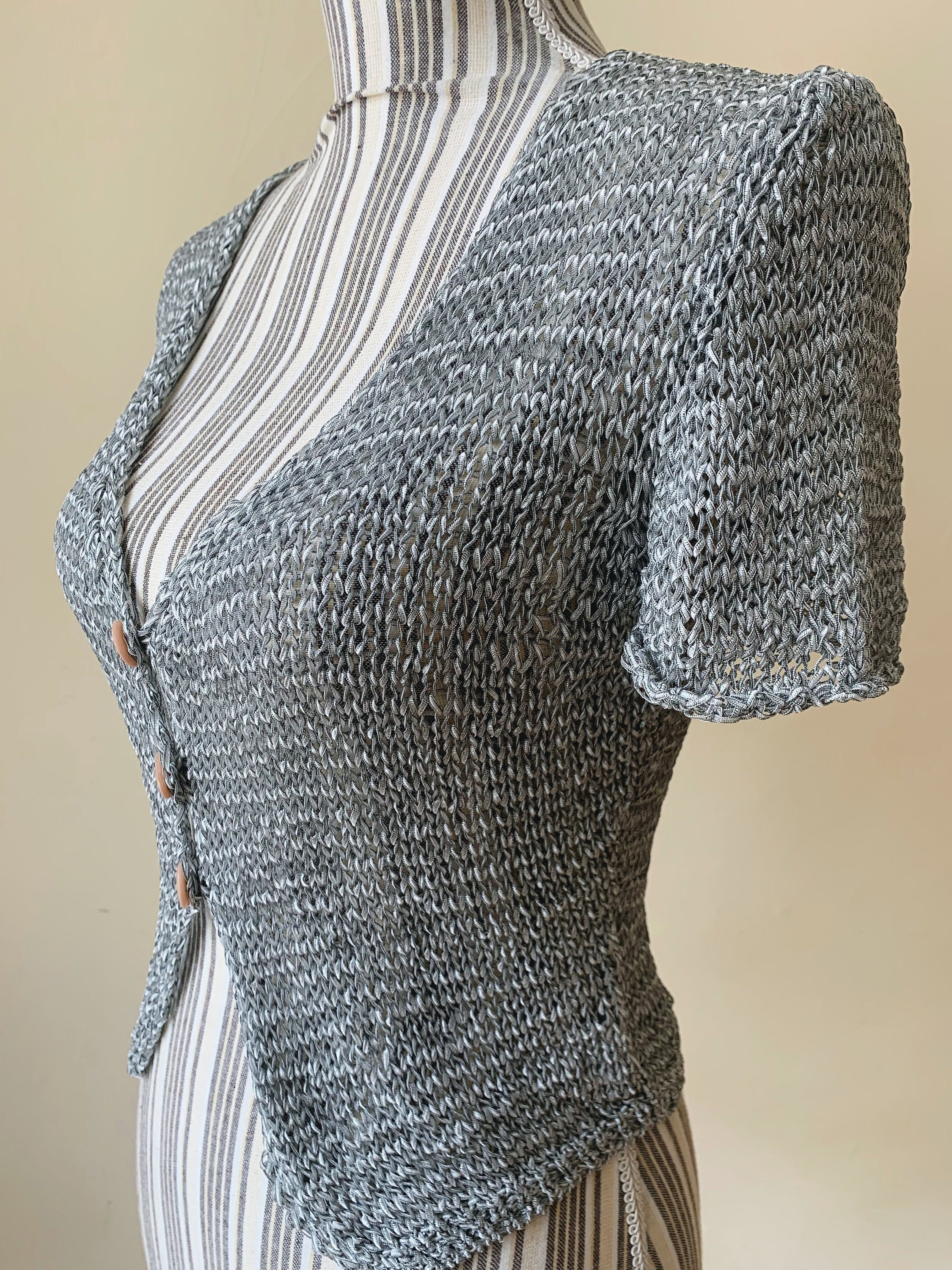 This is a beautiful vintage knitted button down cardigan for women. This cropped cardigan is made of 50% viscose and 50% polyamide. The thread is in silver grey color. This see through knit blouse has short sleeves and V neck. This simple cropped cardigan was made in Italy. There is no size marked, this knitted crop top fits like size S. Please check the measurements below.