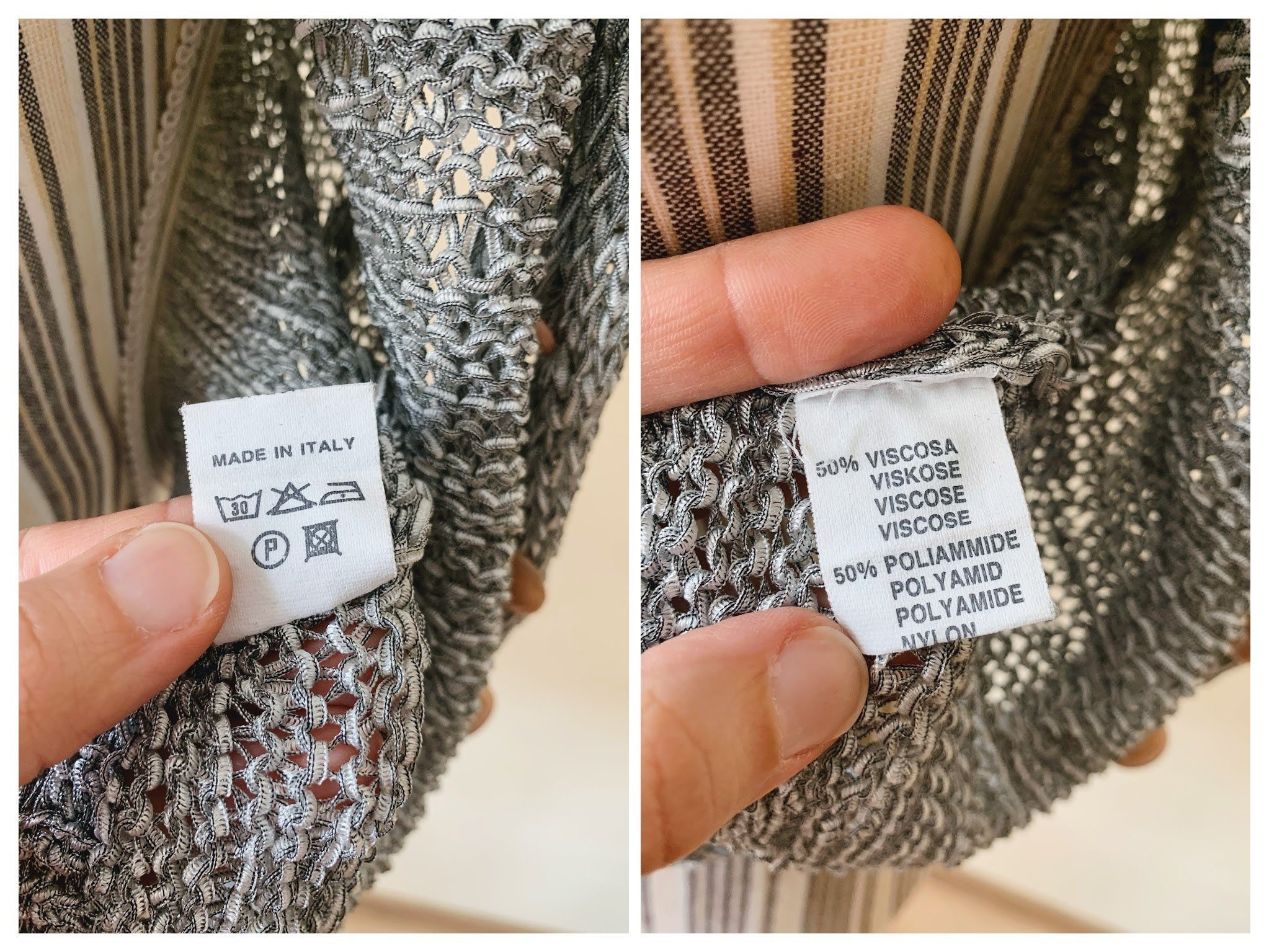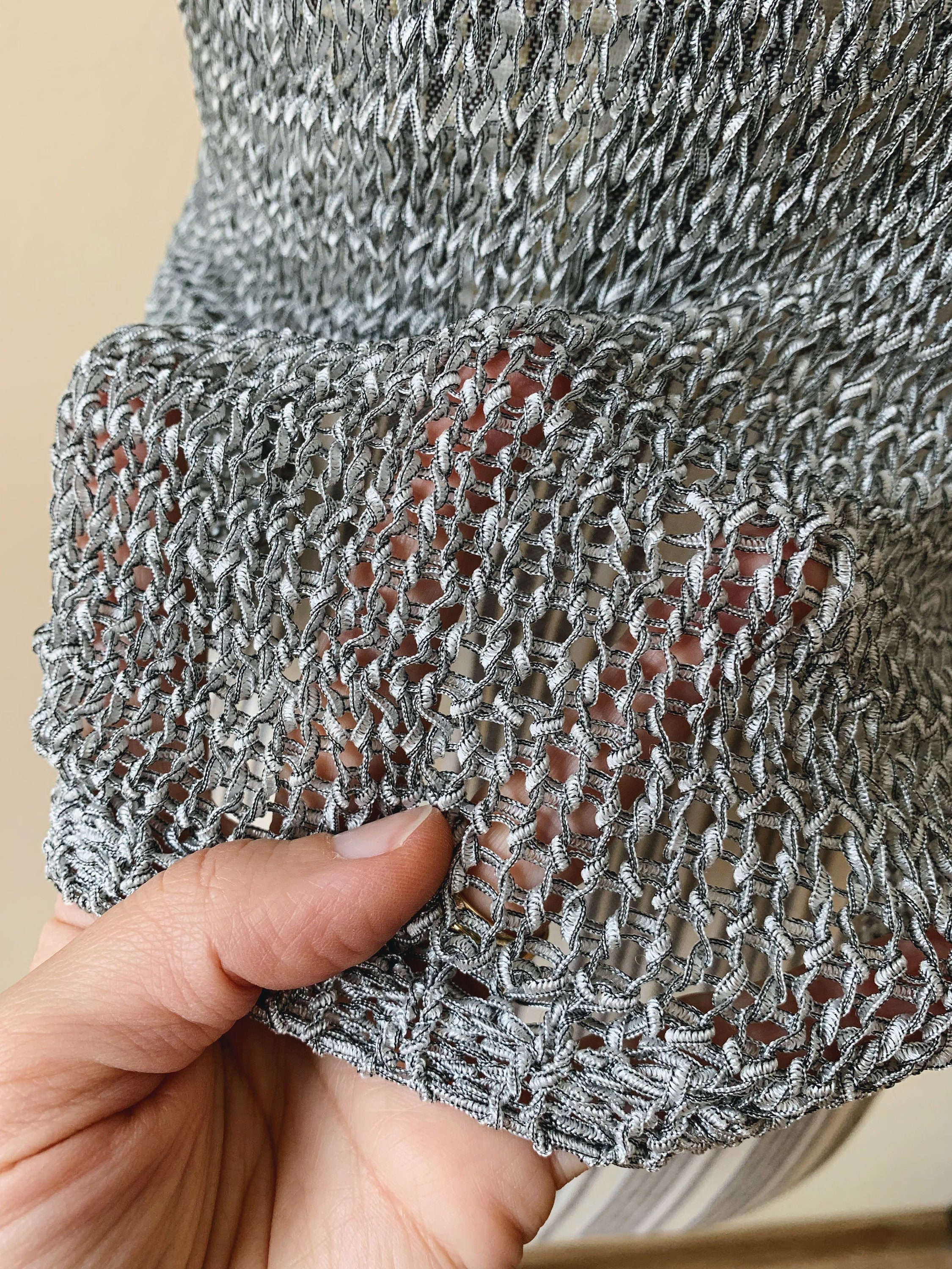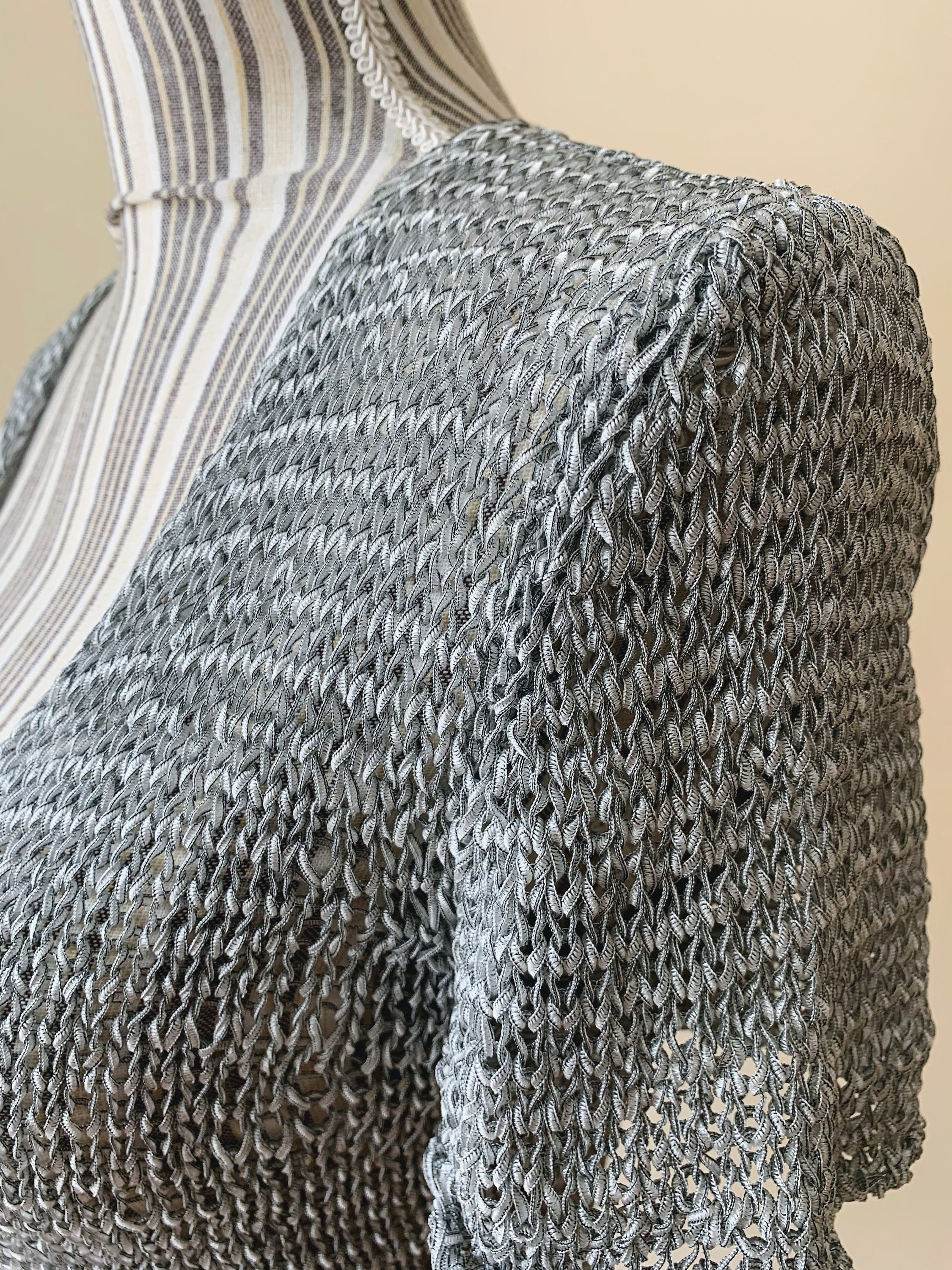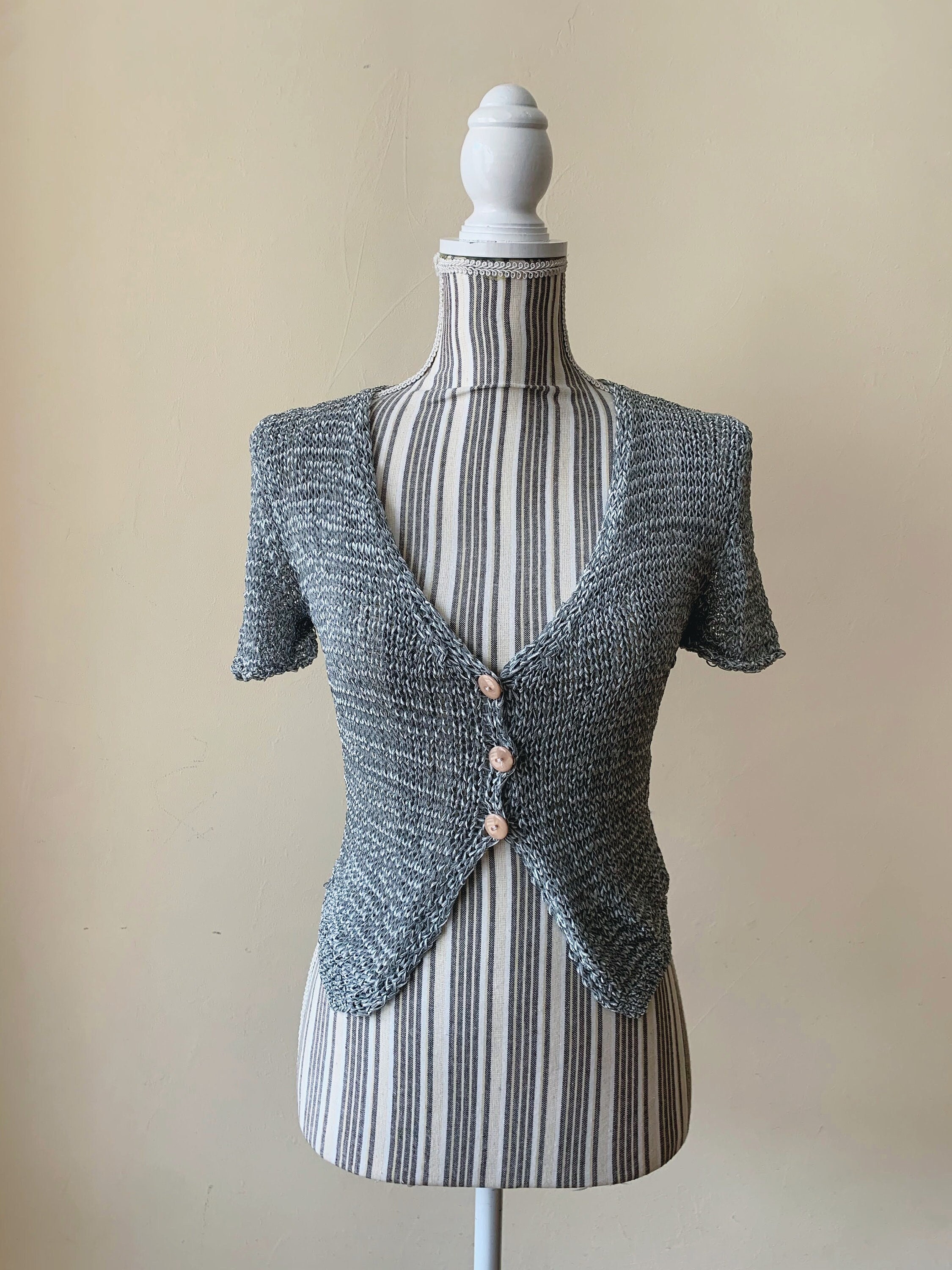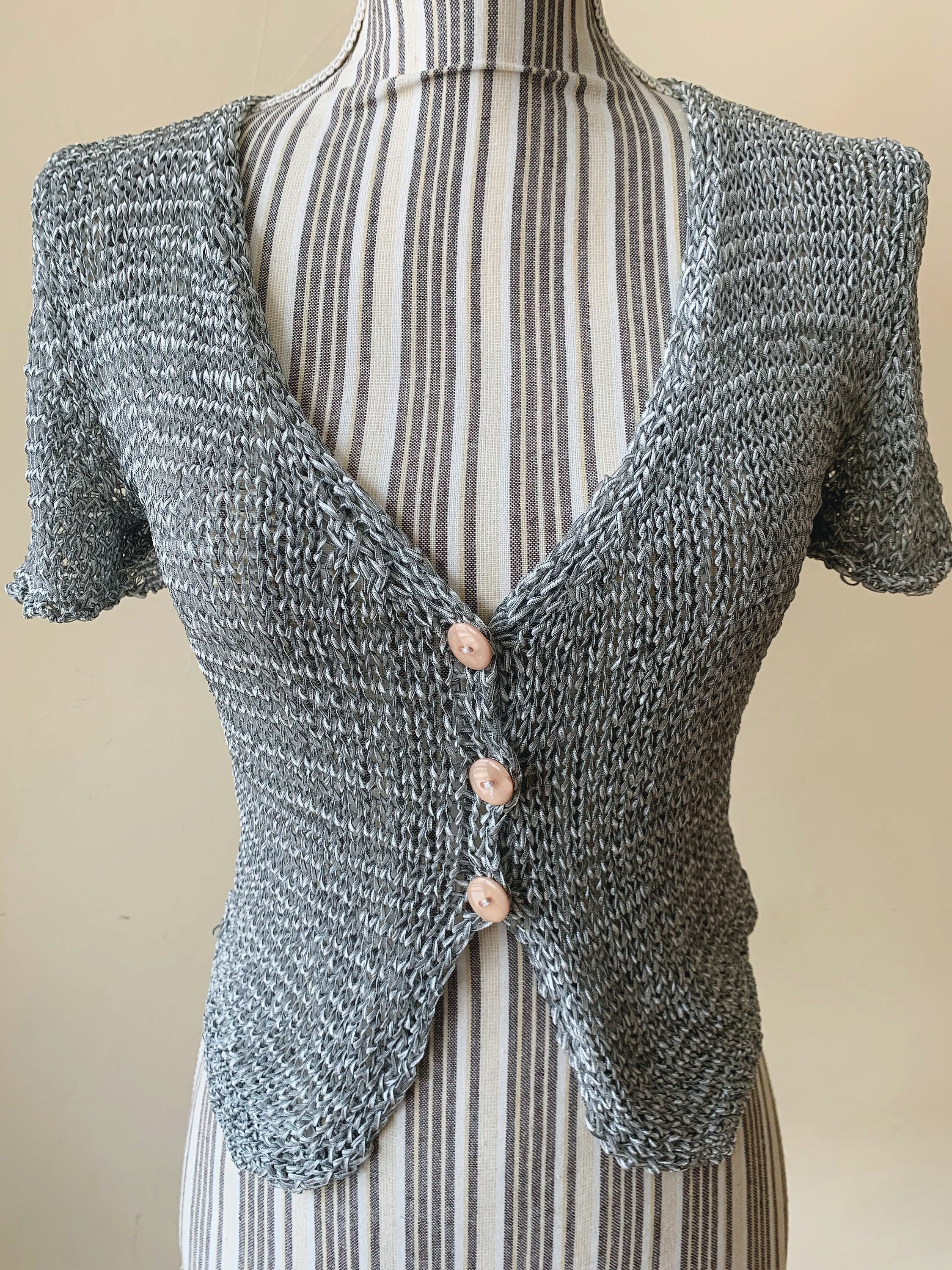 This is a beautiful vintage knitted button down cardigan for women. This cropped cardigan is made of 50% viscose and 50% polyamide. The thread is in silver grey color. This see through knit blouse has short sleeves and V neck. This simple cropped cardigan was made in Italy. There is no size marked, this knitted crop top fits like size S. Please check the measurements below.