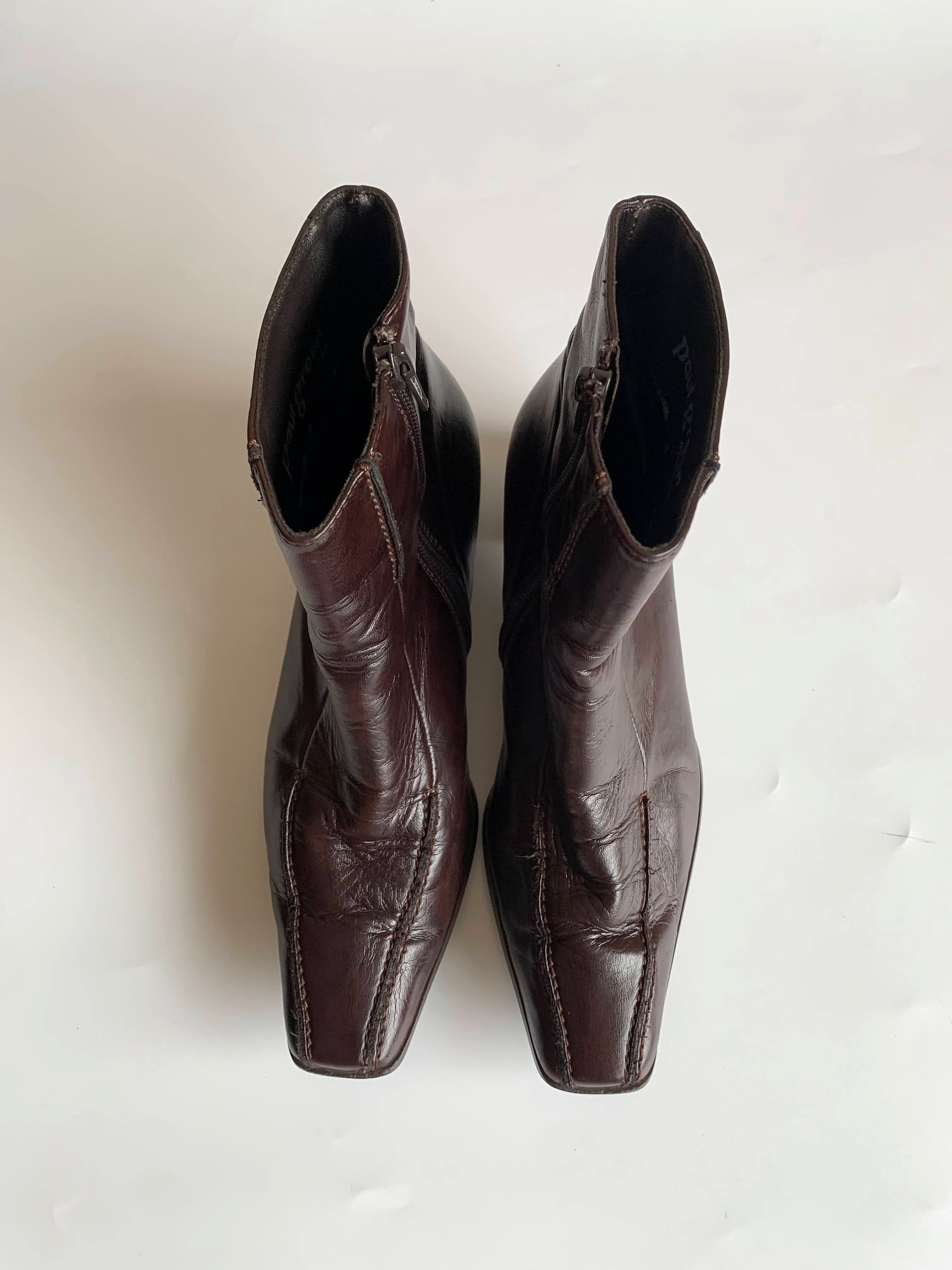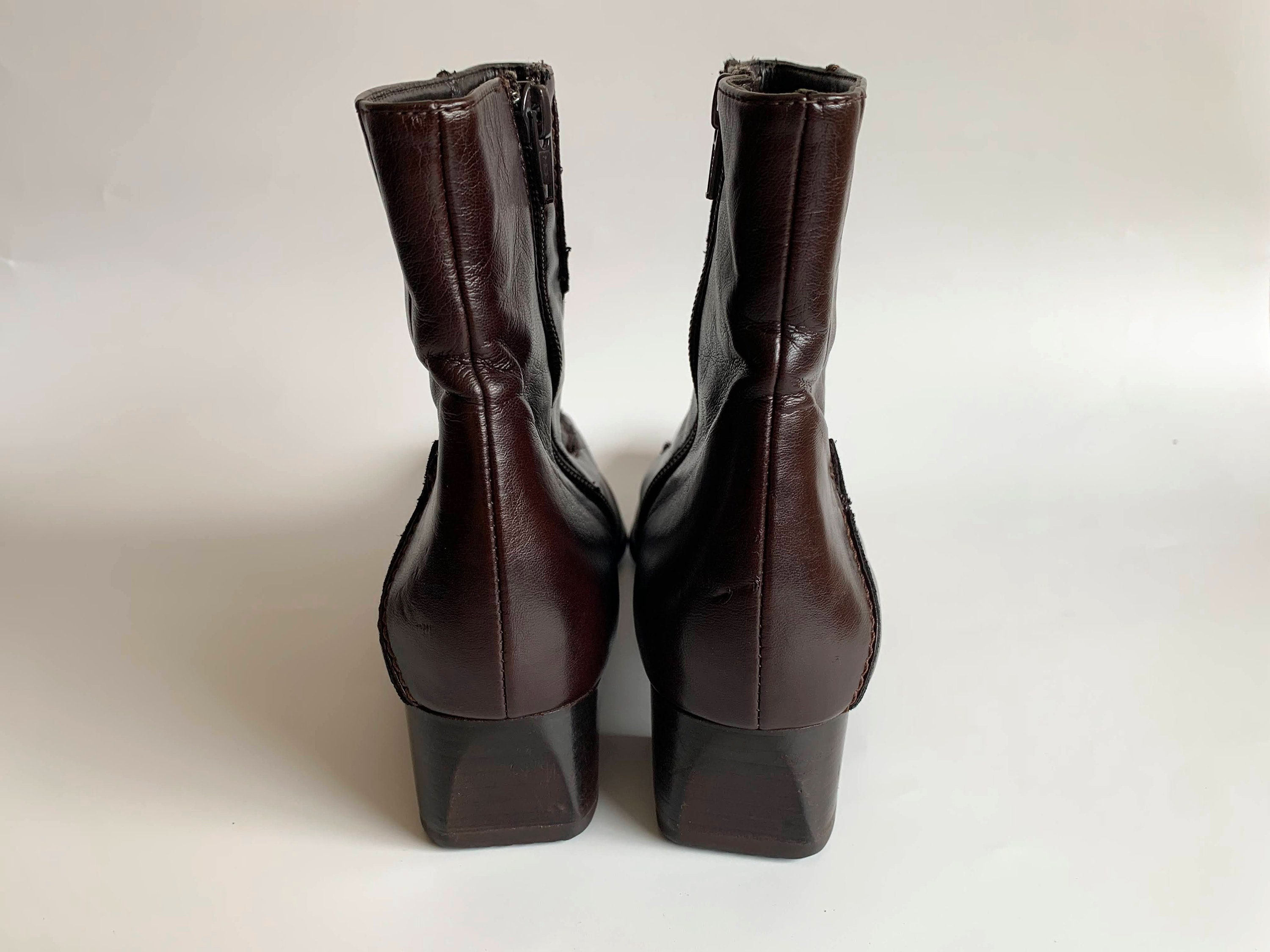 These are vintage Y2K brown leather ankle boots for women by Paul Green. These real leather zip up boots have low block heels and square toes with decorative stitching. These elegant low heel booties are made of genuine leather in chocolate brown color. These styish boots have rubber soles and faux leather lining inside. Perfect leather ankle boots for the spring fall season. The size marked on these leather ankle boots is UK 4, but they probably fit more like UK 4 1/2, which fits like EUR 37 1/2, US 6 1/2. Please check the measurements below.