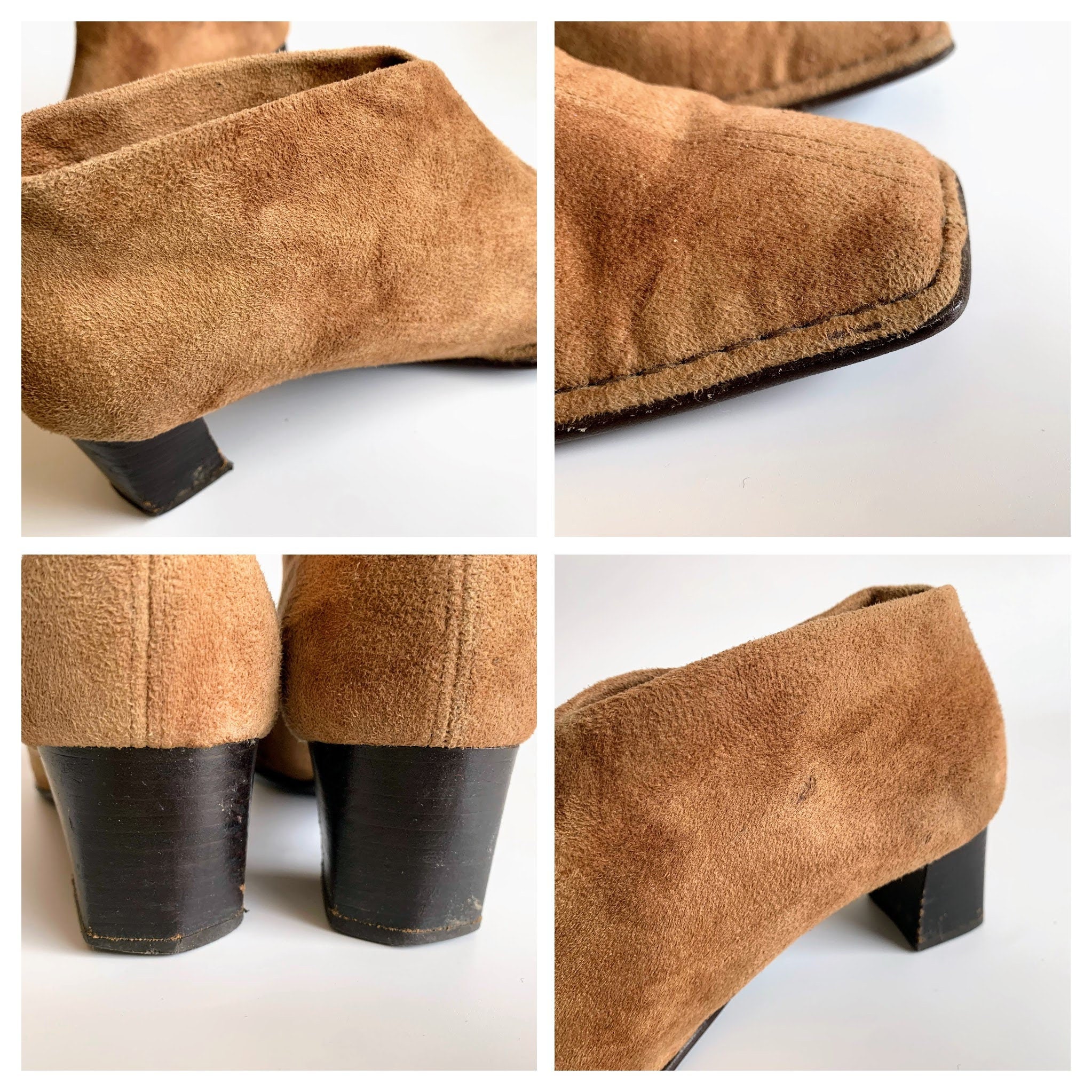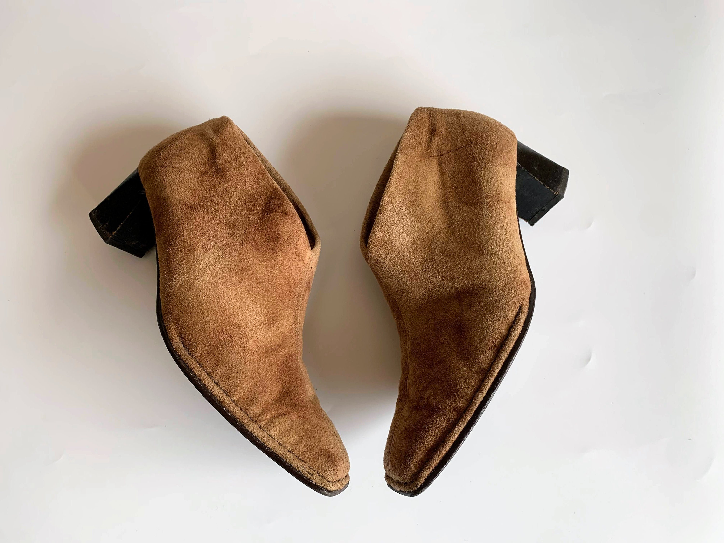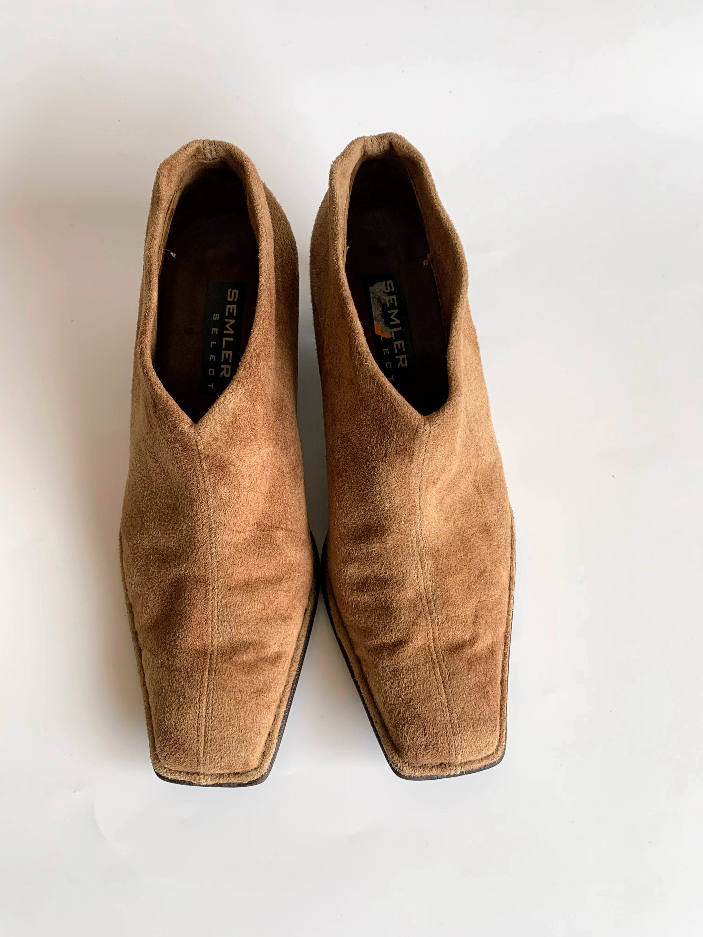 These are vintage 90s Y2K faux suede leather ankle booties by the brand Semler. These ankle slip on shoes for women are made of faux suede upper part, genuine leather interior and rubber sole. The size marked on the leather lining is UK 3 1/2, however these square toe loafers fit a little bigger. These slip on shoes fit more like UK 4, which corresponds to EUR 37, US 6. Please check the measurements below.