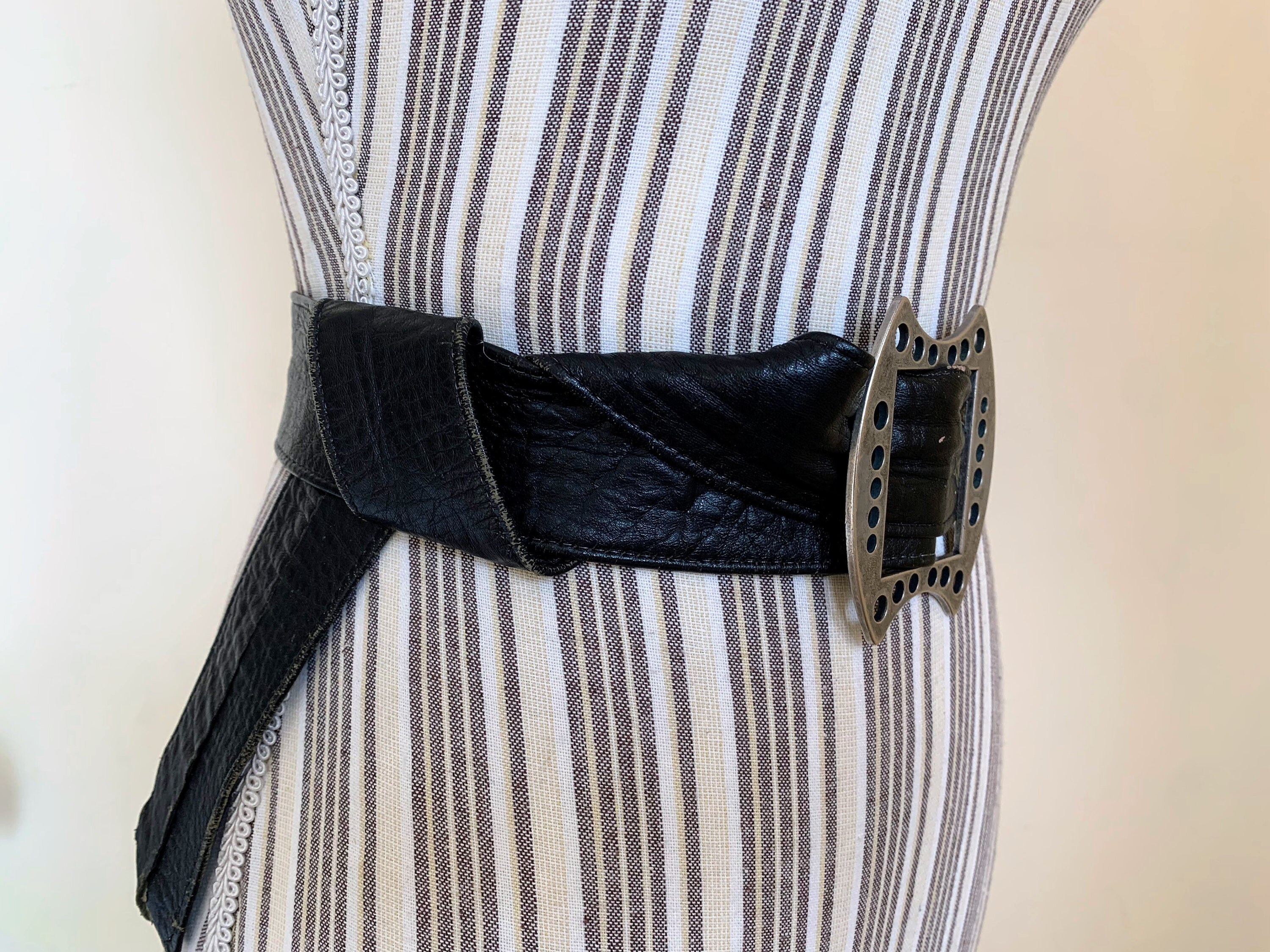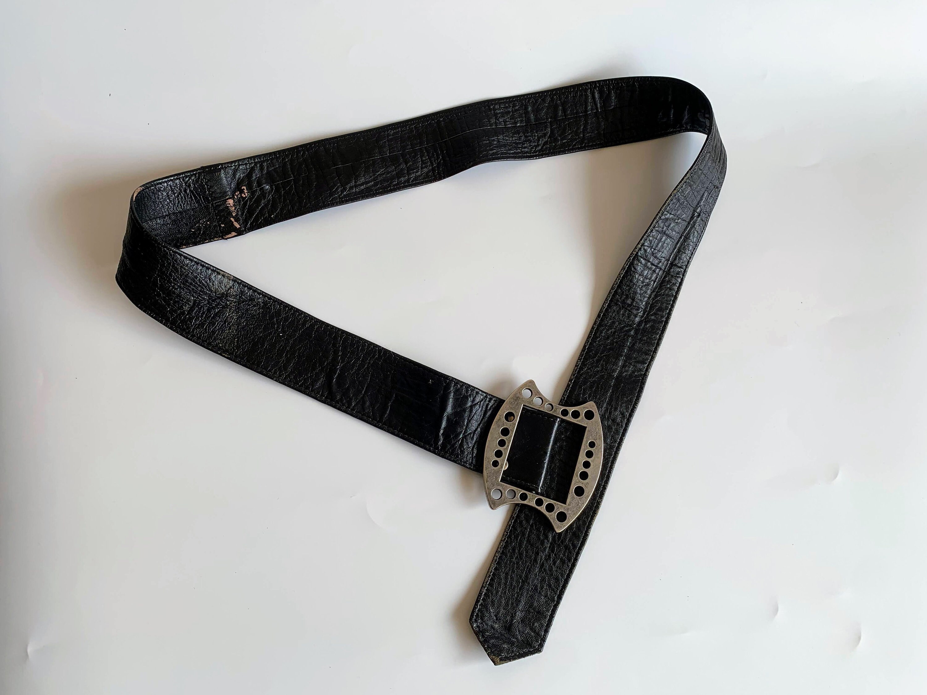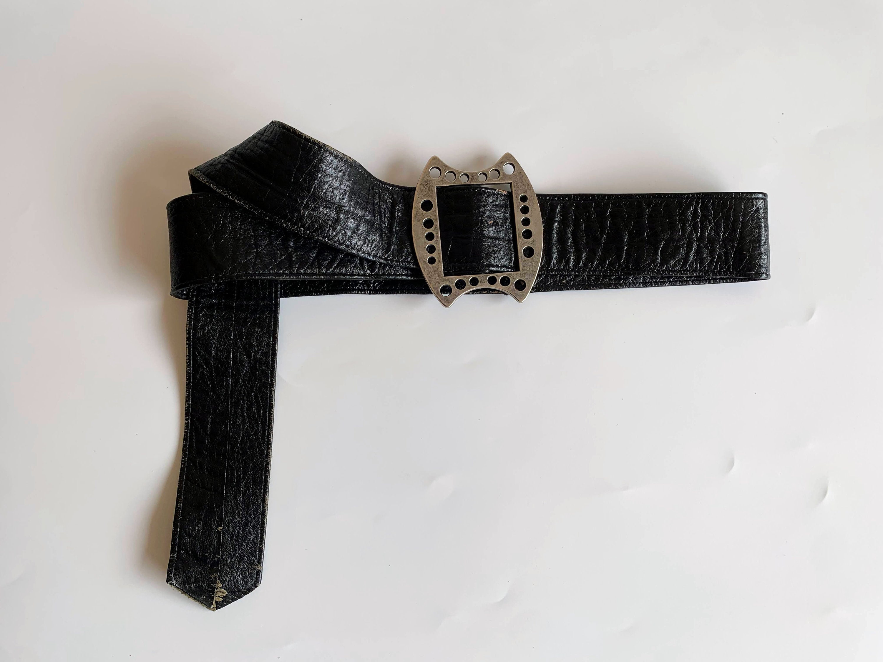 This is a soft leather belt for women with statement silver tone buckle. This rock belt is made of very soft genuine leather in jet black color which has a distressed leather look. This black leather belt has a unique eye catching buckle which gives this belt a more edgy look.. This vintage 90s genuine leather belt is perfect to wear as a trench coat belt or with jeans or perhaps a leather jacket that has belt looks. the total length of the belt strap is 43.3" / 110 cm, it would best fit waists up to 35.4" / 90 cm. This punk belt is 1.8" / 4.5 cm wide.