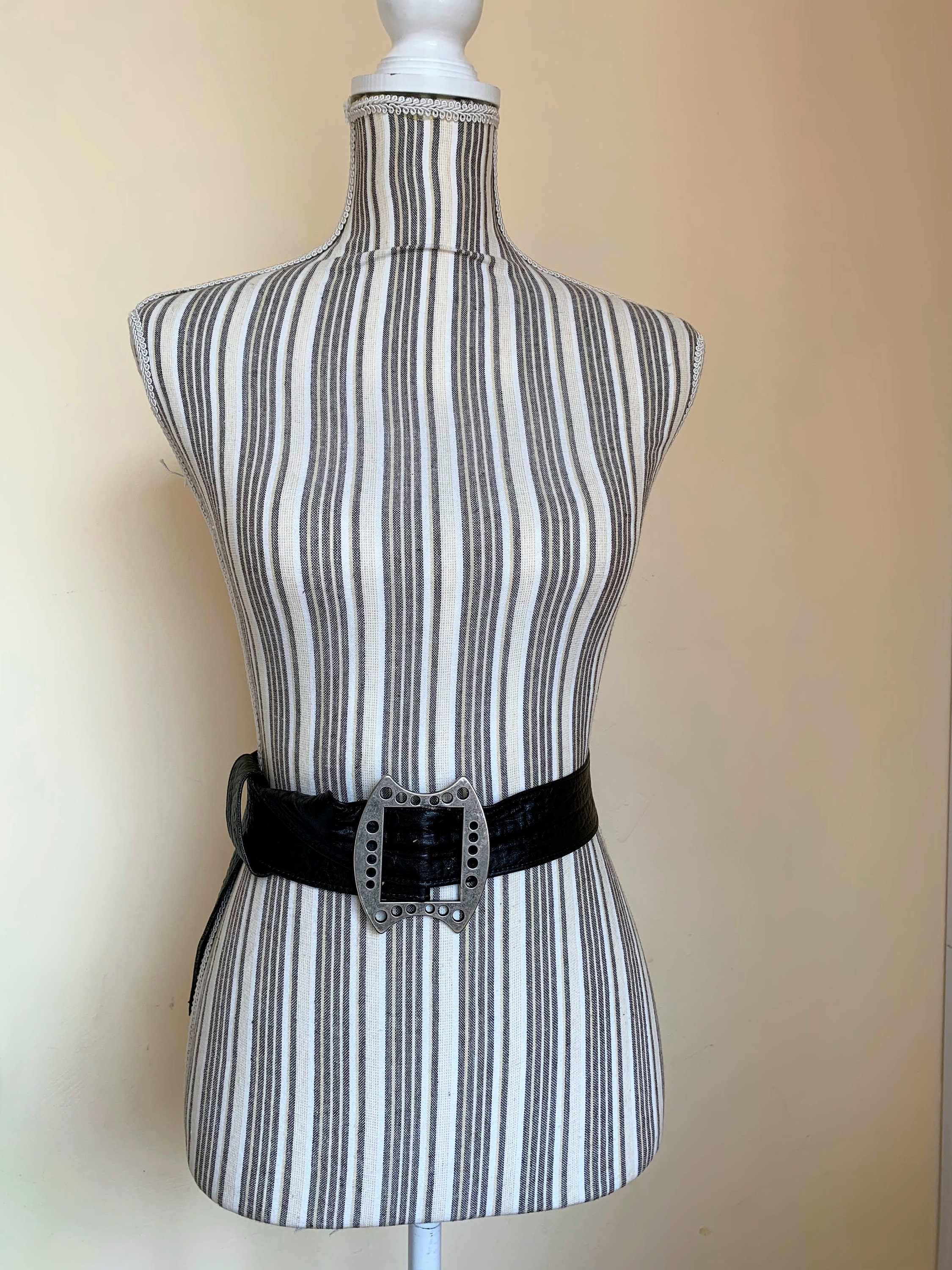 Condition: This soft leather belt has a distressed look. The leather has become softer with the wear. There are some marks on the genuine leather surface and some scratches on the silver tone buckle. There is no belt loop to hold the strap, so it's best to use the belt with a garment that has belt loops or else to tuck the belt in, as I have done on my mannequin.