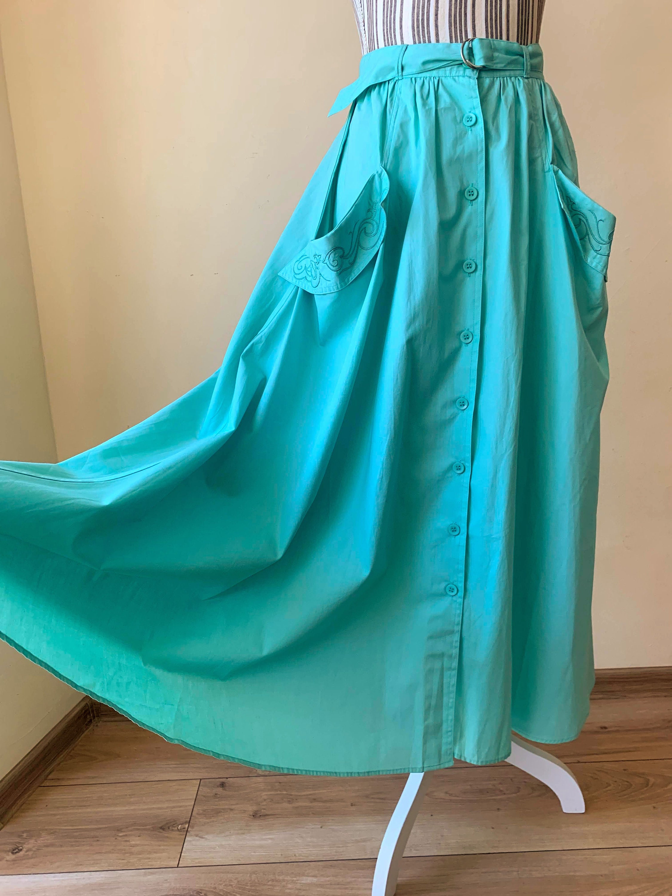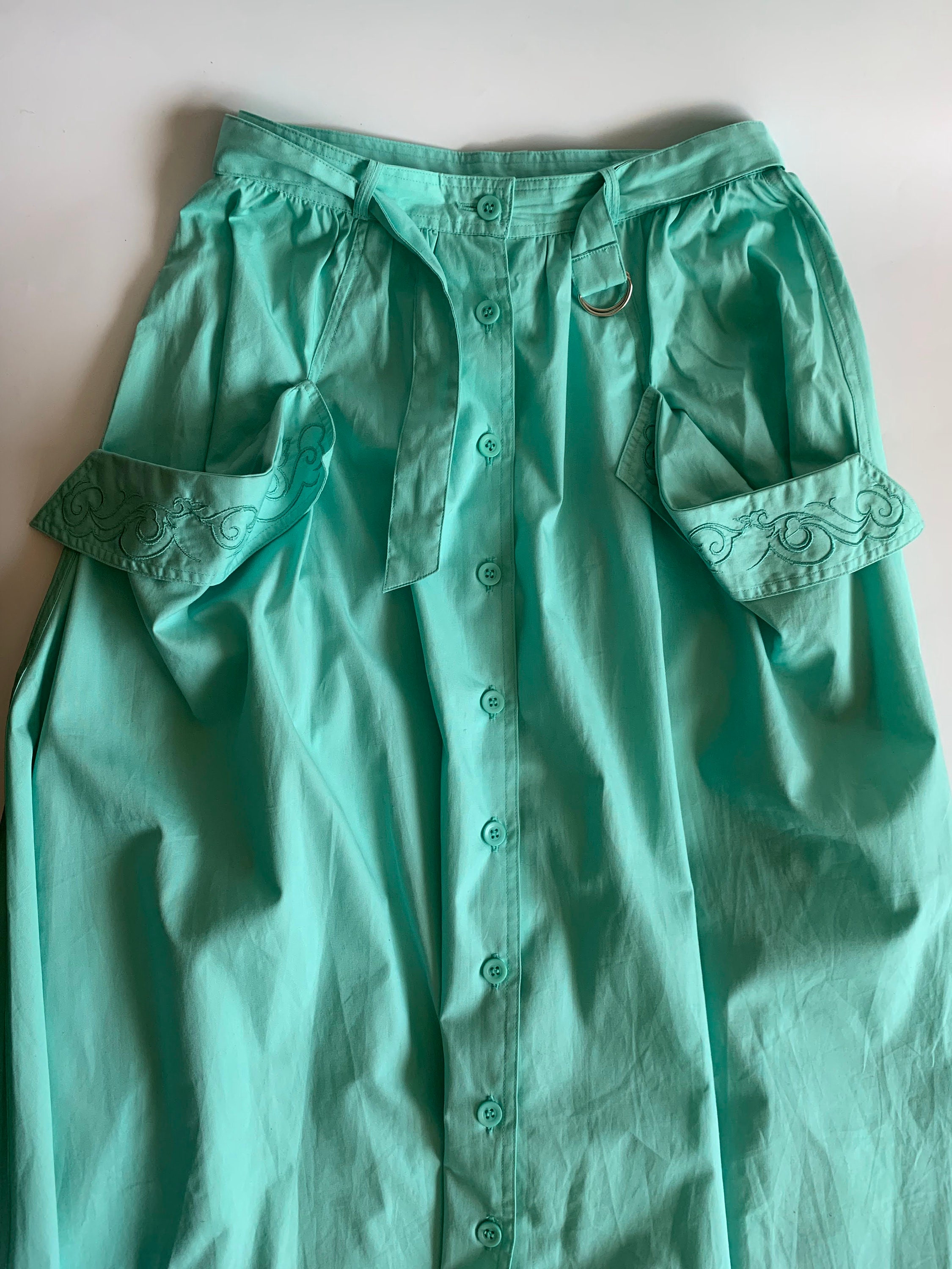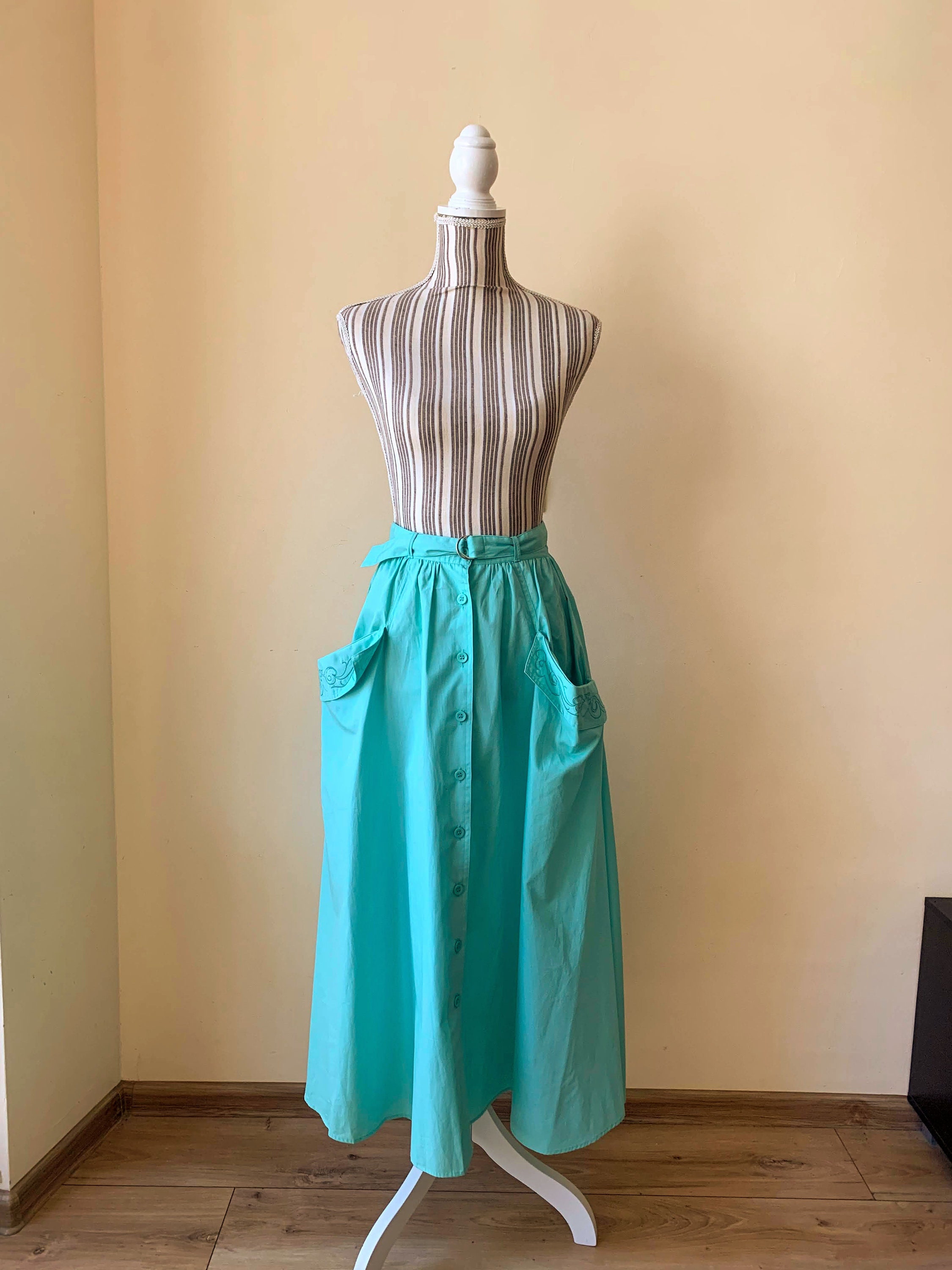 This is a pretty button front maxi skirt with a belt and side pockets with beautiful floral embroidery. This 50s style swing skirt falls to about the ankles. This pin up retro skirt is in lovely aquamarine color, light blue-greenish color. This long a line skirt is size 36, which fits like S. It is made of cotton fabric, which is awesome for the summer season. Please check the measurements below.
