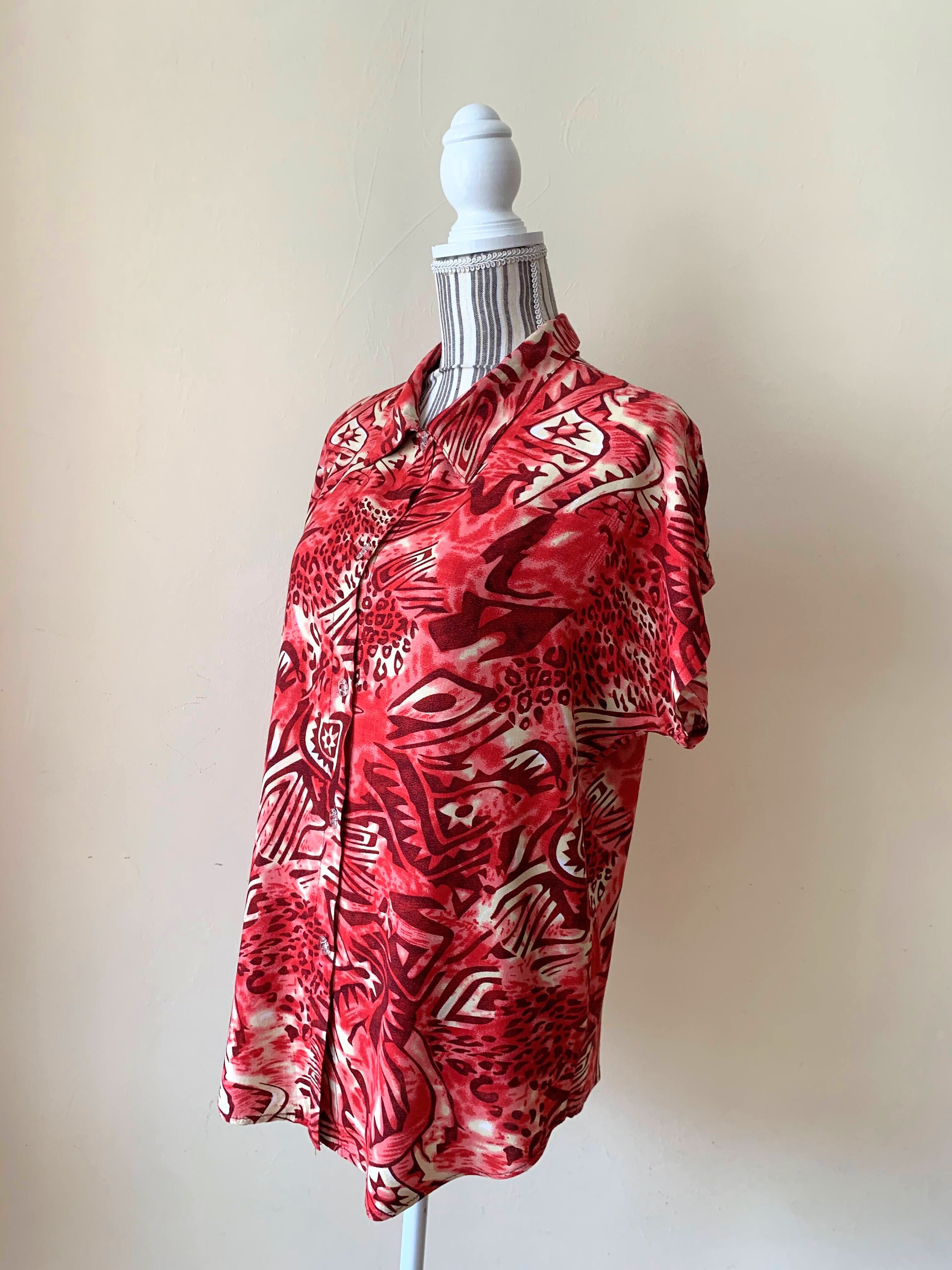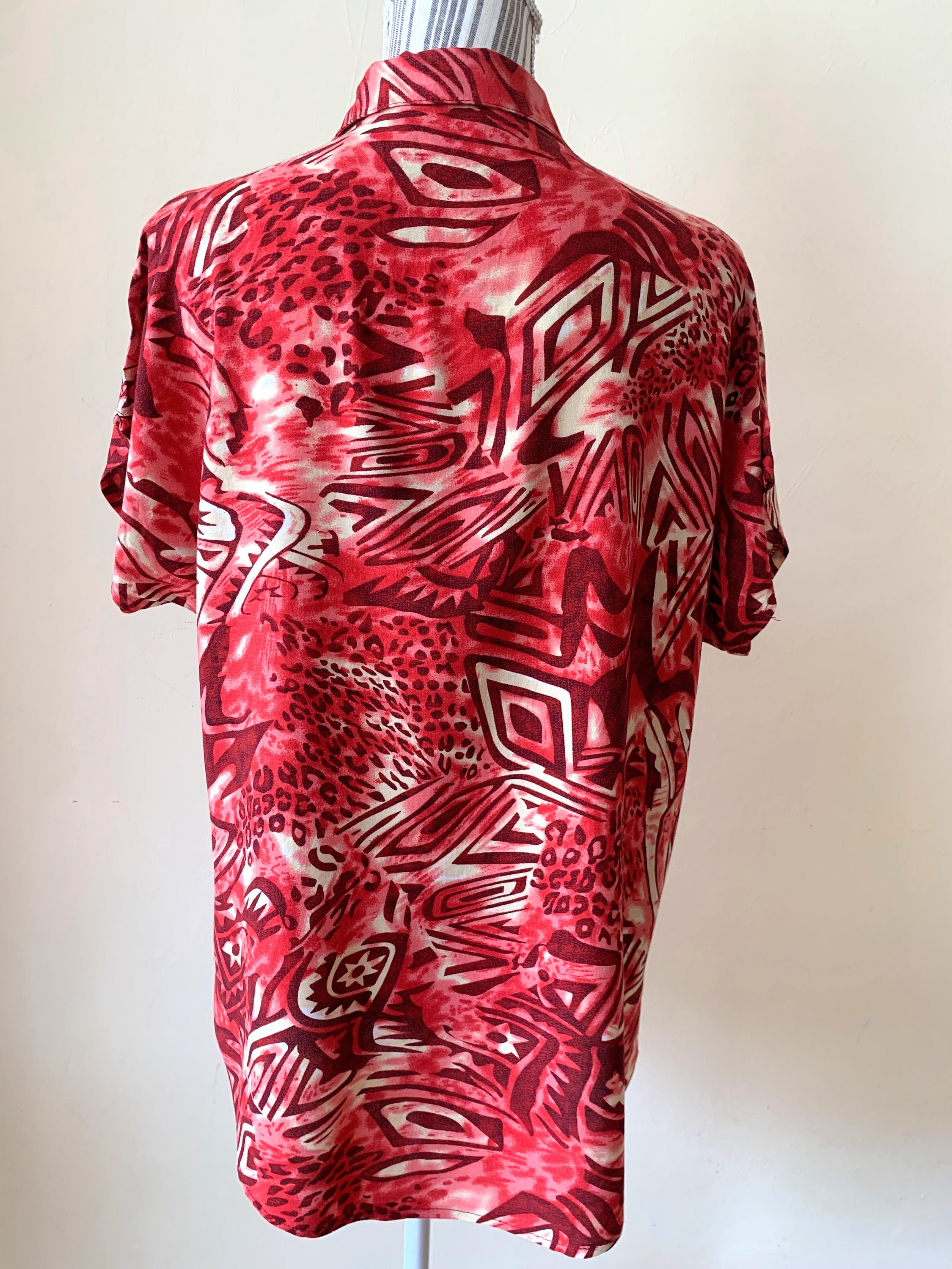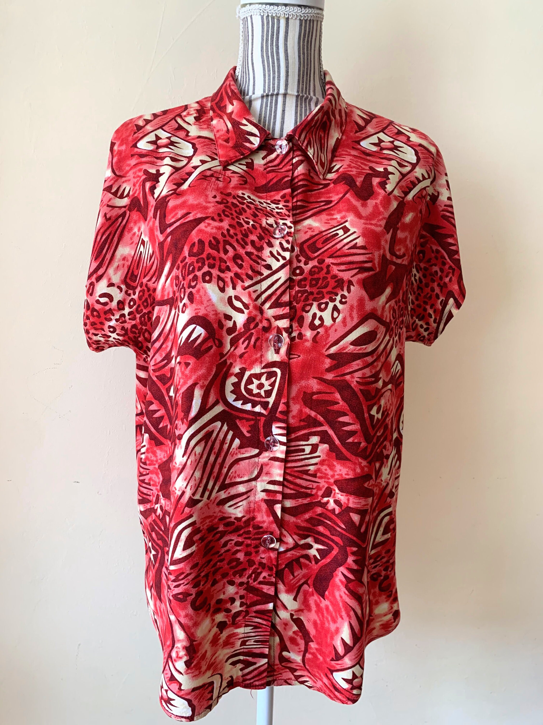 This is a beautiful vintage 90s loose fit shirt for women with button front closure and short sleeves. This boho style blouse is perfect for the summer with its relaxed silhouette. This short sleeve summer top has a lovely animal tribal print in red and pale yellow color. It has clear plastic buttons. This Indian style blouse is made of flowy 100% viscose fabric. Wonderful boho hippie shirt which will bring you back in those happy 90s days. This ladies festival shirt is size L. Please check the measurements below.