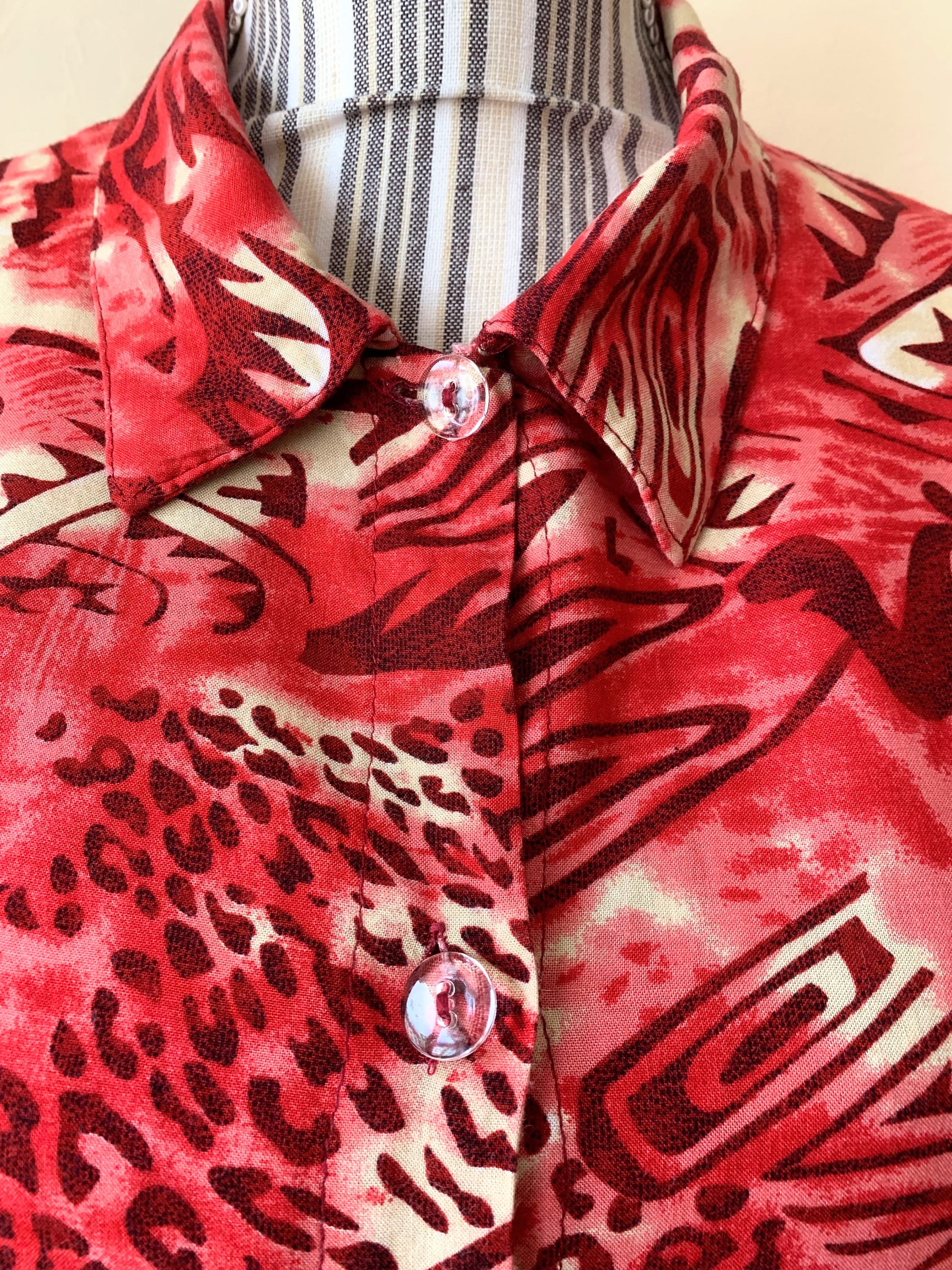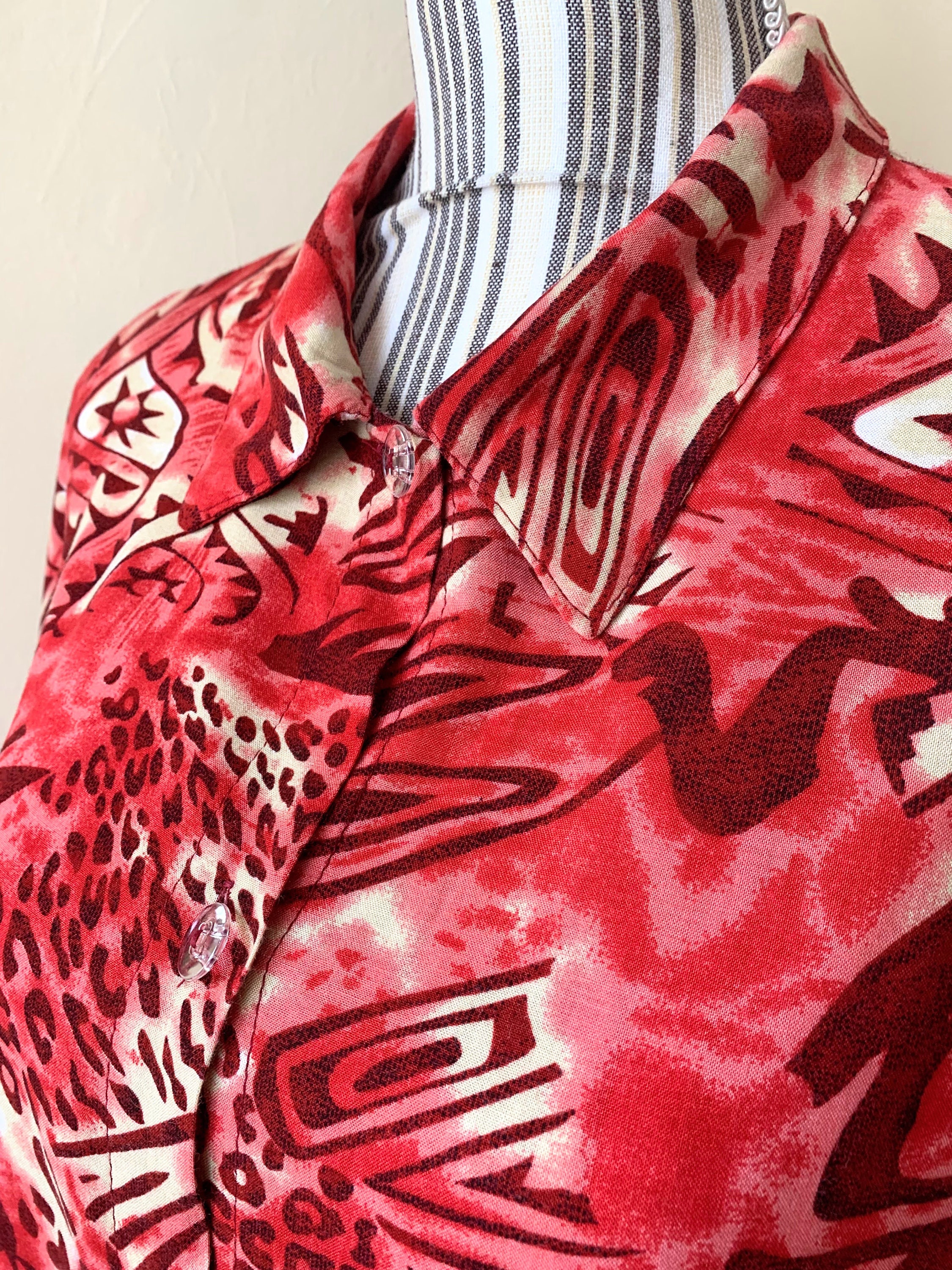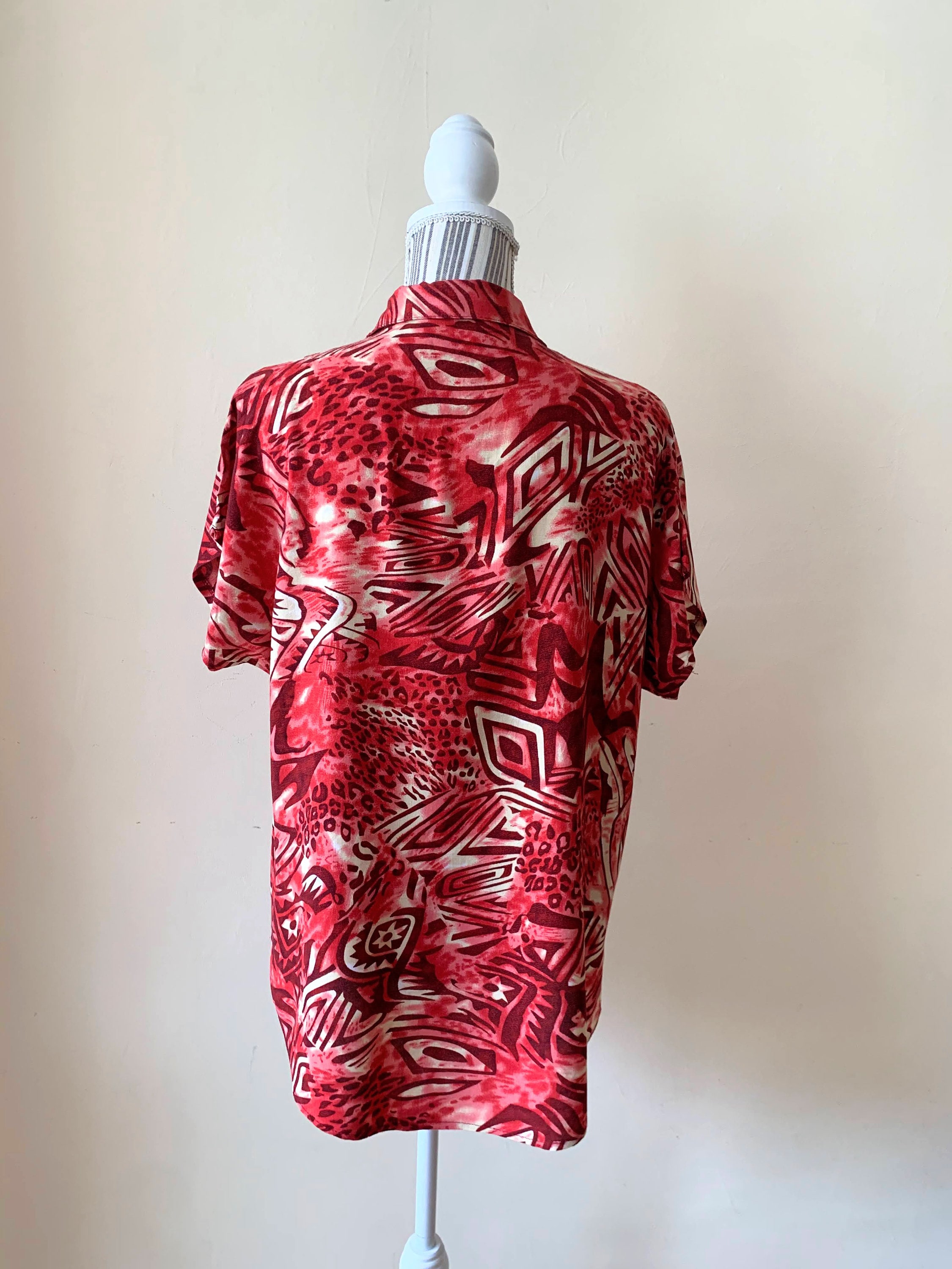 This is a beautiful vintage 90s loose fit shirt for women with button front closure and short sleeves. This boho style blouse is perfect for the summer with its relaxed silhouette. This short sleeve summer top has a lovely animal tribal print in red and pale yellow color. It has clear plastic buttons. This Indian style blouse is made of flowy 100% viscose fabric. Wonderful boho hippie shirt which will bring you back in those happy 90s days. This ladies festival shirt is size L. Please check the measurements below.