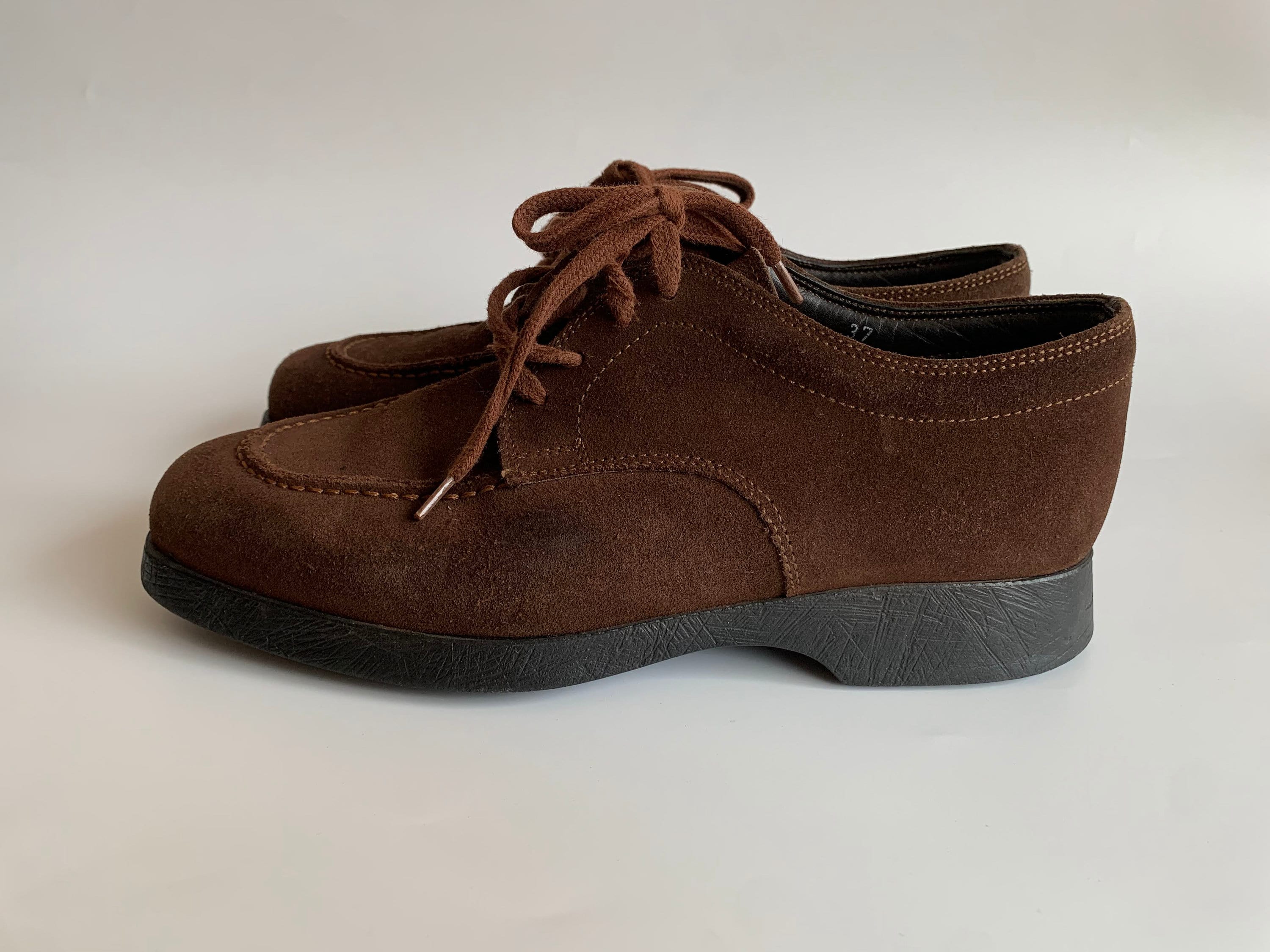These are beautiful vintage 90s suede leather lace up loafers for women size EUR 37. They fit like US 6, UK 4. Please check the measurements below. These brown suede flat leather shoes are super comfy to walk in. They are made of high-quality suede leather in rich brown color with rubber non slip soles. These tie up slip on shoes are amazing walking shoes that your feet will enjoy. These brown oxford shoes were made in Italy. They are by the brand Tarkus.