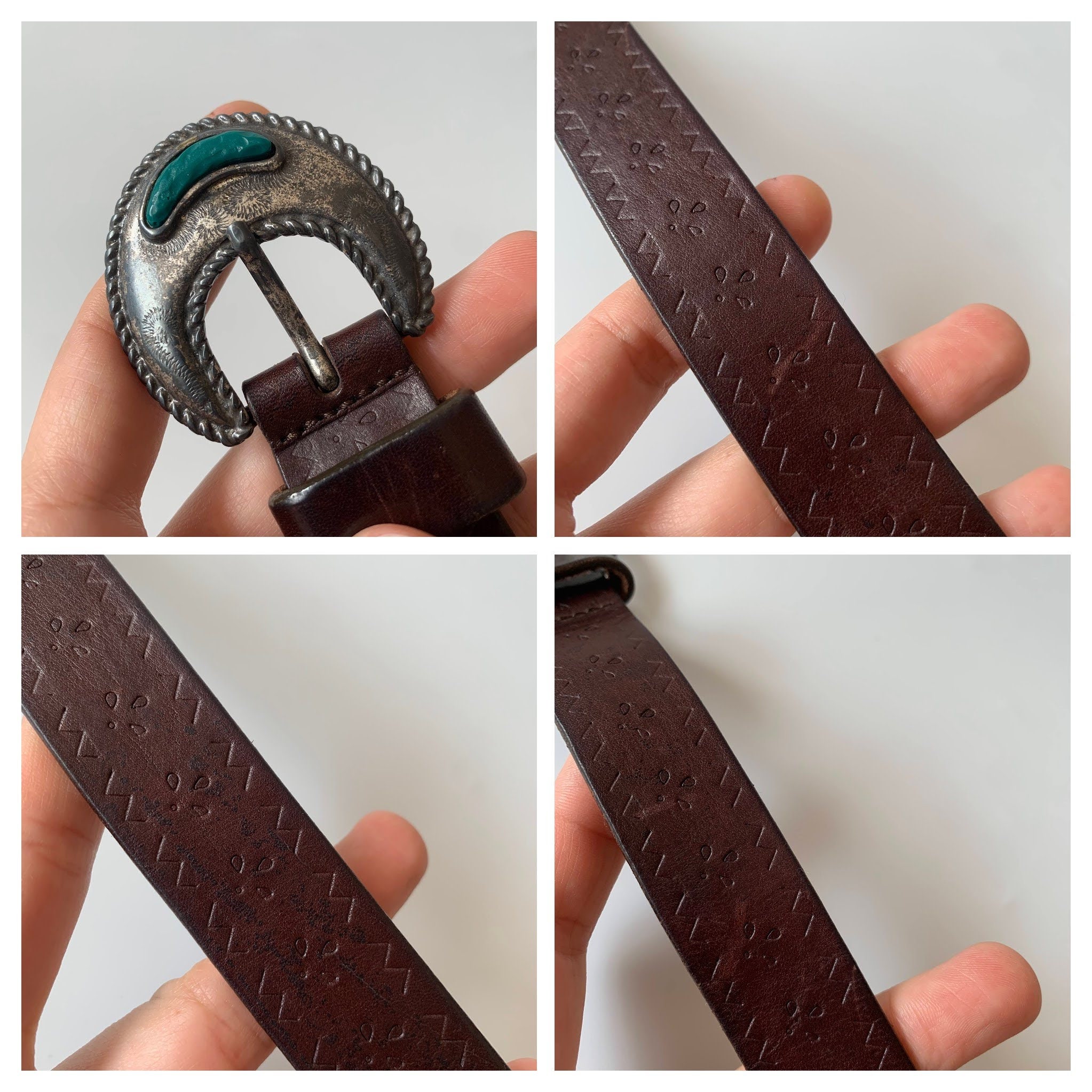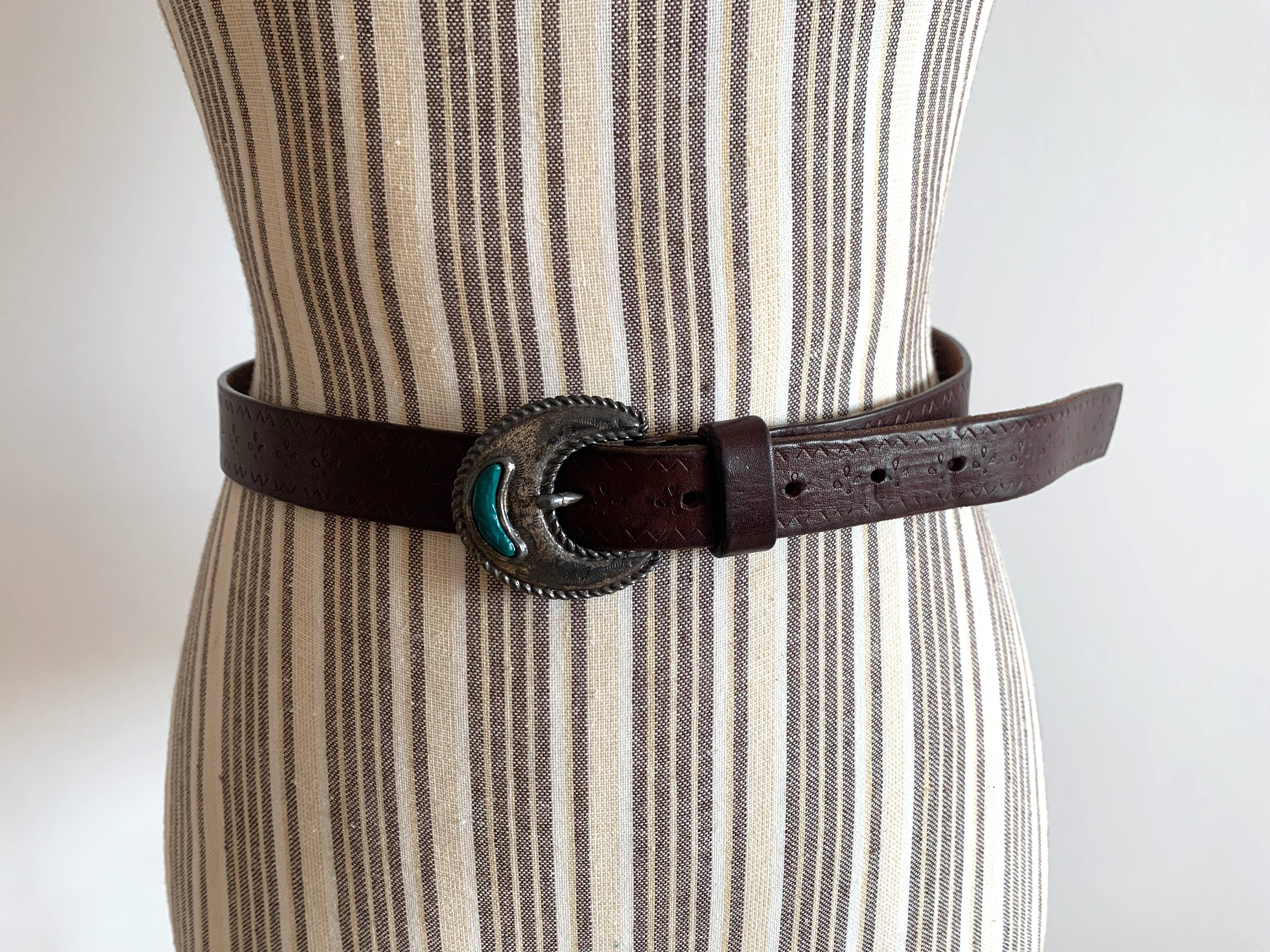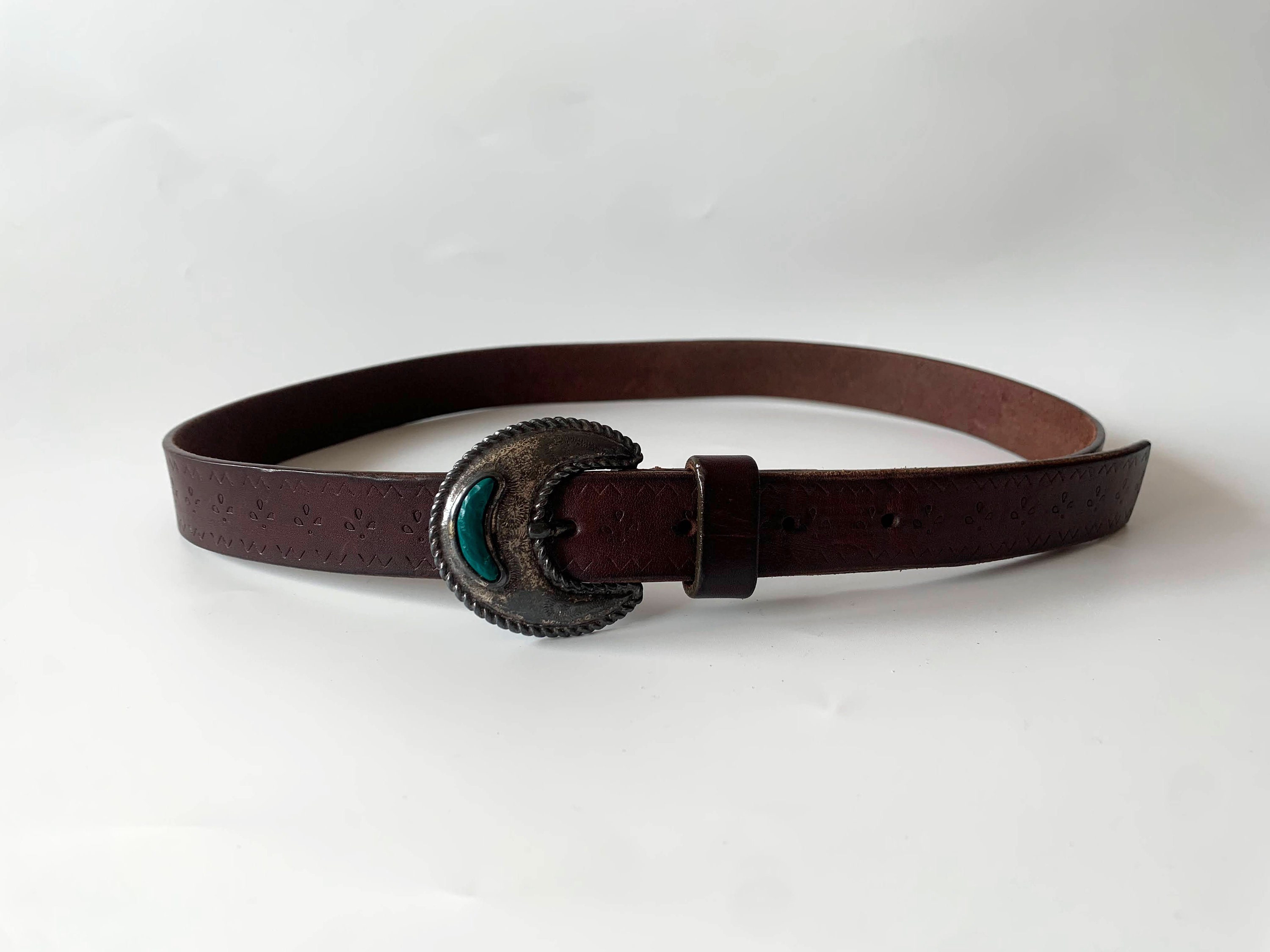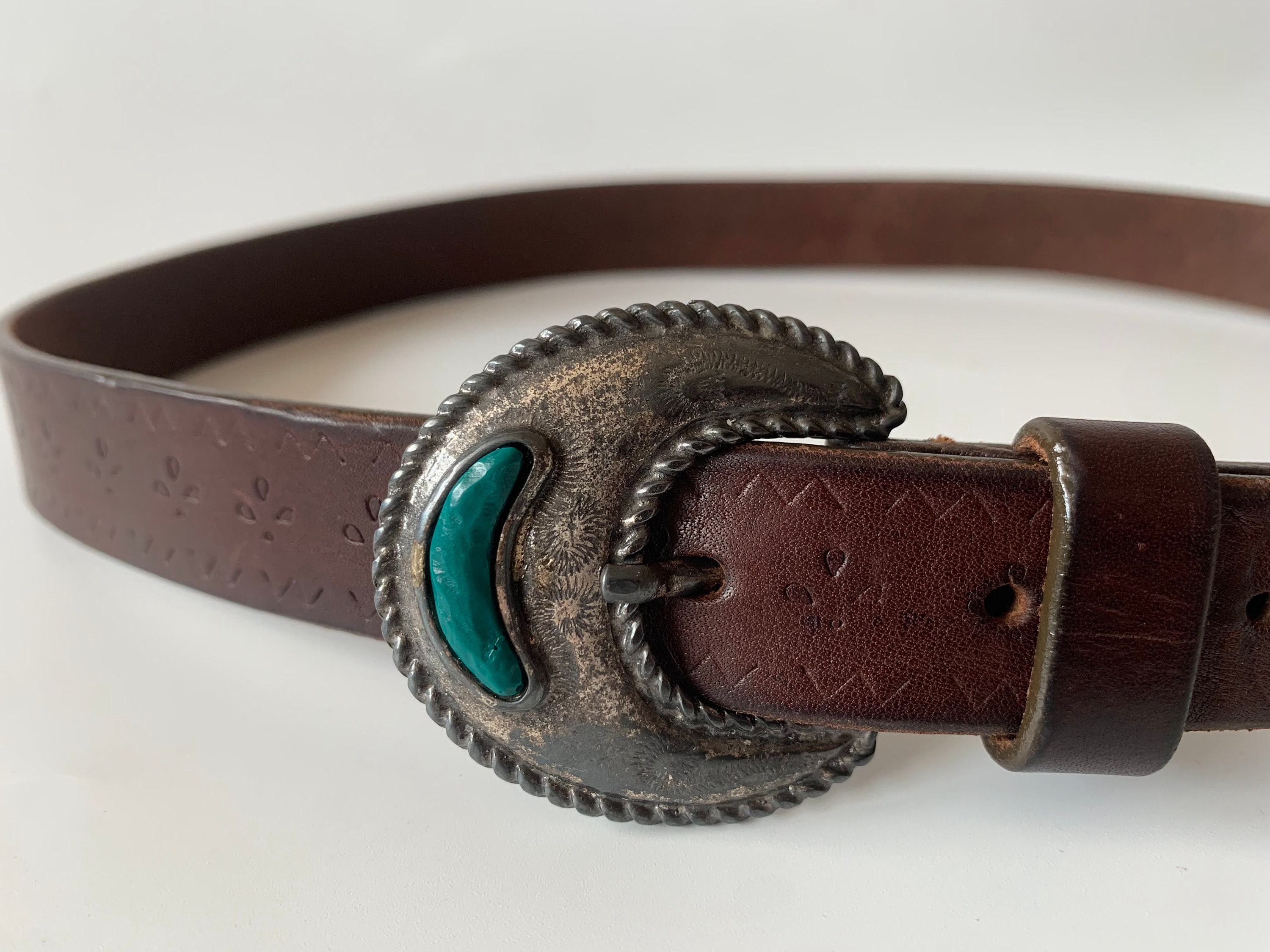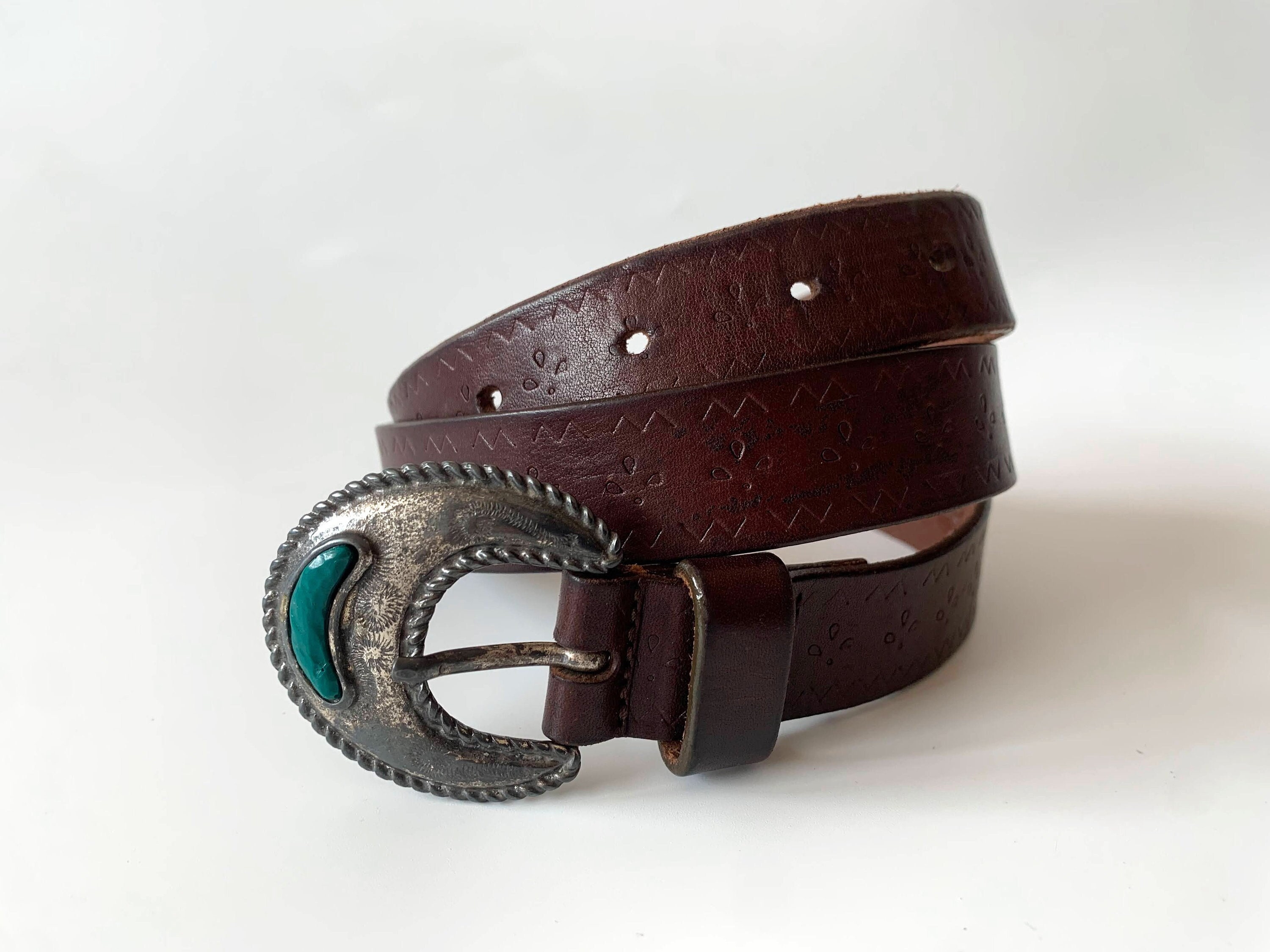 This is vintage 70s distressed tooled leather belt for women with beautiful inlay silver tone buckle. This flower embossed leather belt is in neutral brown color ideal for your boho chic outfits. It is made of genuine leather with silver tone buckle. The belt can adjust from 27.6" to 31.5" / 70 cm to 80 cm/. It is just 1" / 2.5 cm wide.