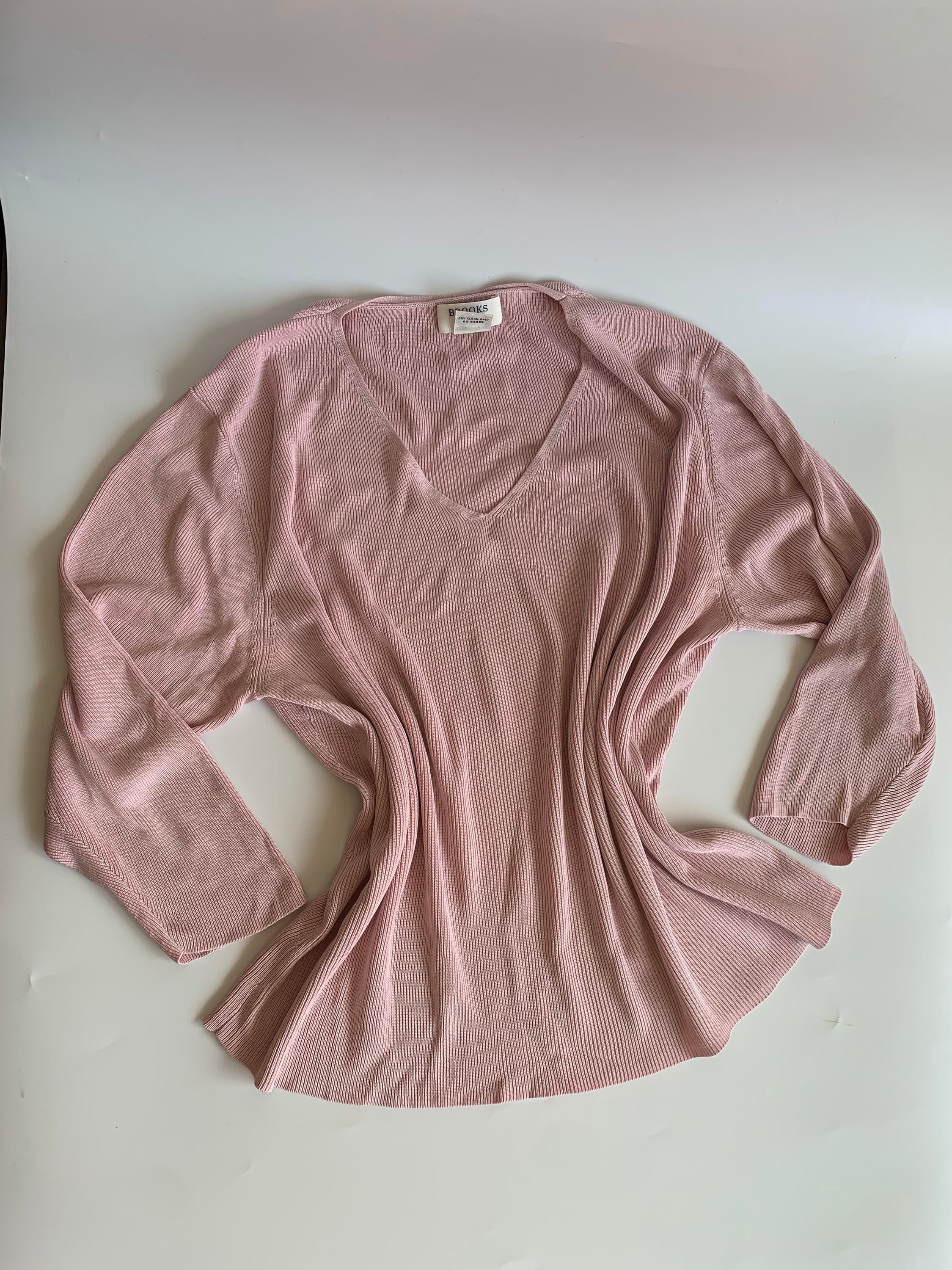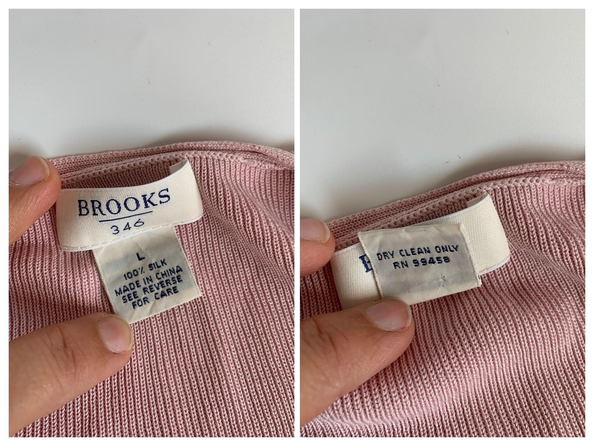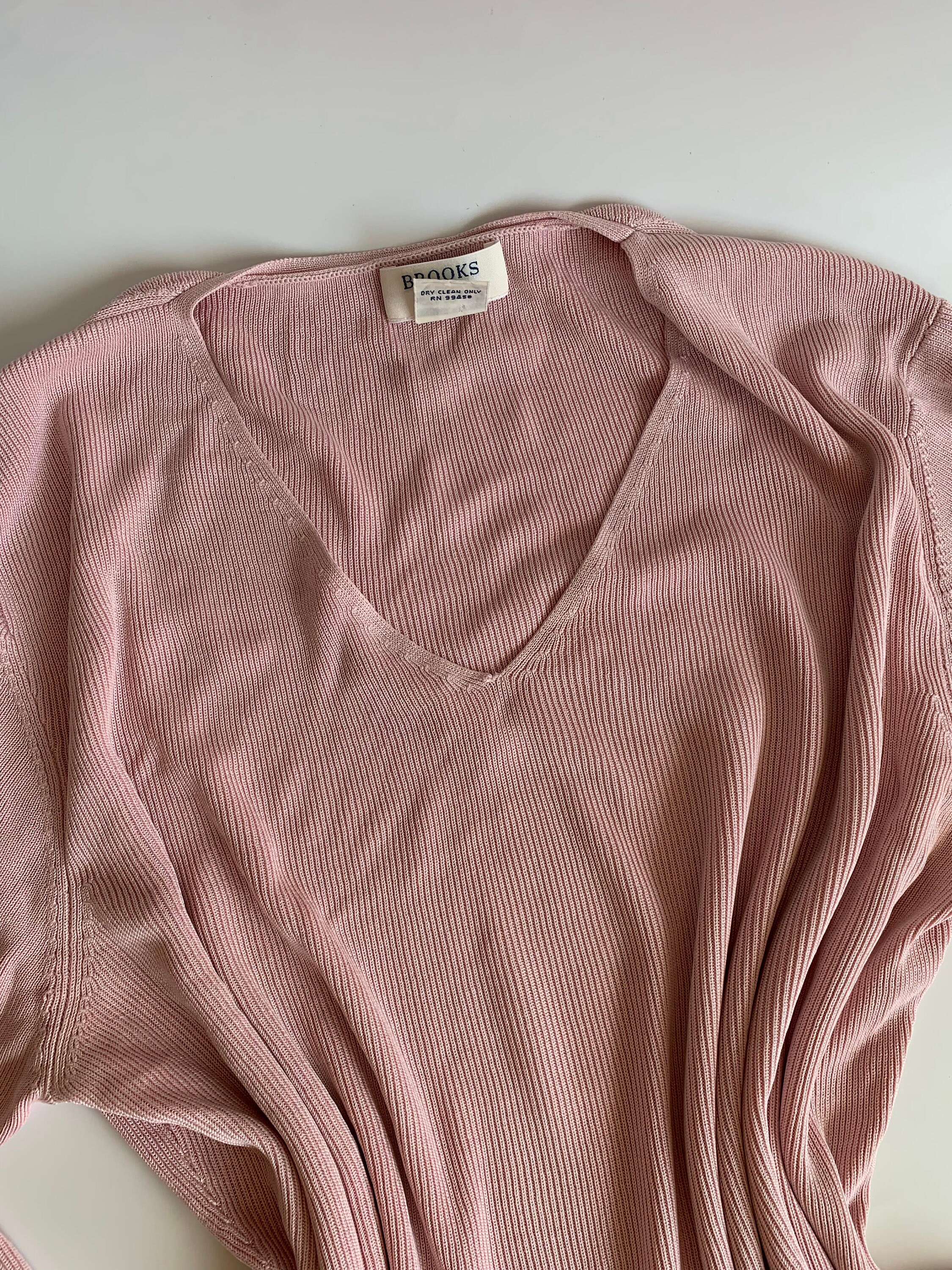 This is a vintage brooks 346 pure silk sweater for women size L. However this v neck sweater would also fit size M or an oversized S. This silk sweater is in pale pink color. It has 3/4 sleeves, which makes is perfect for the spring summer season. The fabric is awesome, all natural silk, that will preserved your body temperature. It feels awesome on the skin.