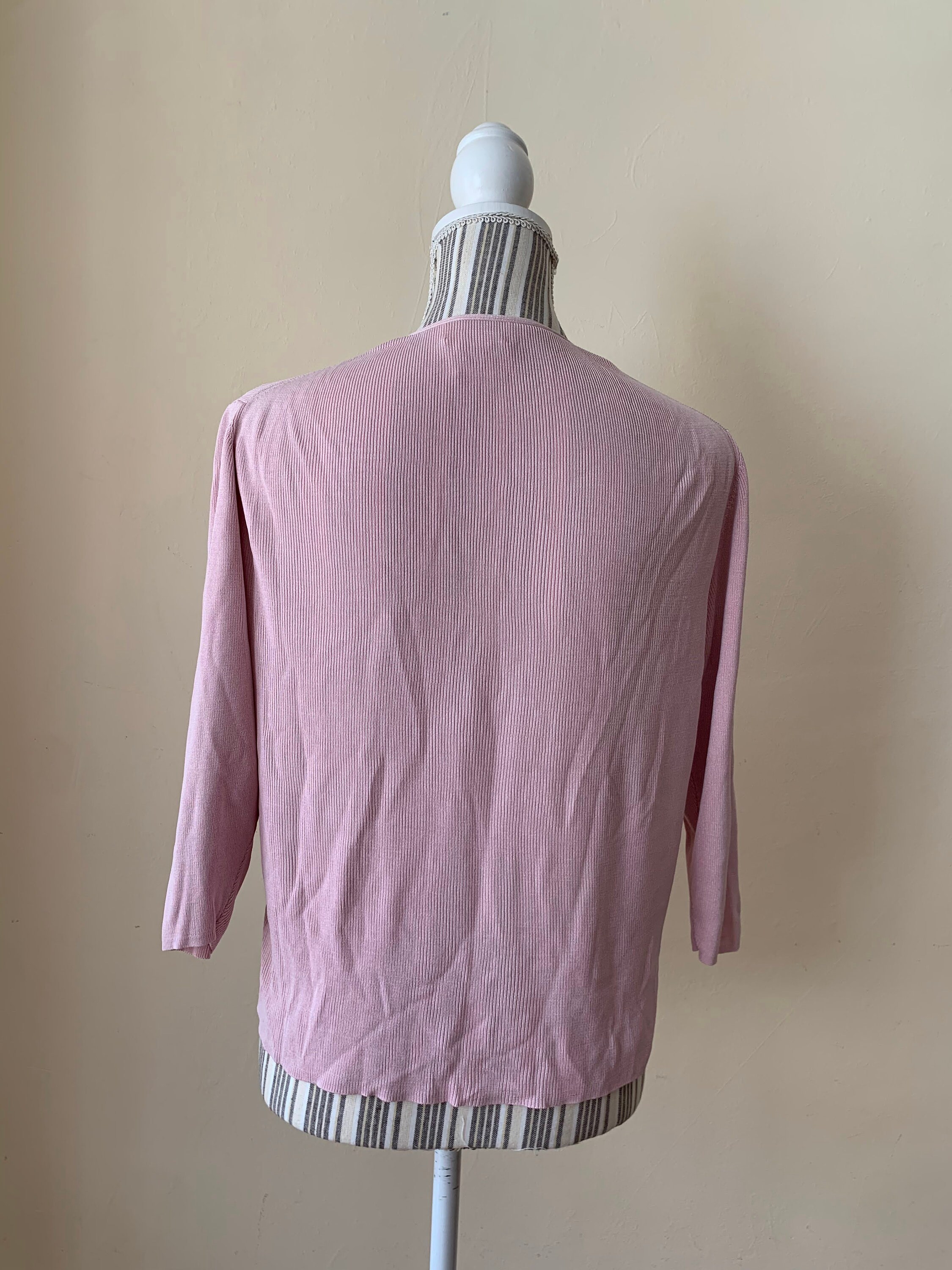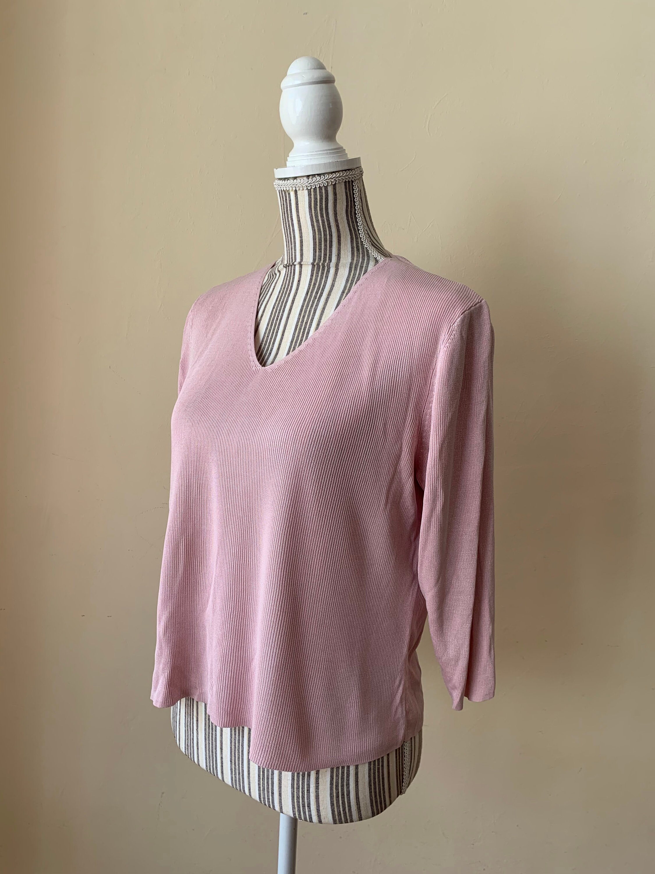 Condition: this silk pink sweater is beautifully preserved. There is a small flaw at the v neckline which I have tried to capture in the close up photo.