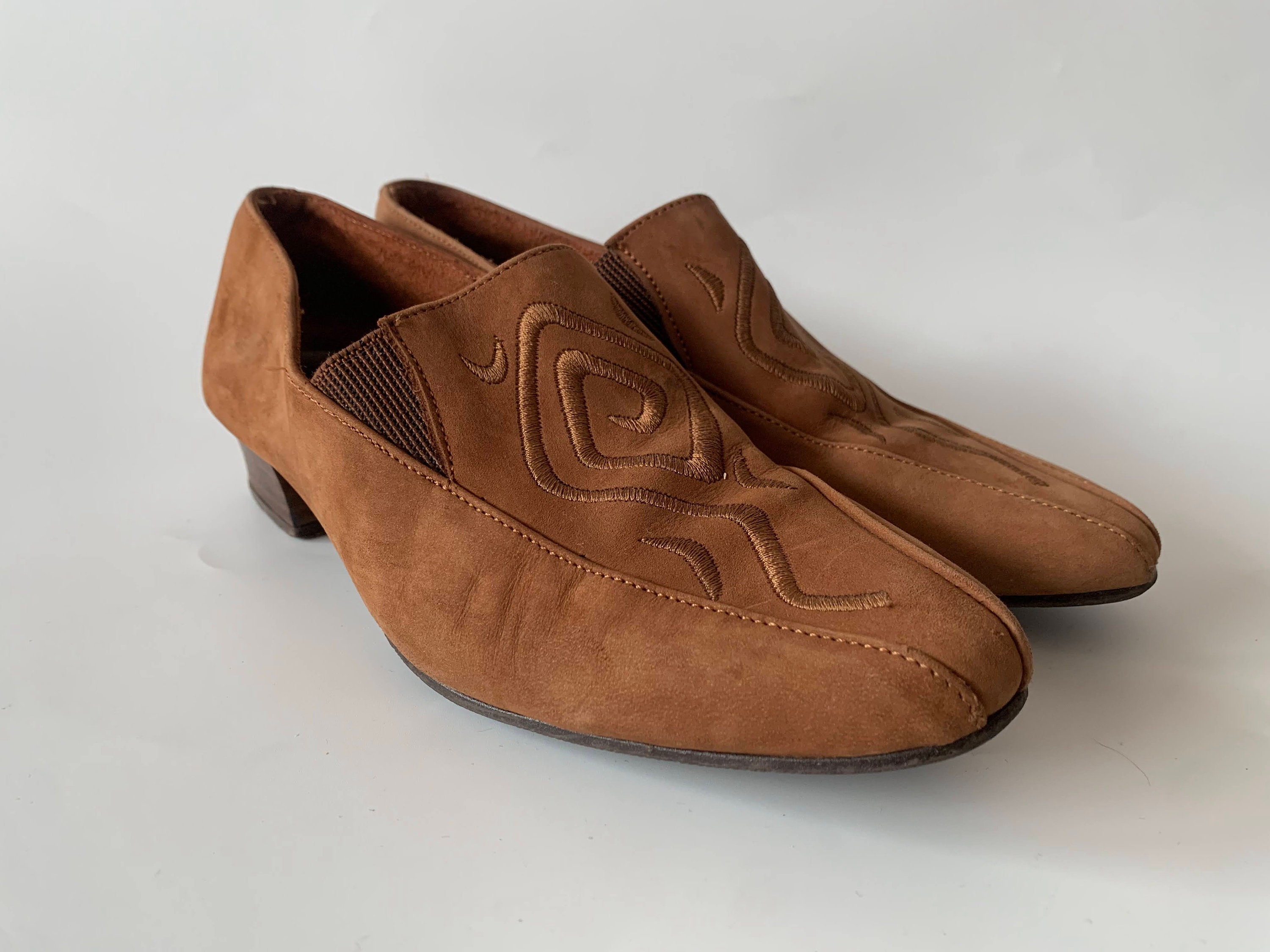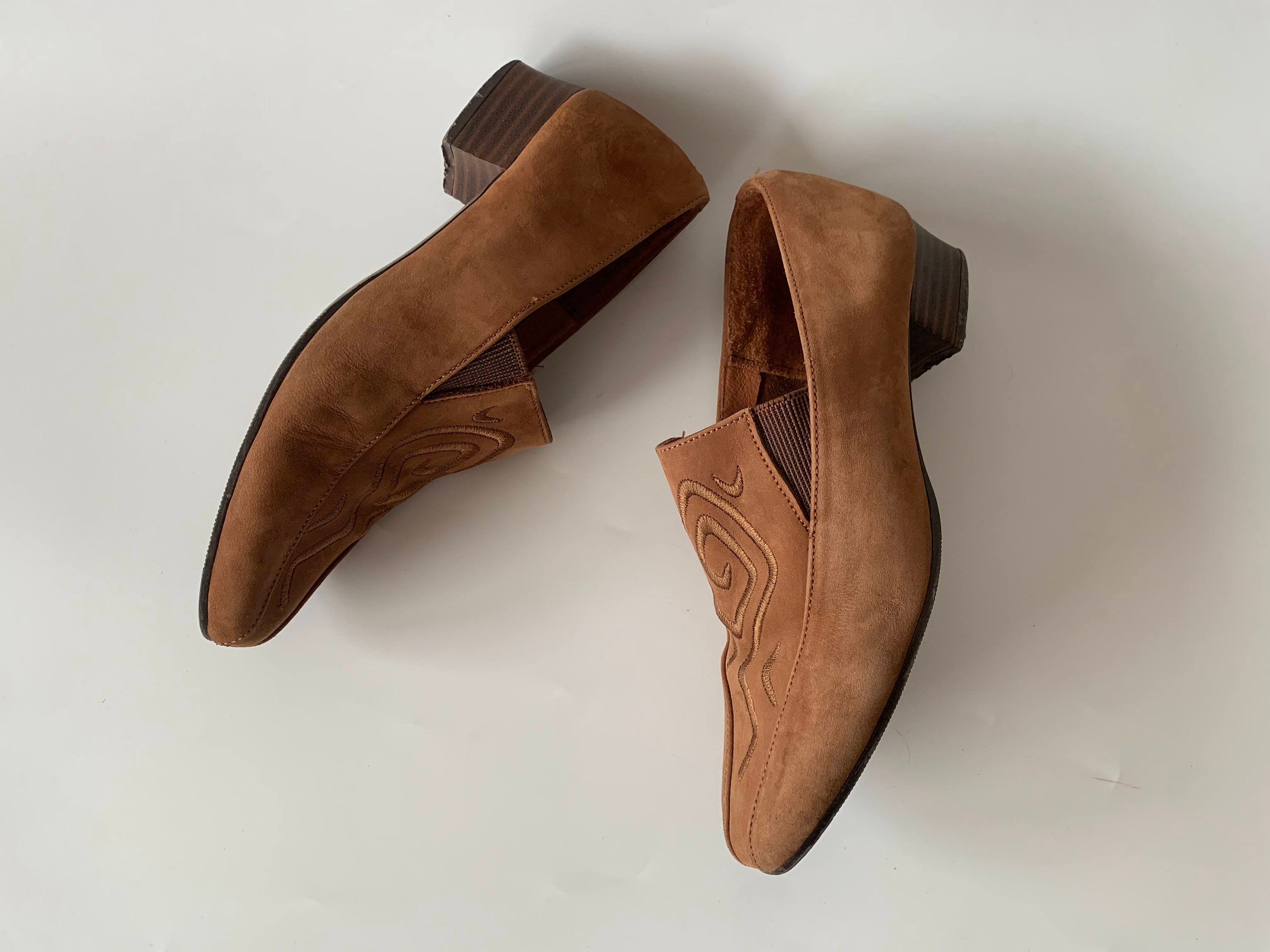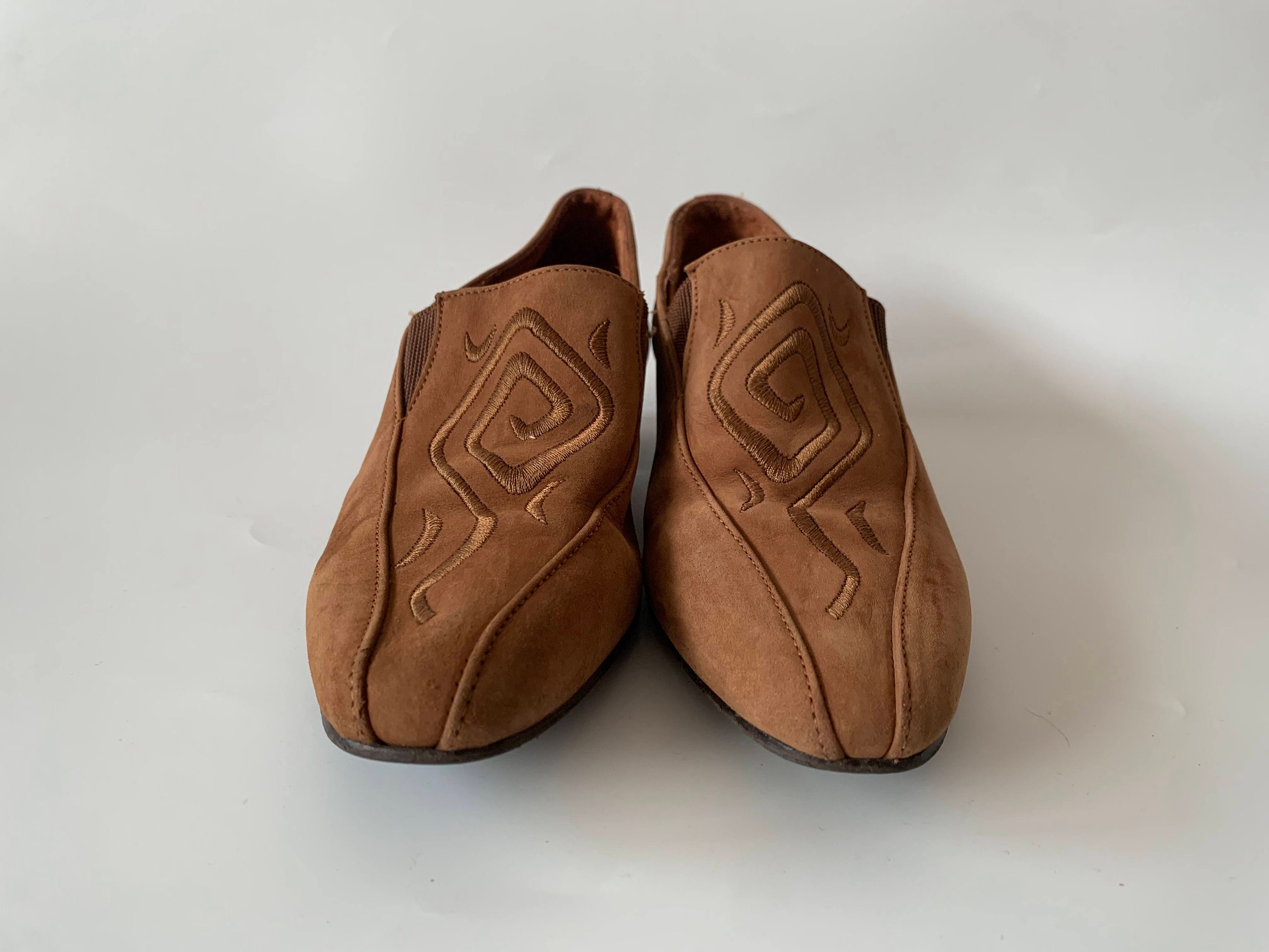 These are adorable vintage 80s camel brown suede leather slip on shoes for women size EUR 37. These tan brown flats are made of genuine suede leather in tan brown color. These suede slip on shoes have elastic bands, so you can easily put them on and take them off. These loafer shoes have lovely embroidery decoration at the front. These suede flats are perfect to pair with boho dresses and jeans to create a bohemian look. They will add a pop of free spirit to your outfits. The shoe size marked on the soles is EUR 37. These brown leather flats fit like size UK 4, US 6. Please check the measurements below.