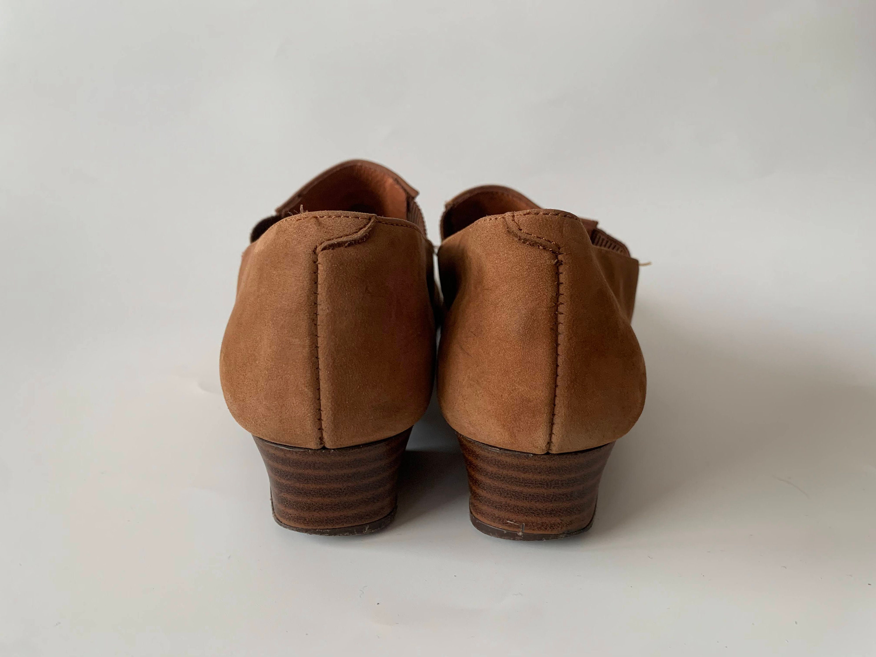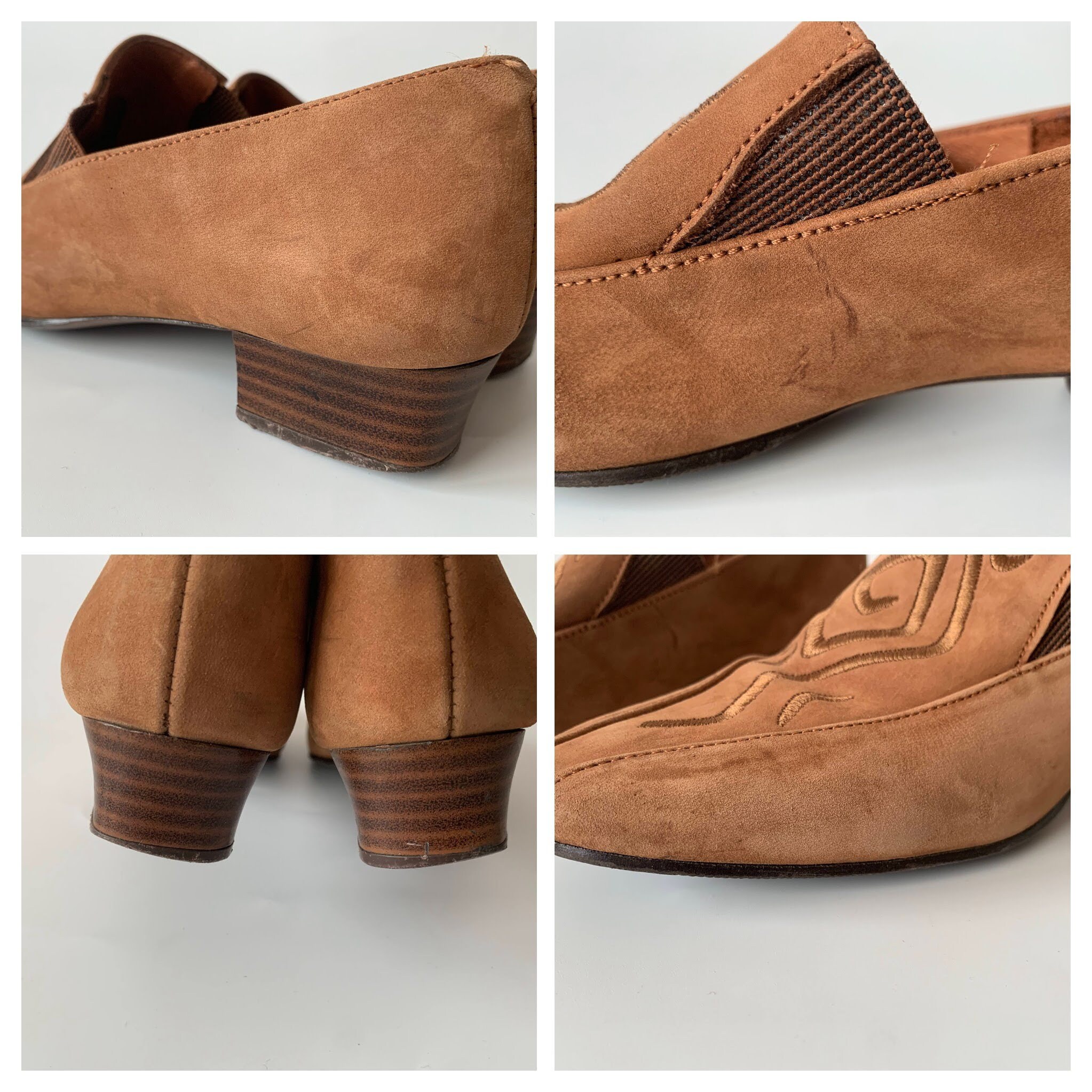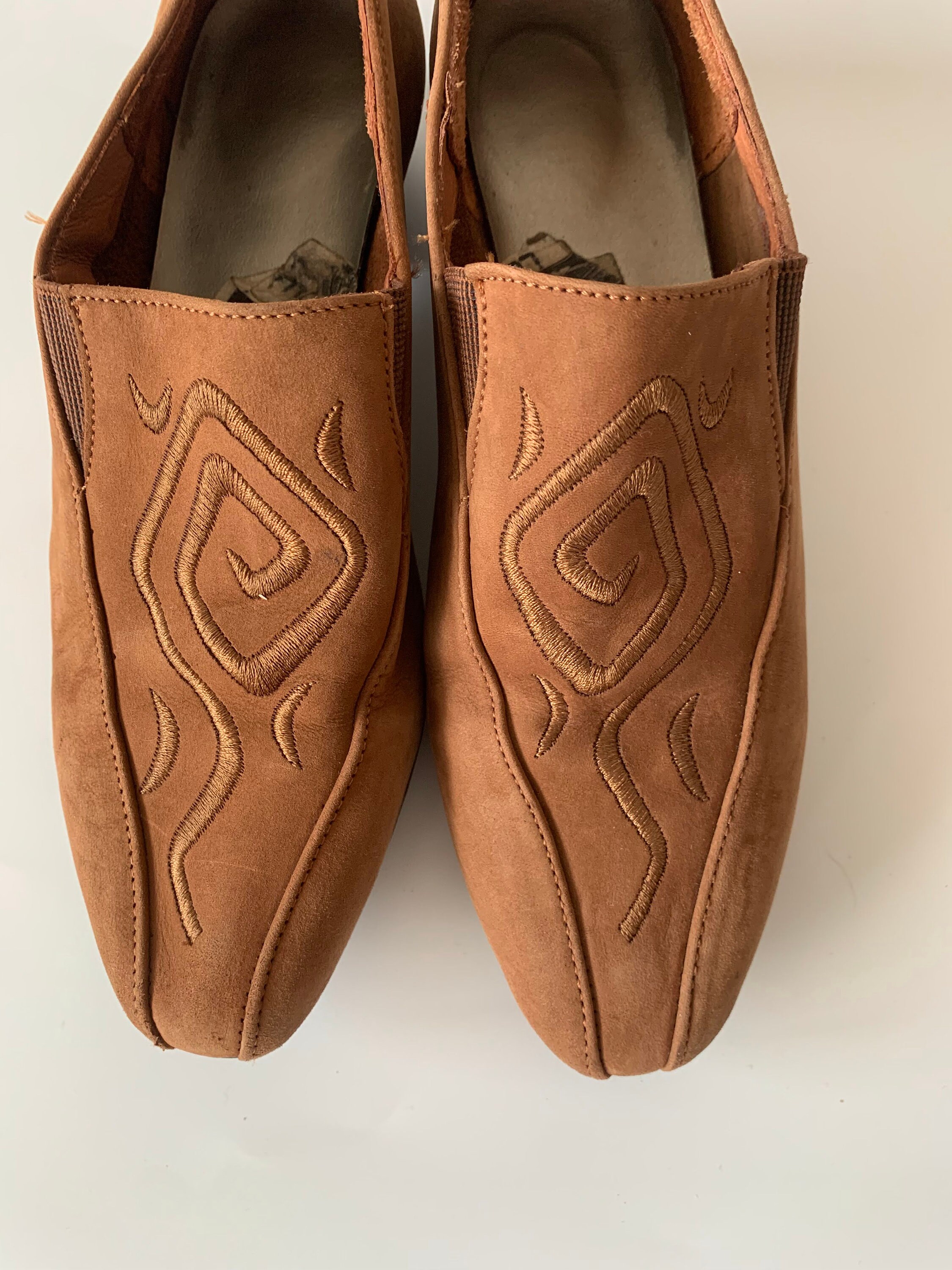 These are adorable vintage 80s camel brown suede leather slip on shoes for women size EUR 37. These tan brown flats are made of genuine suede leather in tan brown color. These suede slip on shoes have elastic bands, so you can easily put them on and take them off. These loafer shoes have lovely embroidery decoration at the front. These suede flats are perfect to pair with boho dresses and jeans to create a bohemian look. They will add a pop of free spirit to your outfits. The shoe size marked on the soles is EUR 37. These brown leather flats fit like size UK 4, US 6. Please check the measurements below.