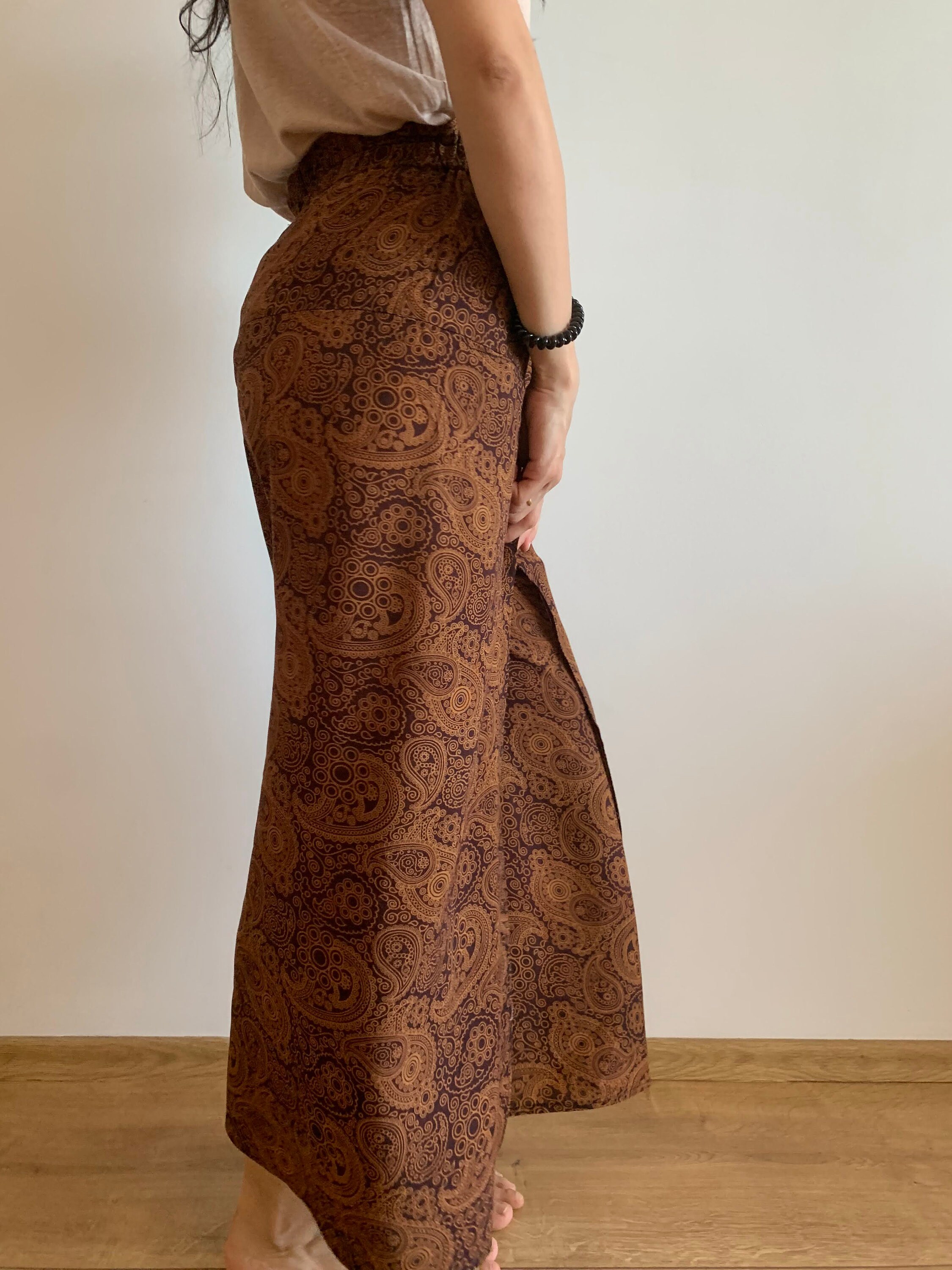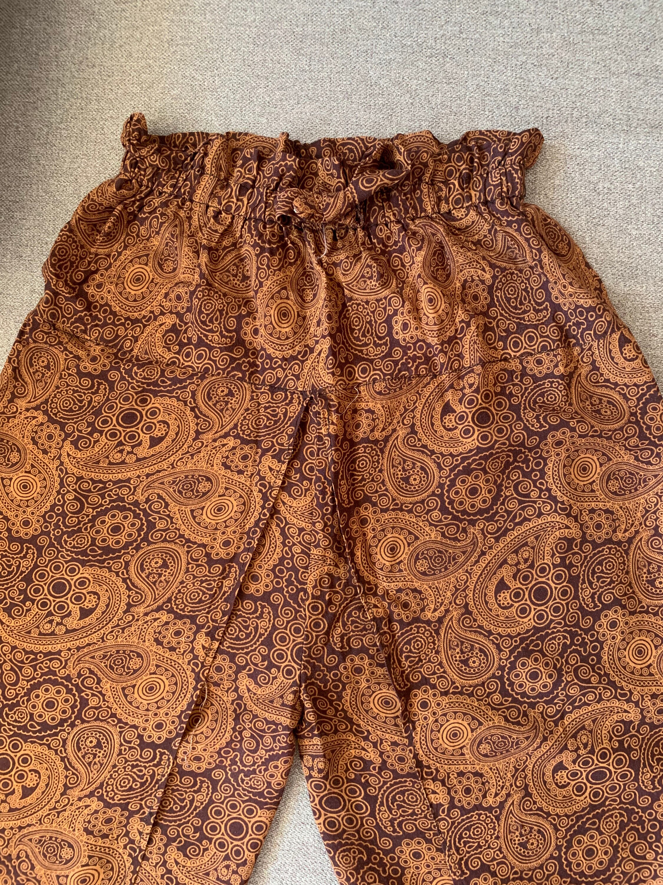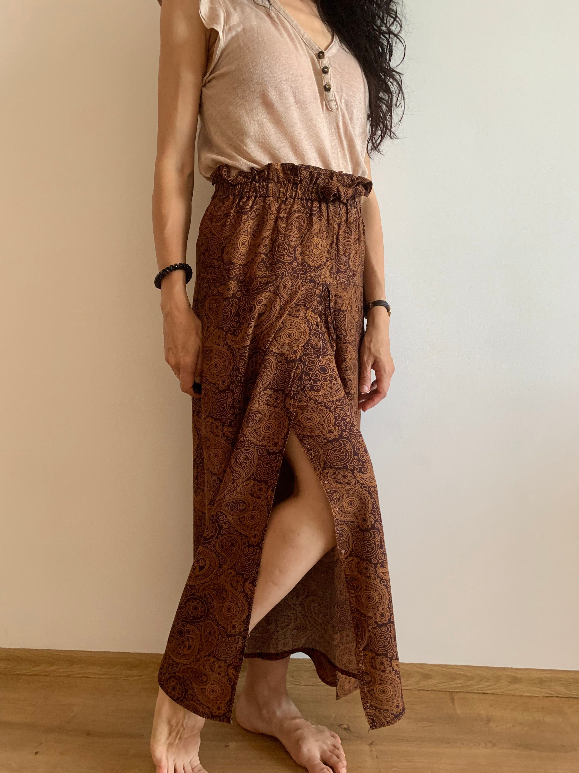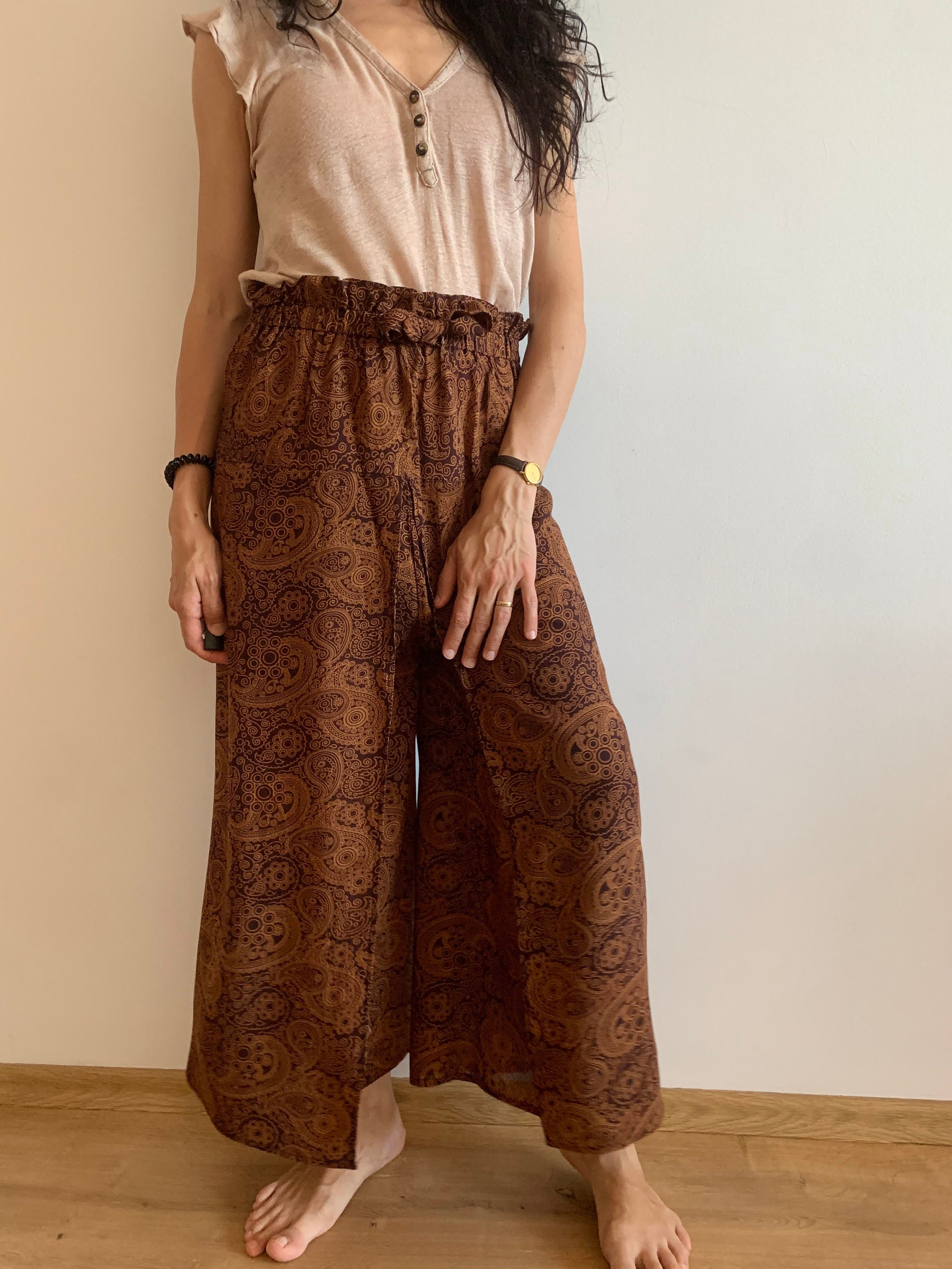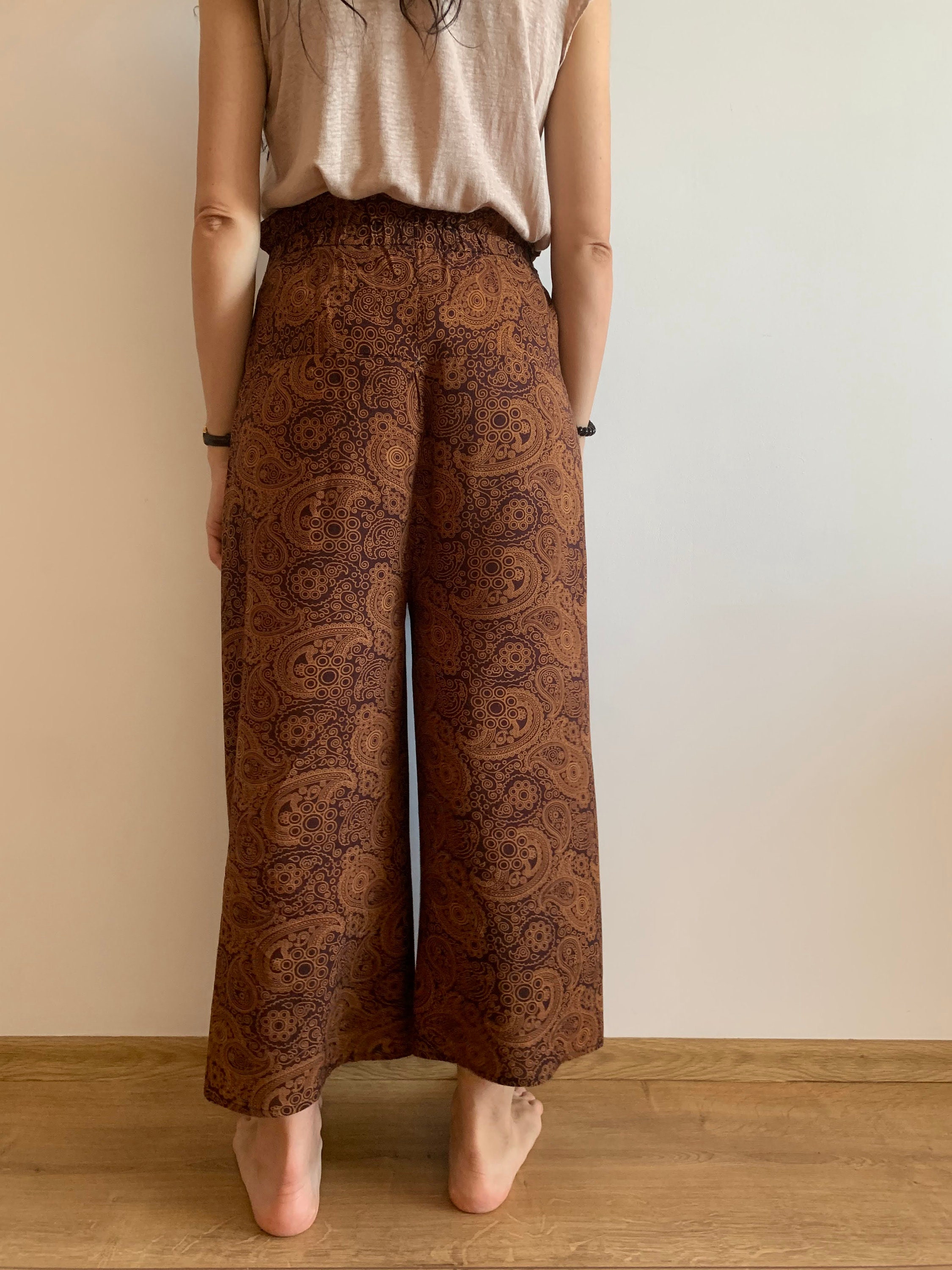 Beautiful vintage 90s paisley print wide leg pants for women which fit like size S/ M. These palazzo pants have a high elastic waistline. They have wide open legs, so these gaucho pants are super comfortable to wear. They are perfect for the summer with their flowy relaxed fit. These gorgeous summer alibaba pants will look awesome with a simple shirt in solid color, so you can get all eyes on you. You can wear these casual wide leg yoga trousers day to night. You can dress them up or down, depending on your mood.