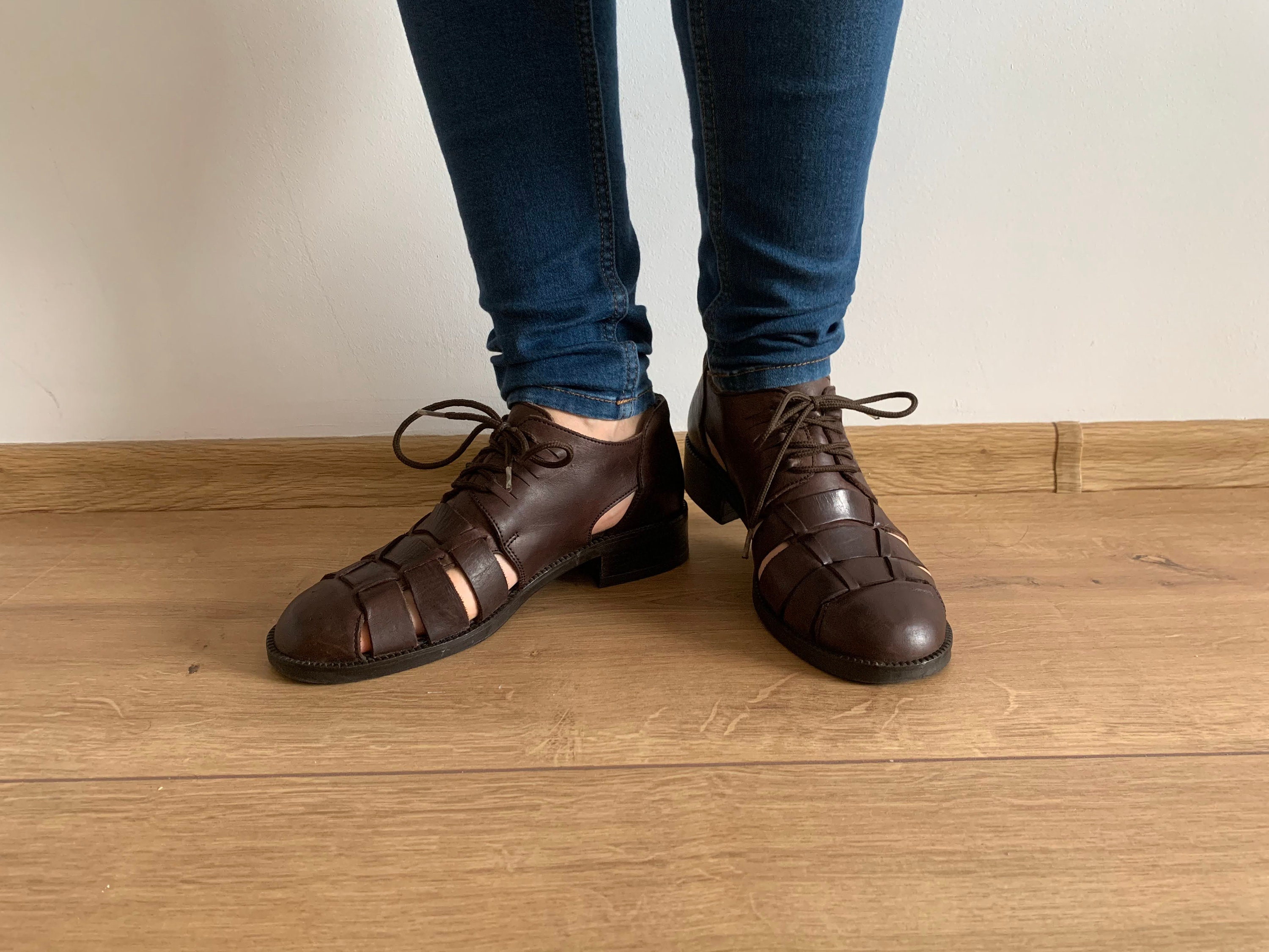 These are beautiful brown leather lace up shoes size EUR 38. These women oxford shoes are made of genuine leather in chocolate brown color. These huarache shoes are made of genuine leather straps beautifully woven together to form these unique tie up loafers. These lace up oxford shoes have a cut out design, which makes them perfect for the spring/ summer season. These brown leather flats have a comfortable sole with low heel. These stylish lace up shoes are perfect to wear daily at the office or casually.