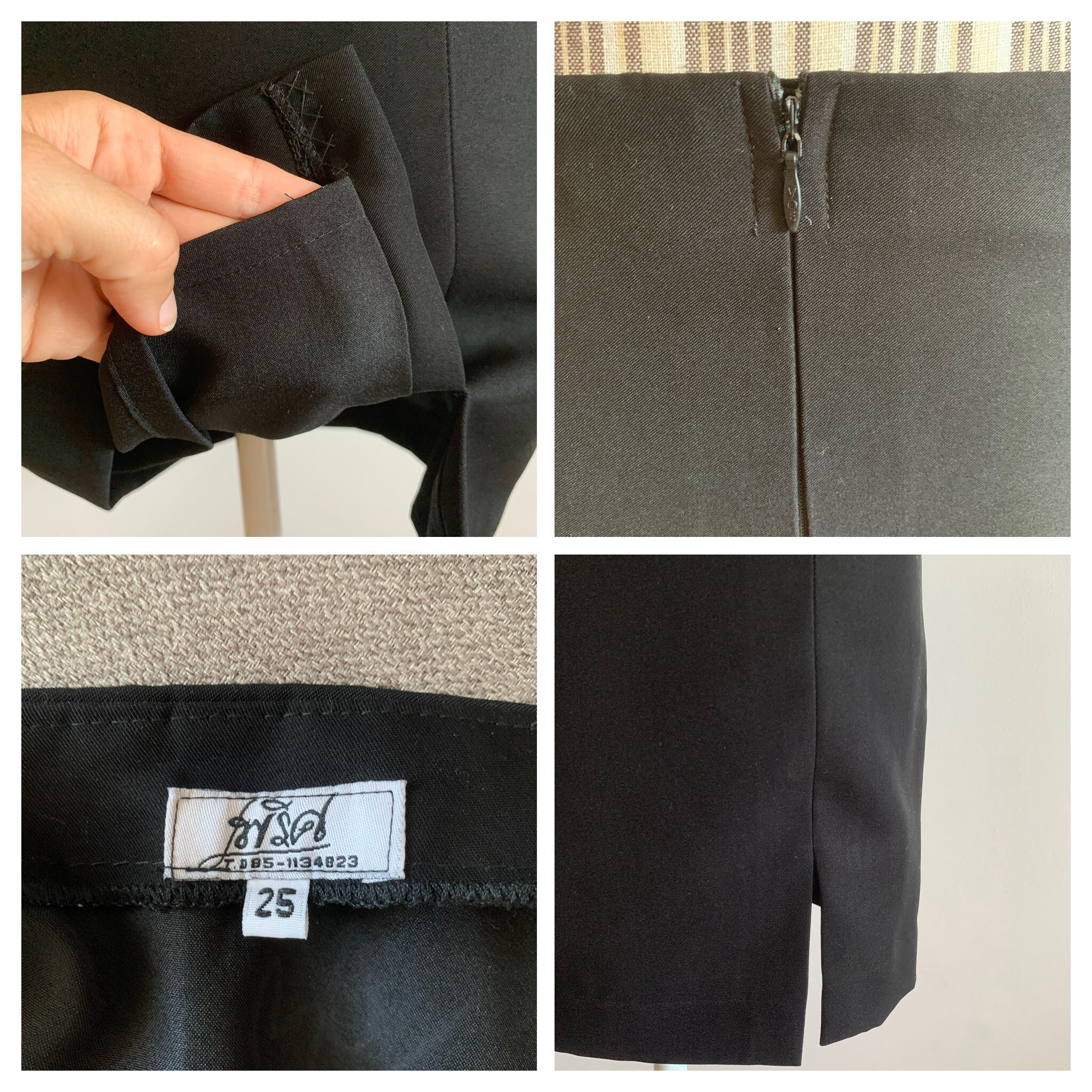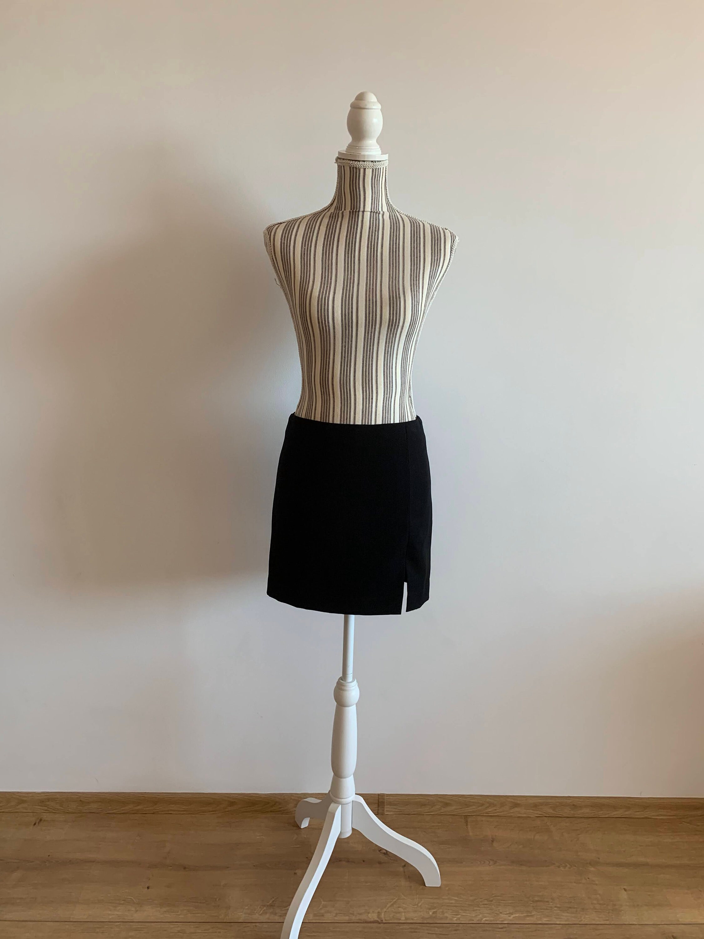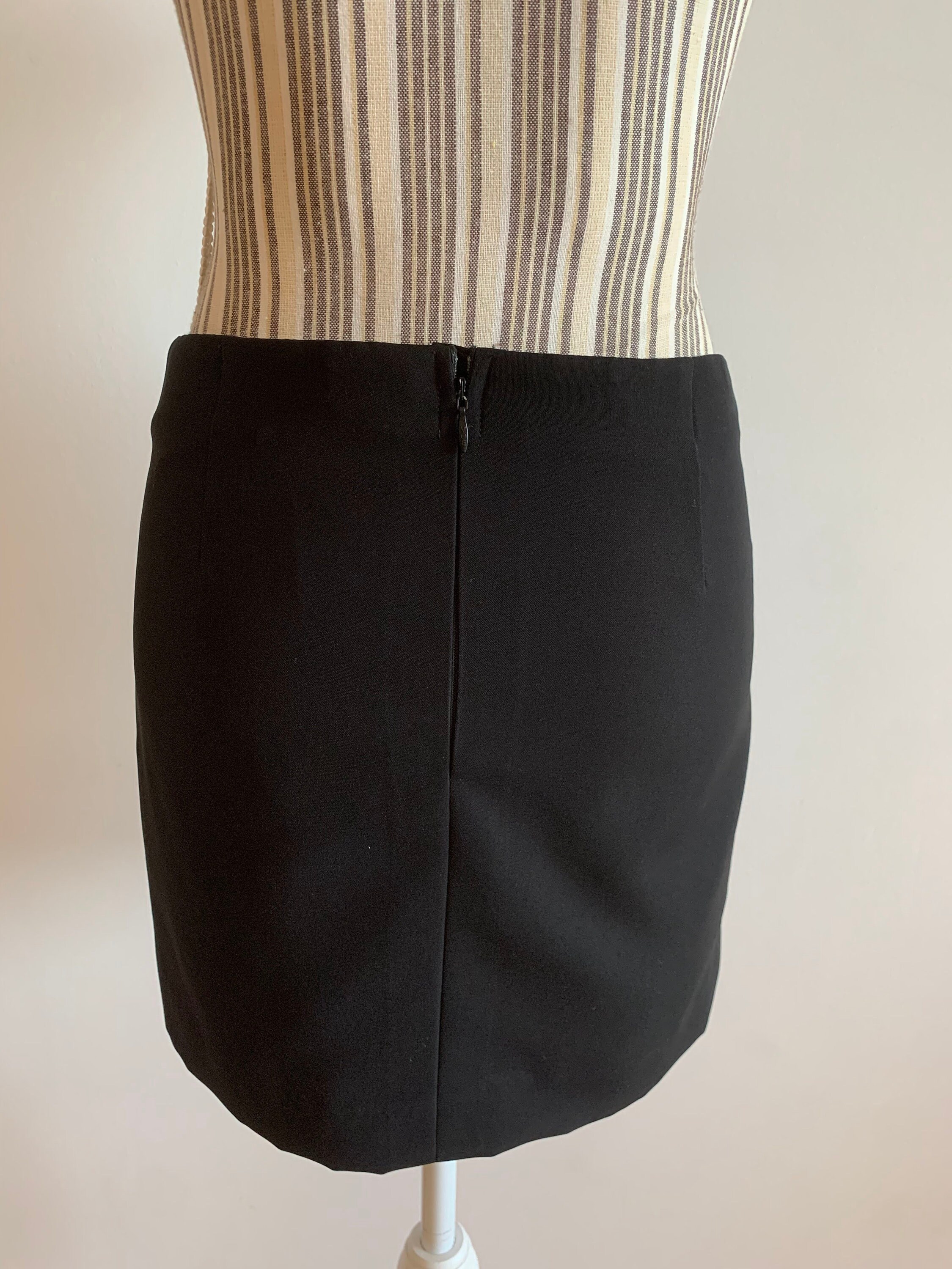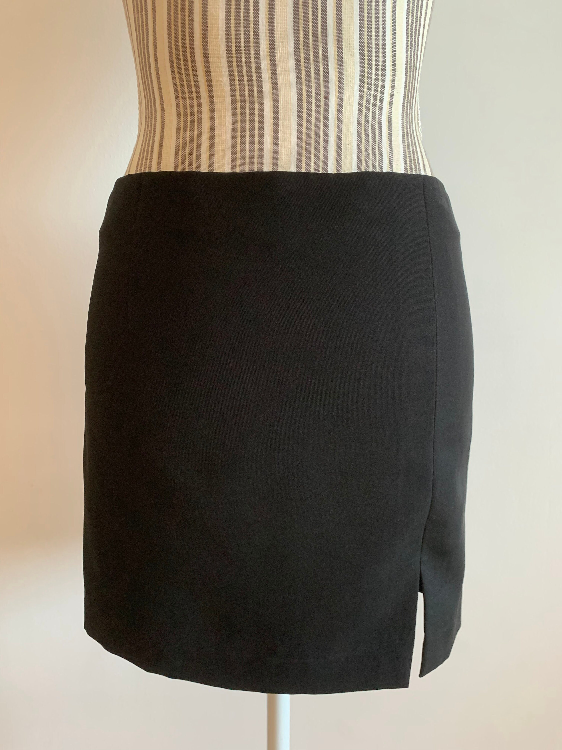 This is a vintage 90s black mini skirt with leg slip and back zip closure. This short black skirt has a straight cut silhouette and back zip up closure. This 90s minimalist skirt is made of black fabric which feels like polyester (there is no label to state the materials). This simple mini skirt has polyester lining underneath. This black mini skirt fits like size S. Please check the measurements below.