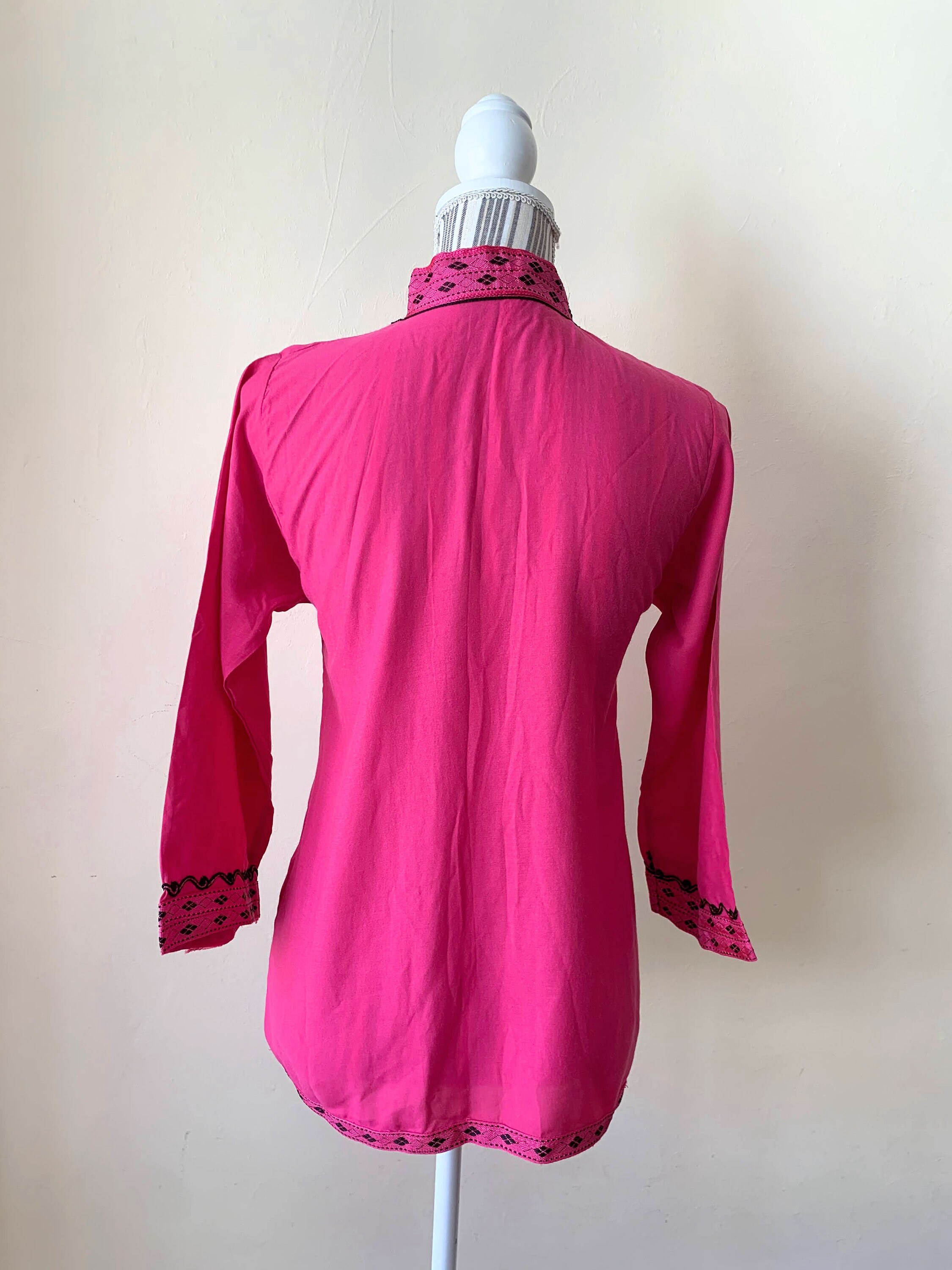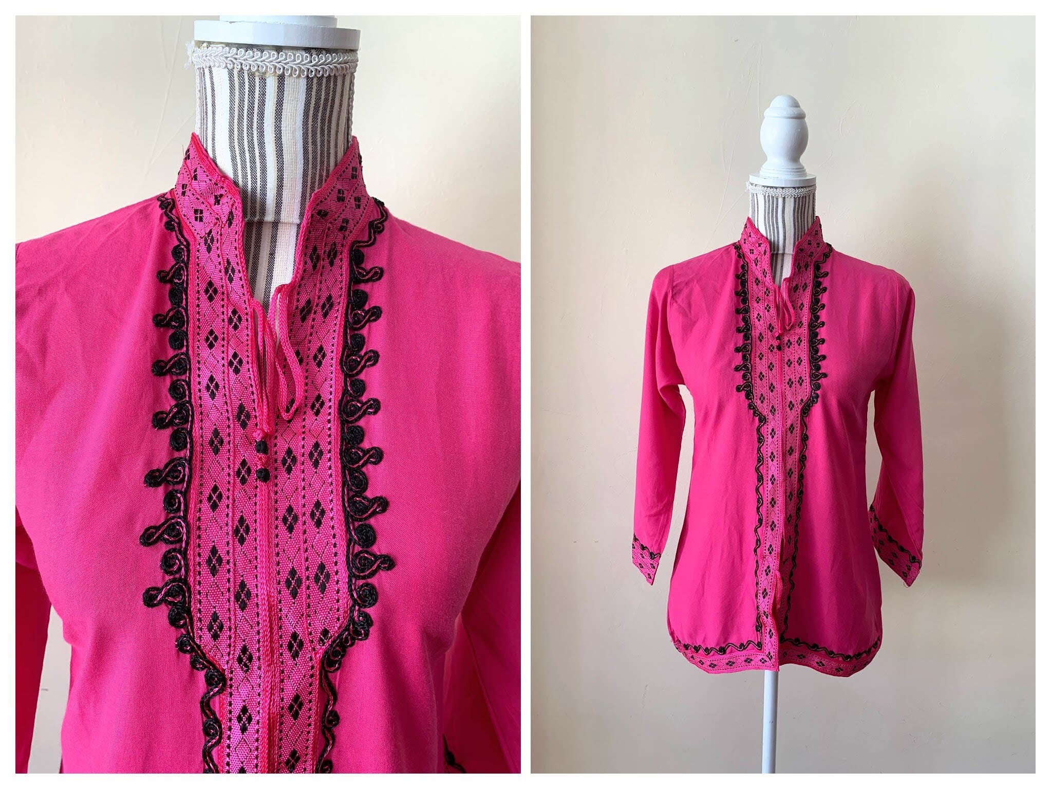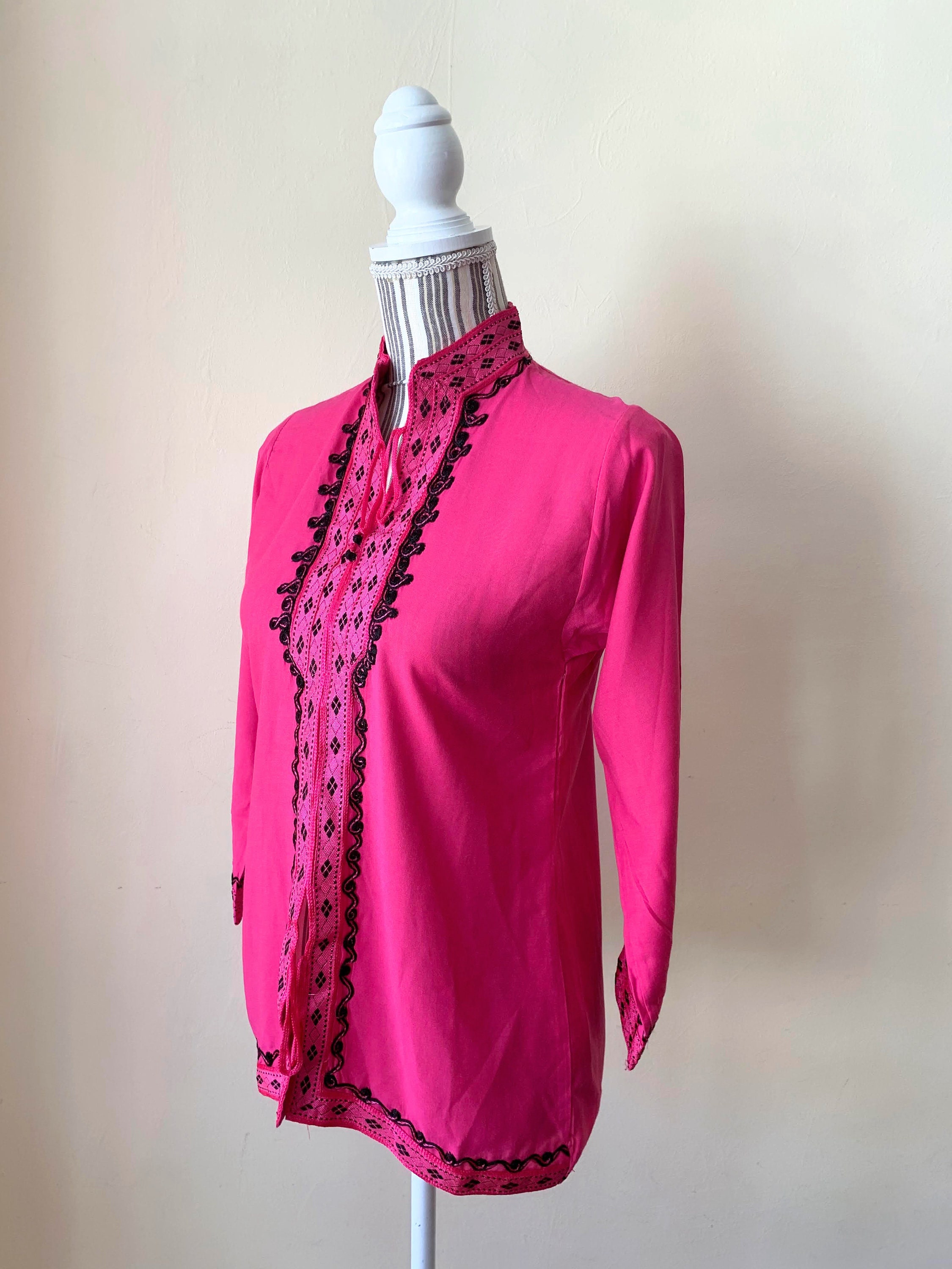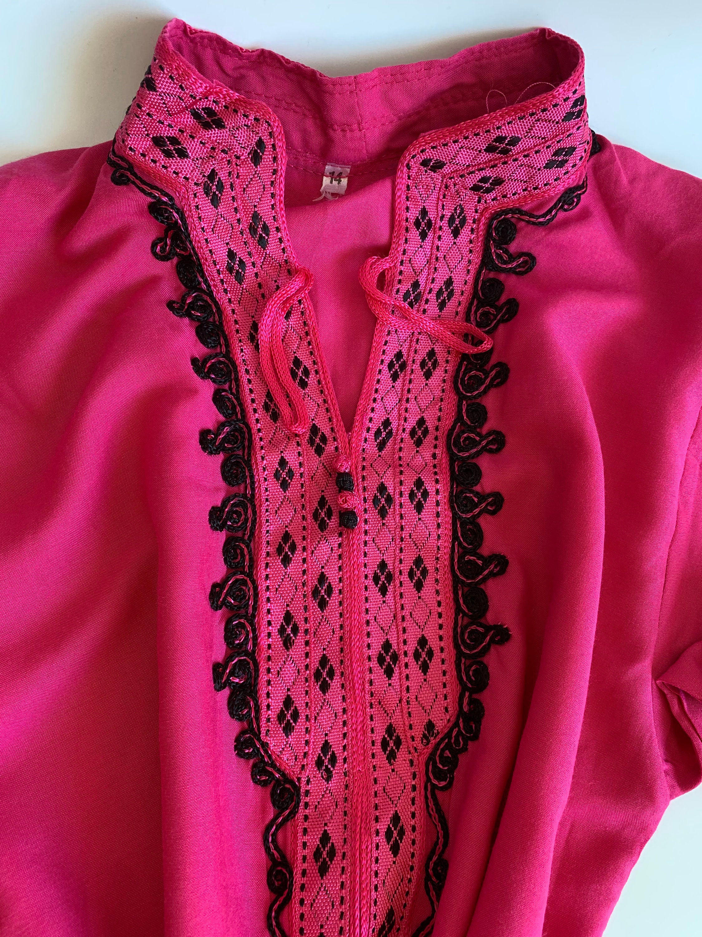 This is a vintage fuchsia pink kaftan with high collar and 3/4 sleeves. This boho cotton kaftan has a v neck front neckline, which is beautifully embroidered. This bohemian tunic top has embroidery at the bottom and the sleeves too. The back is simple and plain. You can wear this caftan tunic as a boho shirt or as a beach cover up. You can pair it with solid color relaxed pants underneath or throw it over your swimming suit. This kaftan tunic has has size 14 marked - it fits like size XXS/ XS. Please check the measurements below.