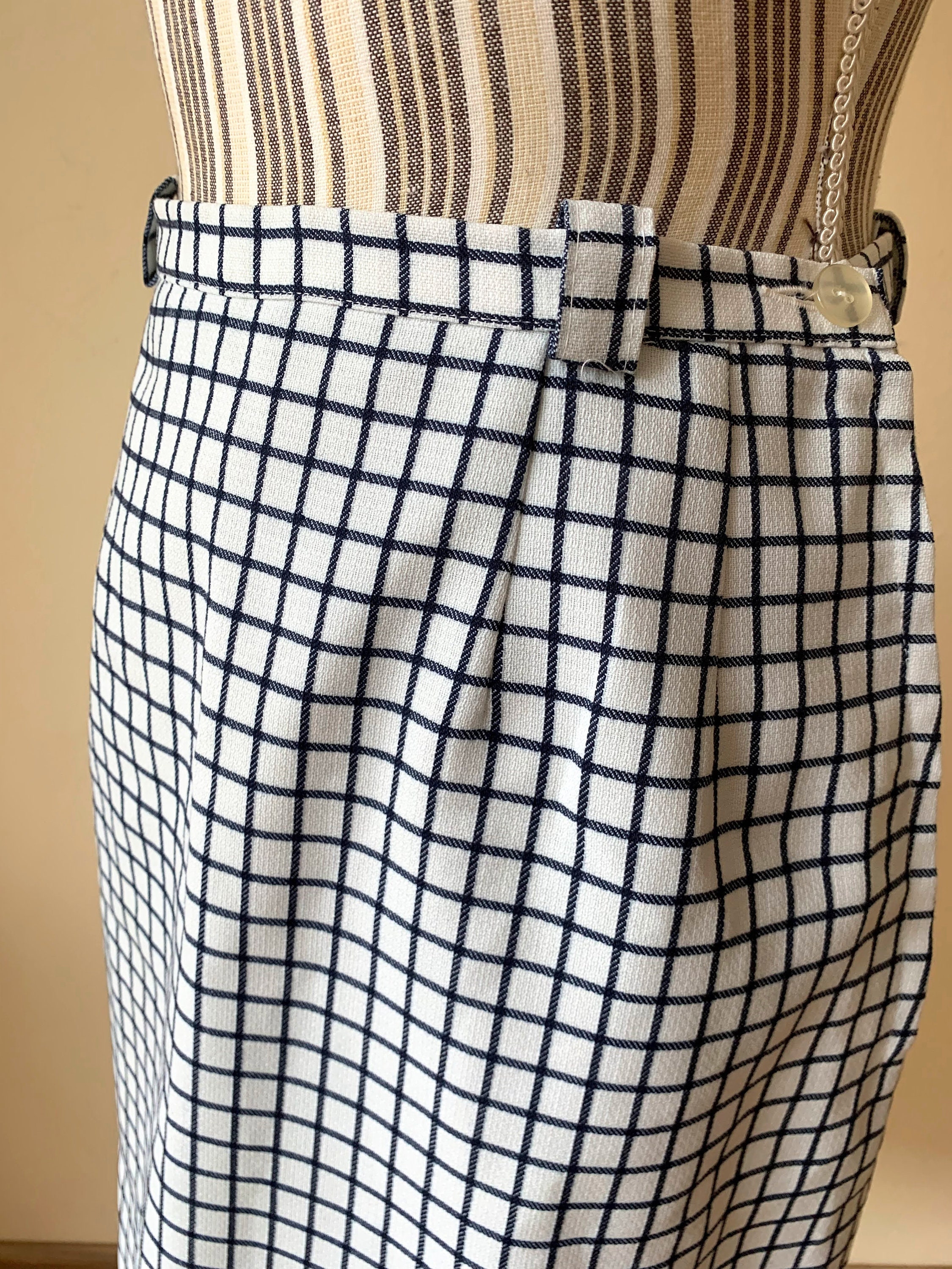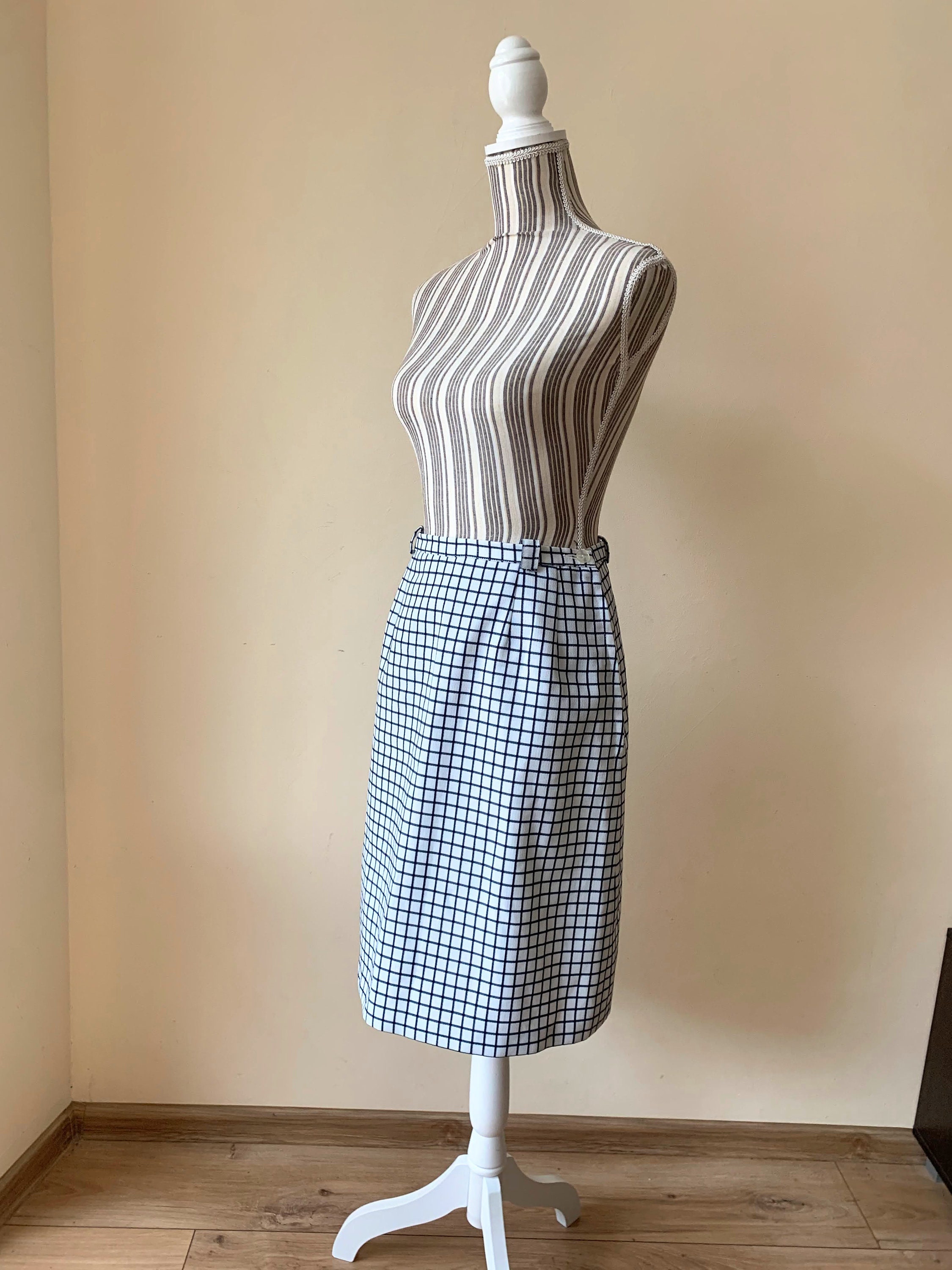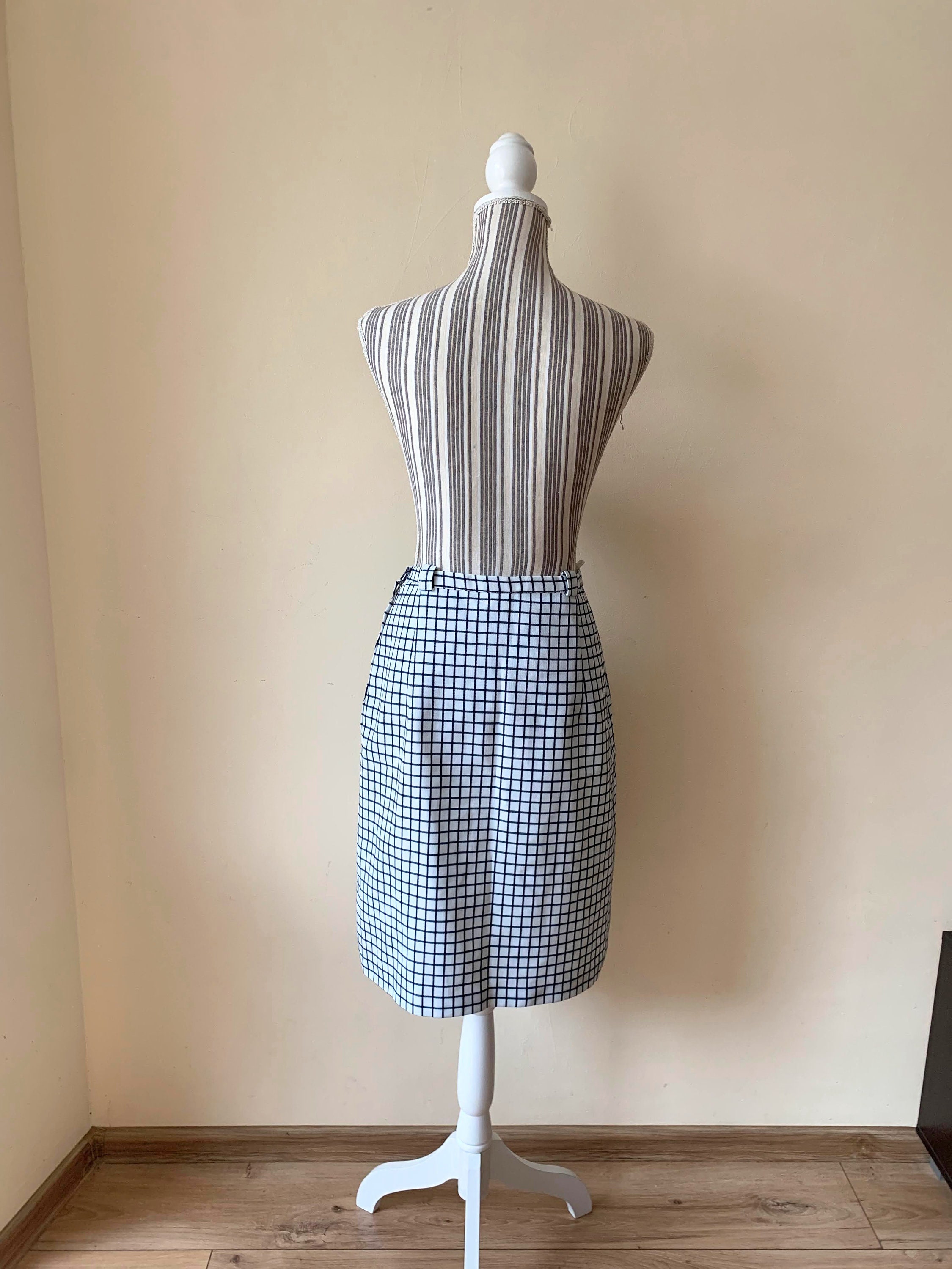 This is a vintage Trevira midi skirt made of thick heavy polyester blend fabric in white and deep navy blue which almost looks black. This classic A line skirt falls to below the knees. It has side metal zip and button closure with polyester lining. This plaid midi skirt has belt loops. The size marked is 40, which fits like size 8. Please check the measurements below.