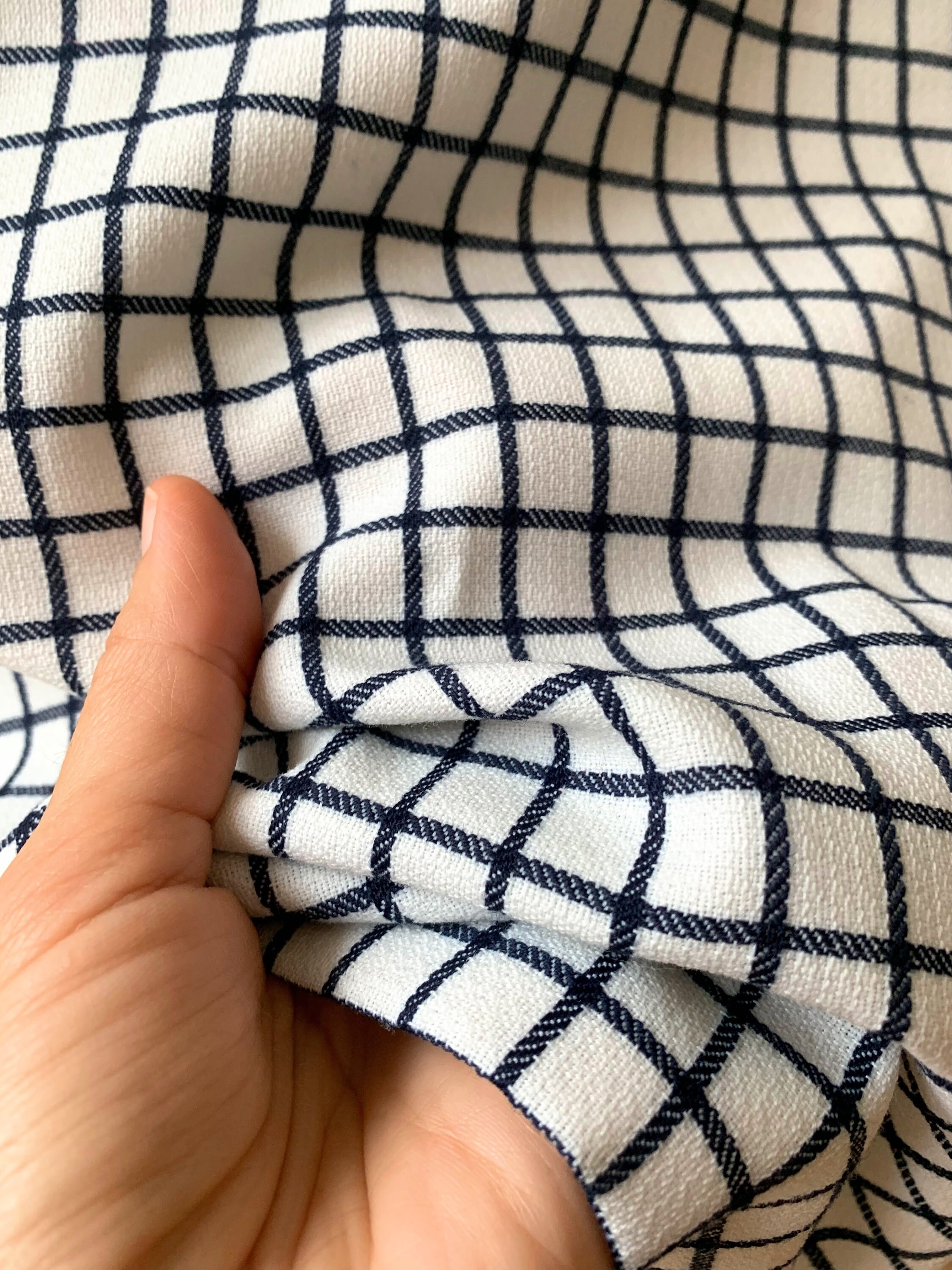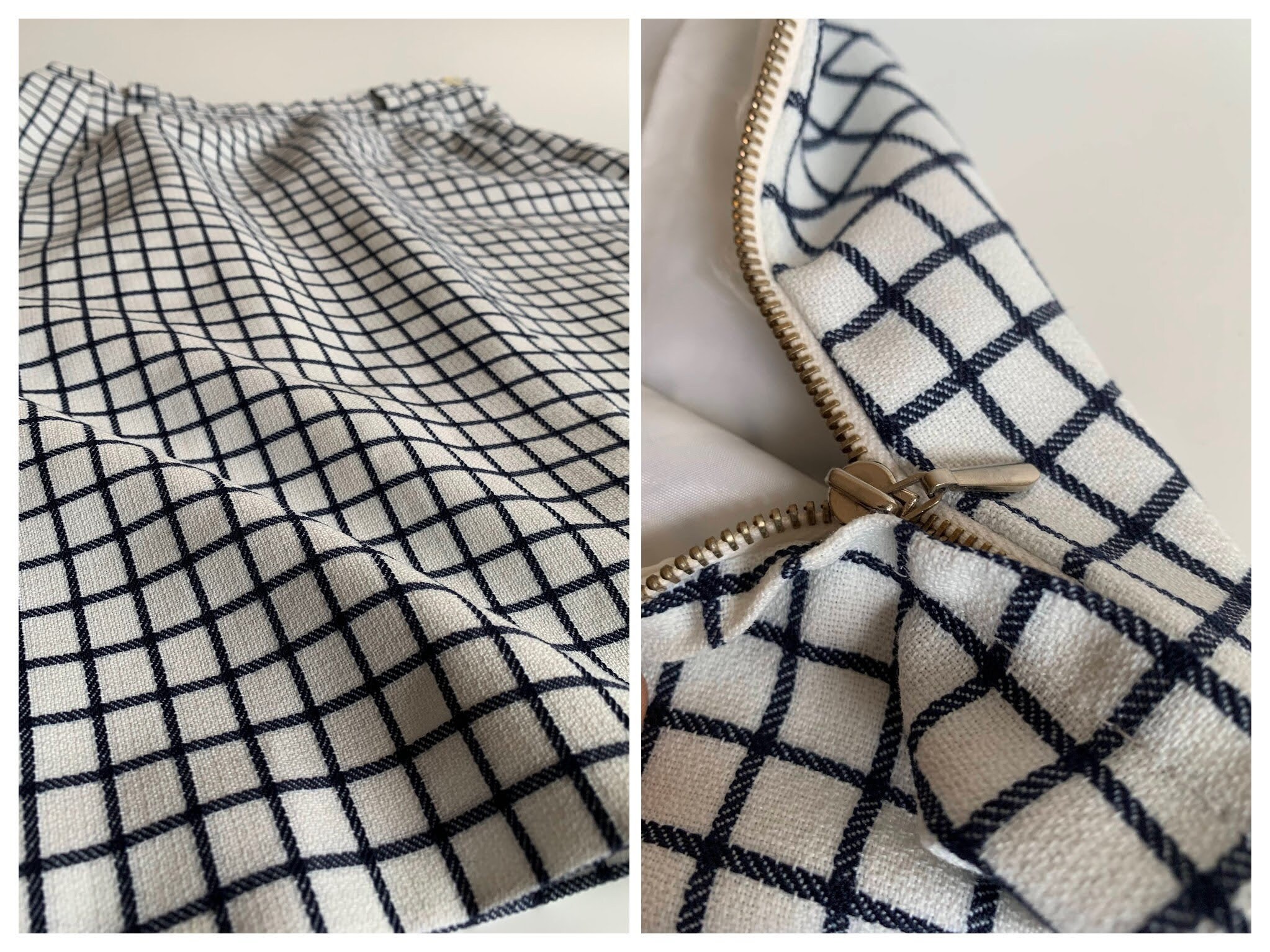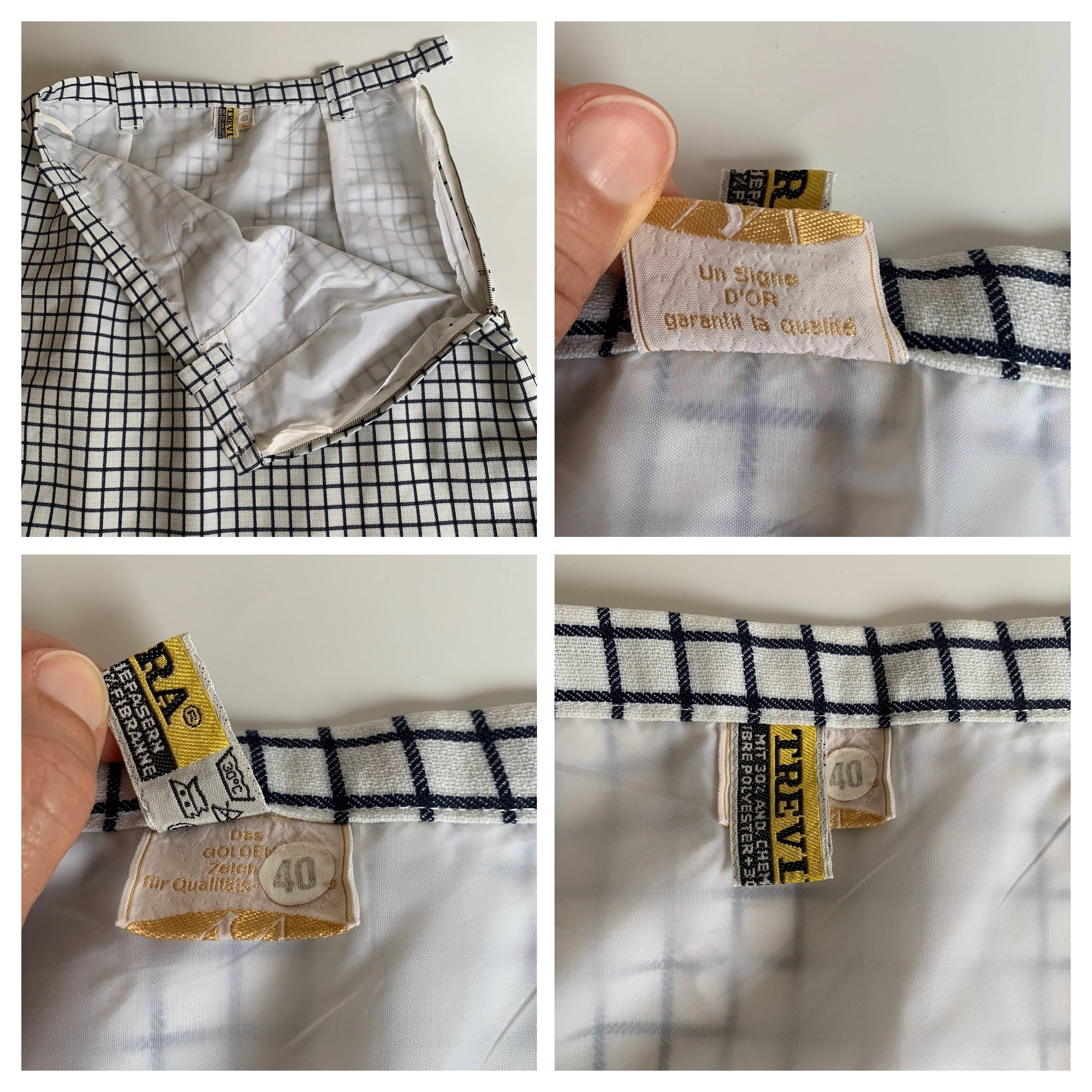 This is a vintage Trevira midi skirt made of thick heavy polyester blend fabric in white and deep navy blue which almost looks black. This classic A line skirt falls to below the knees. It has side metal zip and button closure with polyester lining. This plaid midi skirt has belt loops. The size marked is 40, which fits like size 8. Please check the measurements below.