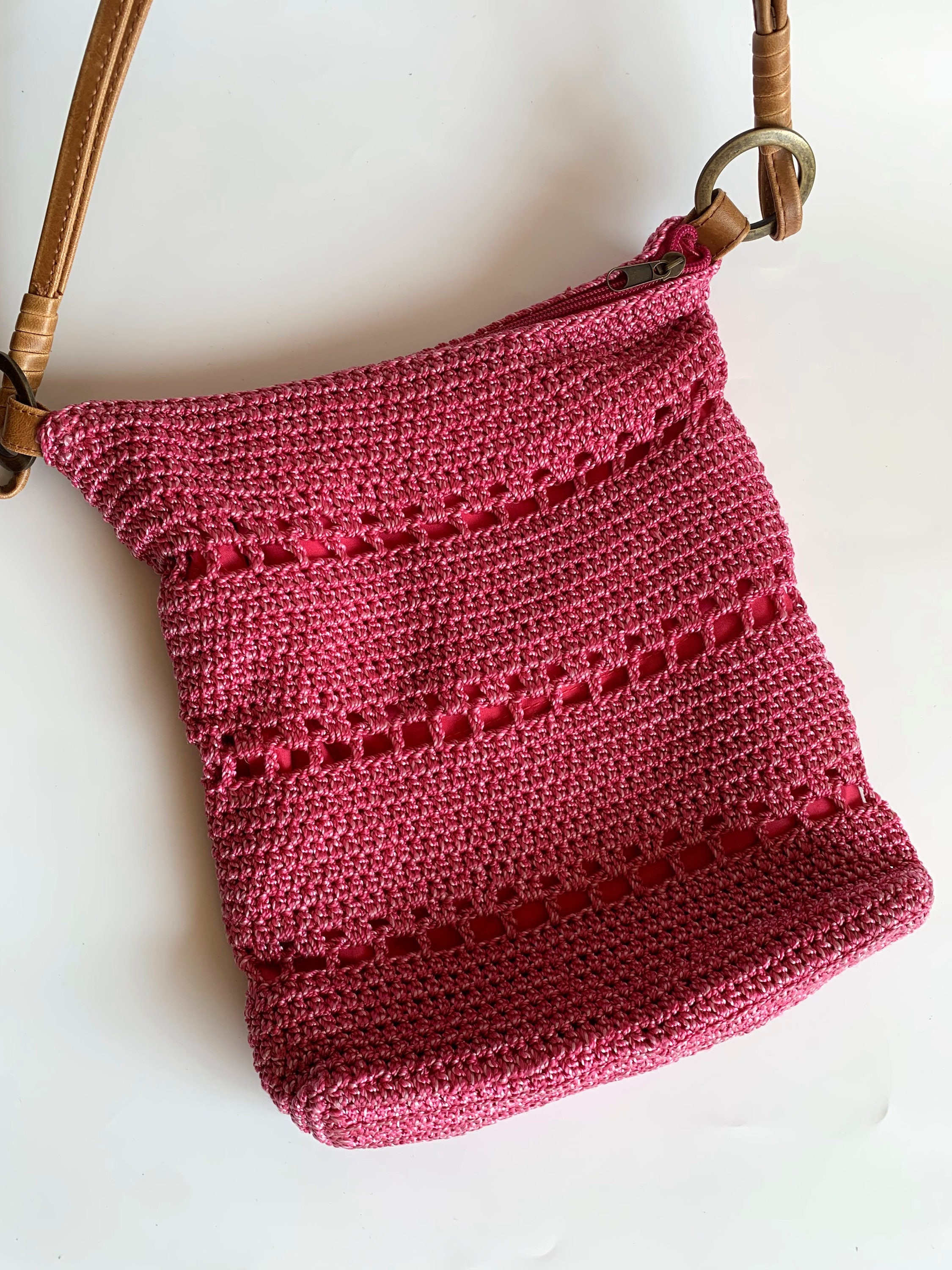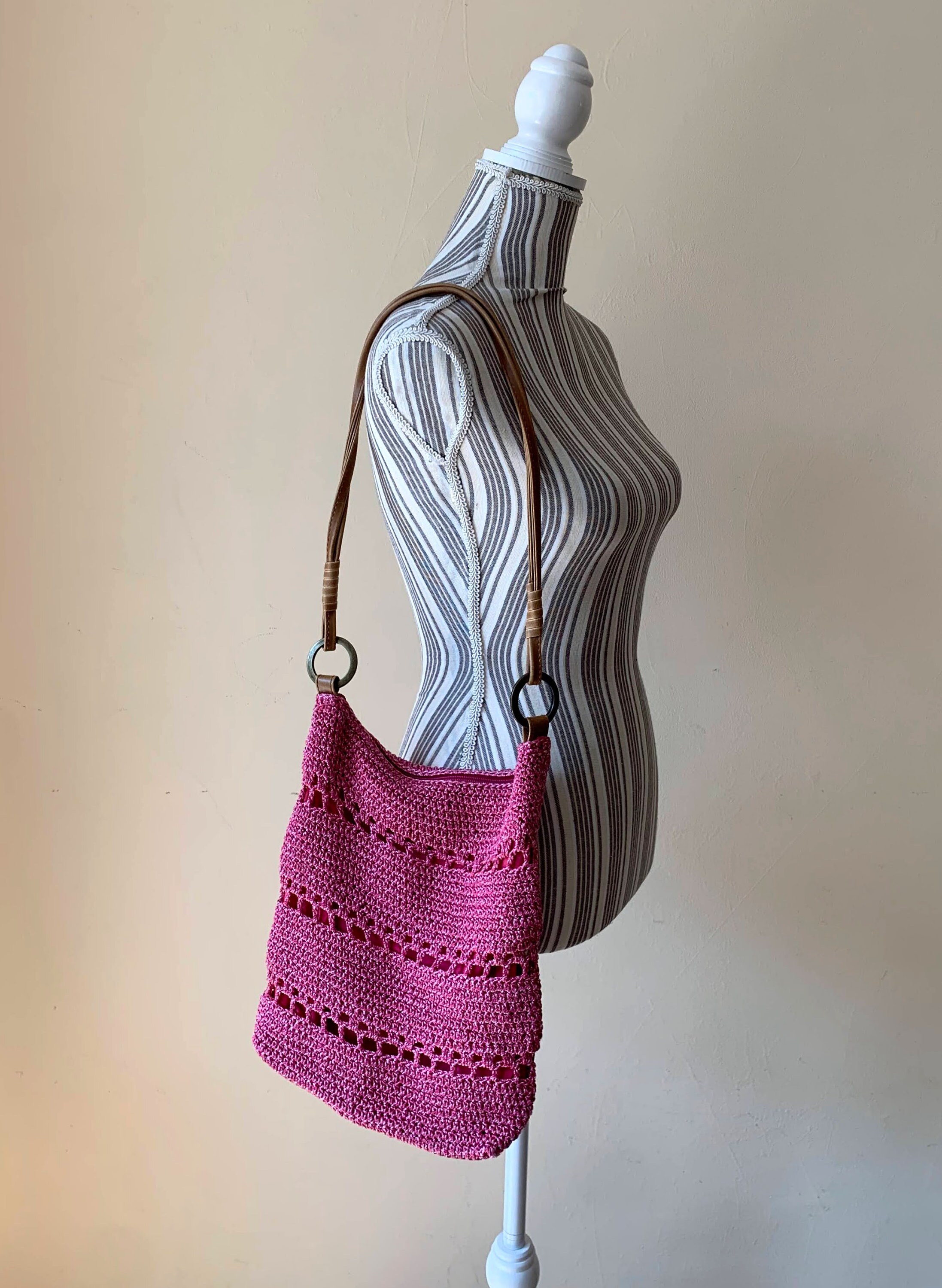 This is a vintage 90s bright pink crochet tote bag. This slouchy hobo bag has a top zip closure and cotton lining. This crochet shoulder purse has faux leather shoulder strap There is one compartment and one pocket inside.
