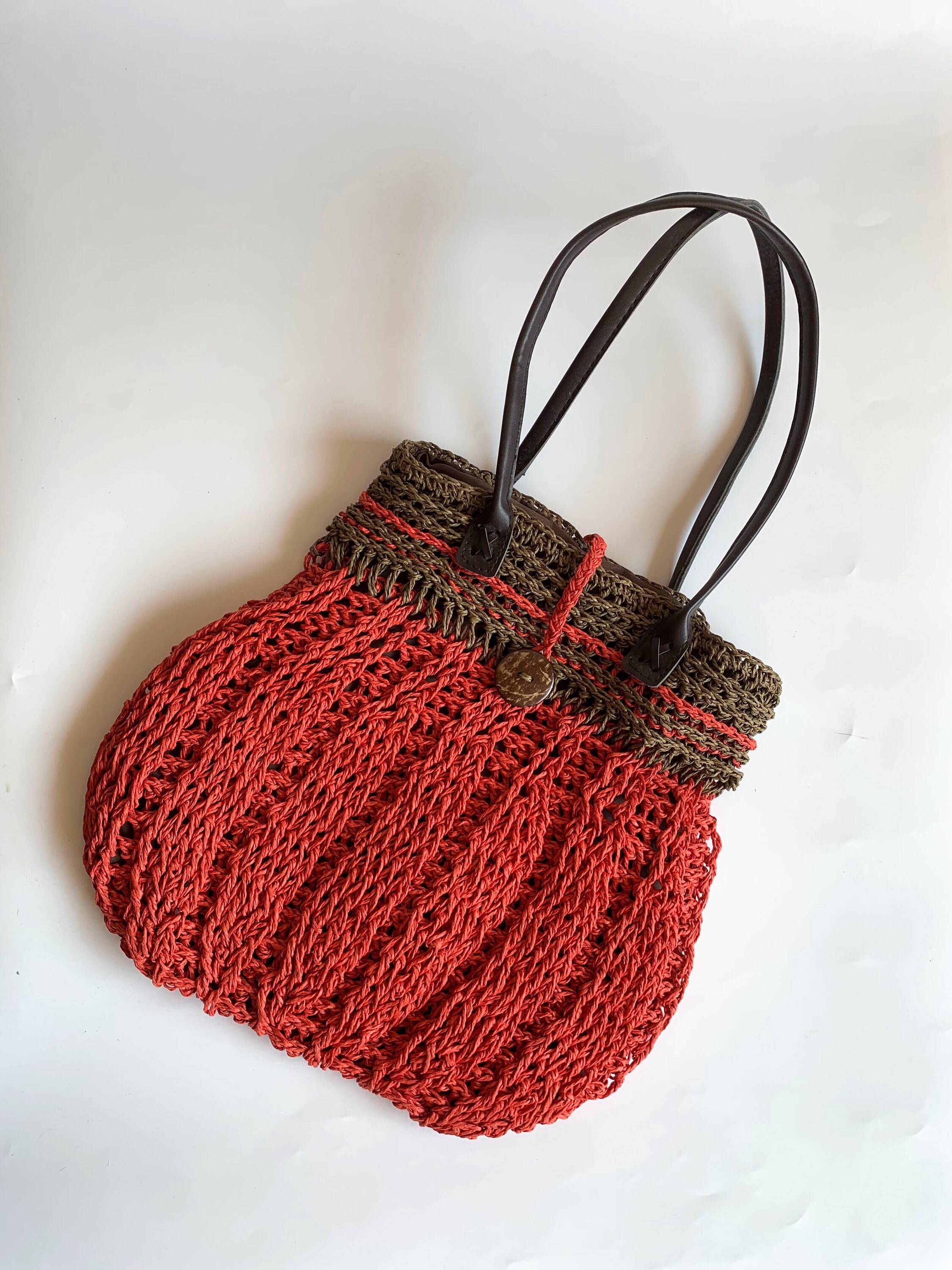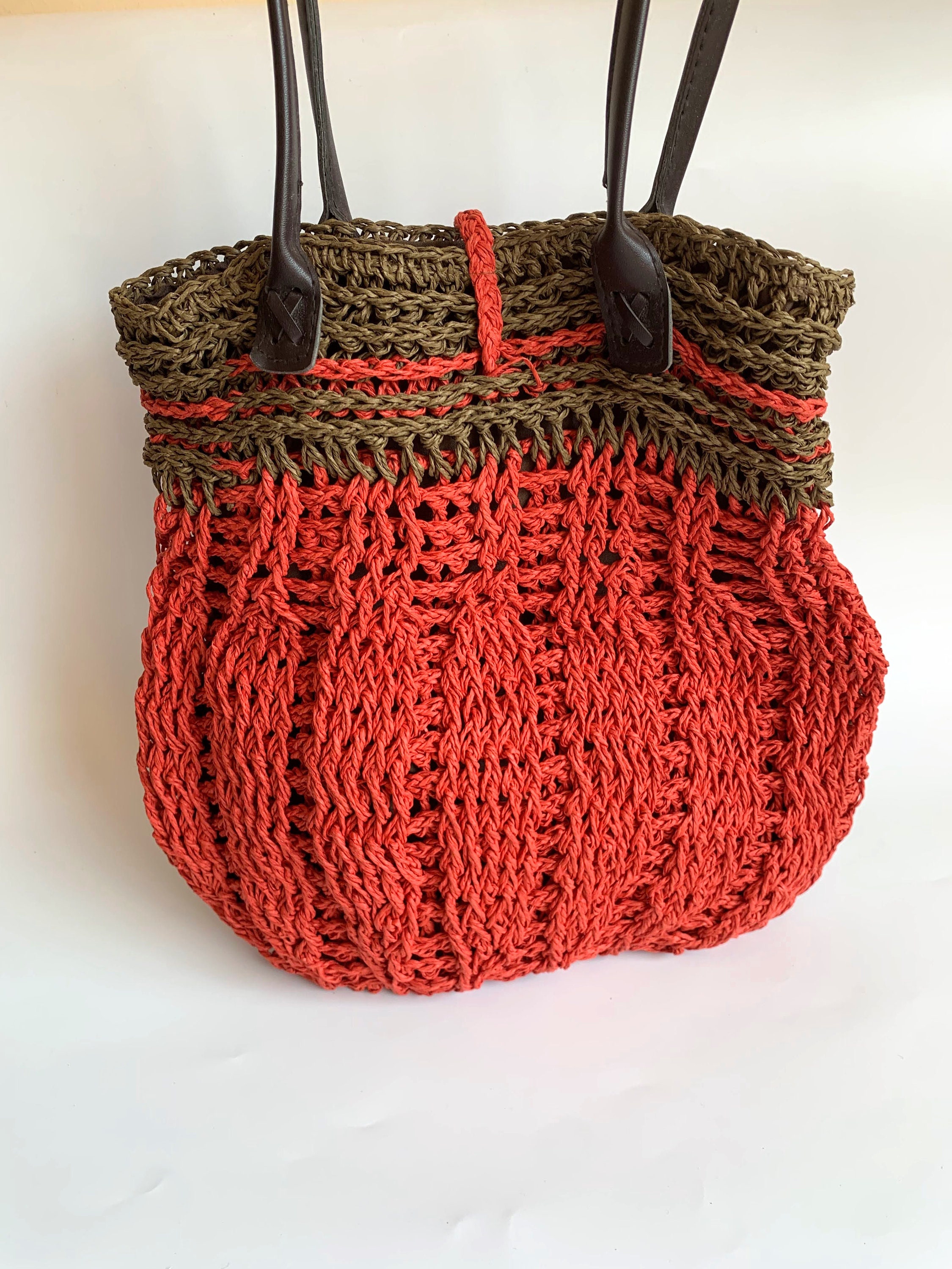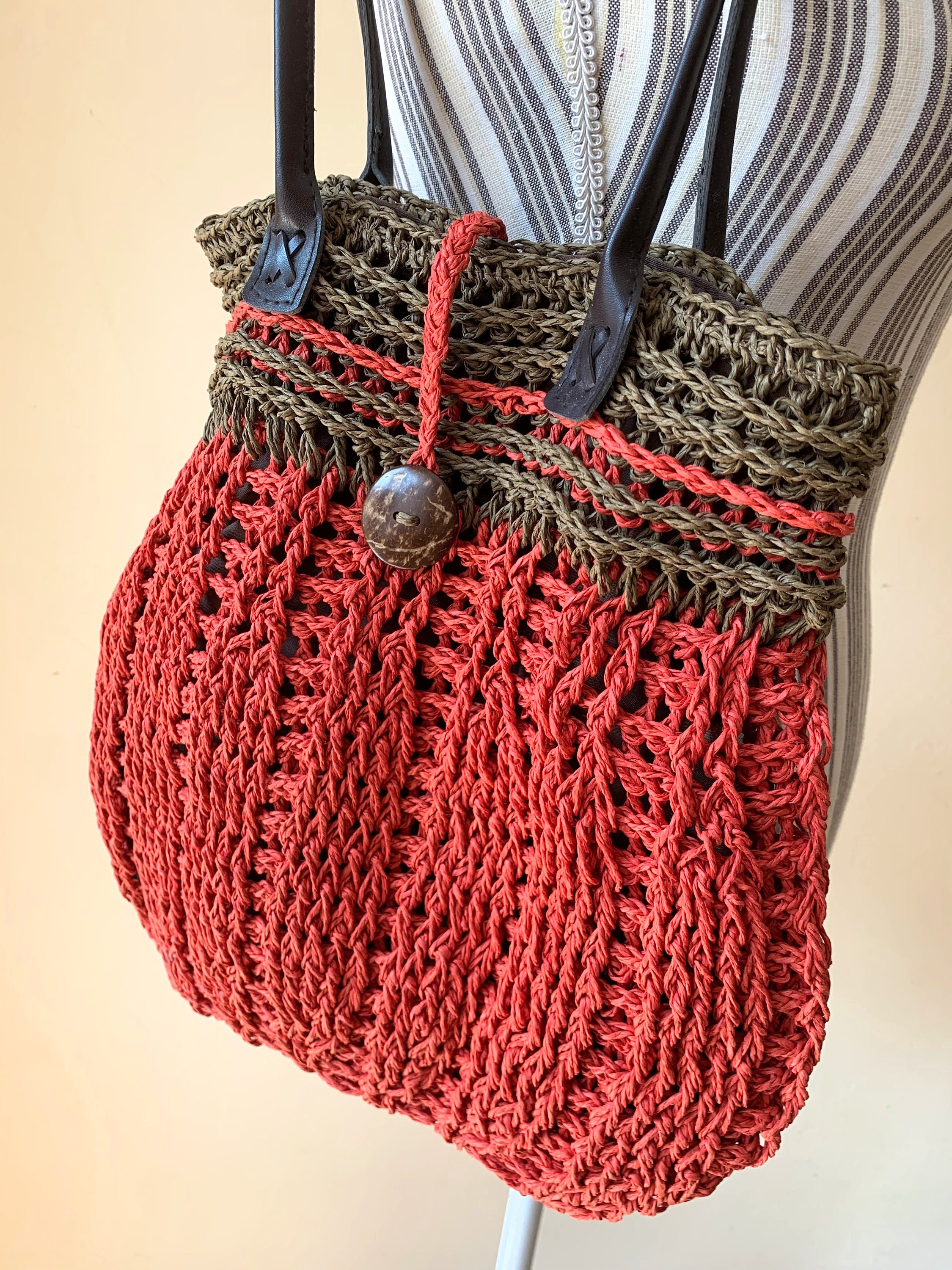 This is a vintage 90s crochet tote bag made of natural sisal in terracotta red and olive green color. This crochet straw purse has an open top with button closure. The interior is lined in cotton fabric. This summer shoulder bag has one compartment and one pocket inside. This medium size shoulder bag is super lightweight and comfortable to wear. It will add a pop of the hippie vibes from the 70s to your outfit.