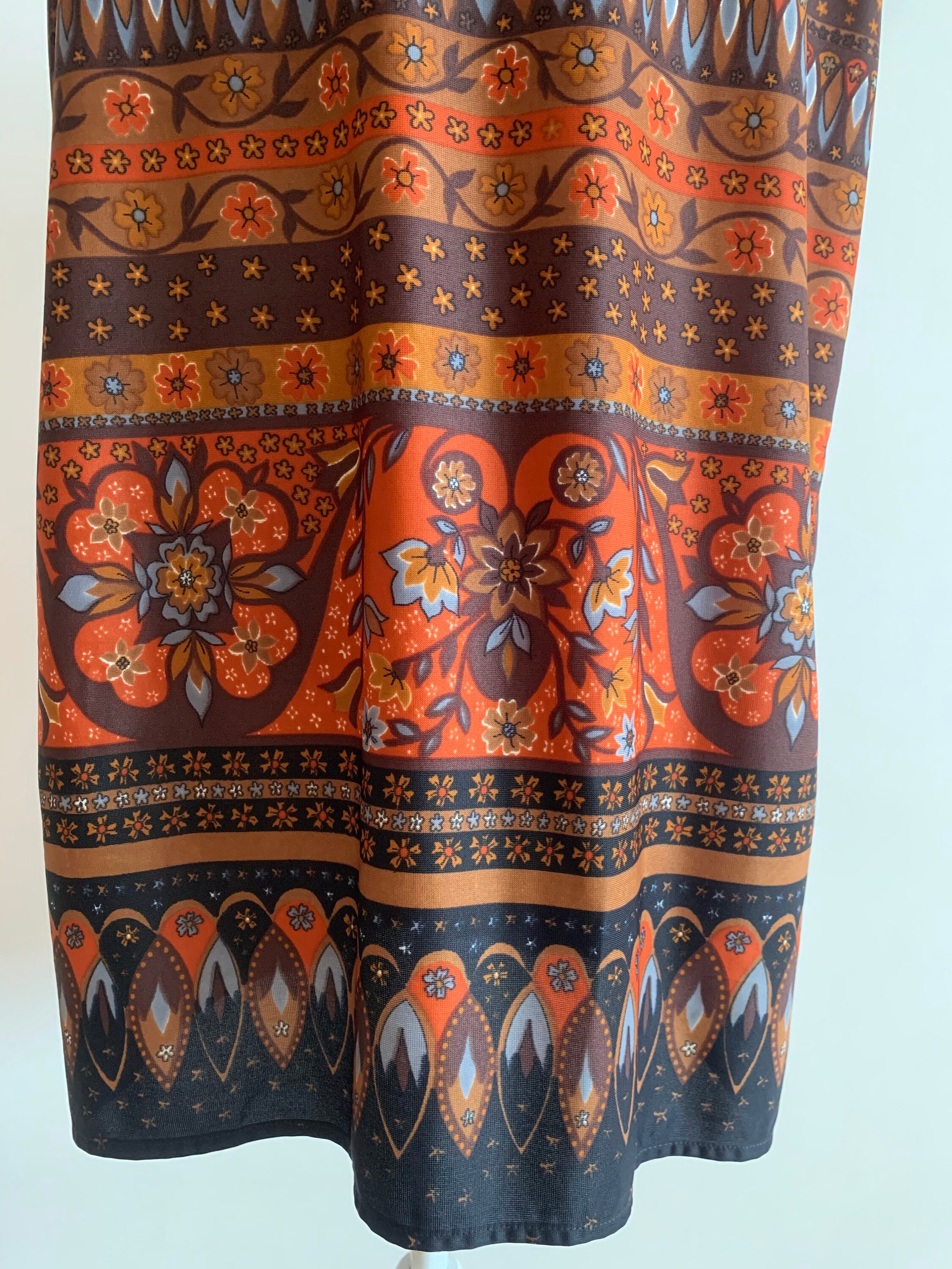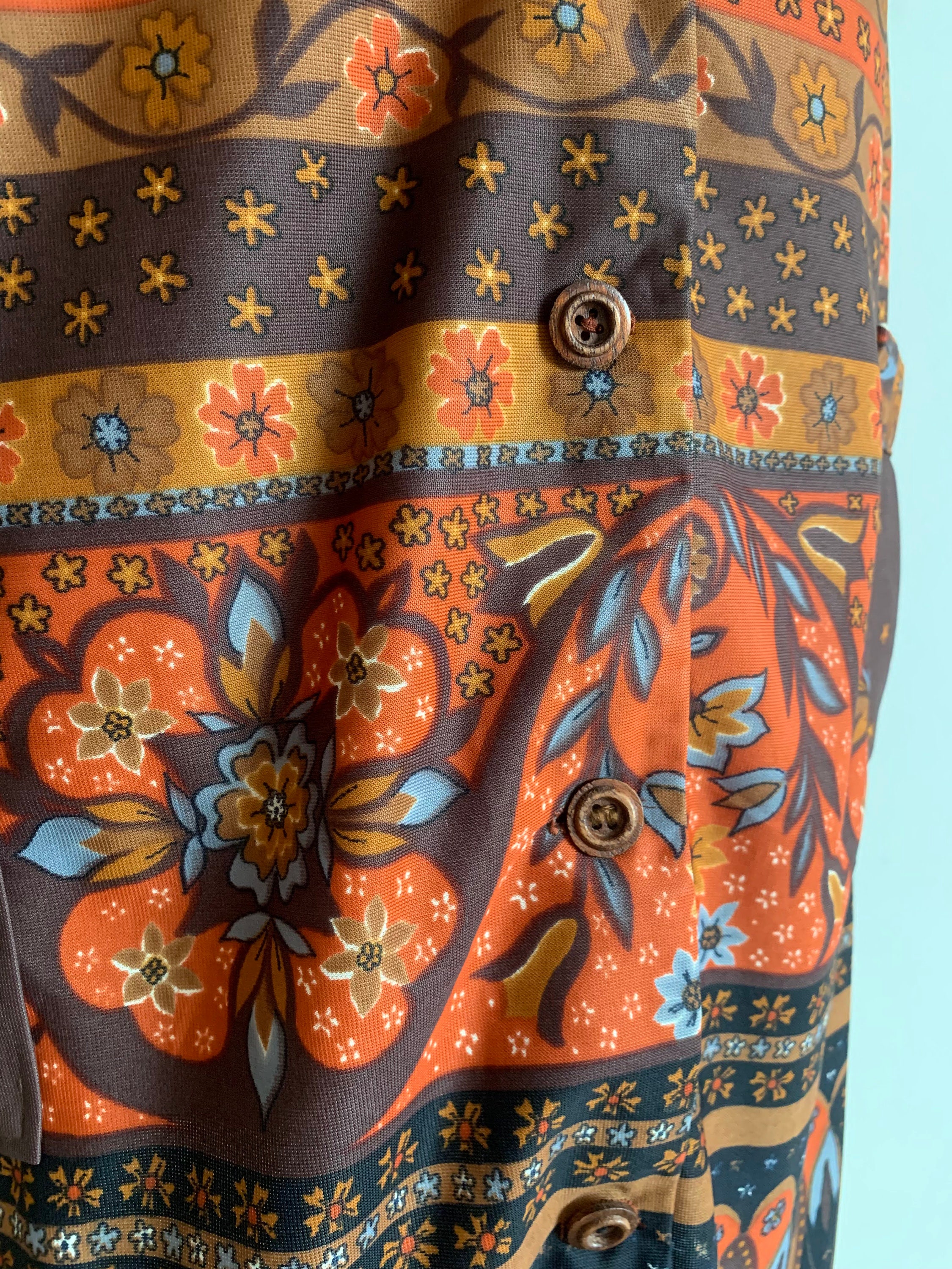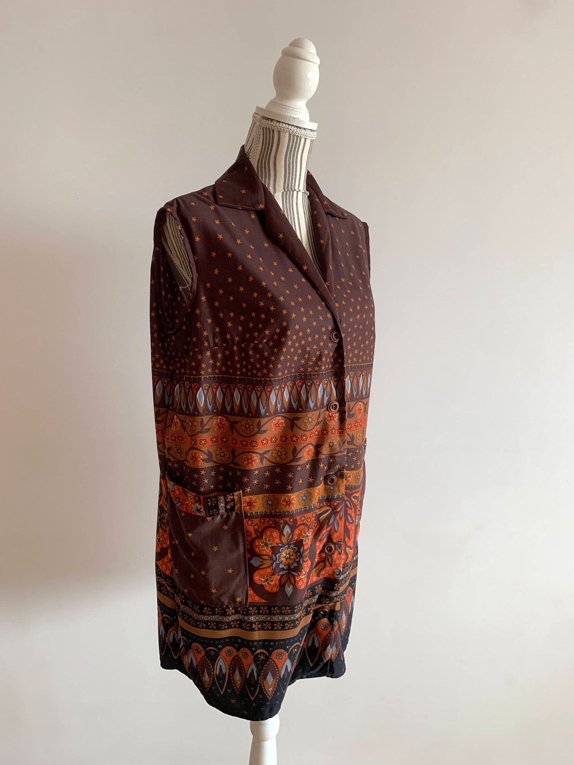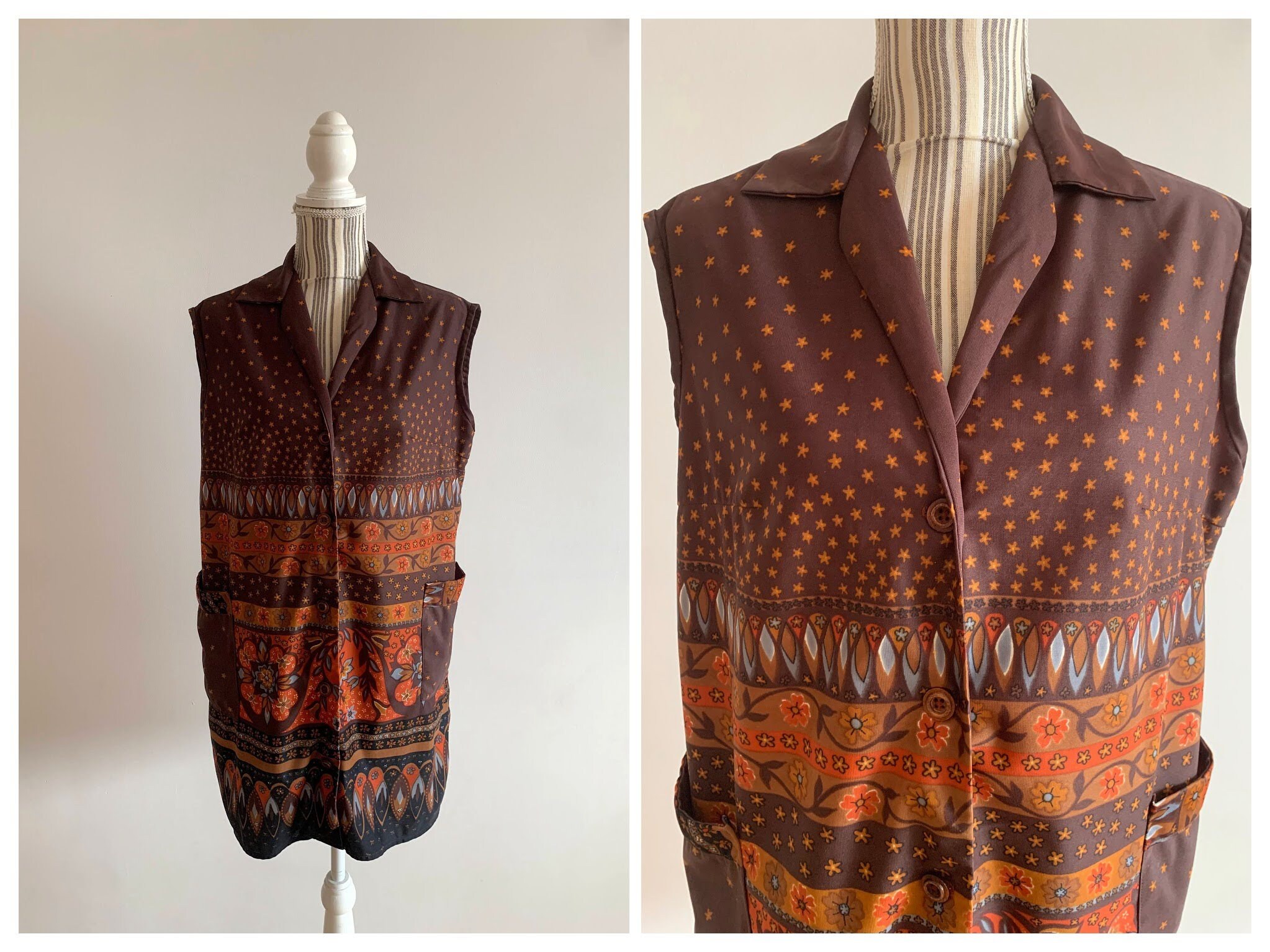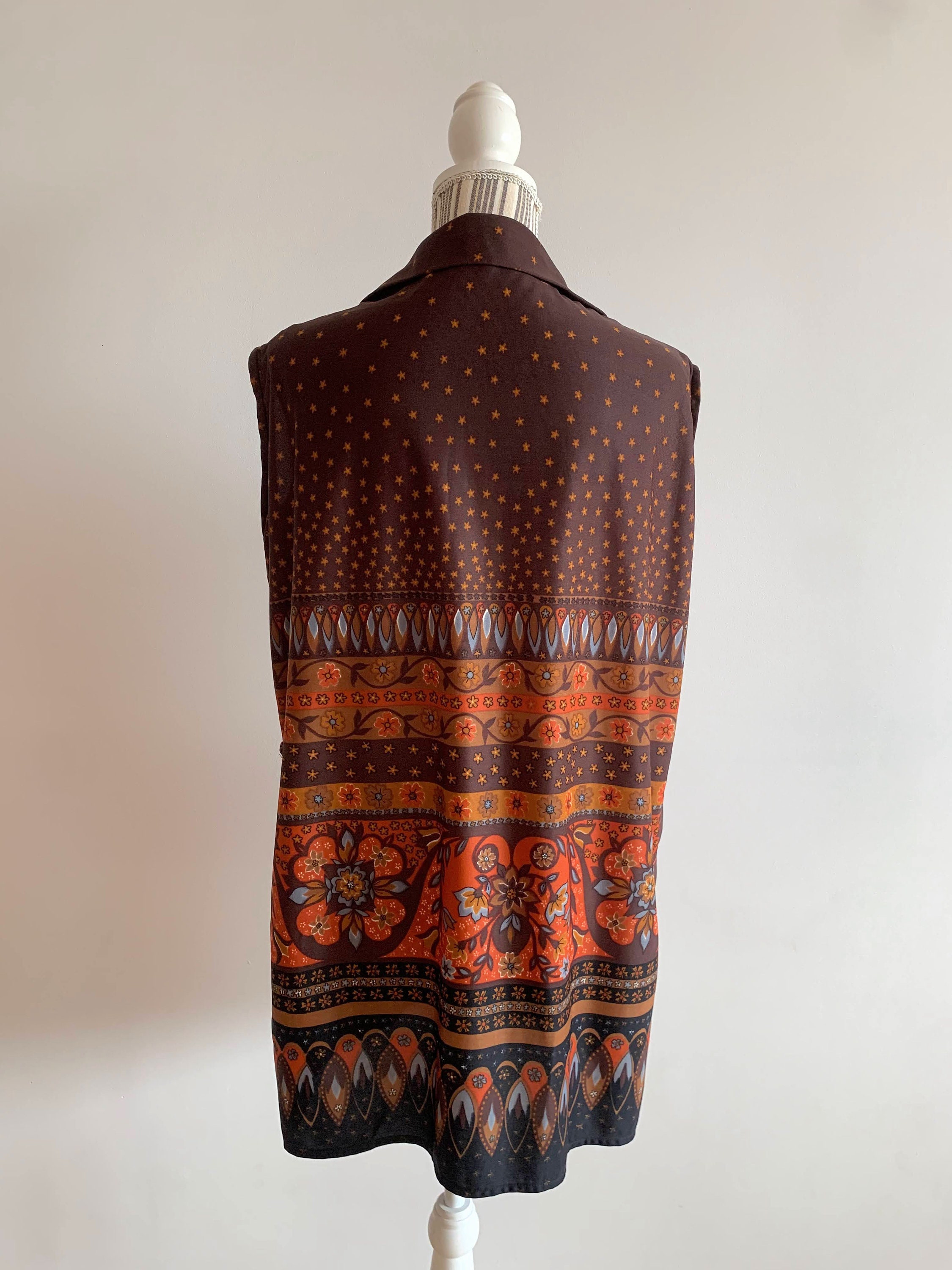 Beautiful vintage 70s bohemian floral print button up vest for women with pockets. This jersey fabric abstract floral print vest is size large, it probably fits like size XL. The lovely orange floral print is over warm brown base, the print changes gradually to batik. This boho vest will add a pop of 70s vibe to your outfit.