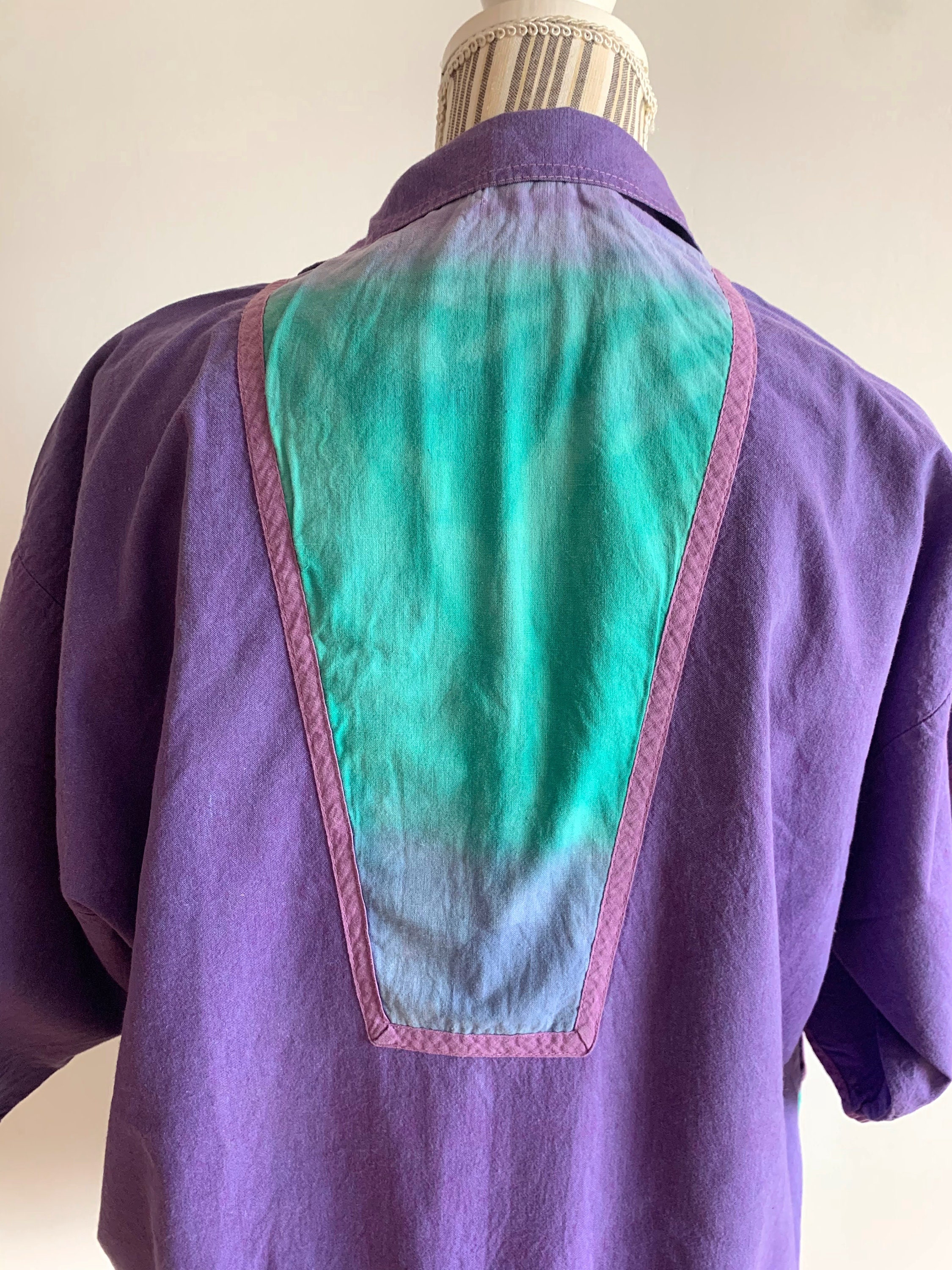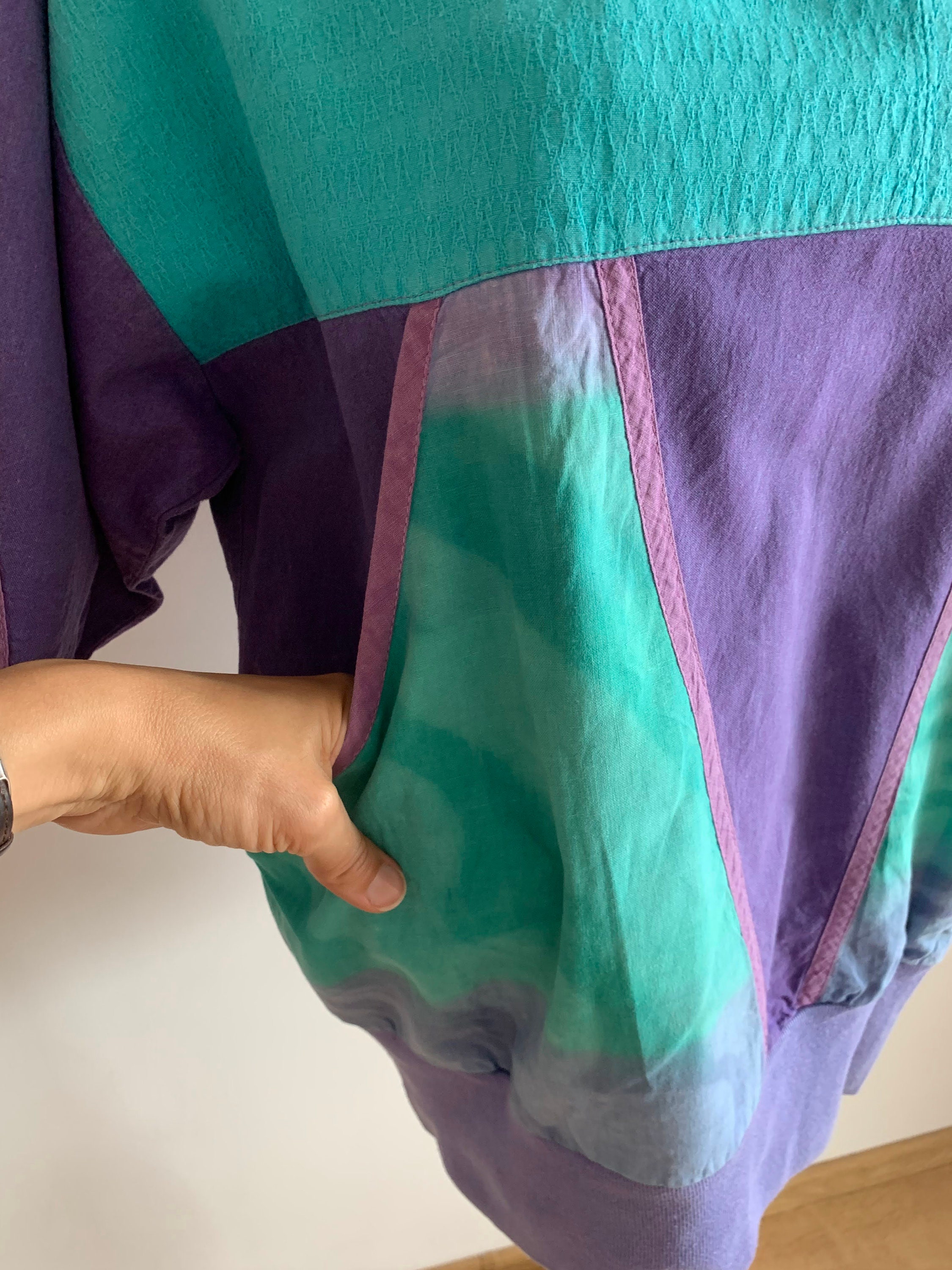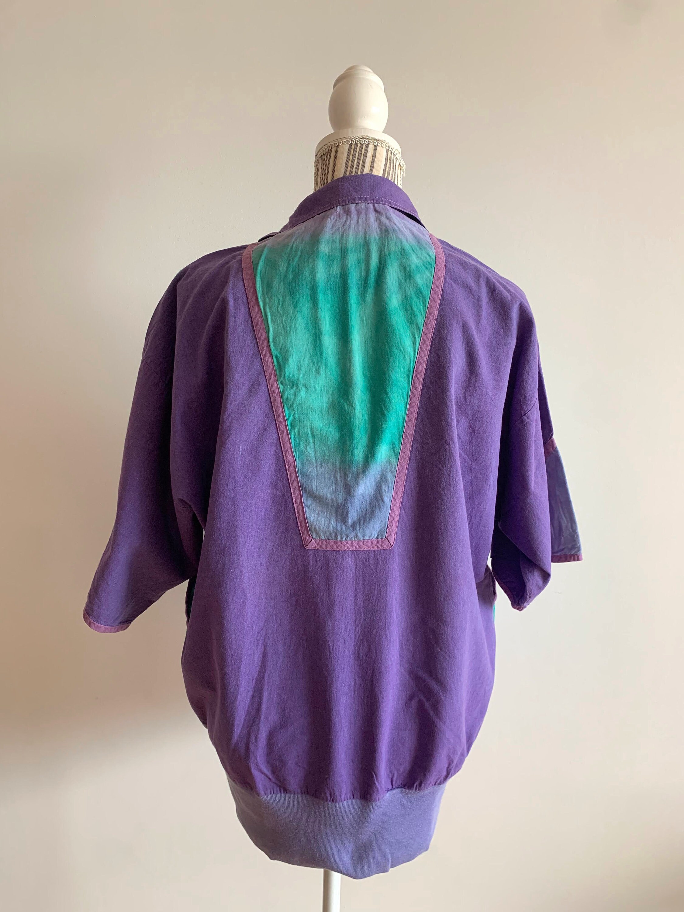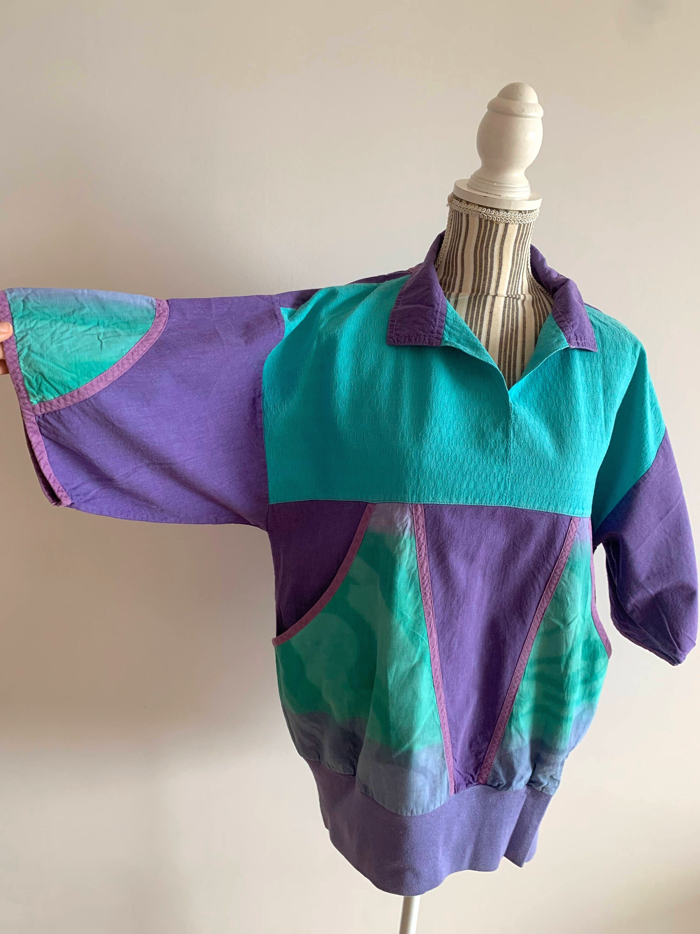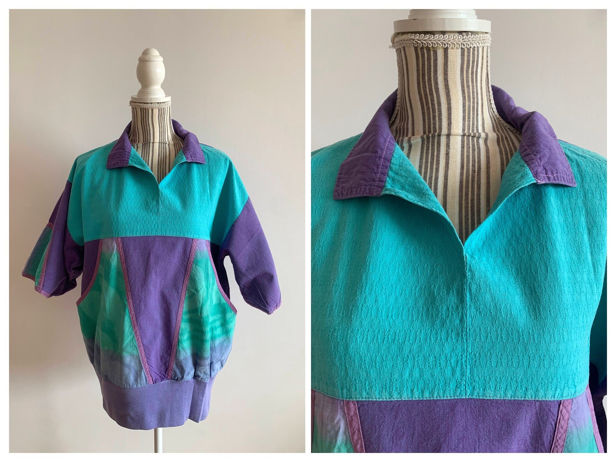This is a vintage 80s windbreaker track shirt in pastel colors. This short sleeve bomber jacket is in lovely pastel colors. This collared pullover top is in teal blue purple color. block tie dye loose fit pullover top for men or women. This unisex baggy summer windbreaker jacket style shirt has large statement pockets on both sides. It has wide short sleeves. This oversized track top has elasticated waist. The fabric is a cotton blend - 60% cotton, 40% polyester. This relaxed fit collared shirt fits like size M or L. Please check the measurements below.