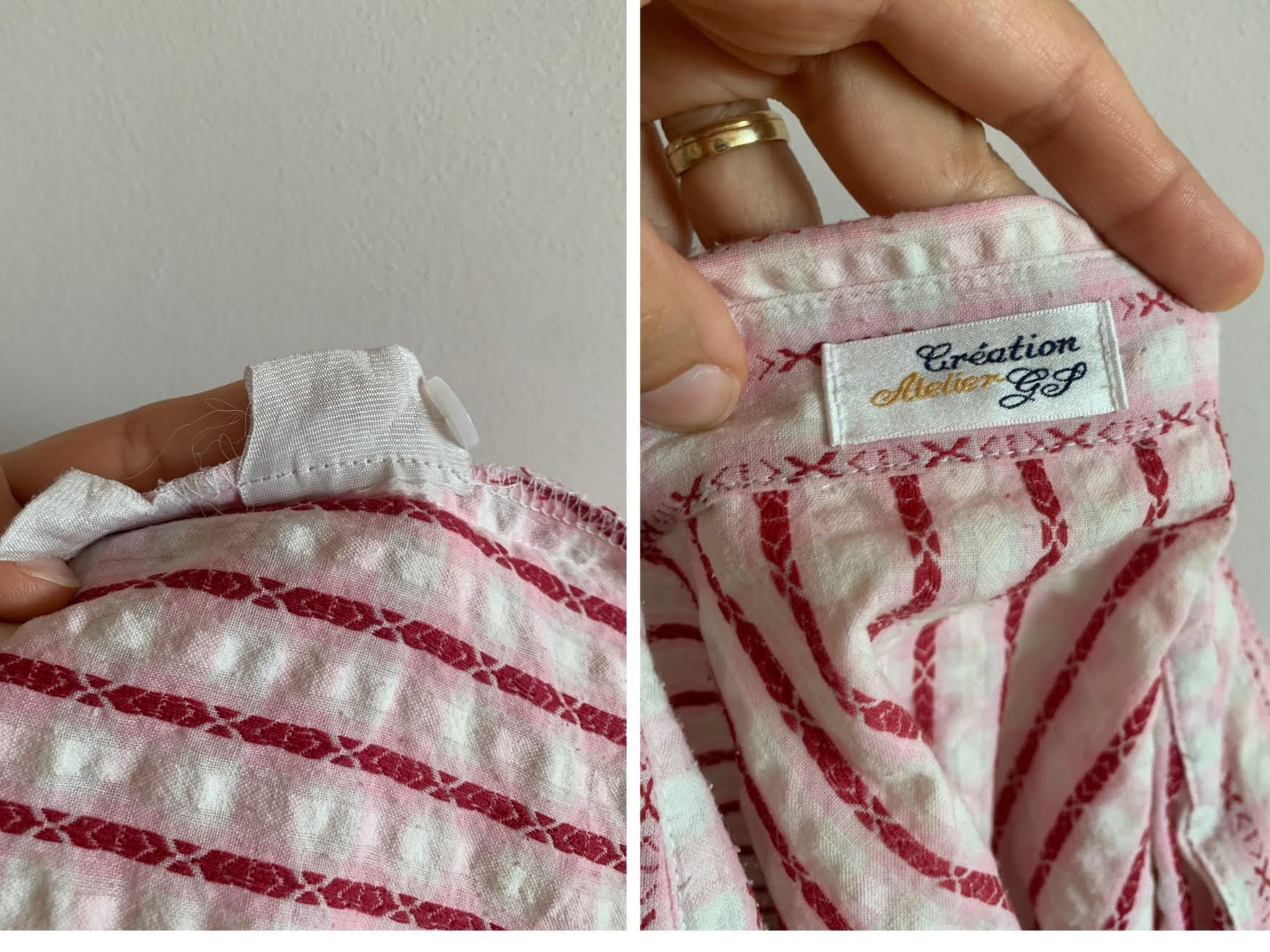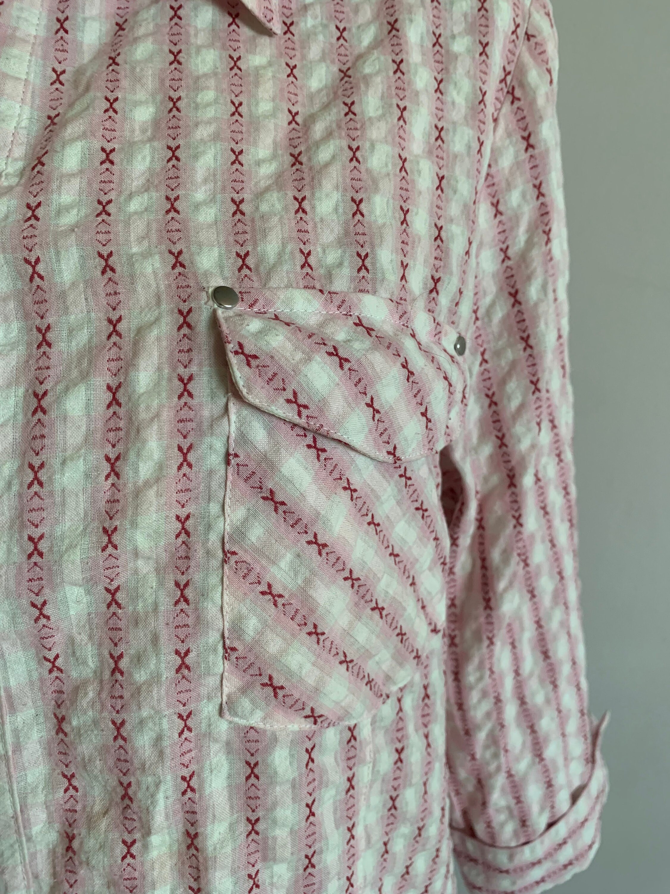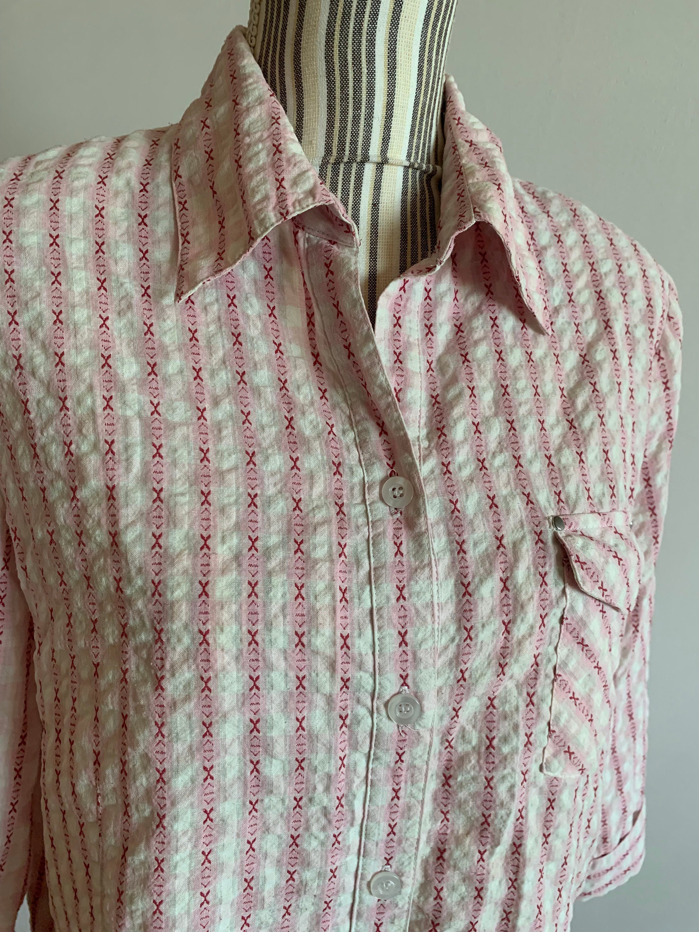 This is a vintage 90s crepe cotton striped shirt for women by the brand Creation Atelier GG. This white and pink striped shirt has button front closure and cutaway collar. This cotton crepe shirt has half sleeves and a front pocket. This loose fit textured shirt has a relaxed fit boxy silhouette. This vintage button down is made of beautiful cotton fabric which feels awesome on the skin. There is no size marked, however this women's shirt fits like size L. Please check the measurements below.