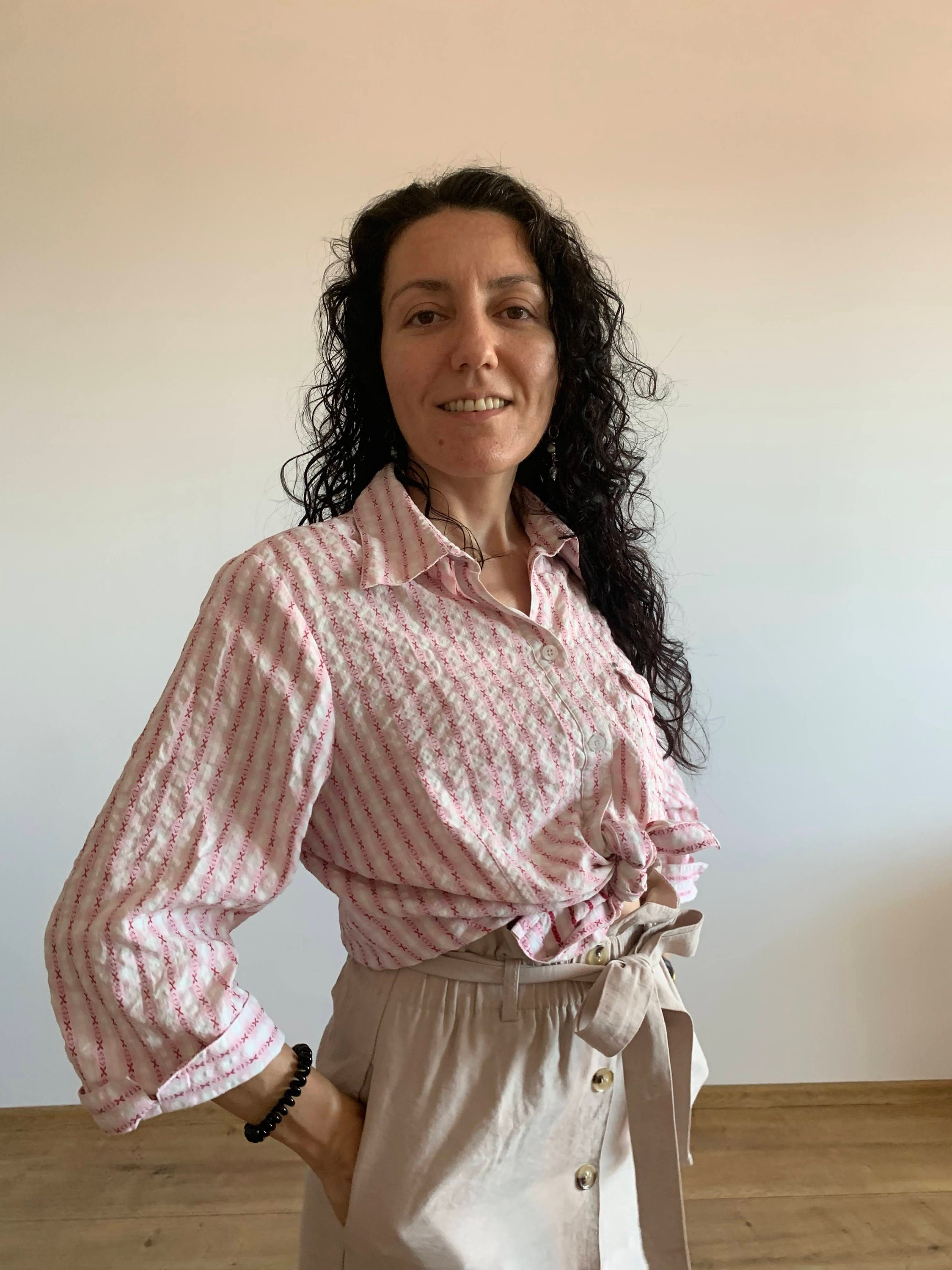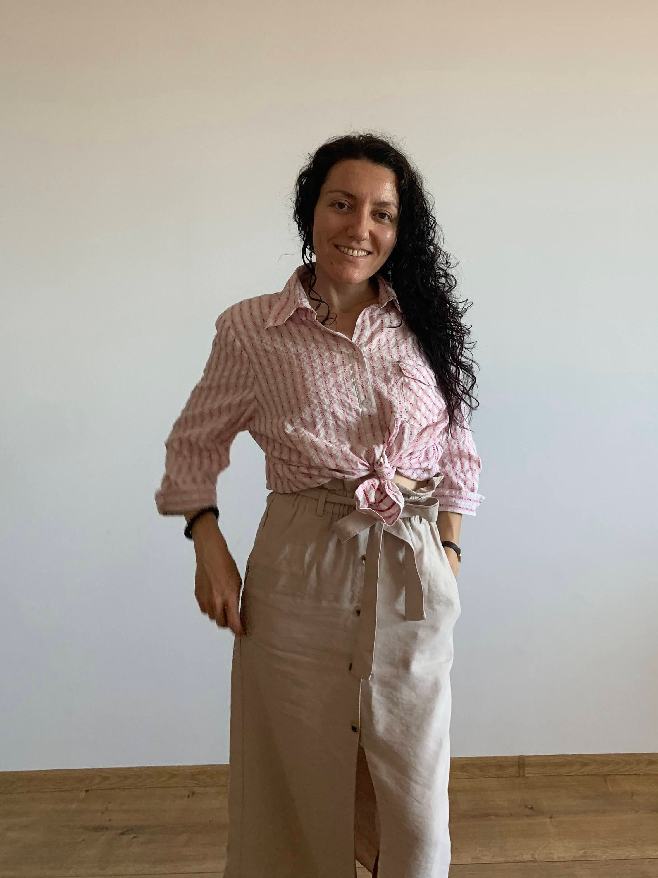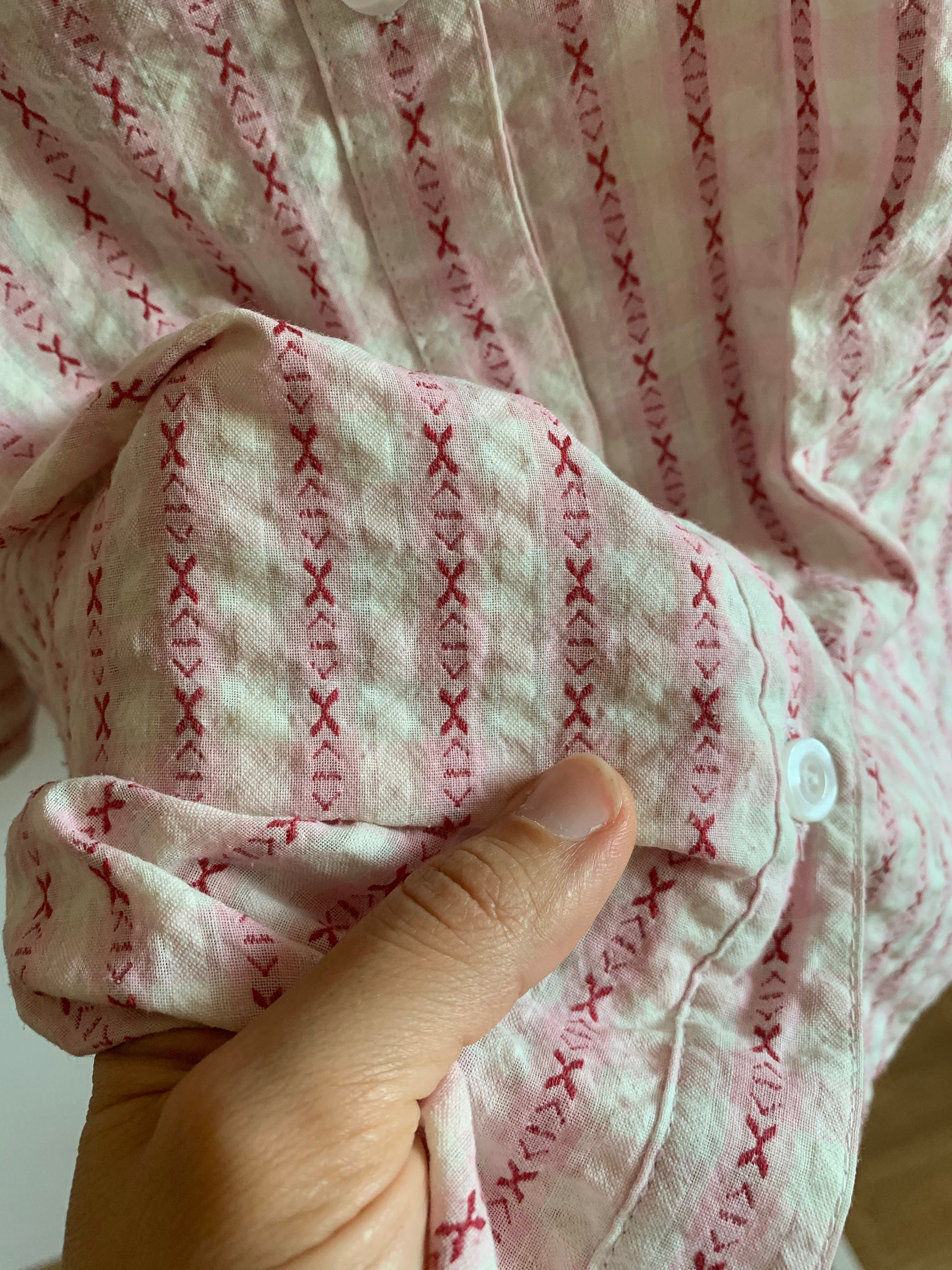 This is a vintage 90s crepe cotton striped shirt for women by the brand Creation Atelier GG. This white and pink striped shirt has button front closure and cutaway collar. This cotton crepe shirt has half sleeves and a front pocket. This loose fit textured shirt has a relaxed fit boxy silhouette. This vintage button down is made of beautiful cotton fabric which feels awesome on the skin. There is no size marked, however this women's shirt fits like size L. Please check the measurements below.