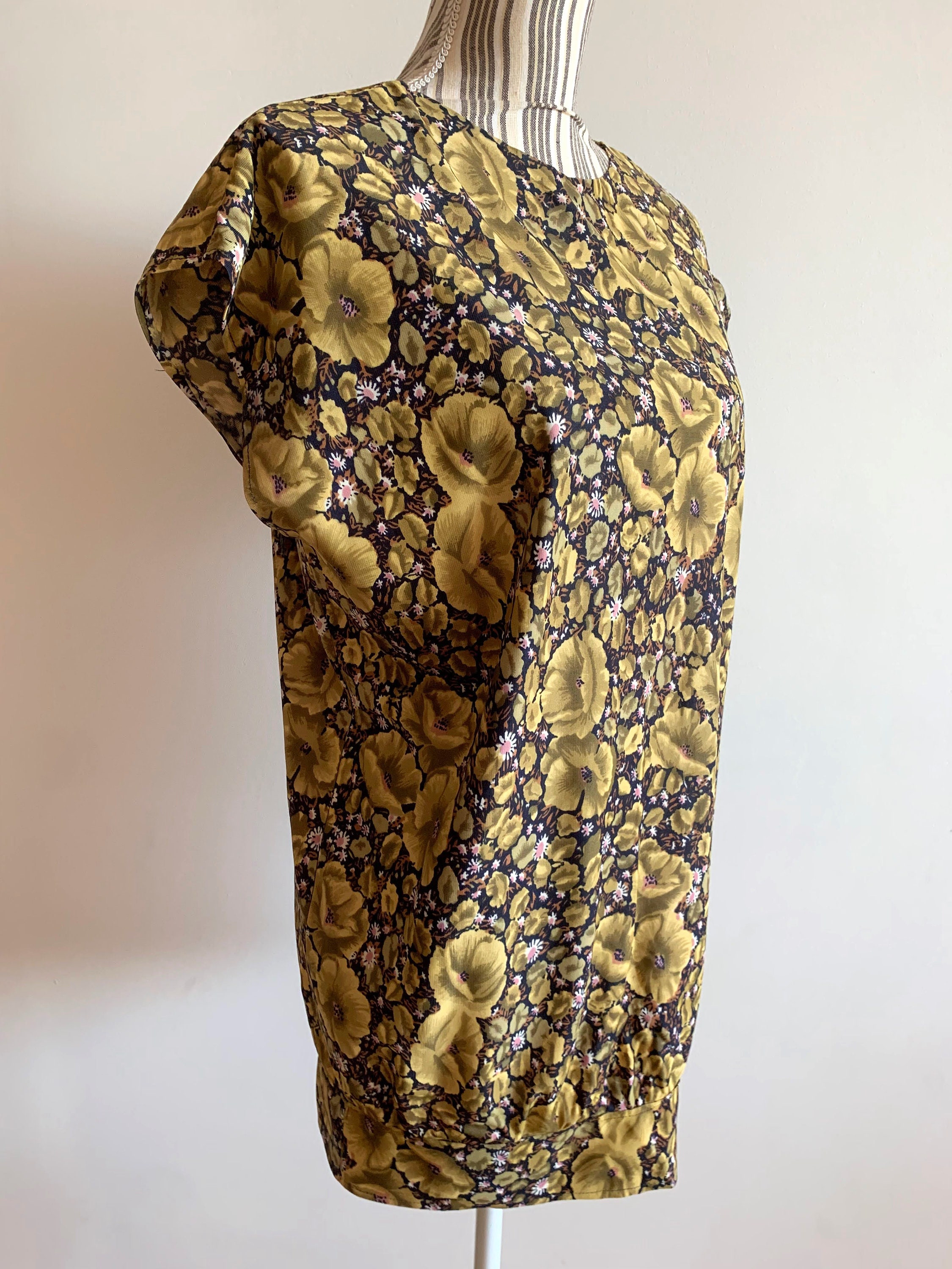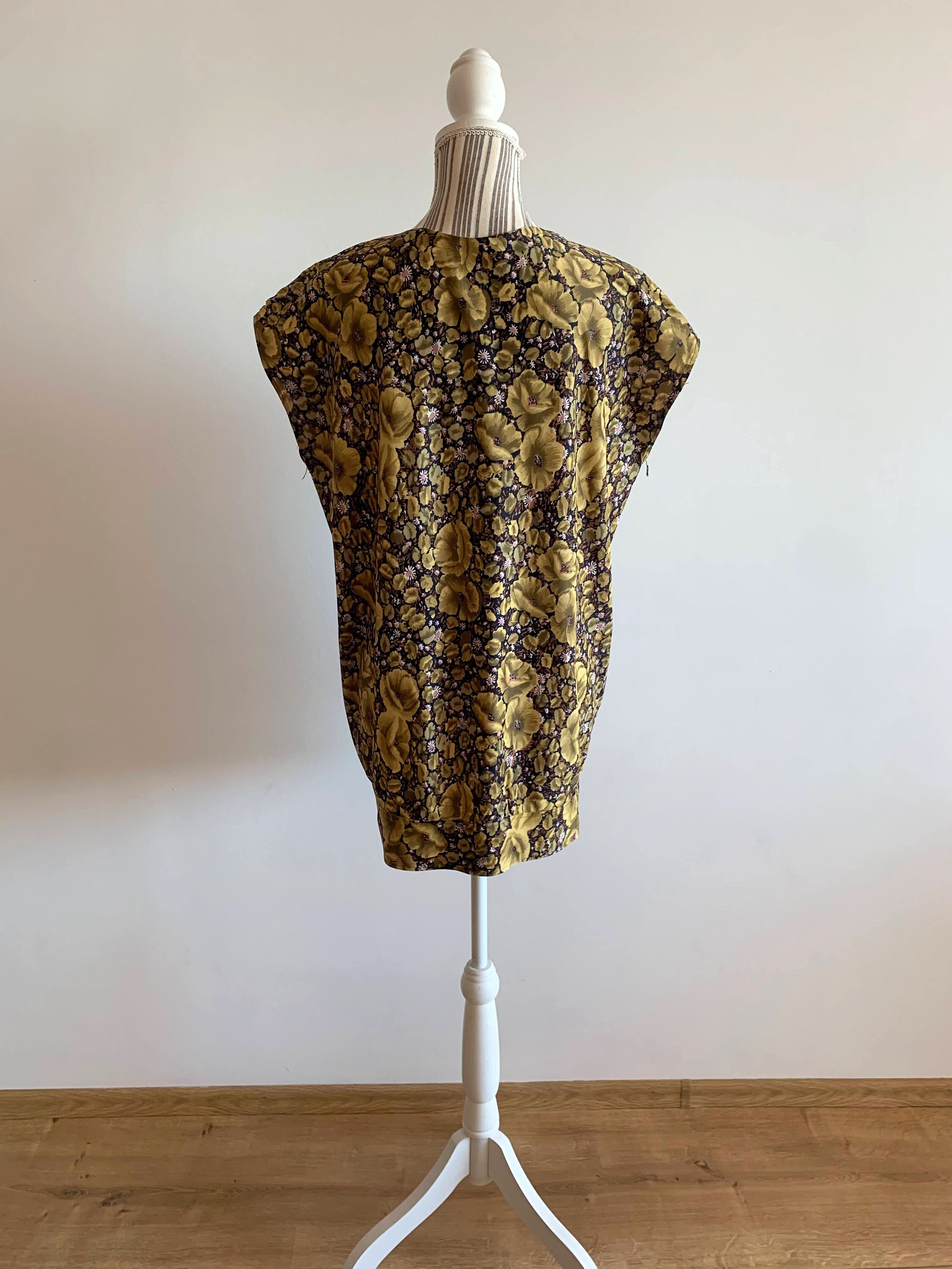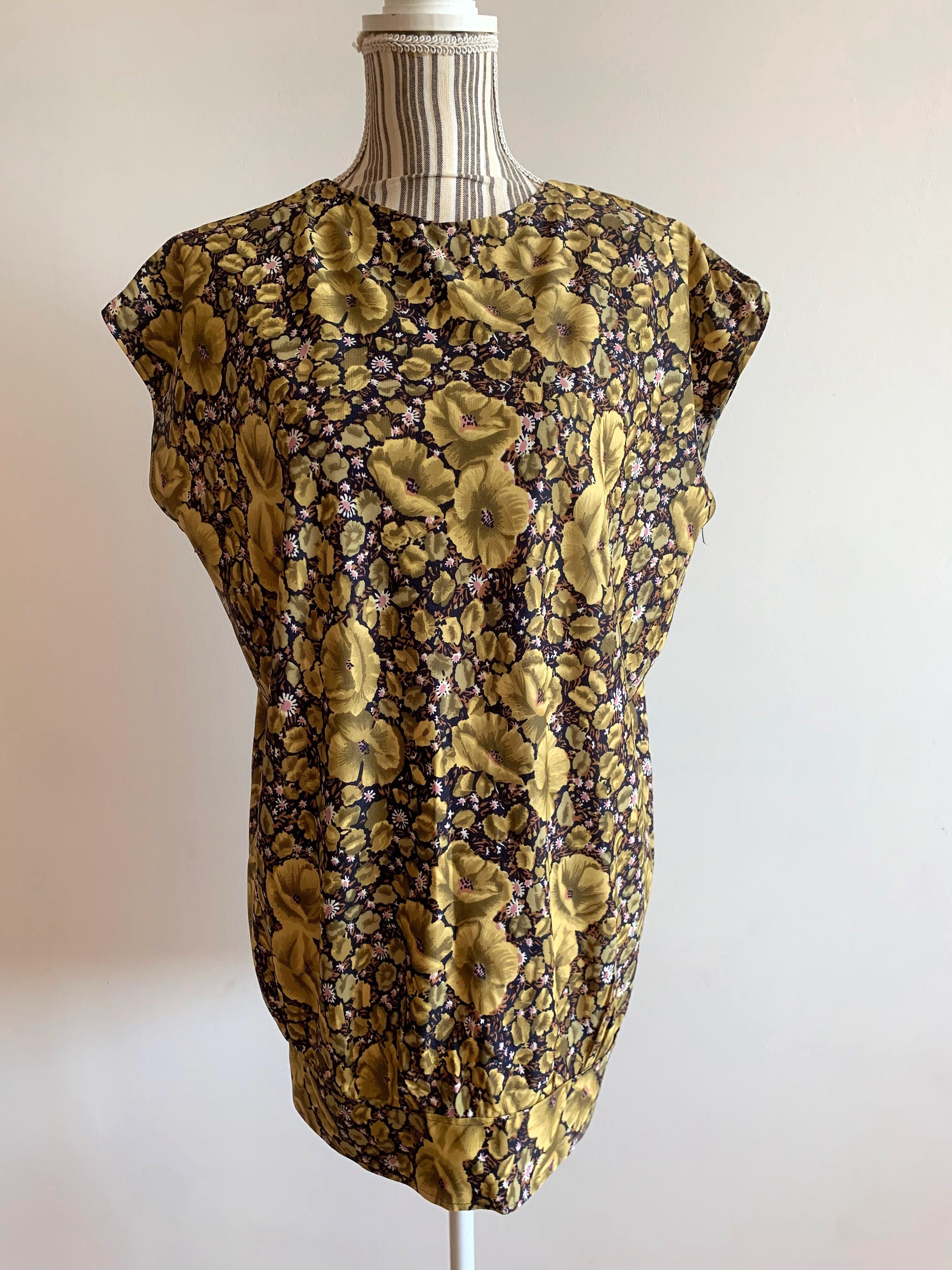 This is a lovely vintage 70s olive green floral print sleeveless summer top for women. This oversized shirt has a boxy top part and gathered bottom. As this boho blouse was handmade, there is no tag or label. This retro blouse has a boxy oversized look. It would best fit women's size M or L. Please check the measurements below.