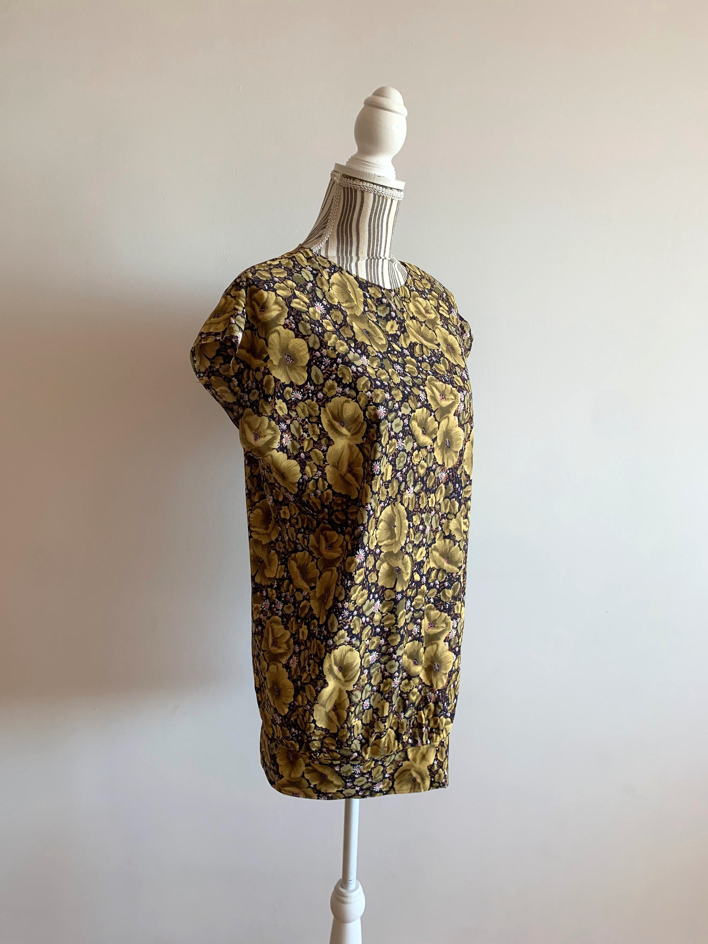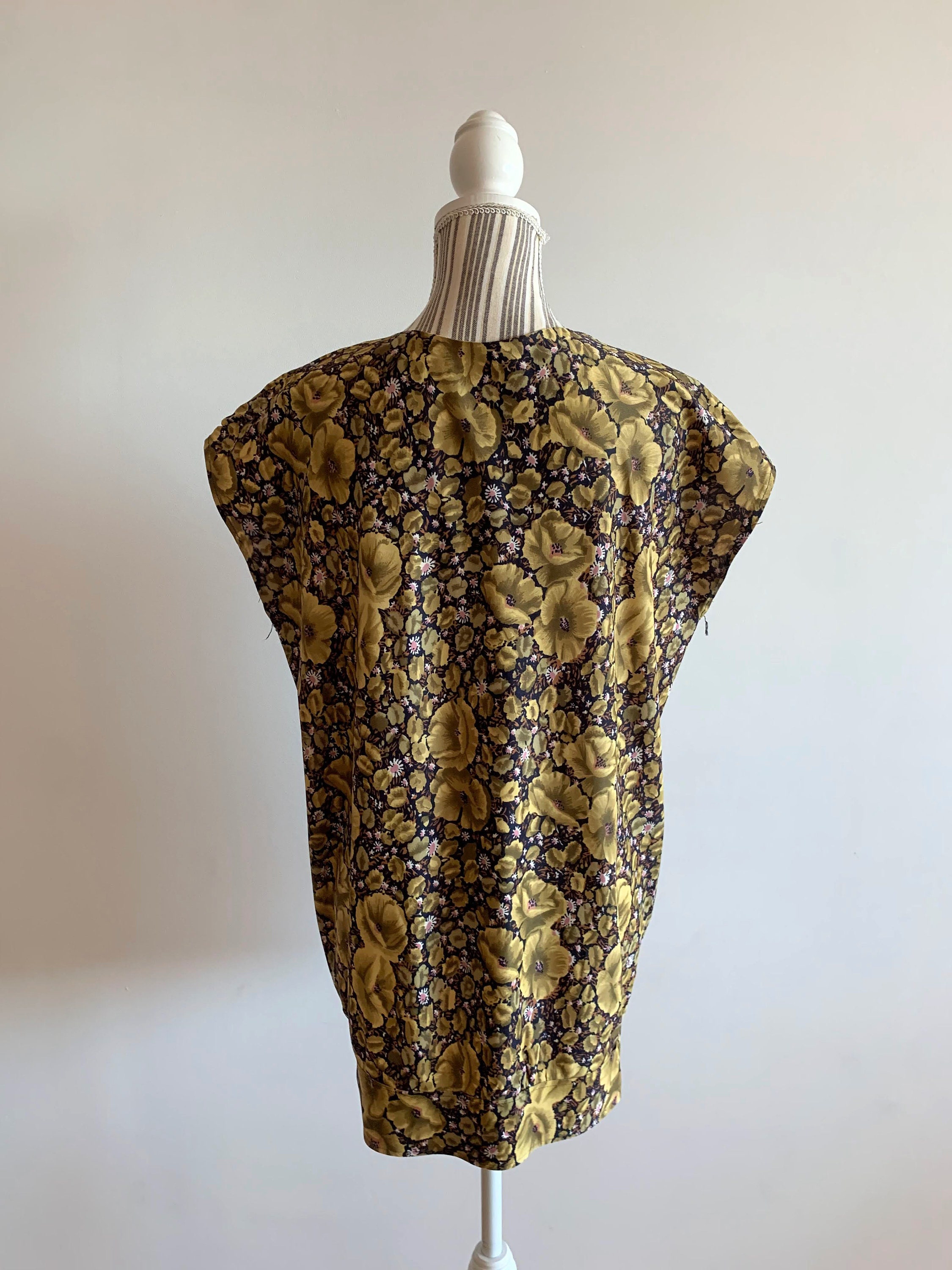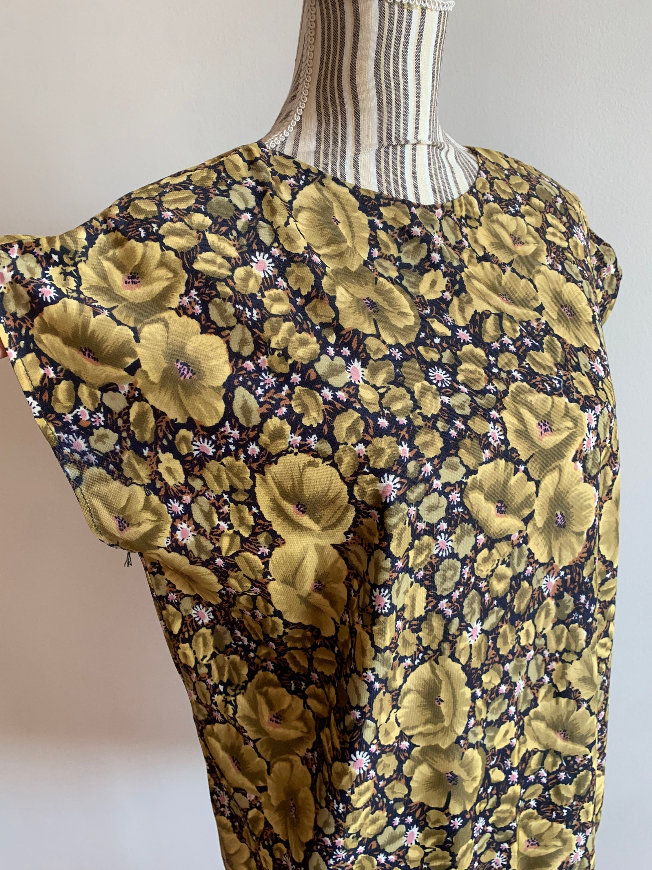 This is a lovely vintage 70s olive green floral print sleeveless summer top for women. This oversized shirt has a boxy top part and gathered bottom. As this boho blouse was handmade, there is no tag or label. This retro blouse has a boxy oversized look. It would best fit women's size M or L. Please check the measurements below.