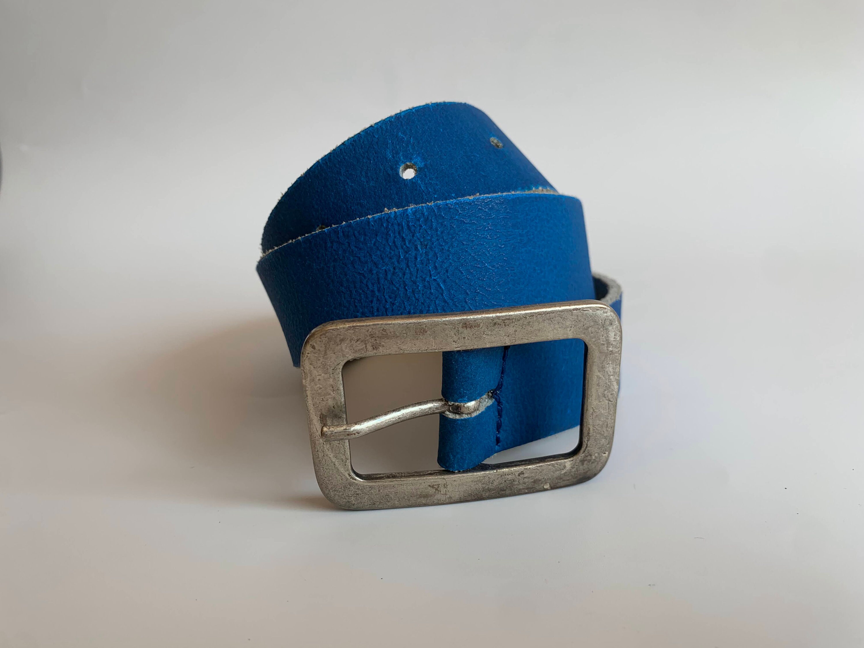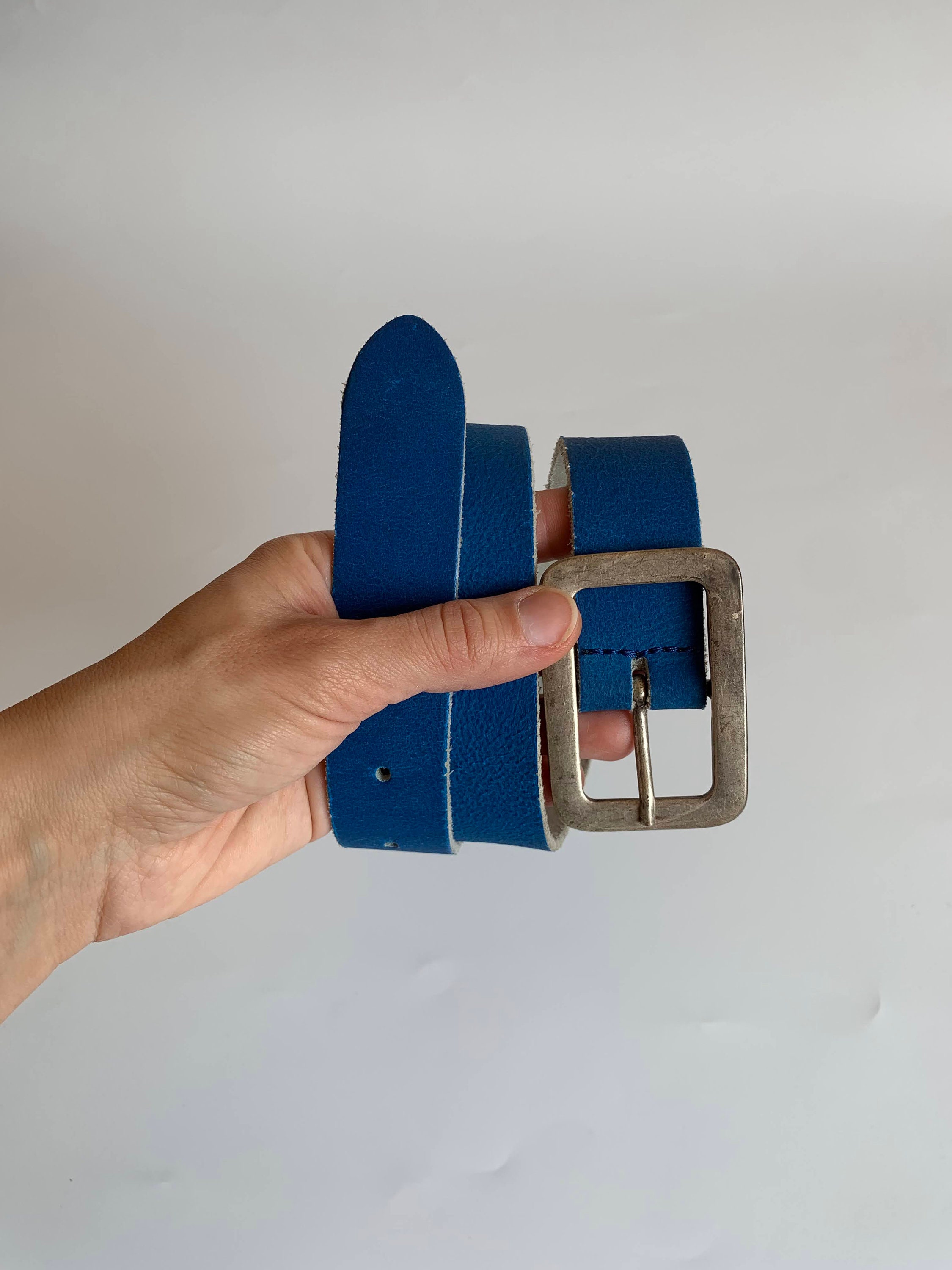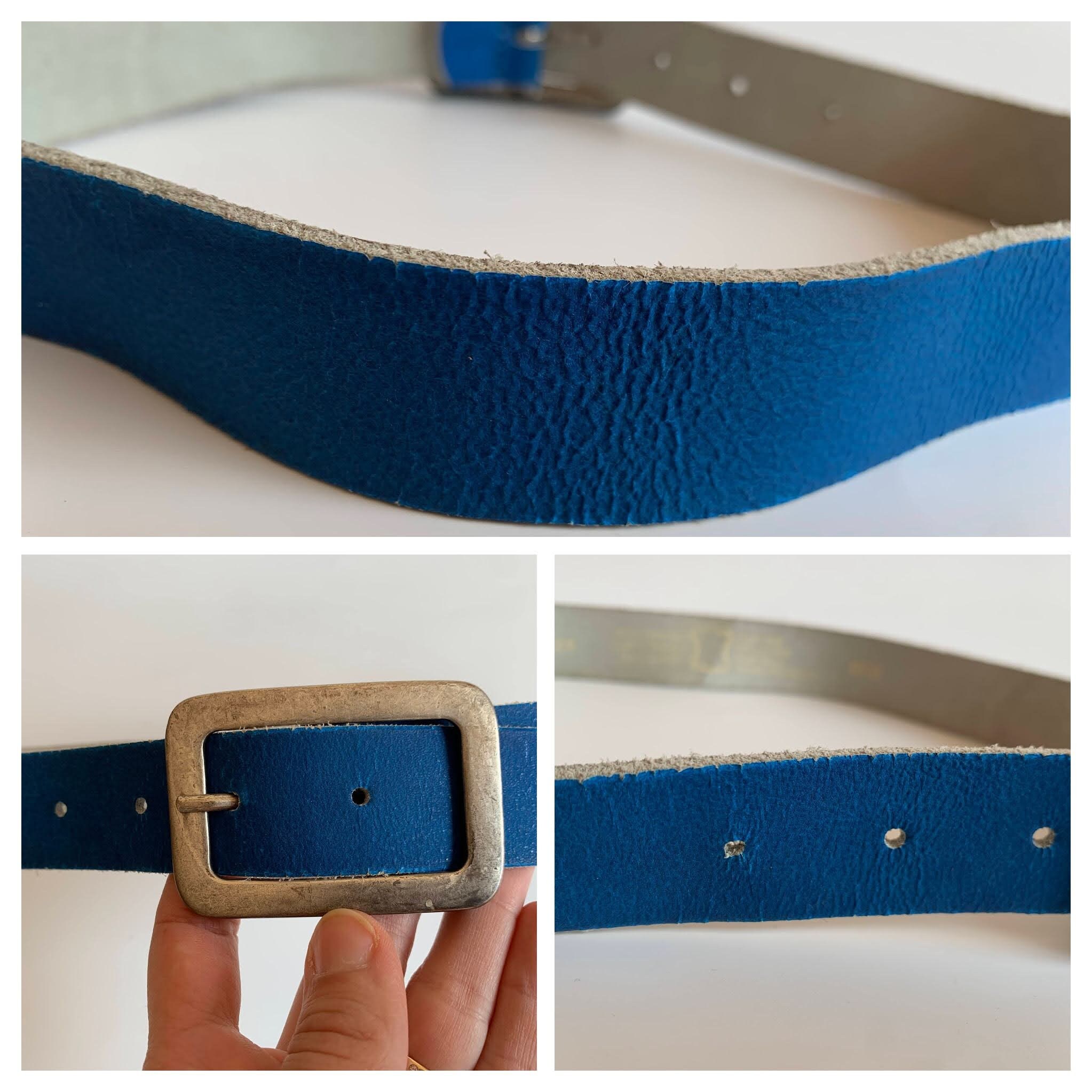 Condition: This blue leather belt has a distressed look as the leather has a cracked effect, which could be due to the wear or the belt cold have been made this way. The silver tone buckle shows some scratches too.