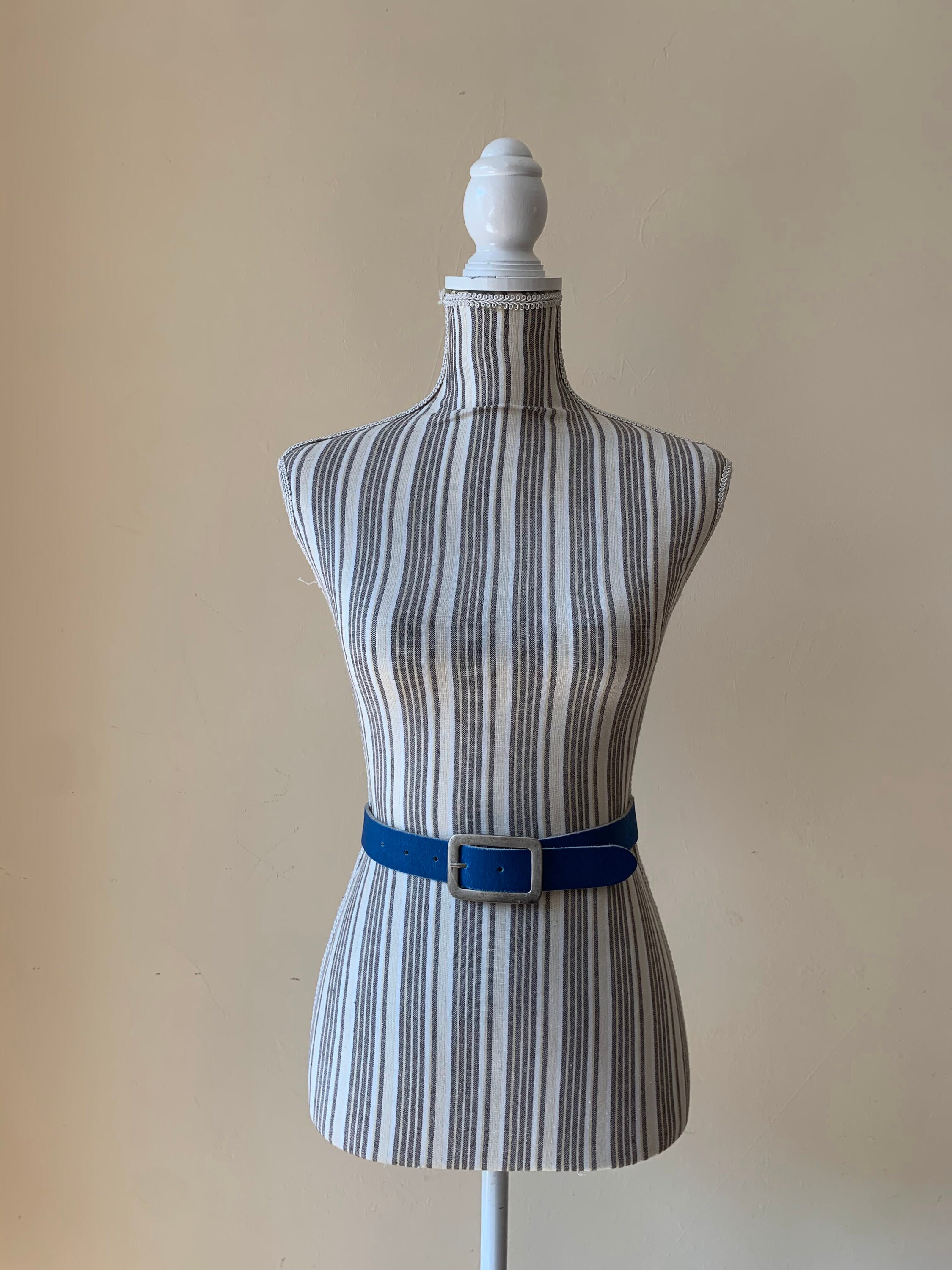 This is a vintage 80s beautiful cobalt blue leather belt with simple silver tone rectangular buckle. This ladies waist belt is made of genuine leather which has a cracked effect. The size marked on the belt is 65 cm / 26". It can adjust from 22.8" / 58 to 28" / 71 cm. This bright blue belt is 1.2" / 3 cm wide. The buckle measures 2.6" x 1.8" / 6.5 cm x 4.5 cm.