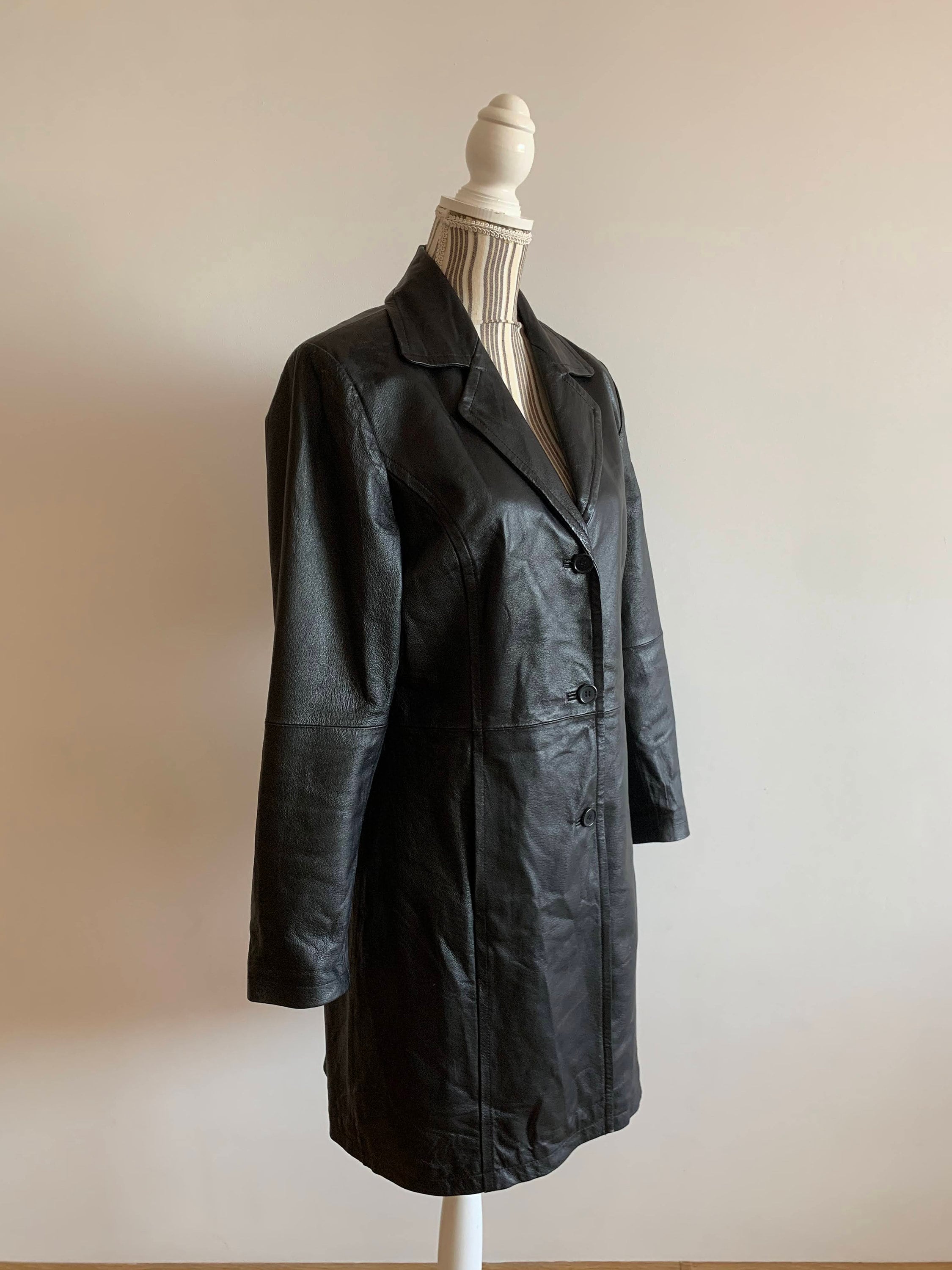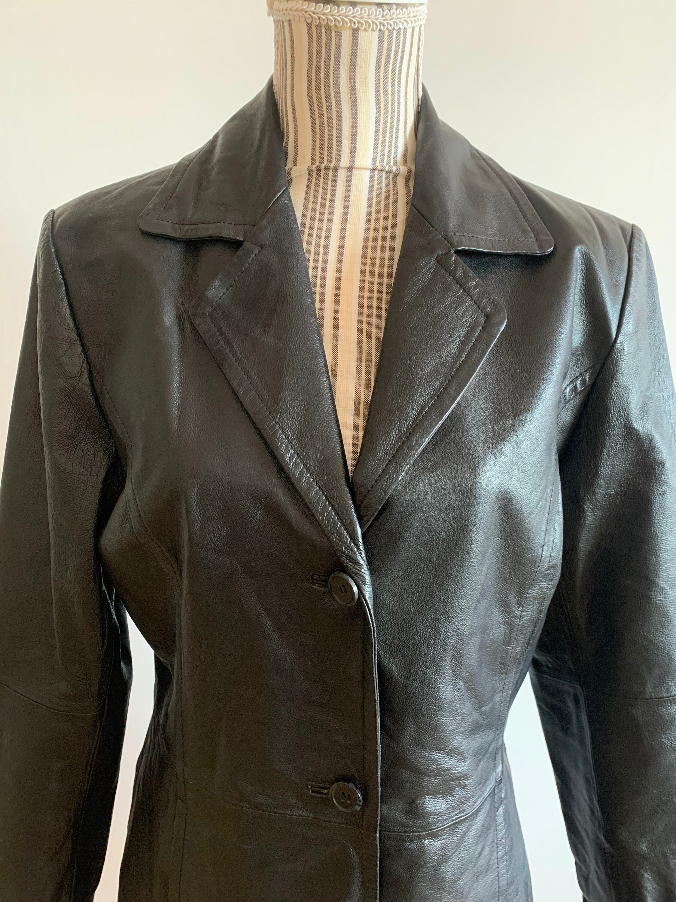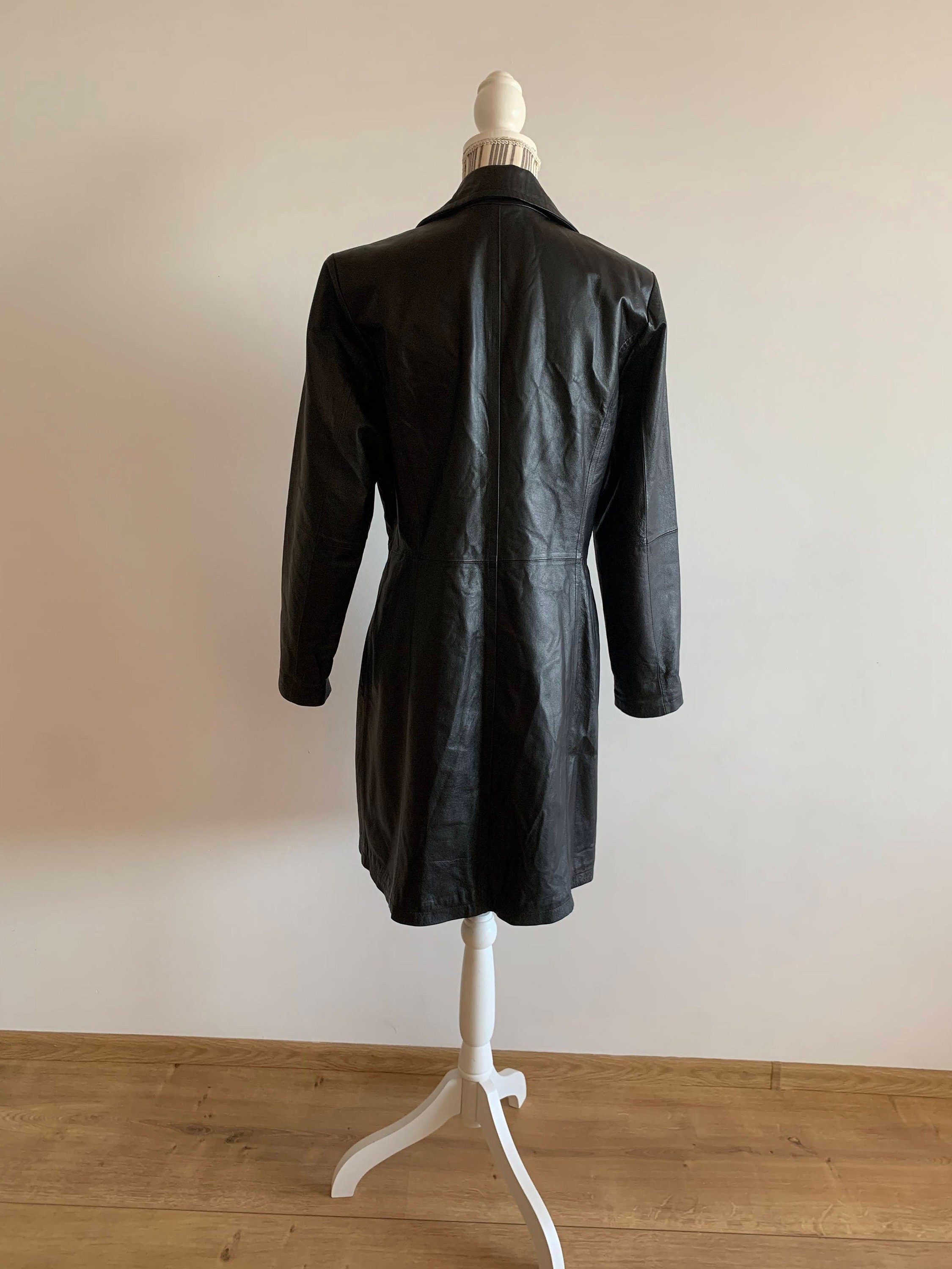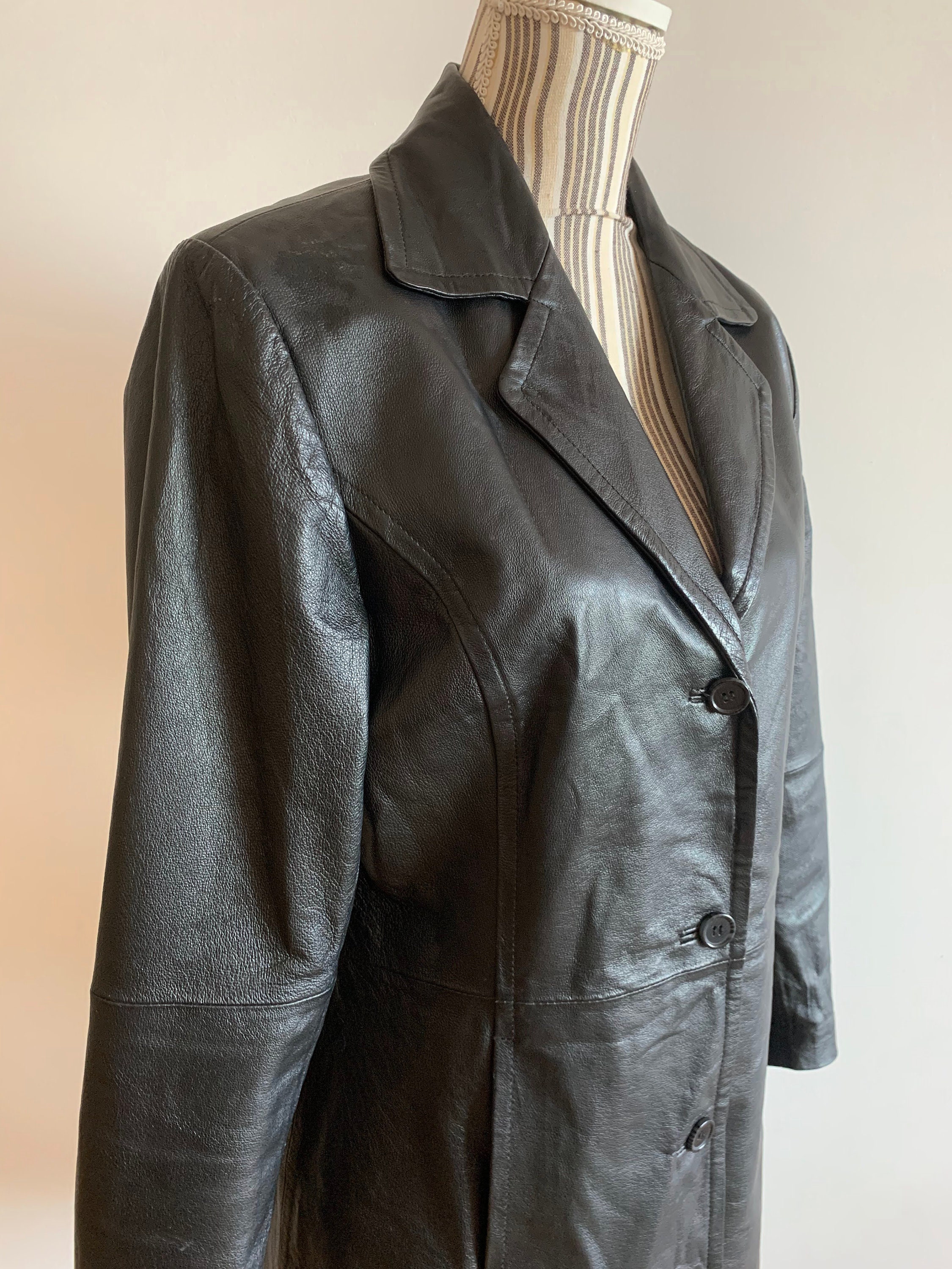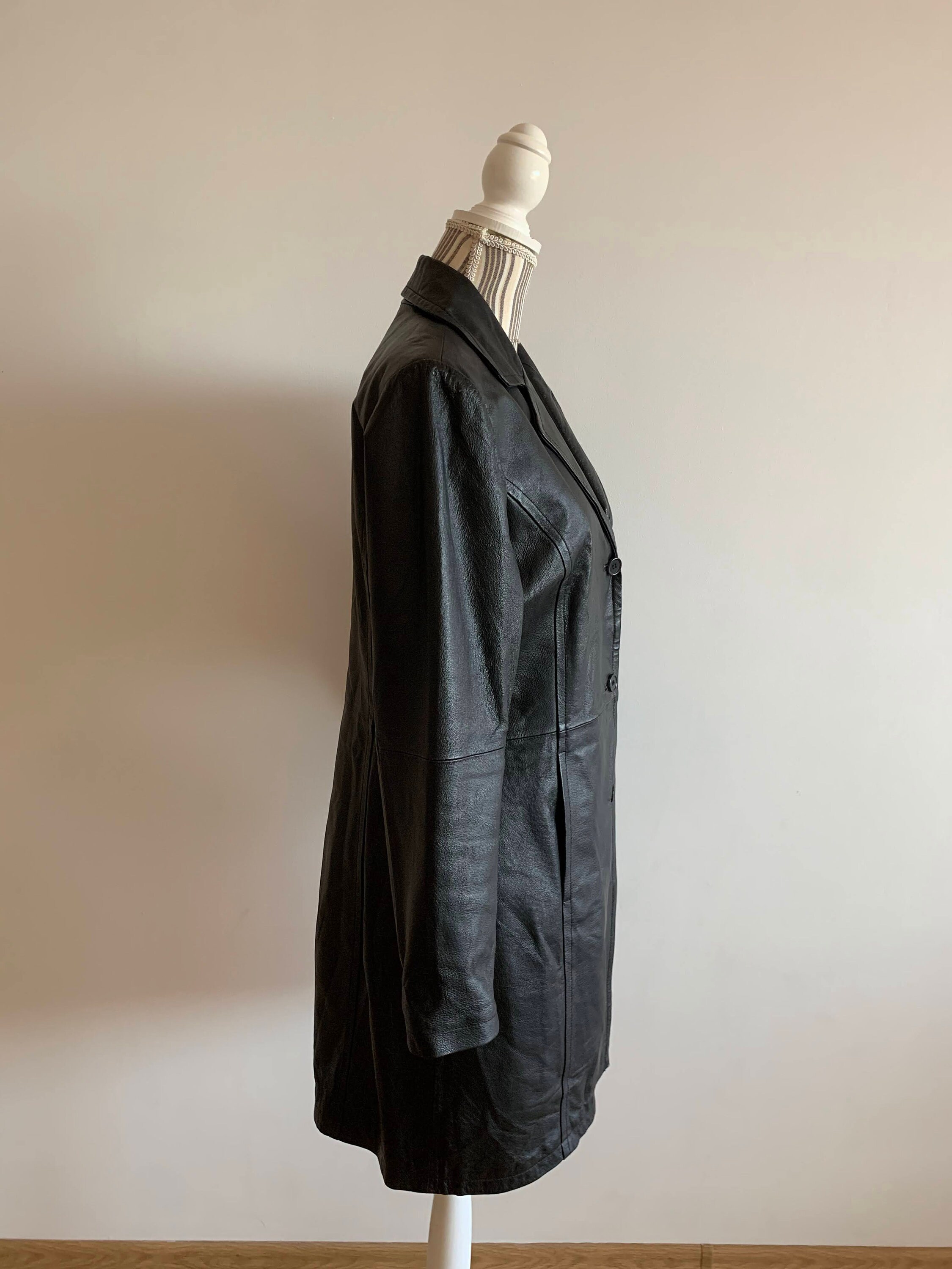 This is a beautiful vintage black leather trench coat for women. This fall spring black leather jacket has button front closure and side pockets. There is a zipper pocket inside. This long leather blazer has midi length to above the knees. This vintage long leather blazer is made of soft black genuine leather. The size marked is 38, which fits like M. It has an oversized relaxed look. Please check the measurements below.