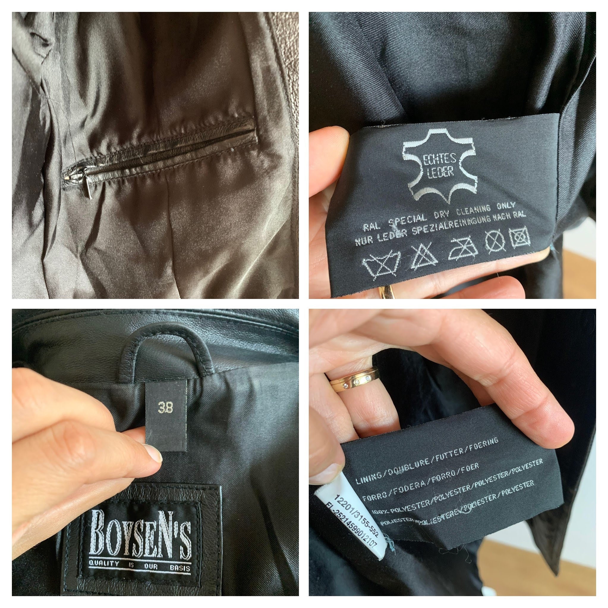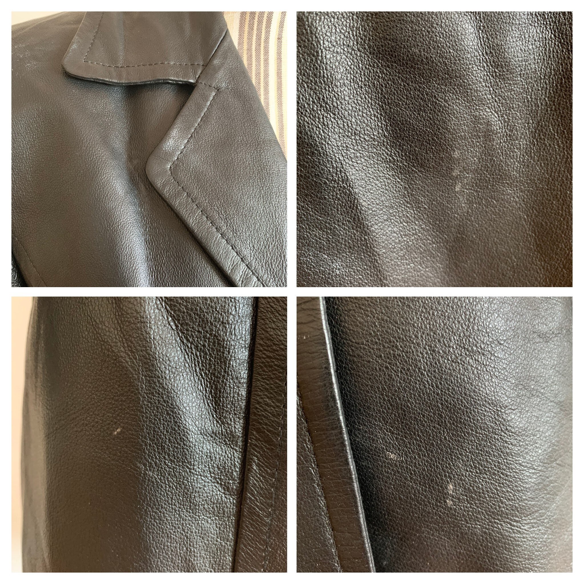Condition: This leather jacket shows some signs of wear due to the fact it was pre-loved. There is a lighter spot at the collar and some small lighter spots on the leather which I have tried to capture in the close up photos.