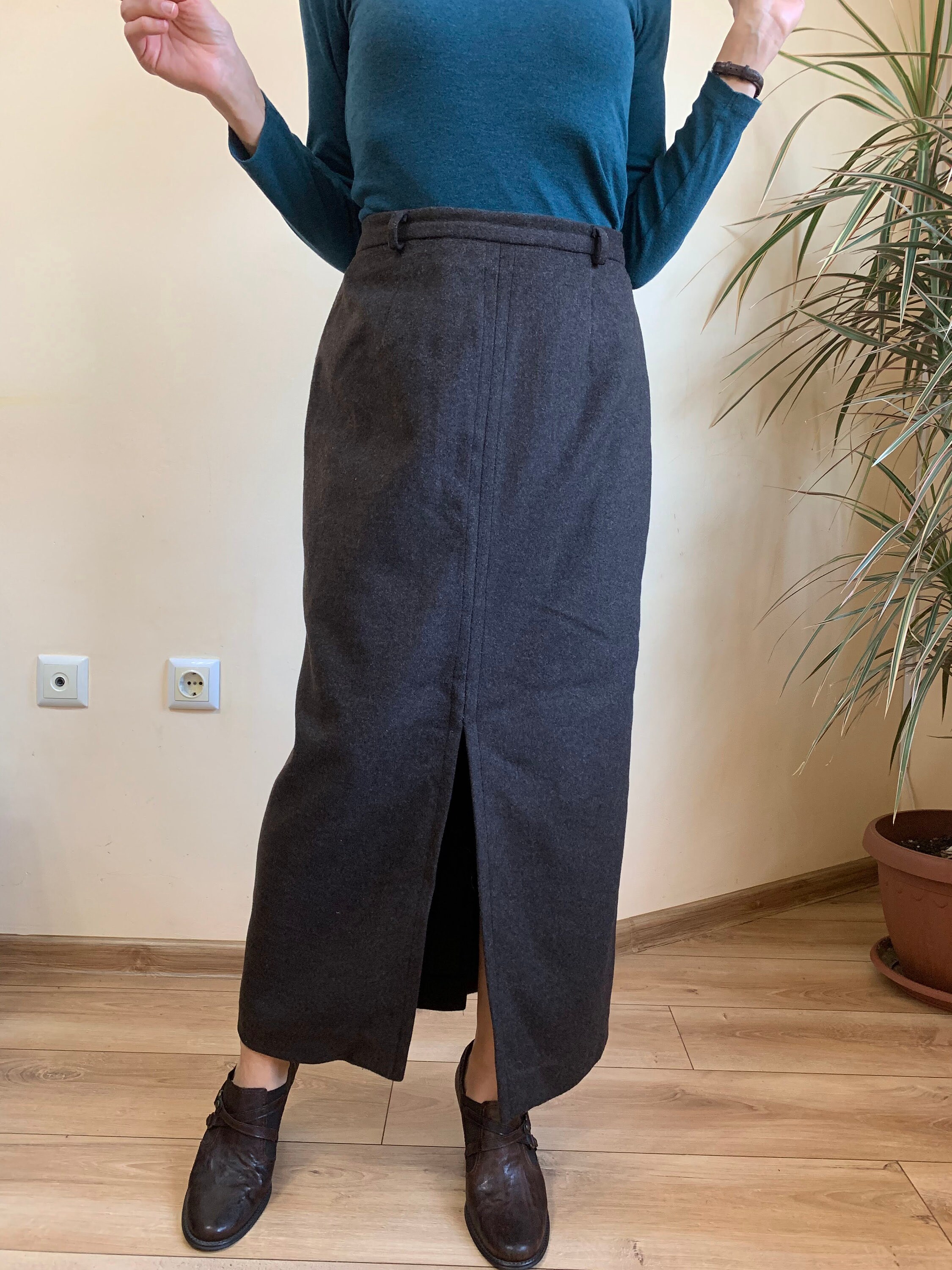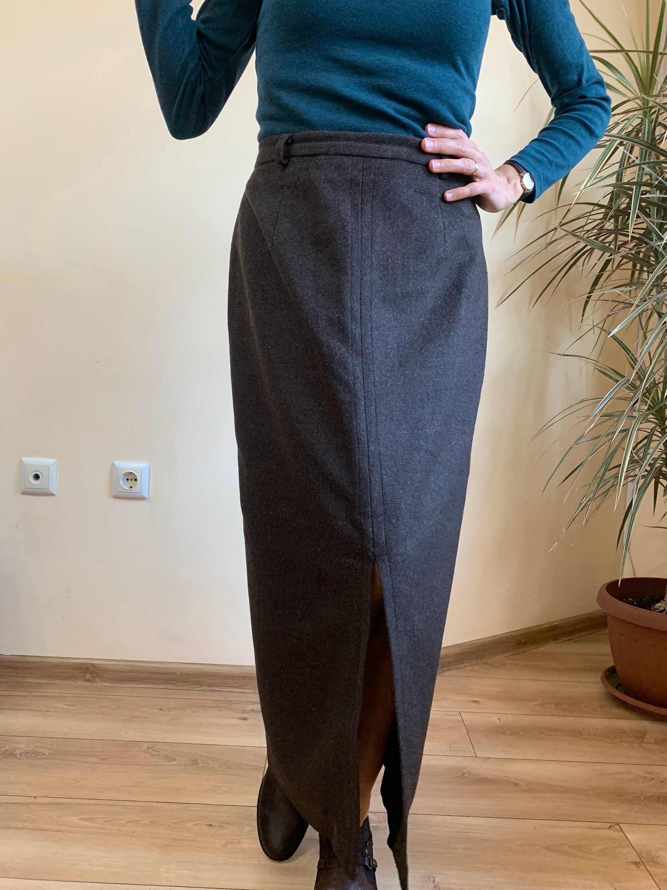 This is a beautiful vintage dark grey wool maxi skirt with front and back slit. This ankle length maxi skirt is made of wool blend fabric (60% wool, 20% polyamide, 20% viscose). This grey maxi skirt has lining underneath. This mod winter skirt has a straight silhouette with back zip and button closure. It was made in Bulgaria. This wool maxi skirt fits like size S. I am modelling the skirt and I wear size S ,US 6, EUR 36, UK 10. I am 163 cm tall / 5 ft 4". Please check the measurements below.