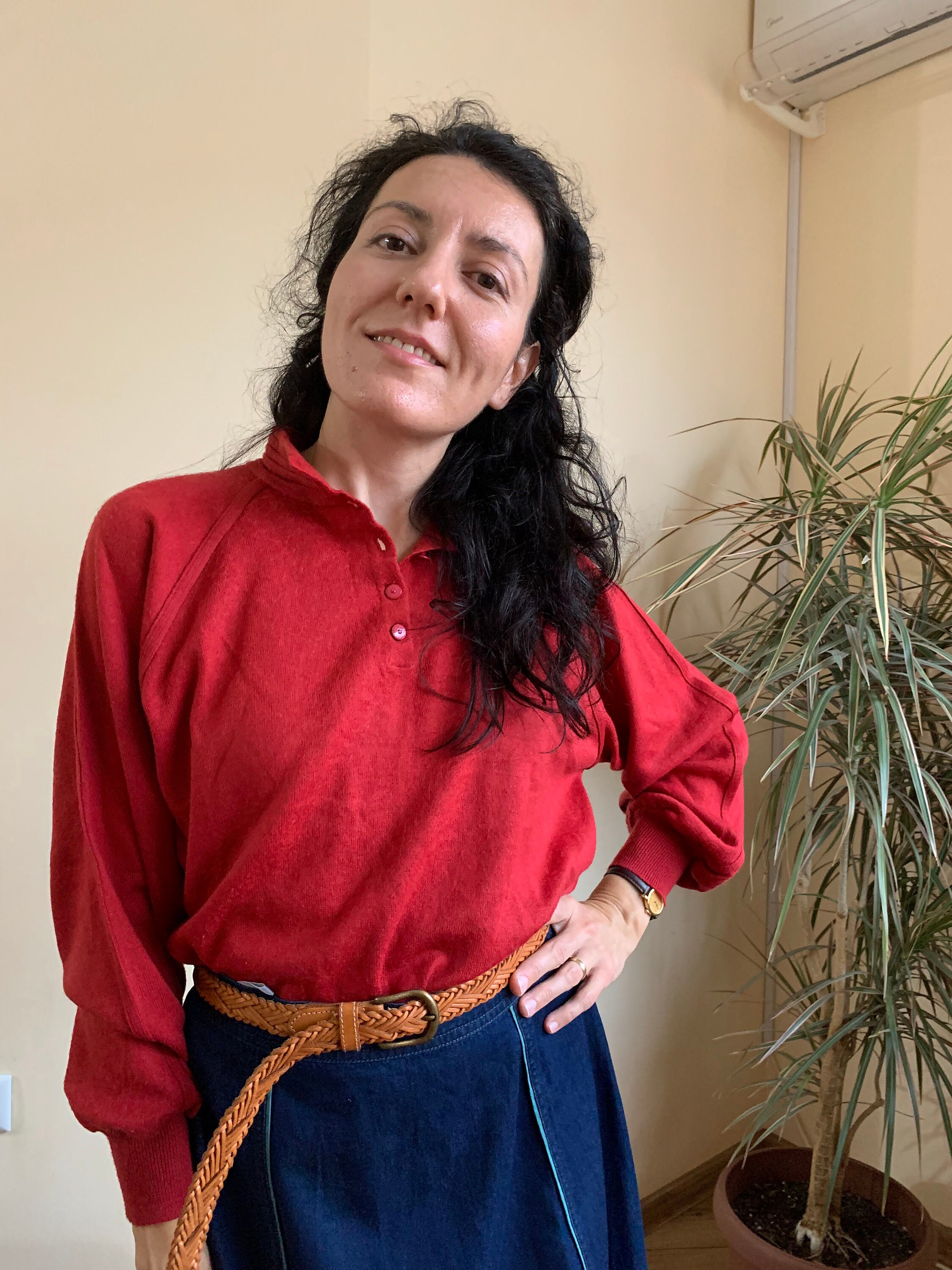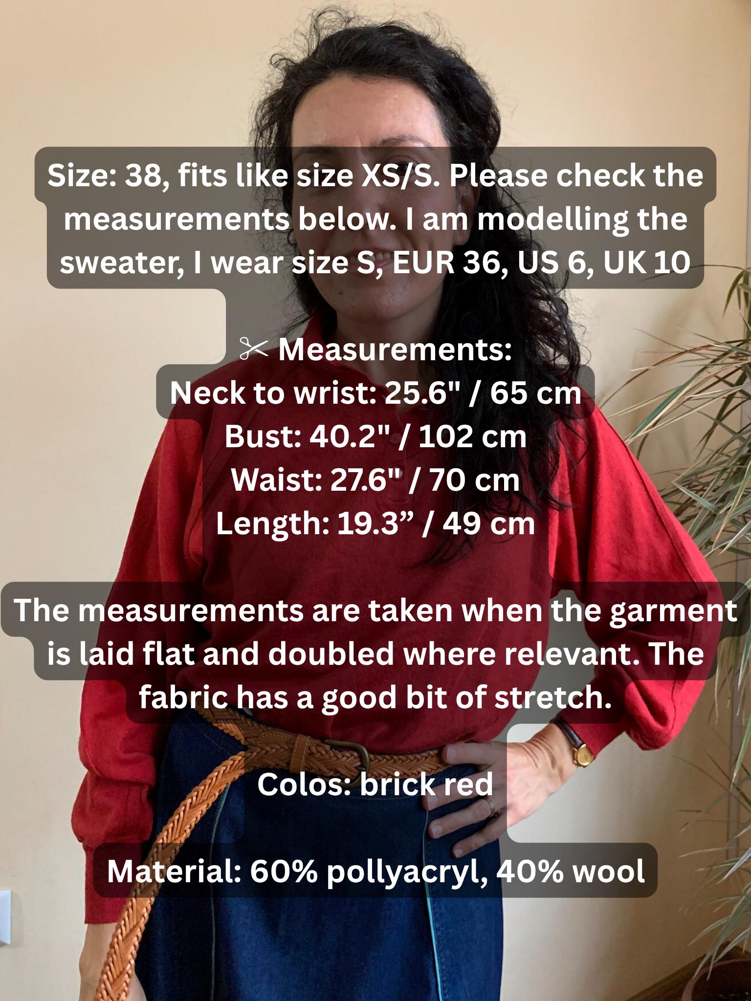 This is a lovely vintage 90s machine knit bracelet sleeve sweater for women in brick red color. The fabric is super soft wool blend (60% pollyacryl, 40% wool). This retro collared sweater has button up collar. This ski sweater was made back in the 80s in West Germany. The size marked is 38, it fits like XS/S. I am modelling this knitted sweater and I wear size S, US 6, EUR 36, UK 10. Please check the measurements below.