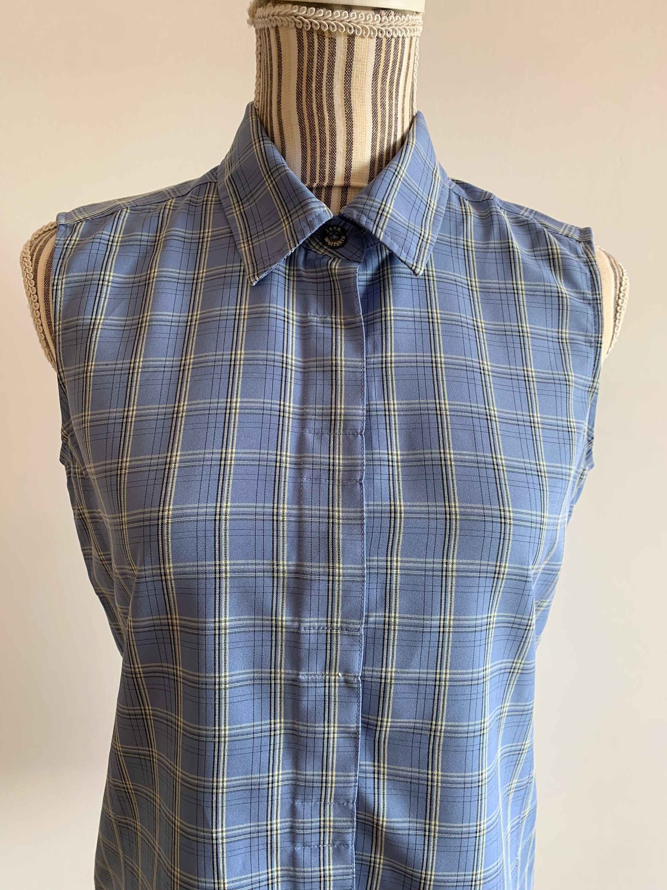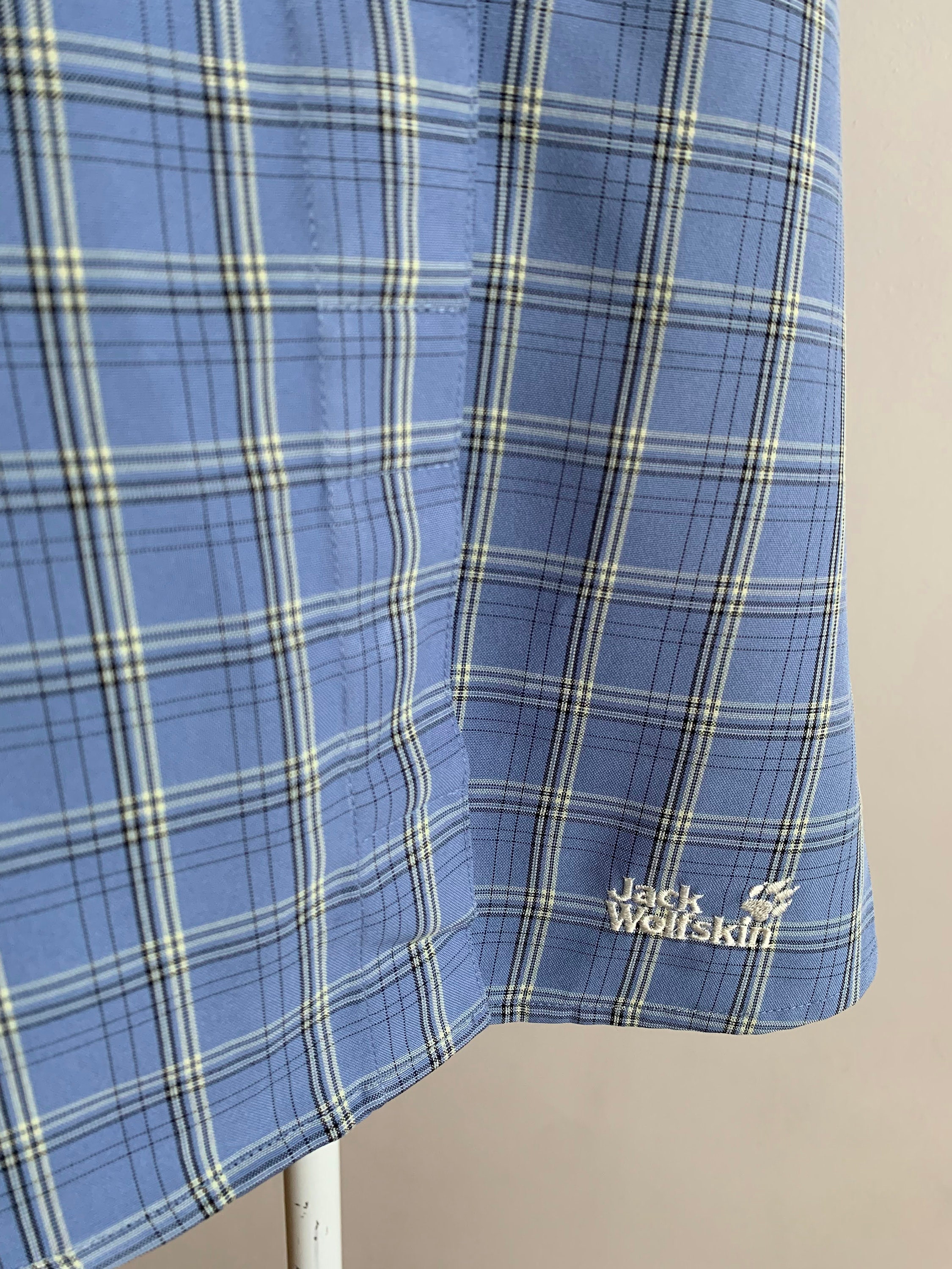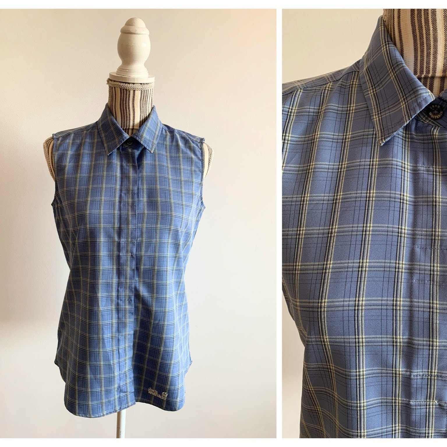 This is a vintage Y2K Jack Wolfskin Travel women's summer sleeveless top with button front closure and checkered print in light blue and beige. This casual collared tank top is made of 86% polyester and 14% viscose. It fits loosely. The size marked is 36/38, it fits like size S/M. Please check the measurements below