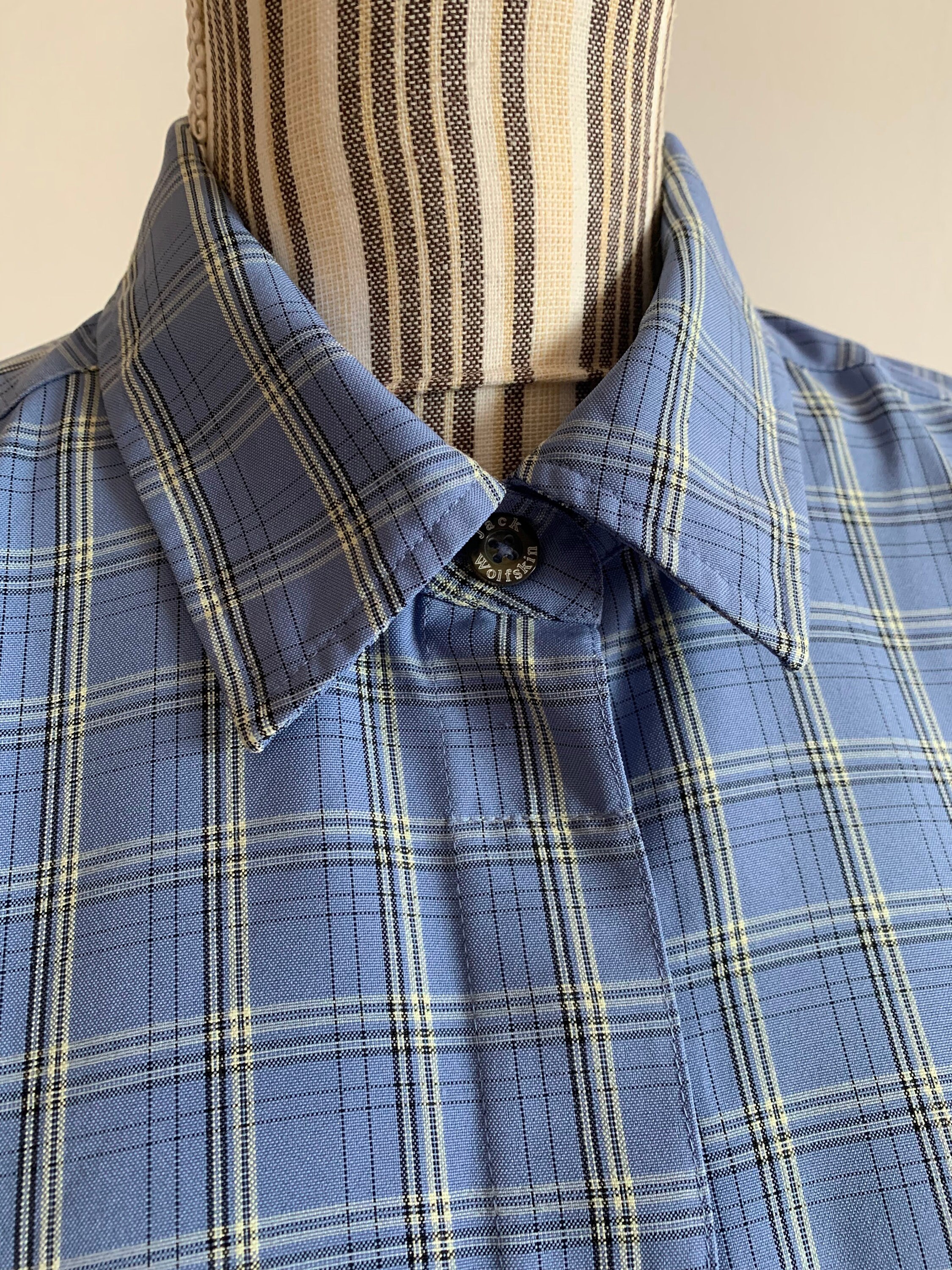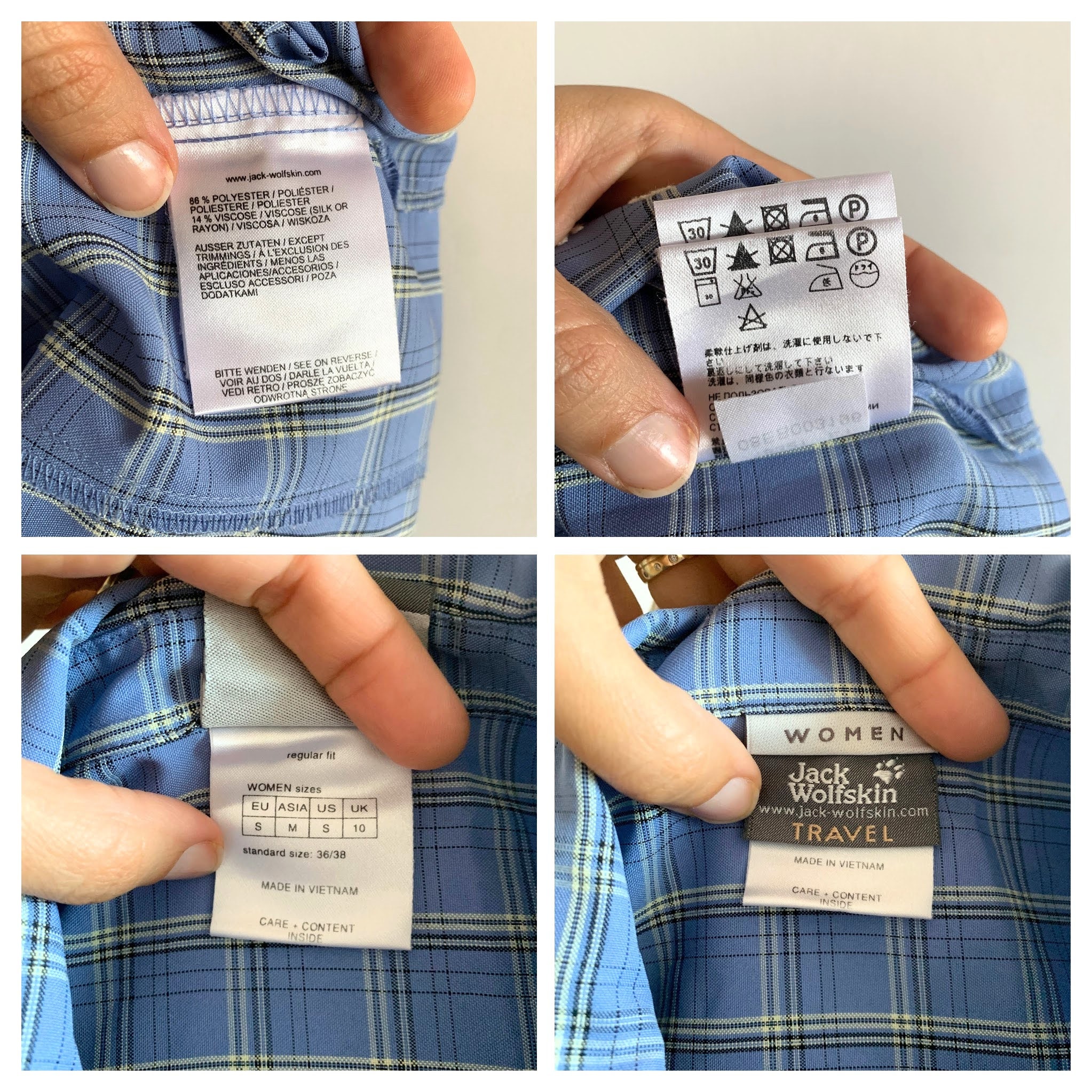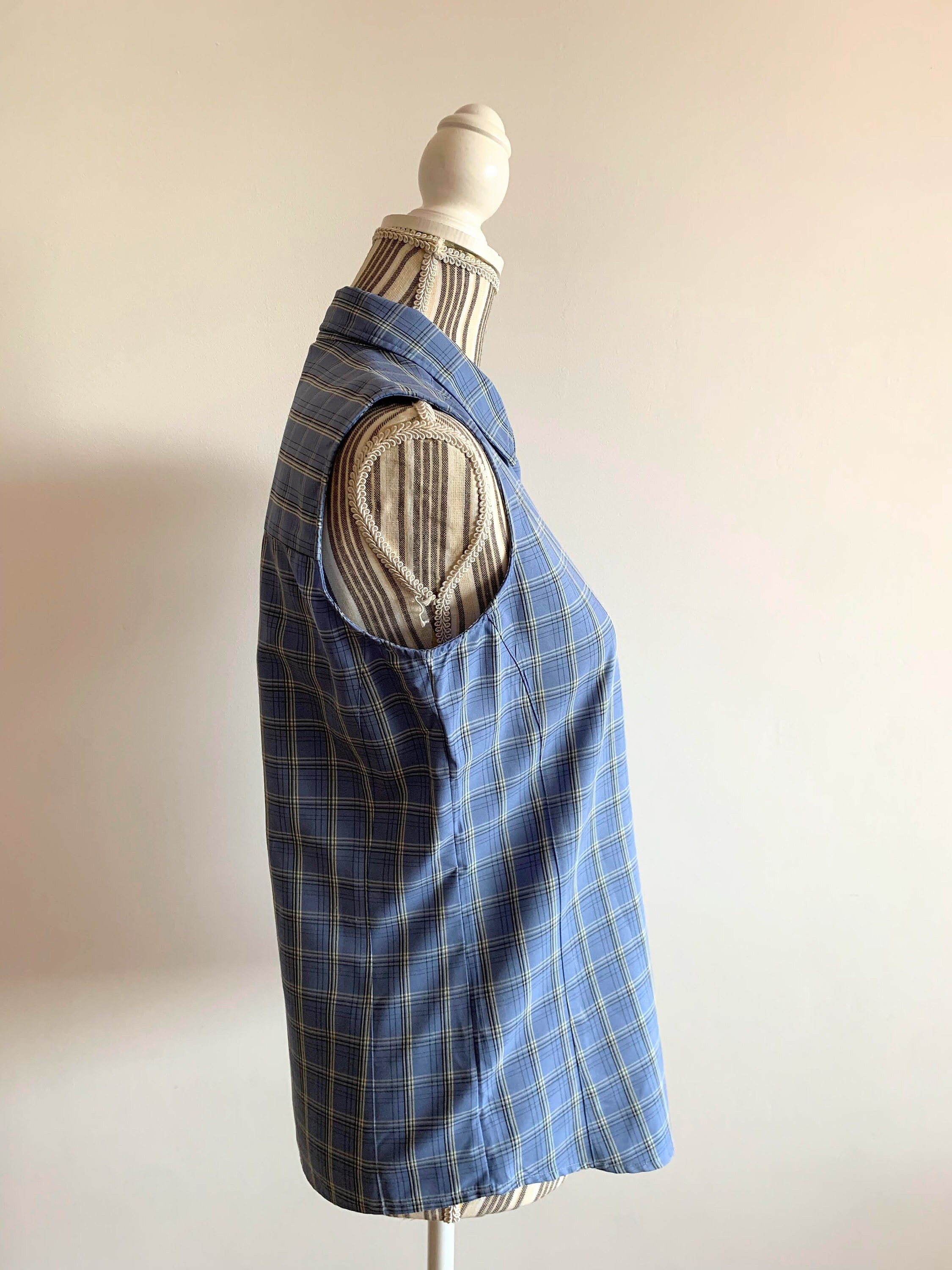 This is a vintage Y2K Jack Wolfskin Travel women's summer sleeveless top with button front closure and checkered print in light blue and beige. This casual collared tank top is made of 86% polyester and 14% viscose. It fits loosely. The size marked is 36/38, it fits like size S/M. Please check the measurements below