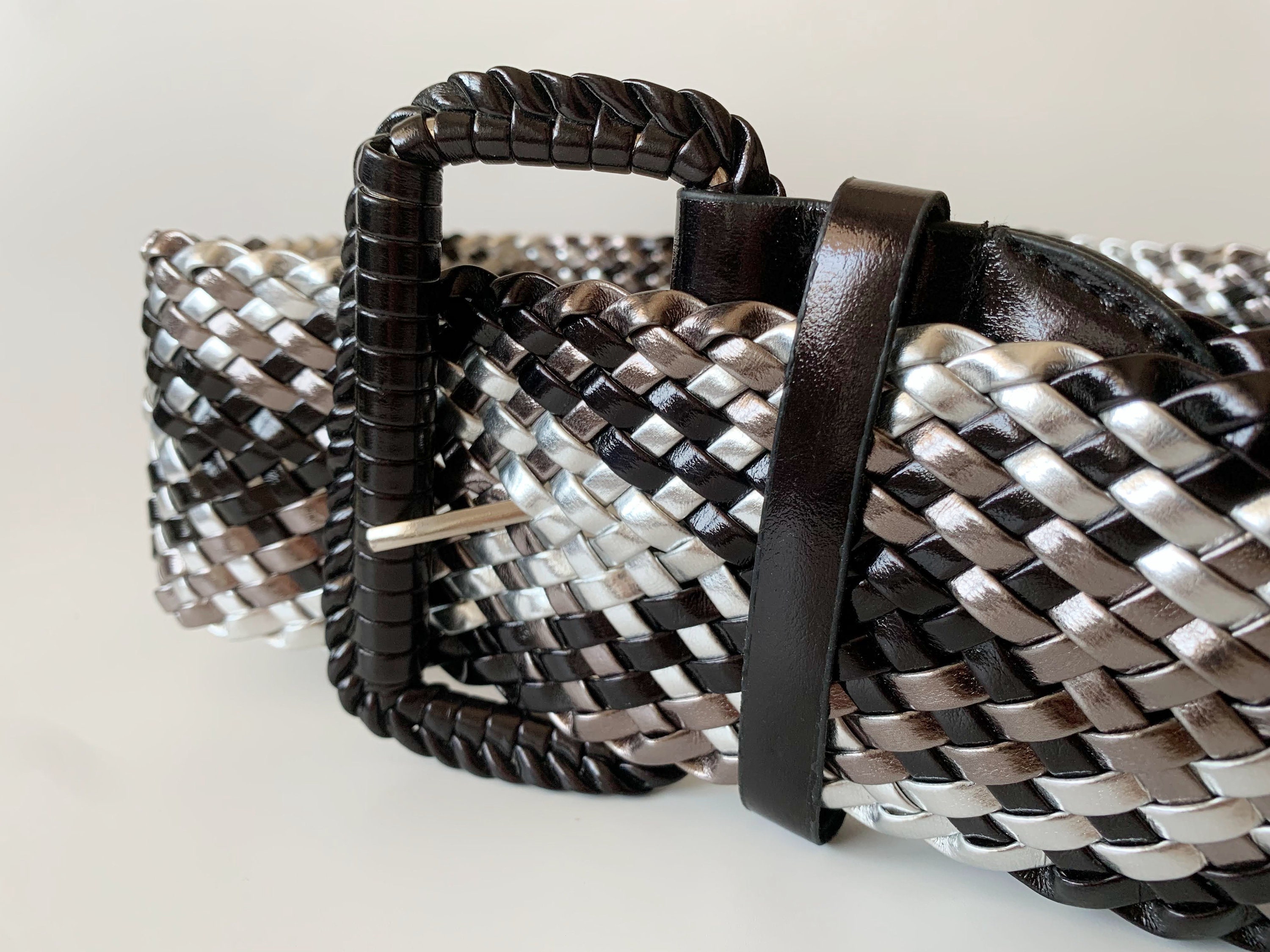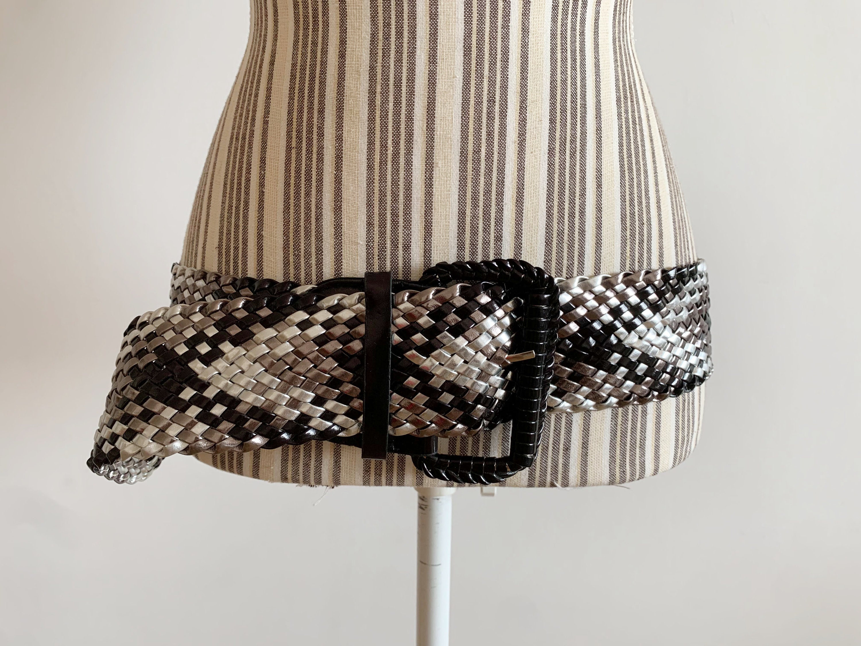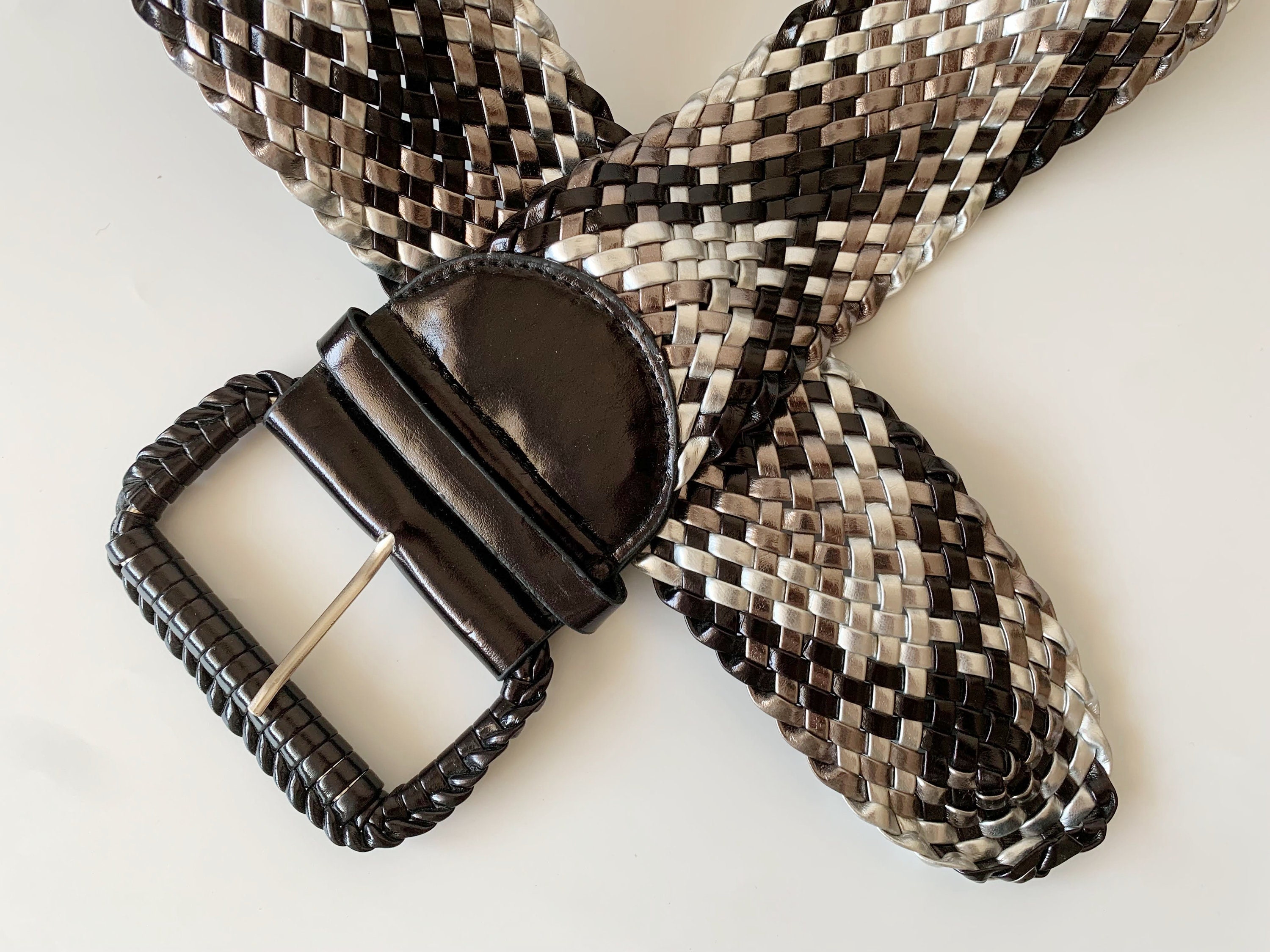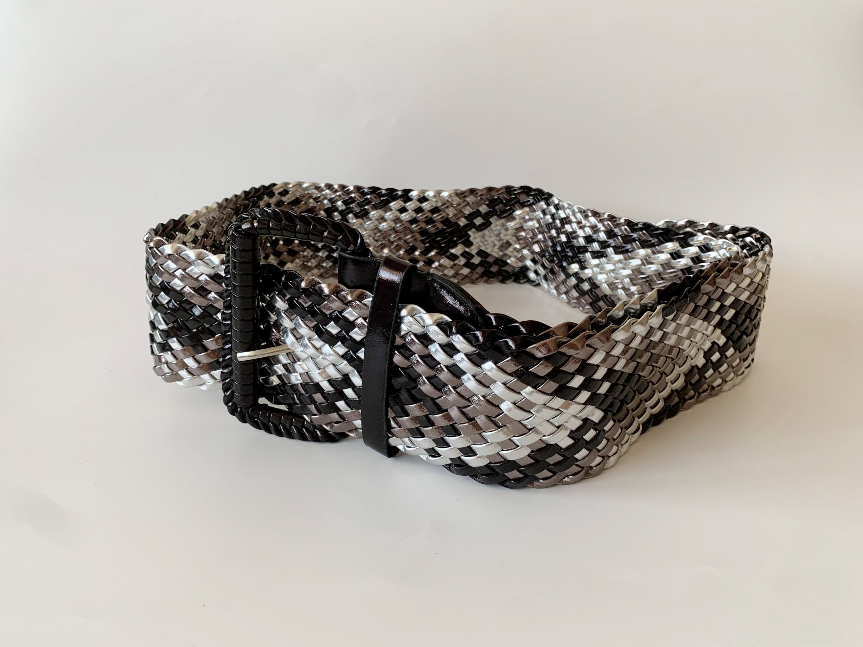 This is a vintage vegan leather braided wide waist belt in silver and black. This wide hip belt is made of beautifully woven faux leather straps. This metallic waist belt has a patent leather look. There is no size marked on this statement belt, it fits like size L. Please check the measurements below. This women's woven belt can adjust up to approx 41.3" / 105 cm (the full length of the belt strap is 45.3" / 115 cm).