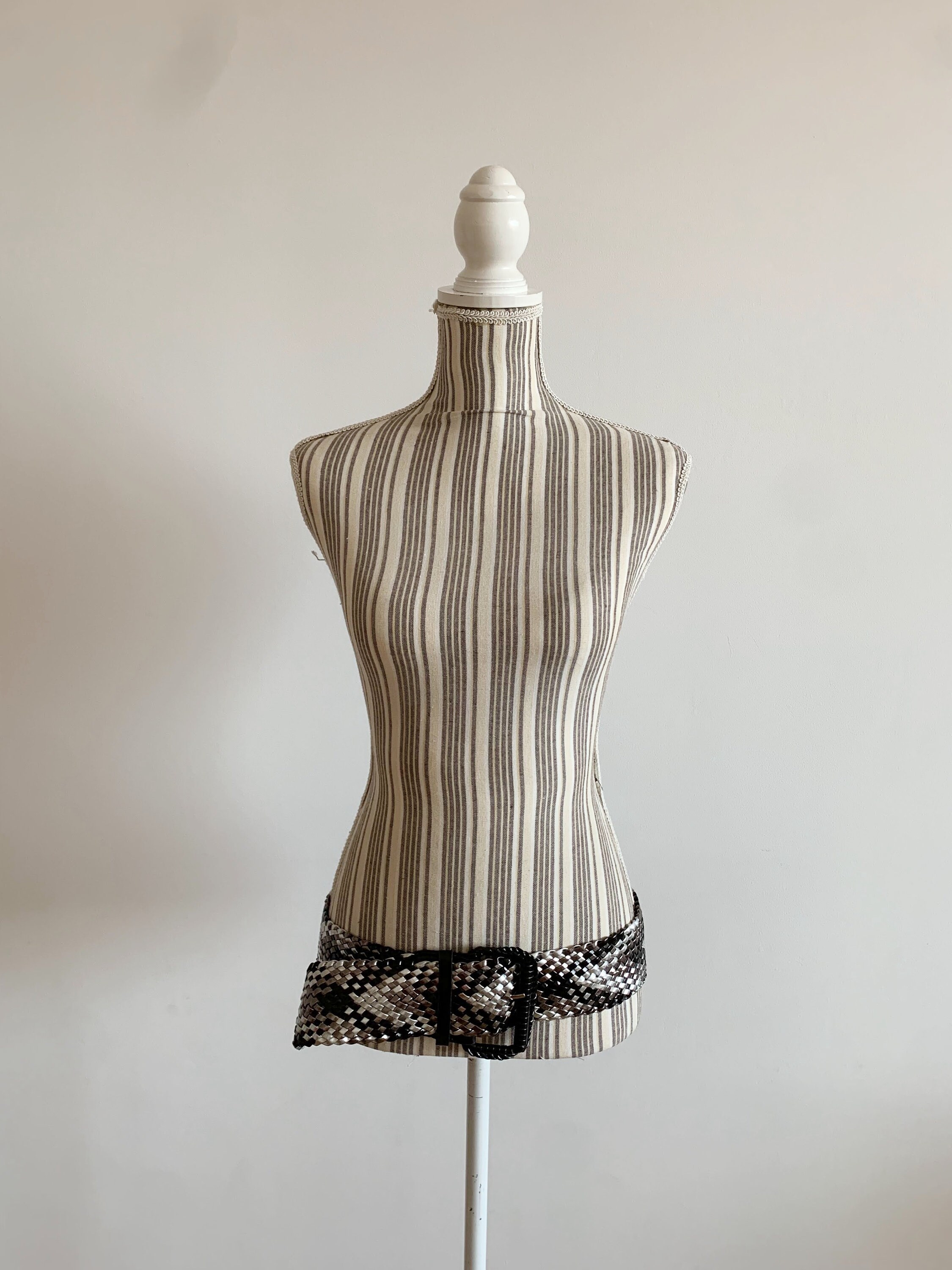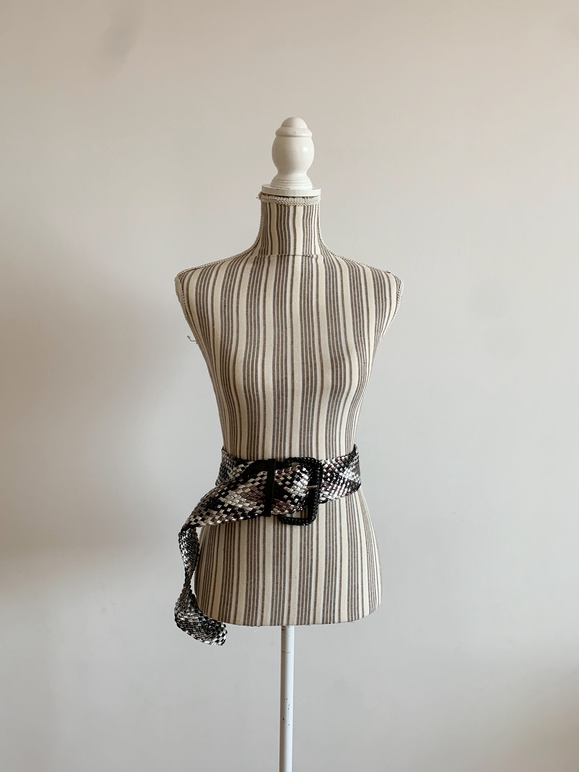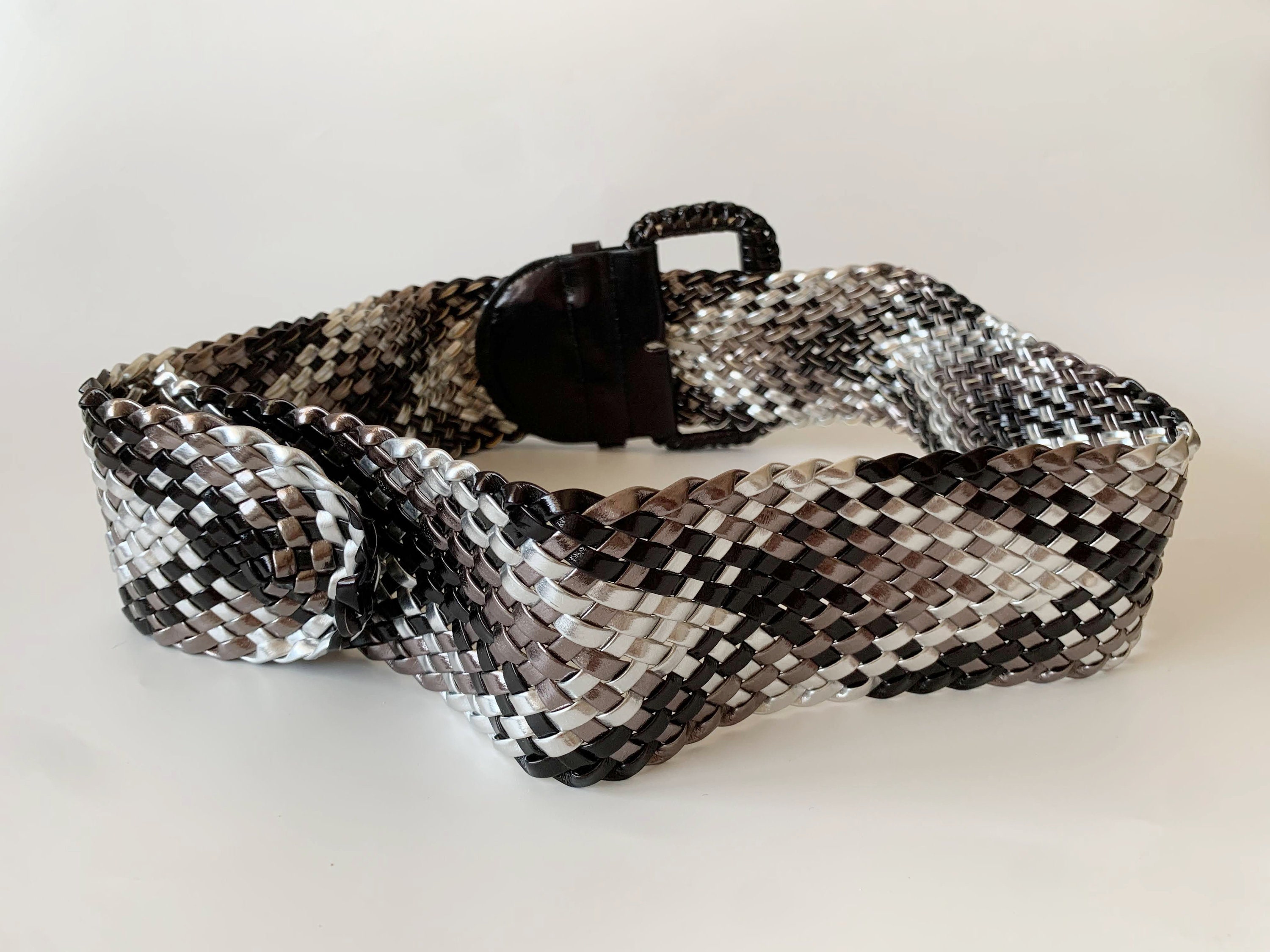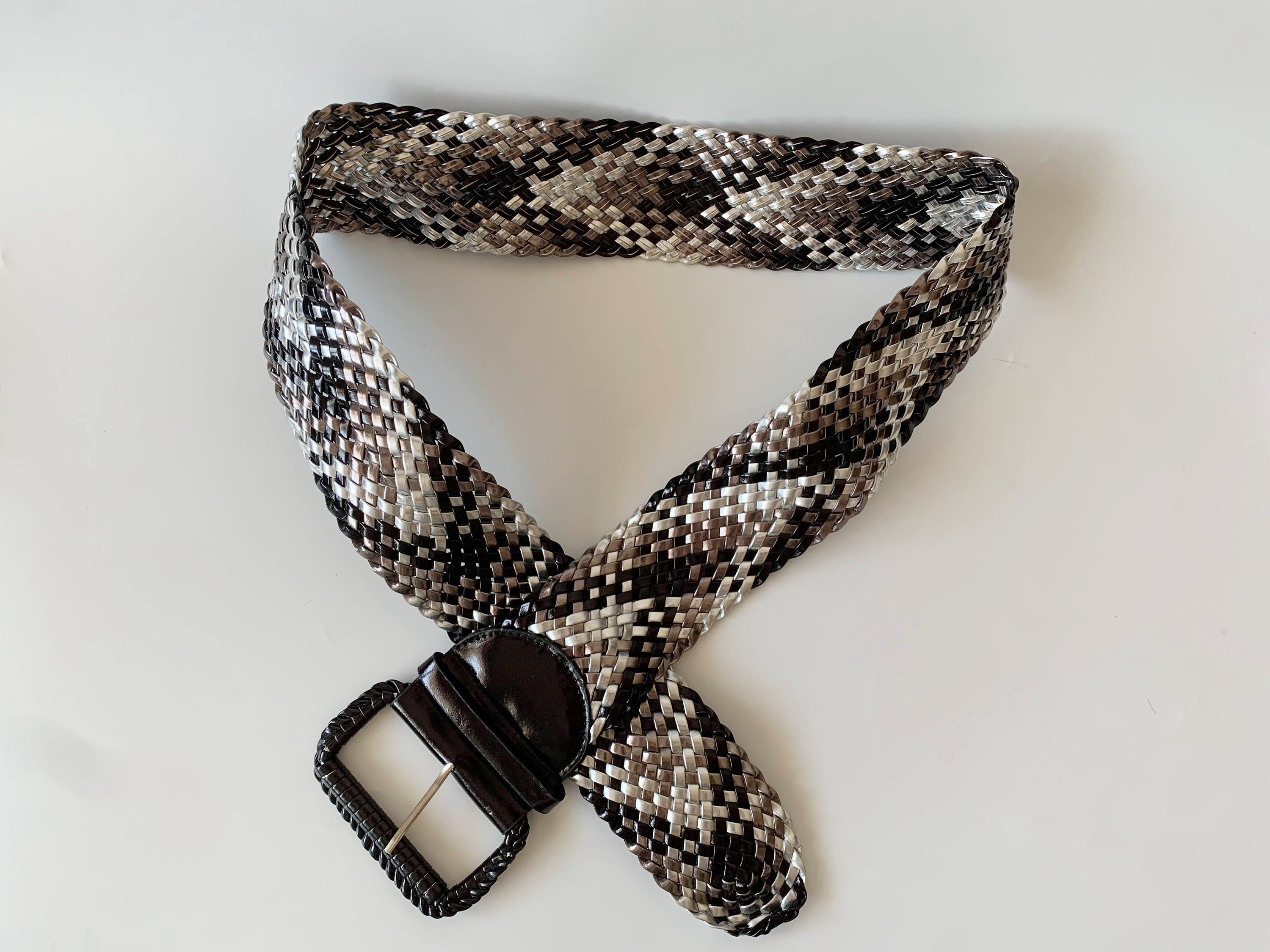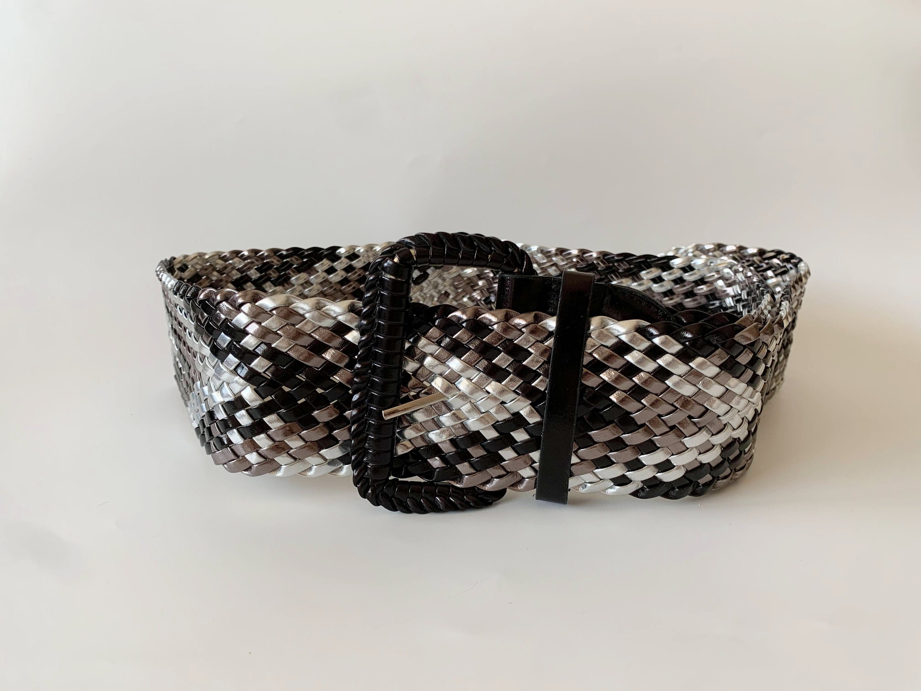 This is a vintage vegan leather braided wide waist belt in silver and black. This wide hip belt is made of beautifully woven faux leather straps. This metallic waist belt has a patent leather look. There is no size marked on this statement belt, it fits like size L. Please check the measurements below. This women's woven belt can adjust up to approx 41.3" / 105 cm (the full length of the belt strap is 45.3" / 115 cm).