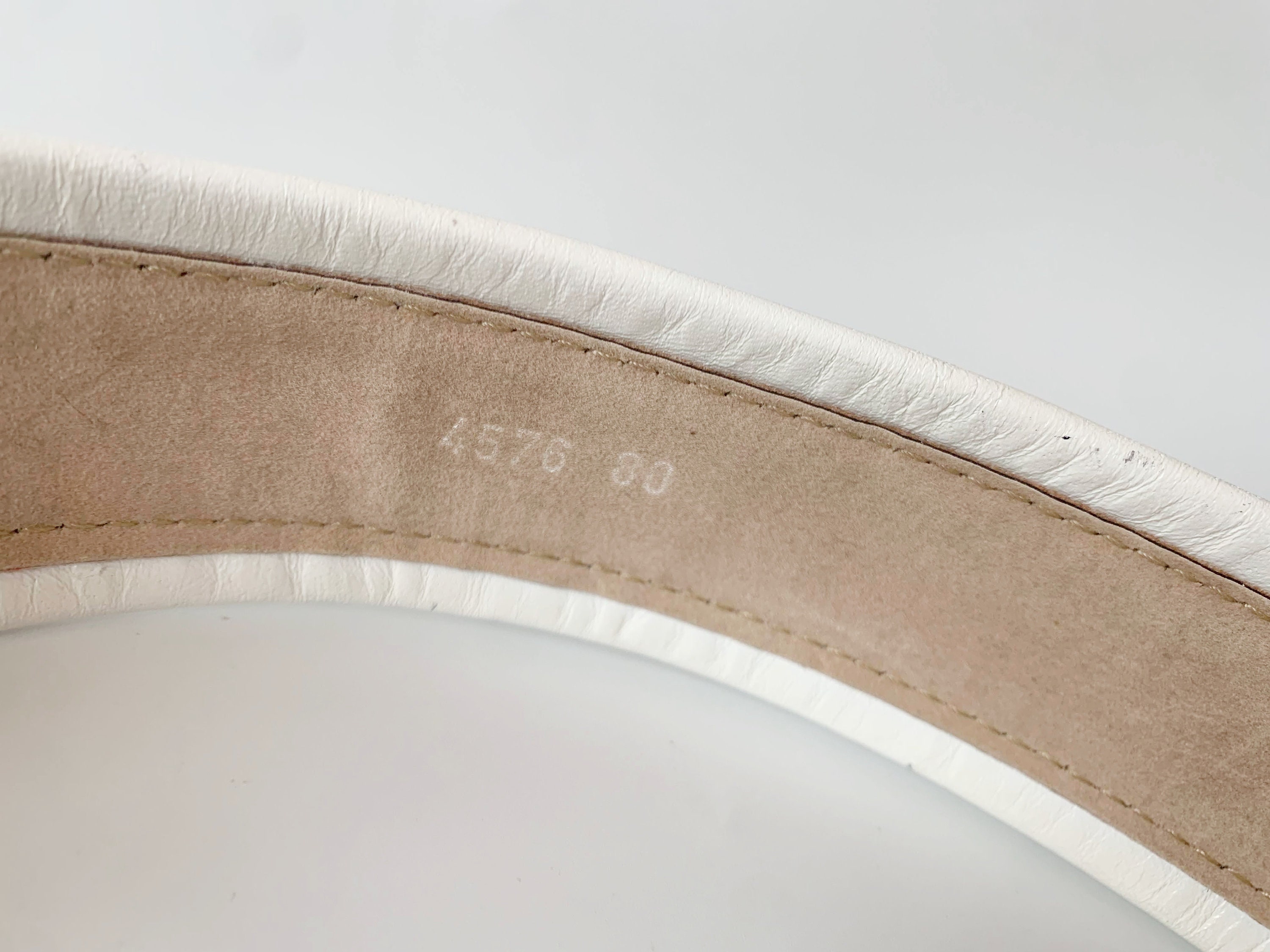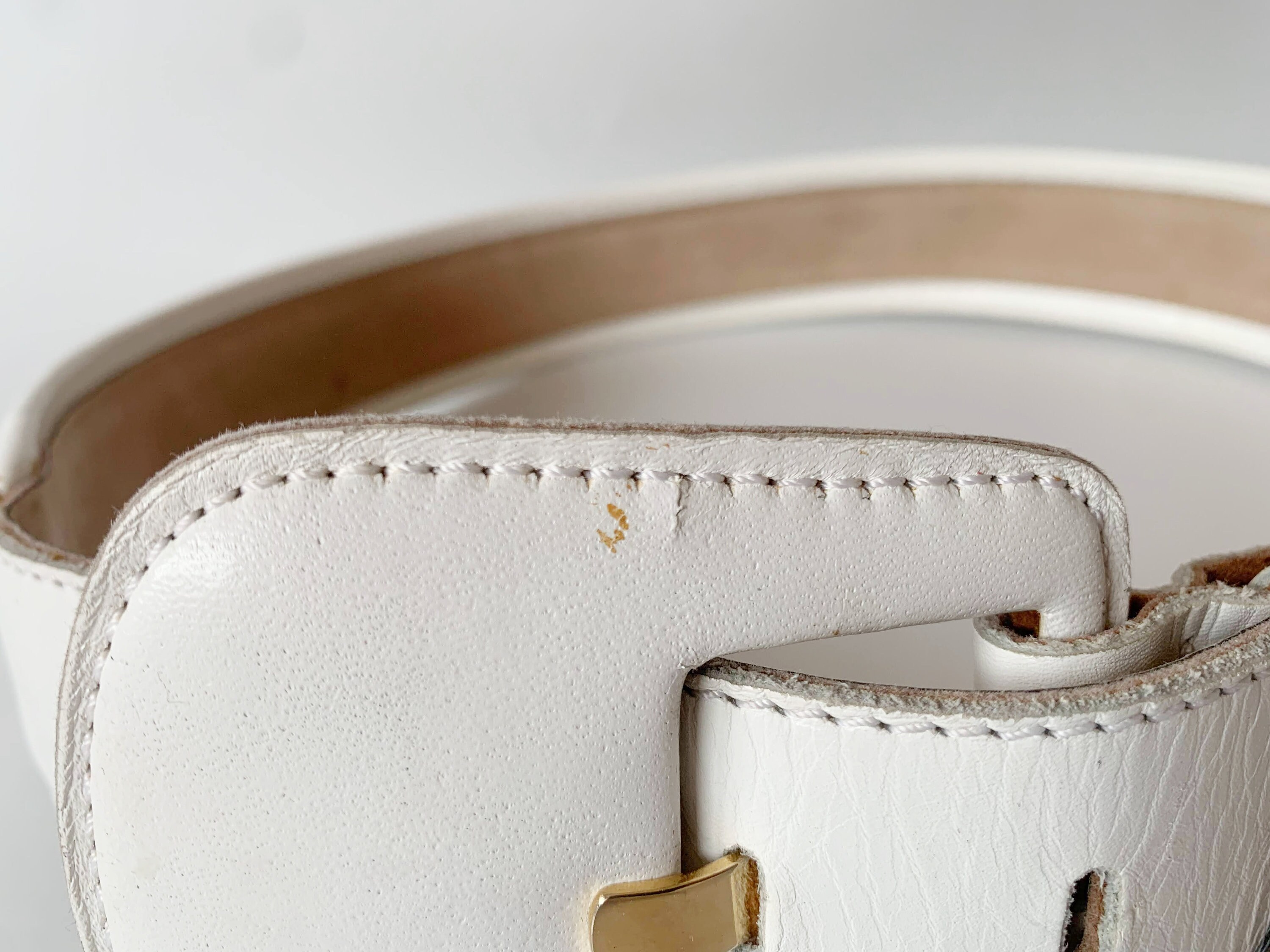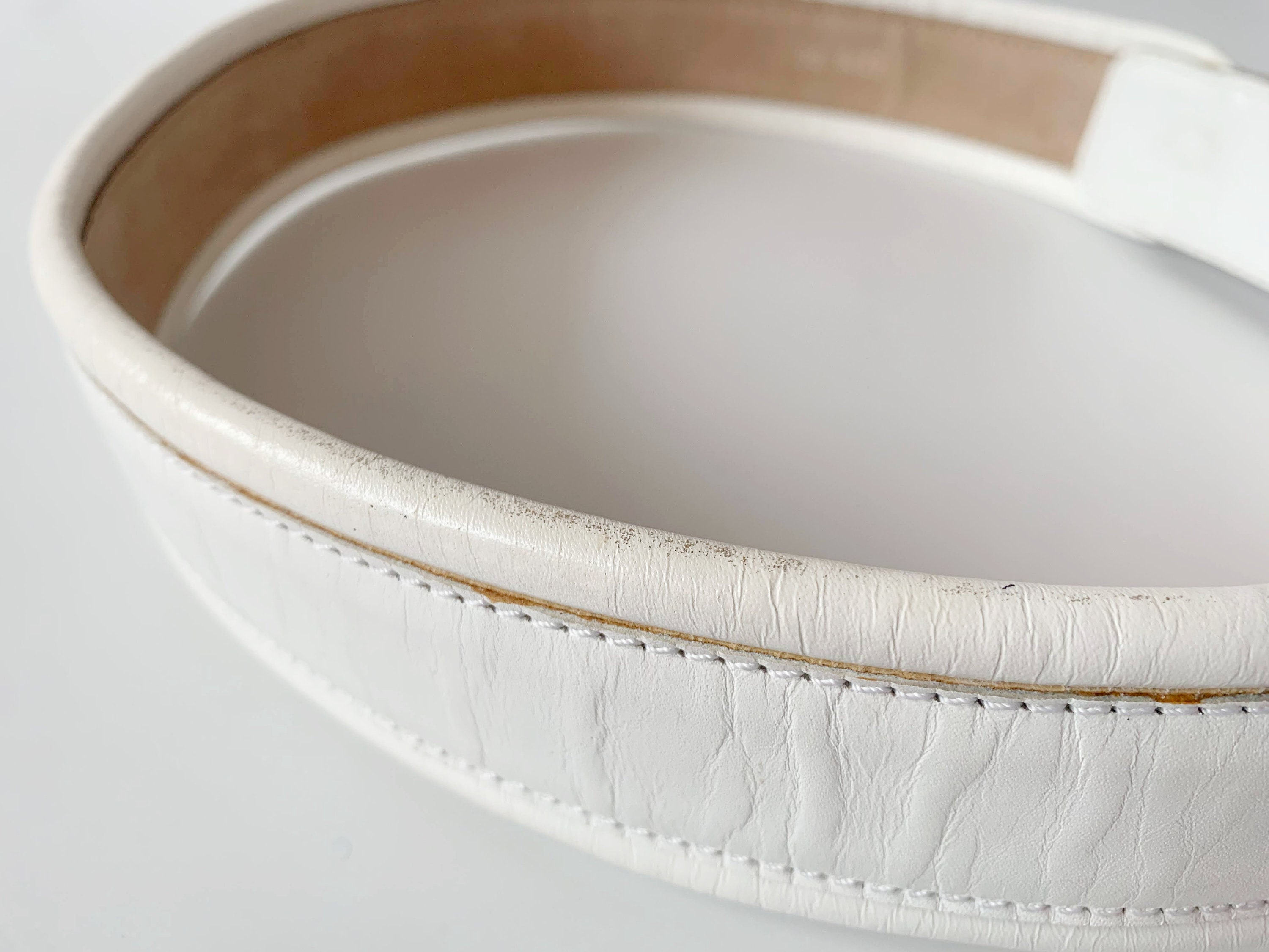 Condition: there is a small crack on the buckle close to the stitch. There is fading of the leather around the edges, the white color has come off and the belt appears a shade darker around the edges