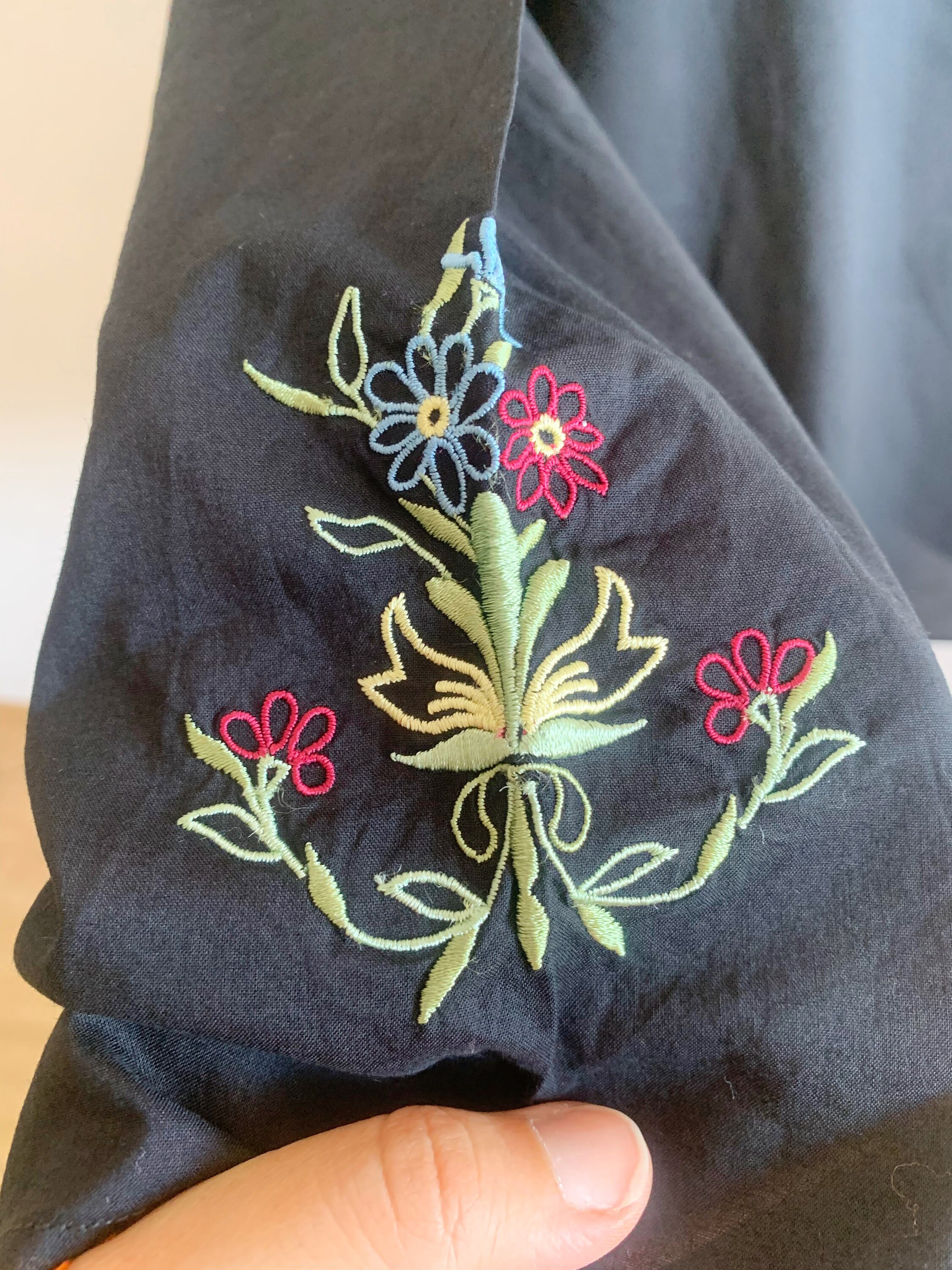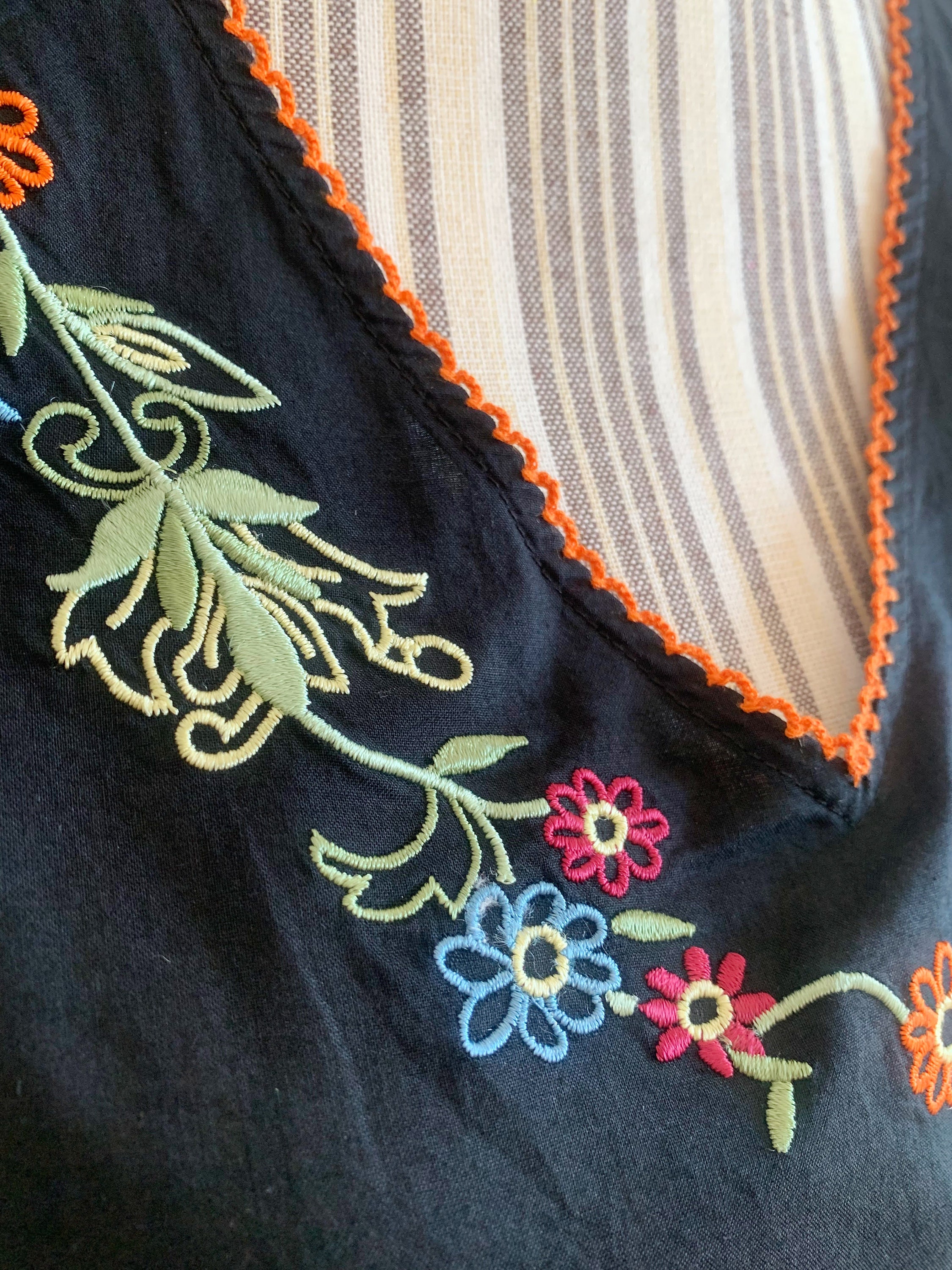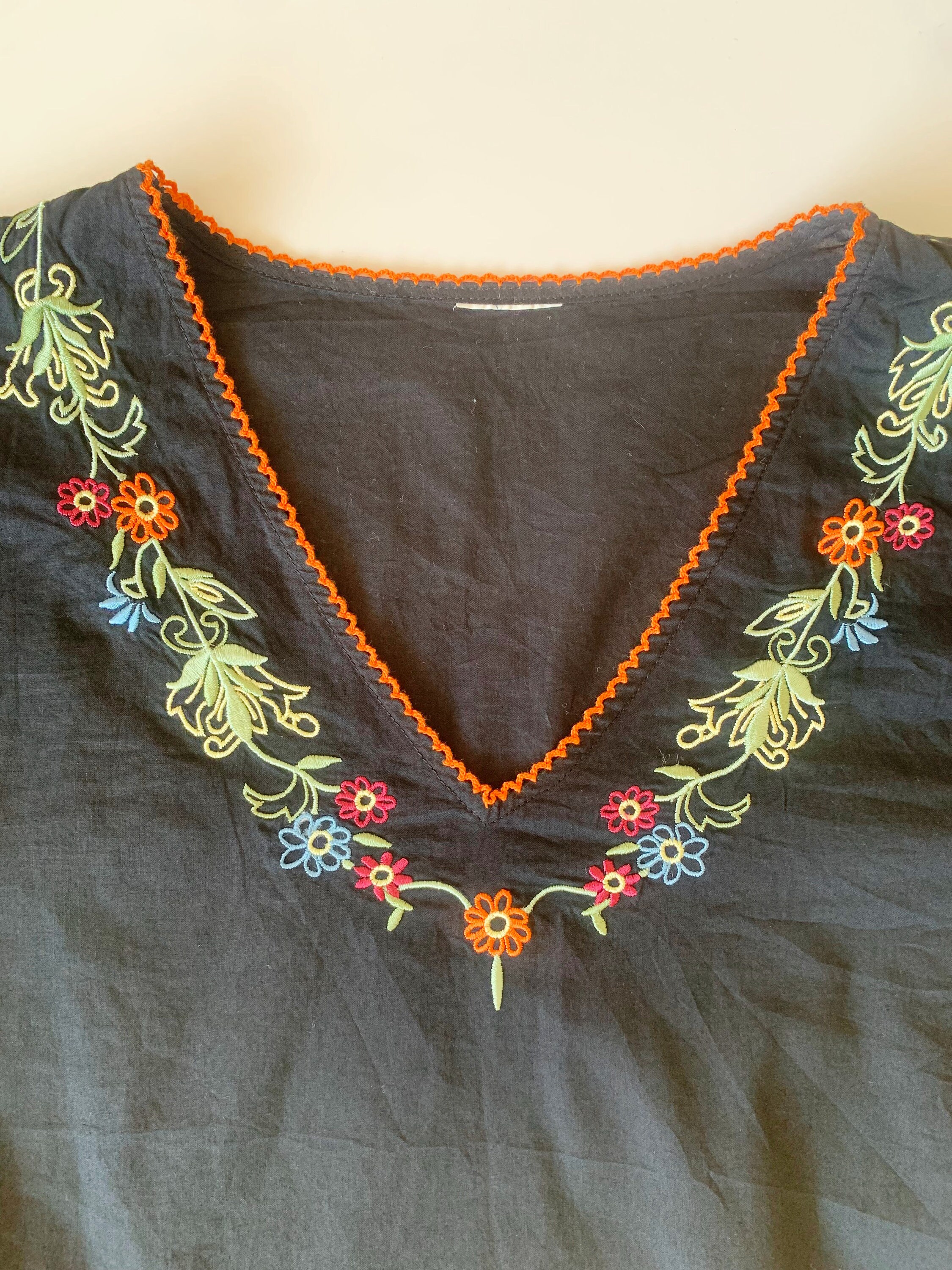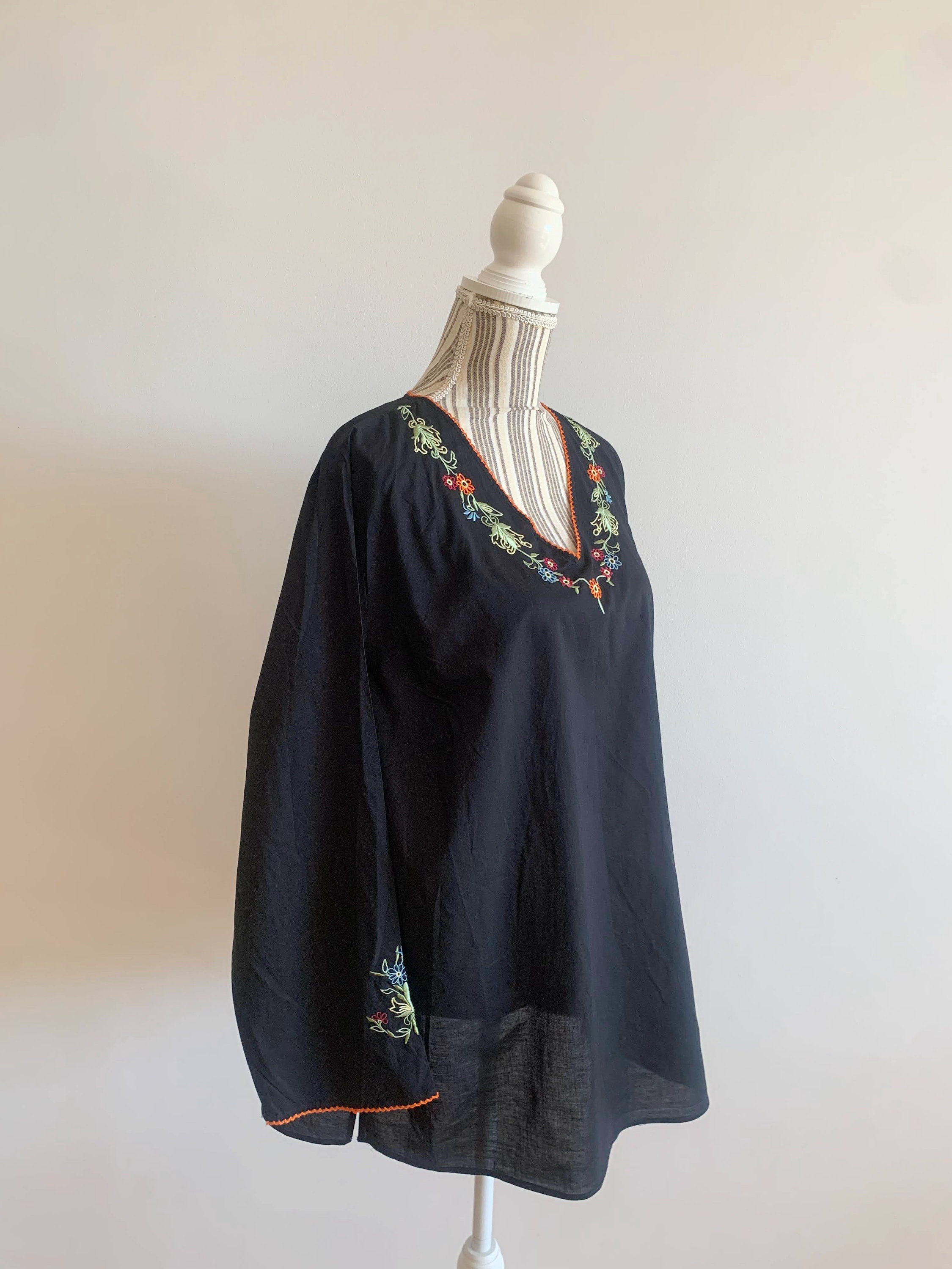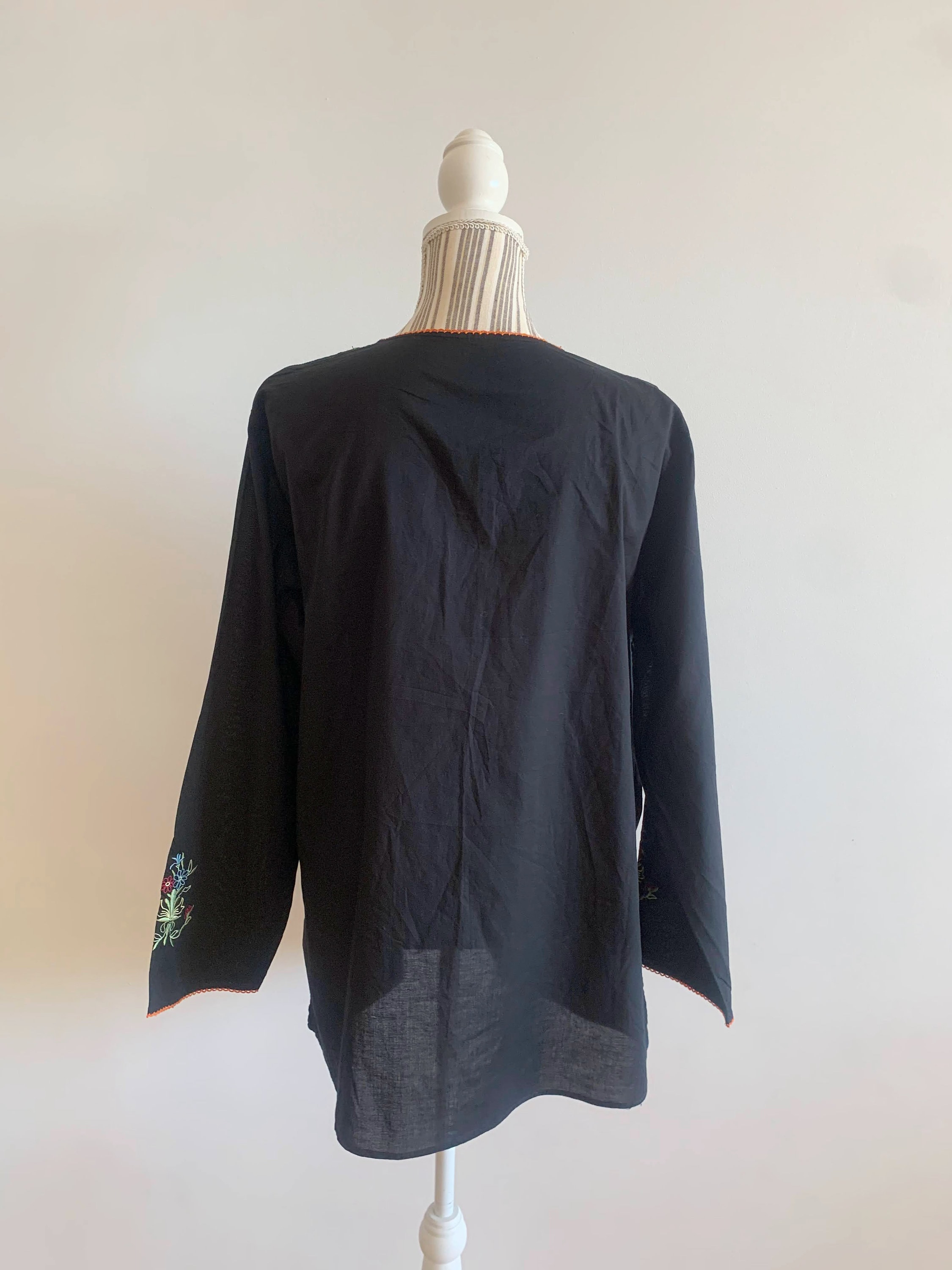 This is a beautiful vintage 90s embroidered pure cotton long sleeve shirt for women. This boho style blouse has a loose fit silhouette with lovely floral embroidery around the v neck and the sleeves. This ethnic bohemian blouse is made of pure cotton fabric. This ladies festival shirt fits like size XL, please check the measurements below.