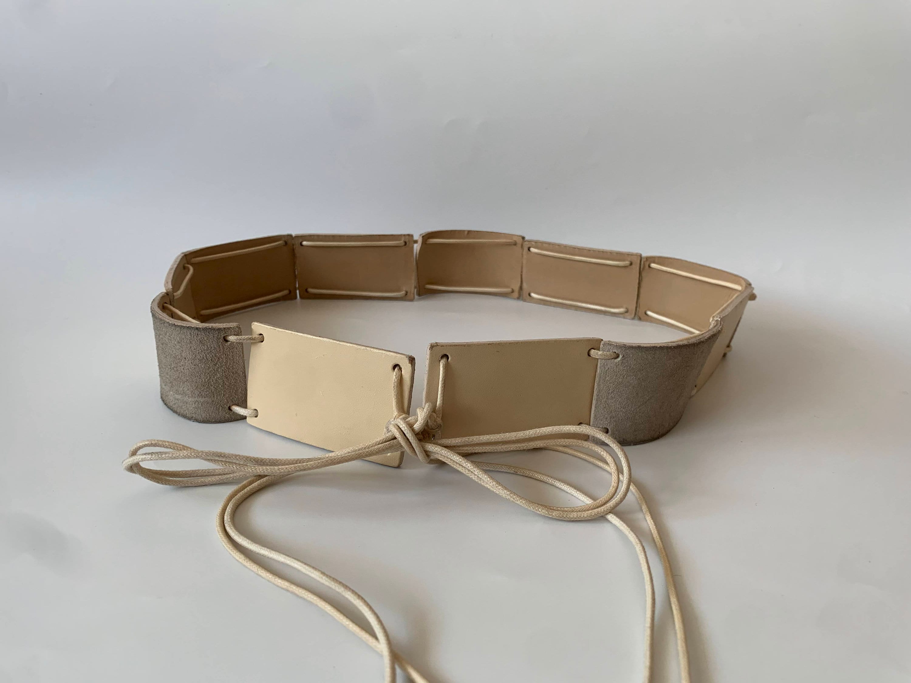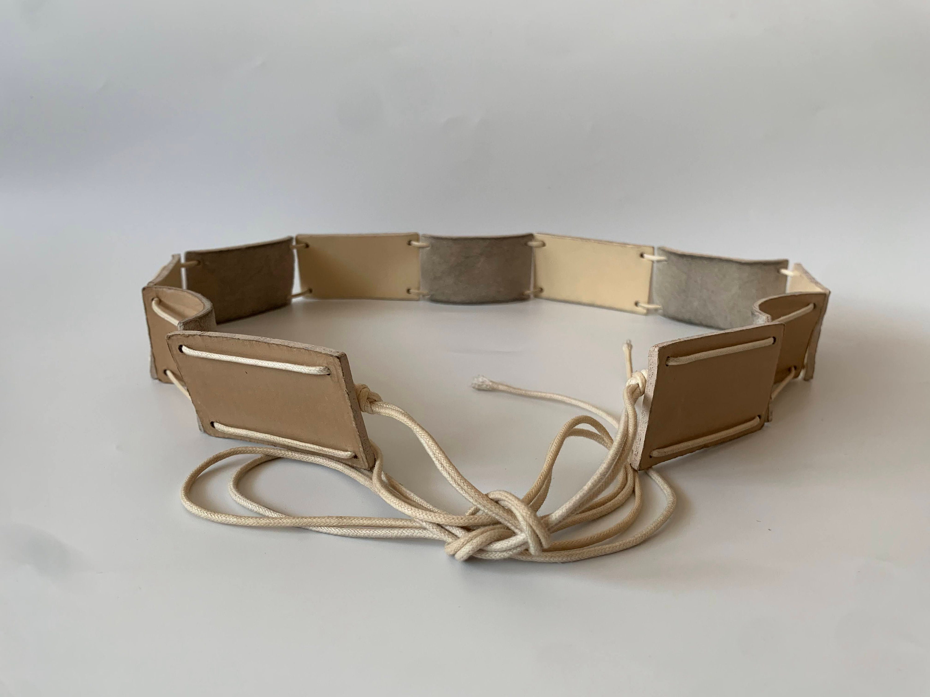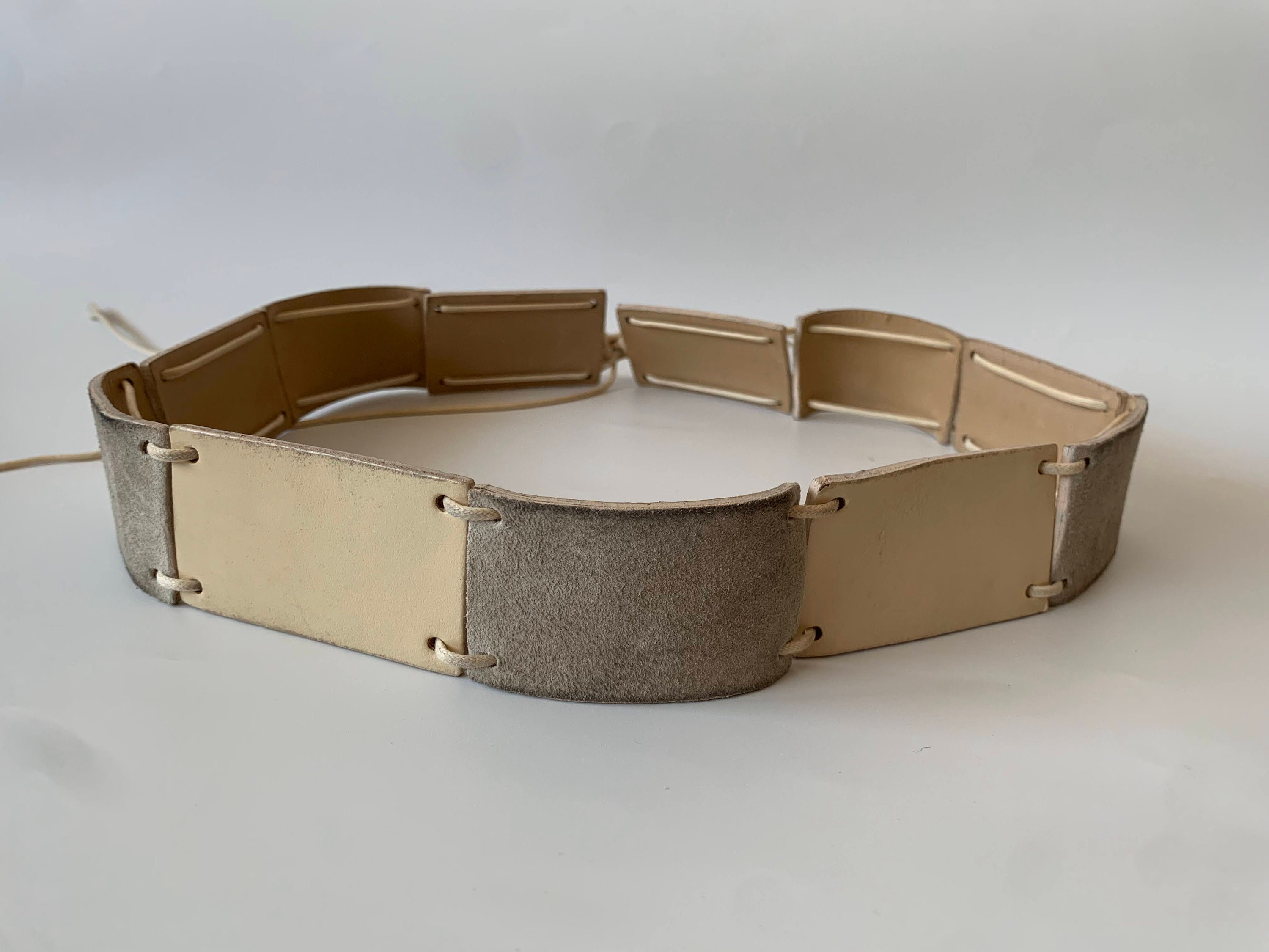 Condition: This boho belt has a distressed leather look with multiple scratches and cracks around the edges of the recnagular pieces of leather. There are some creases too. The suede leather plates show darkening around the edged. The ties show some darkening too.