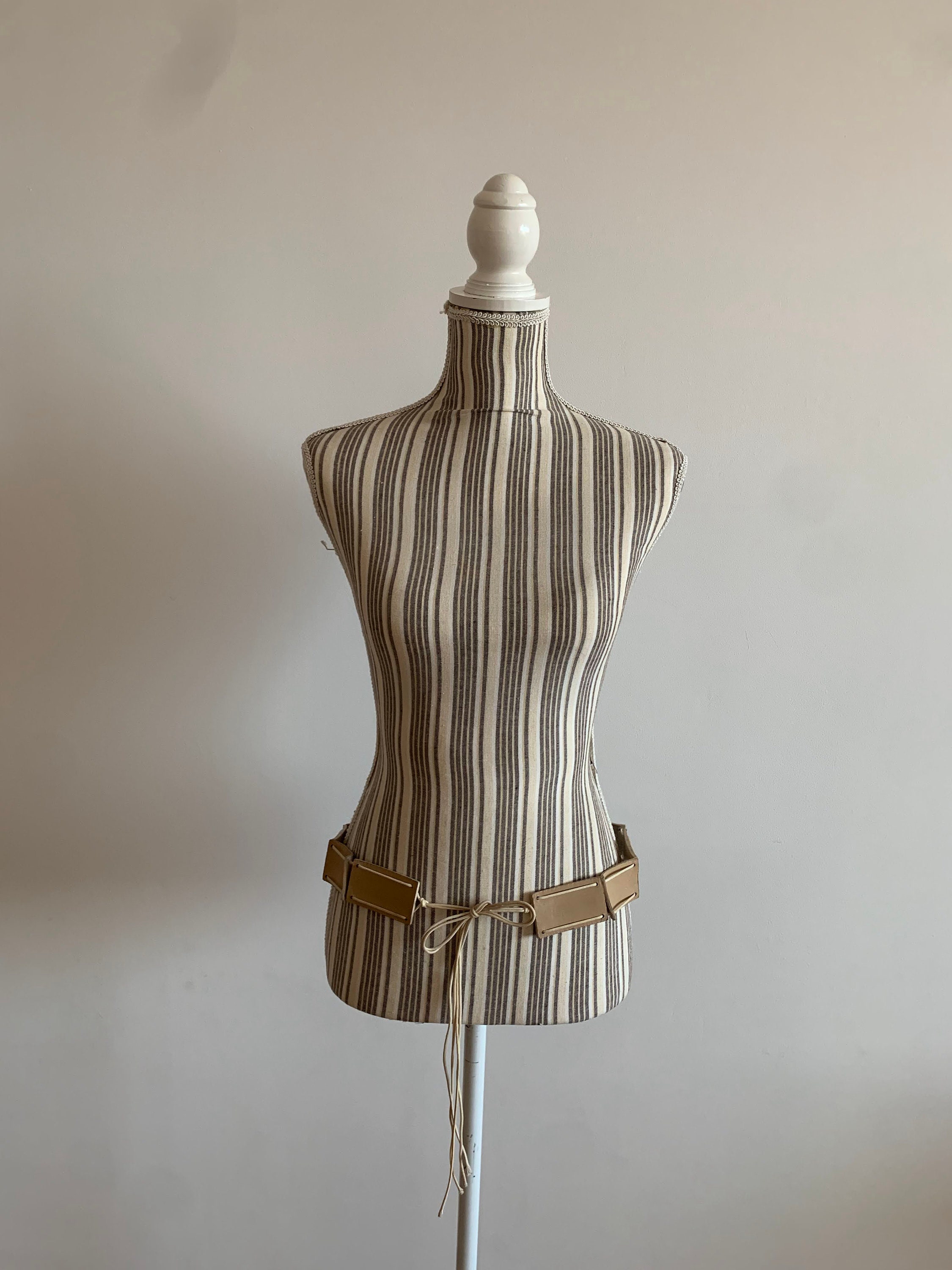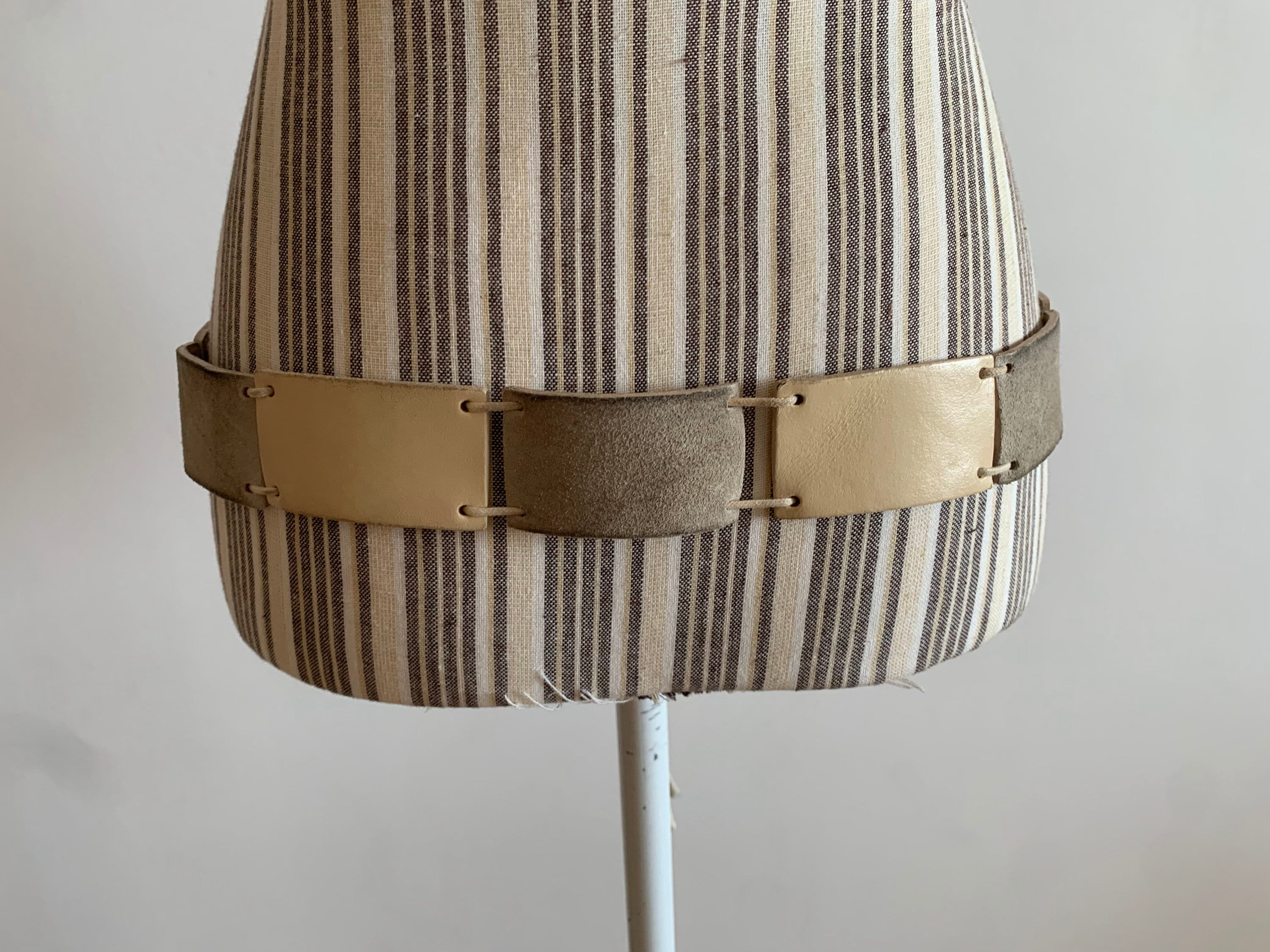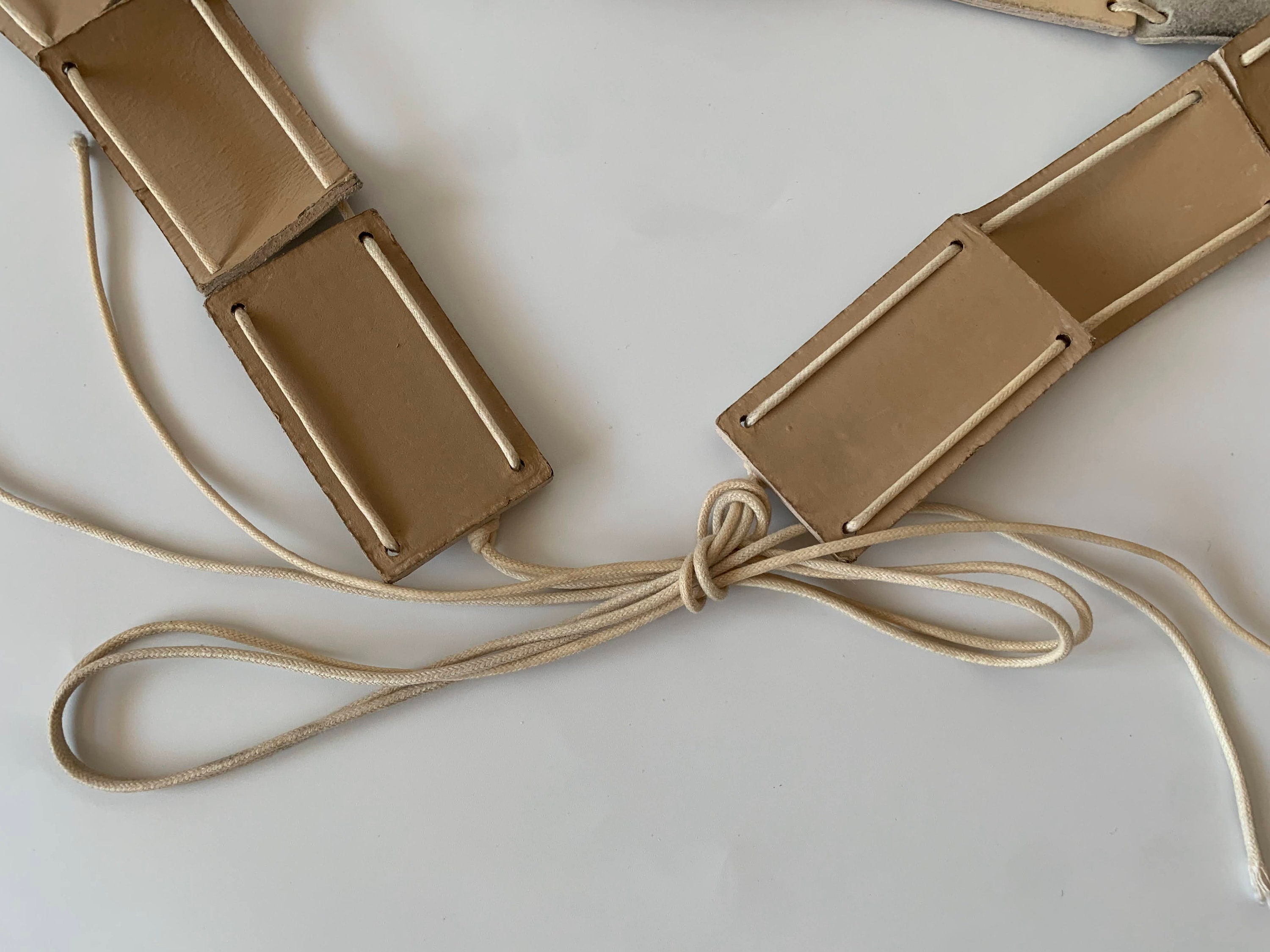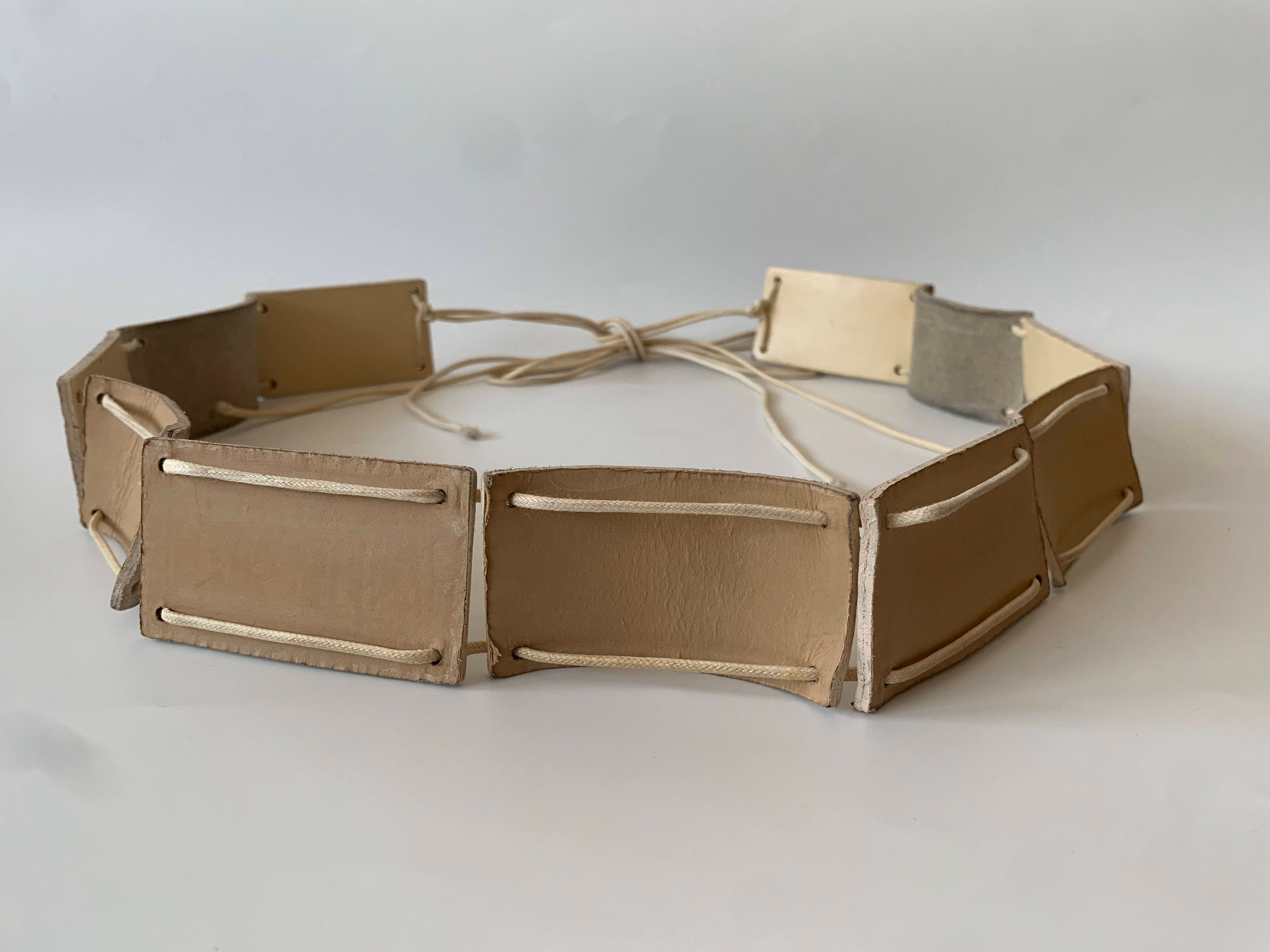Condition: This boho belt has a distressed leather look with multiple scratches and cracks around the edges of the recnagular pieces of leather. There are some creases too. The suede leather plates show darkening around the edged. The ties show some darkening too.