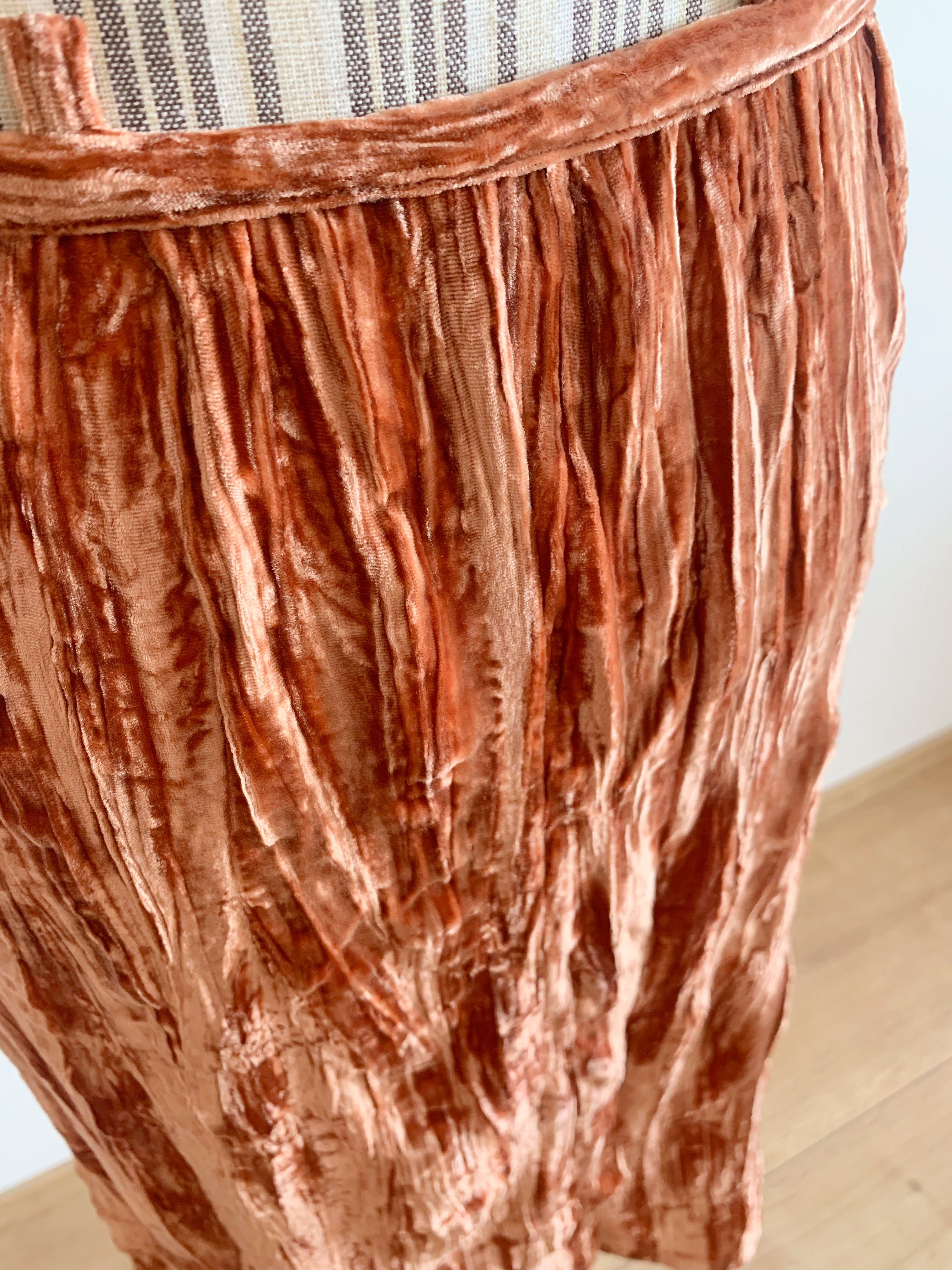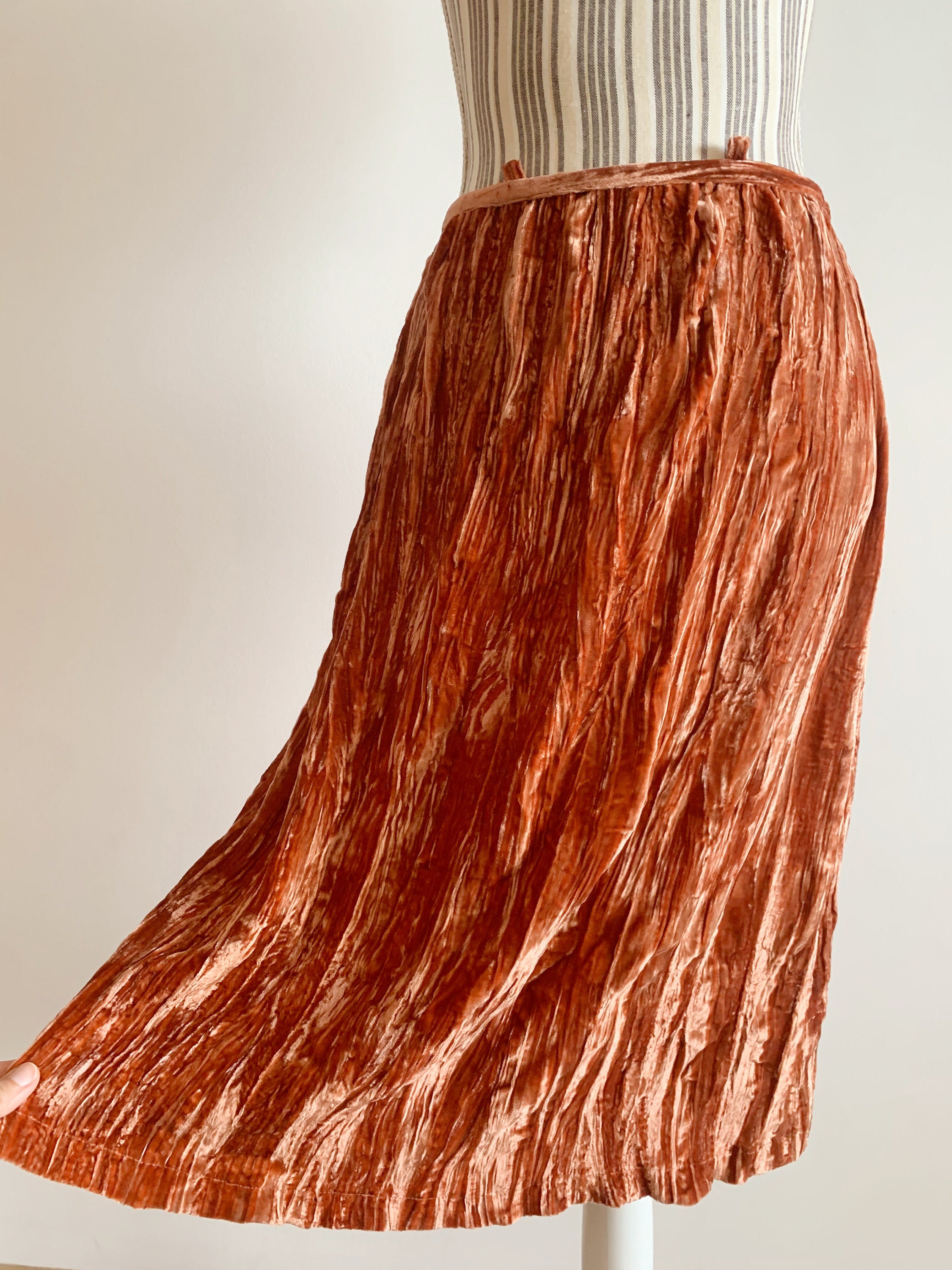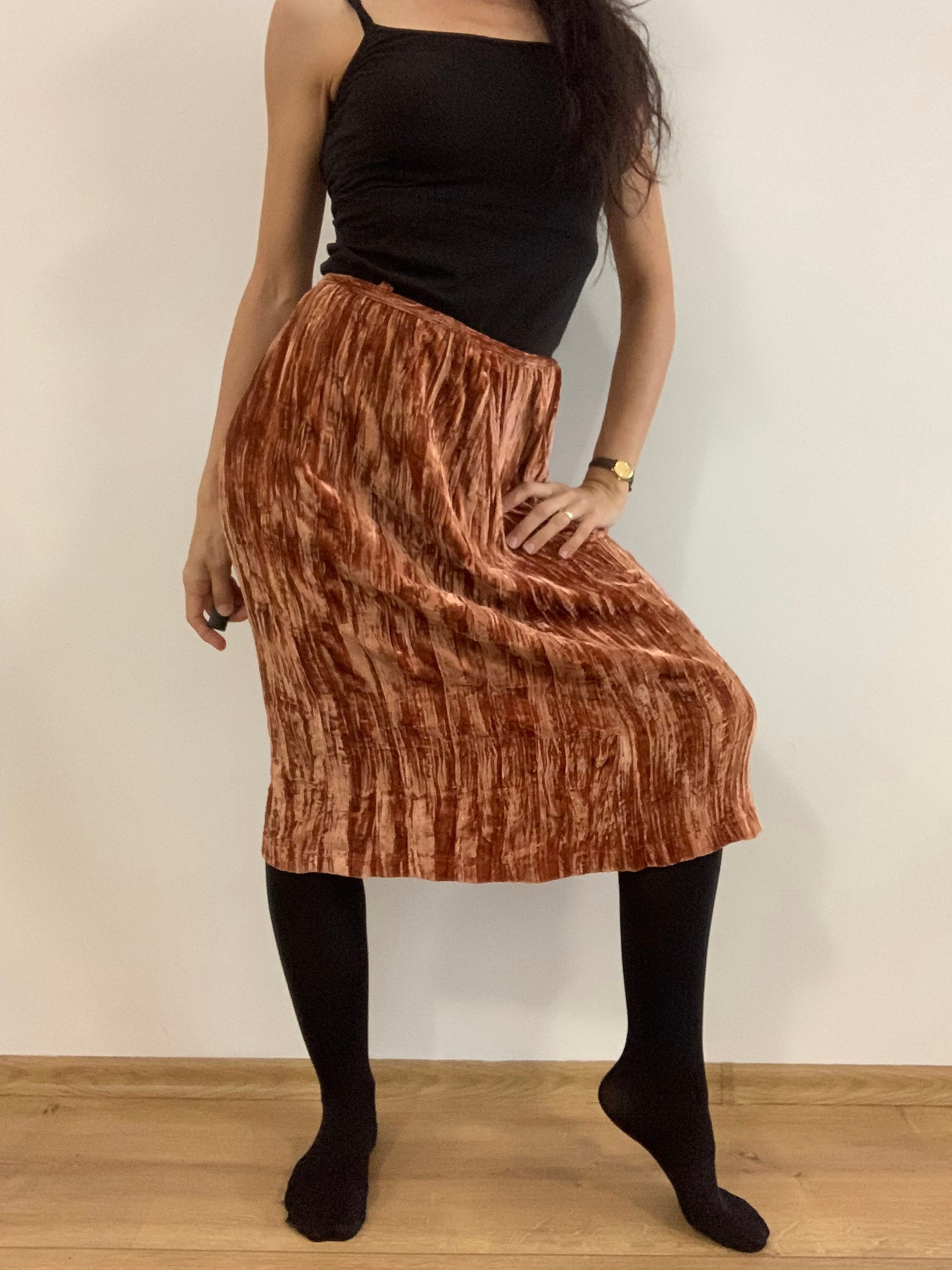grunge midi skirt is made of beautiful burnt orange color velvet fabric, made of 82% viscose and 18% silk. This crepe shiny velvet skirt has no lining underneath. It has side zip closure. This crinkled velvet skirt falls to below the knees. The size marked is 38, which fits like S or M. Please check the measurements below.