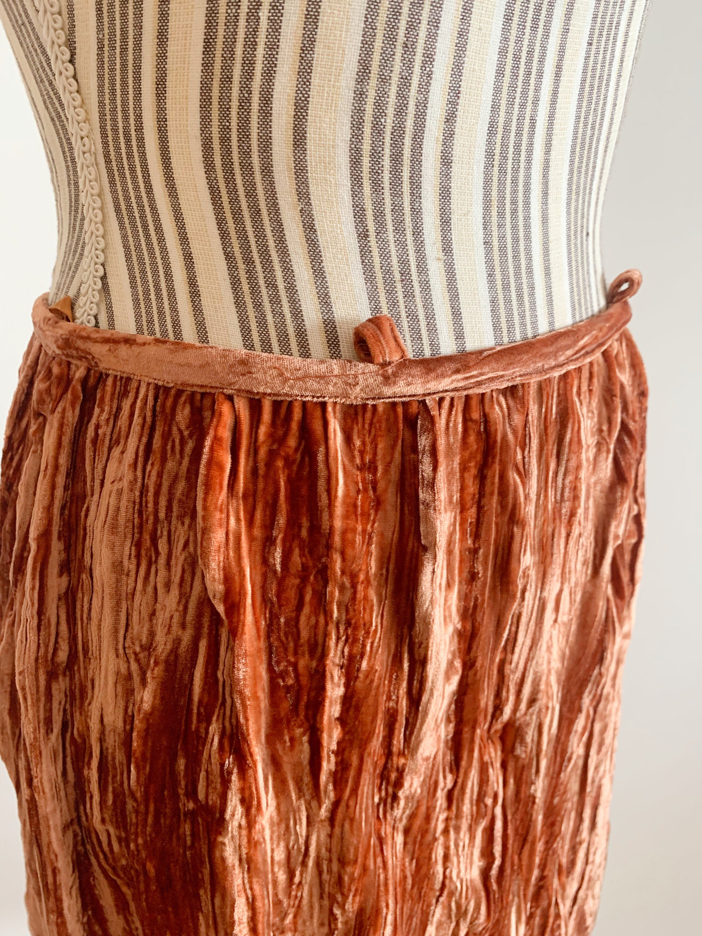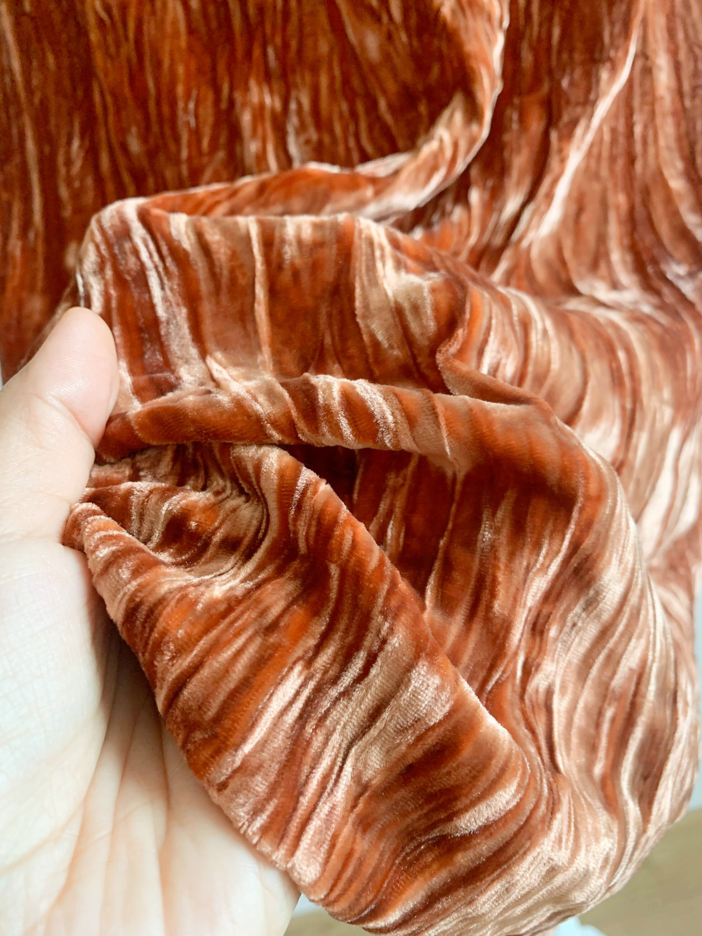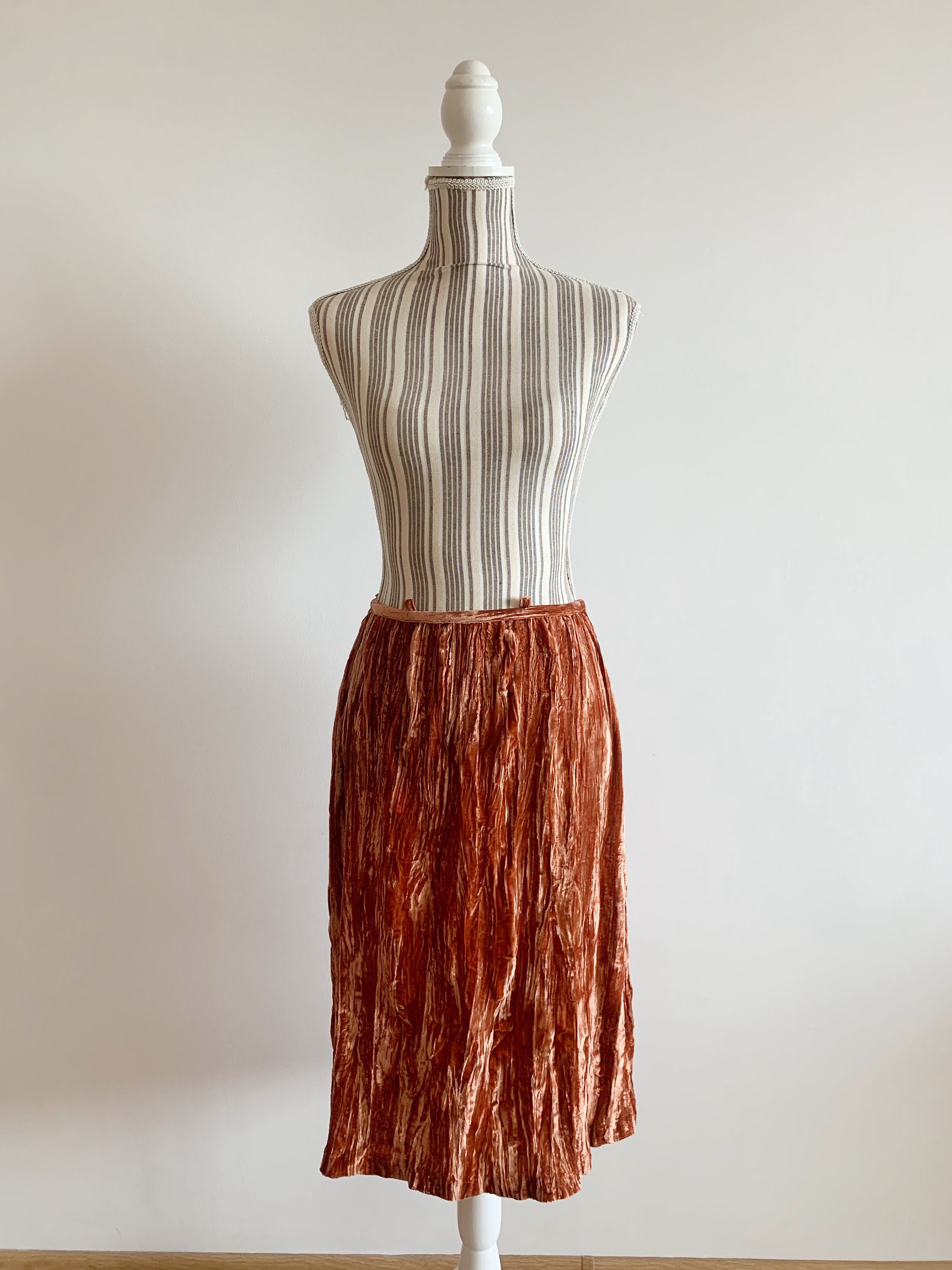 grunge midi skirt is made of beautiful burnt orange color velvet fabric, made of 82% viscose and 18% silk. This crepe shiny velvet skirt has no lining underneath. It has side zip closure. This crinkled velvet skirt falls to below the knees. The size marked is 38, which fits like S or M. Please check the measurements below.