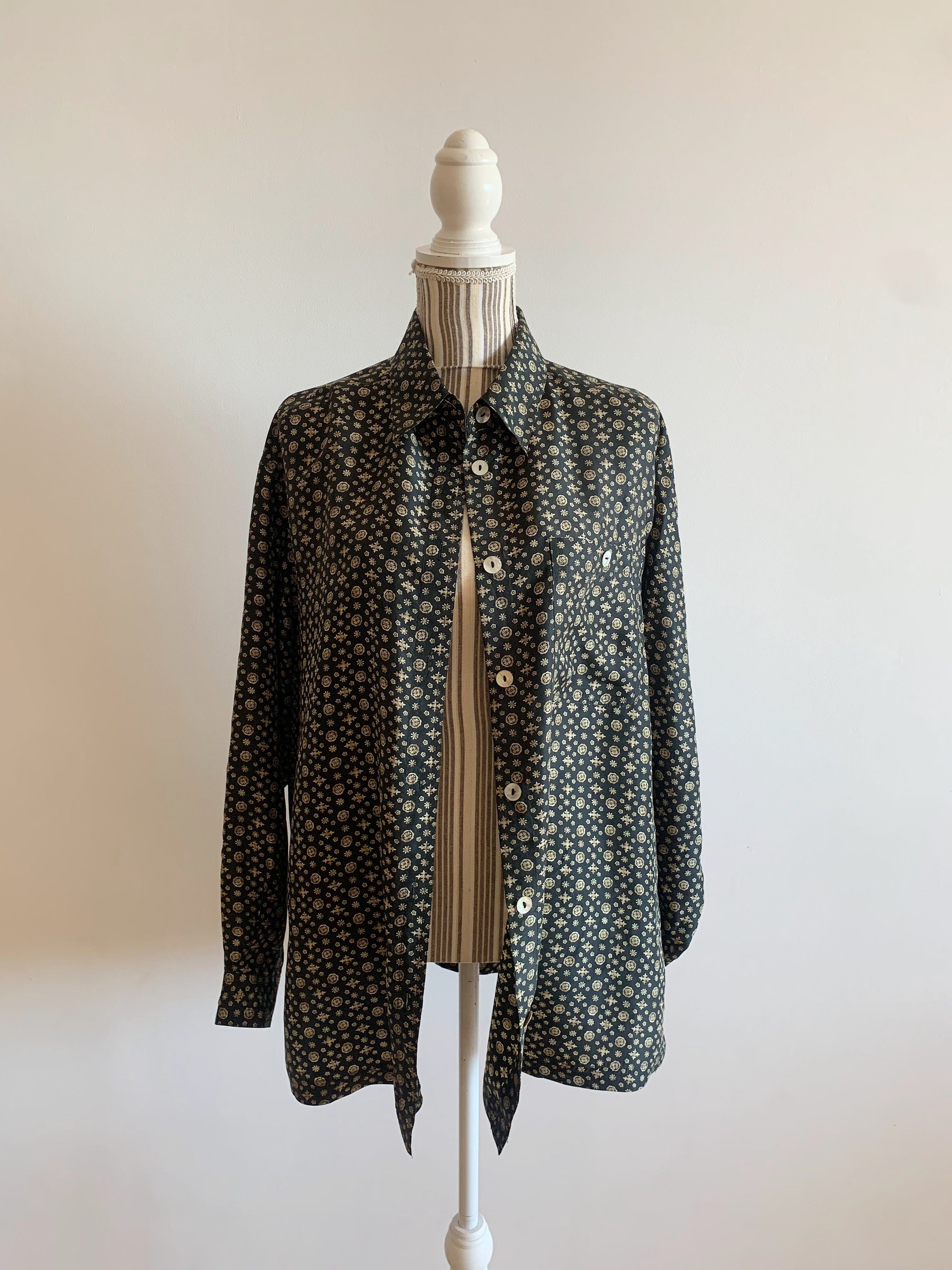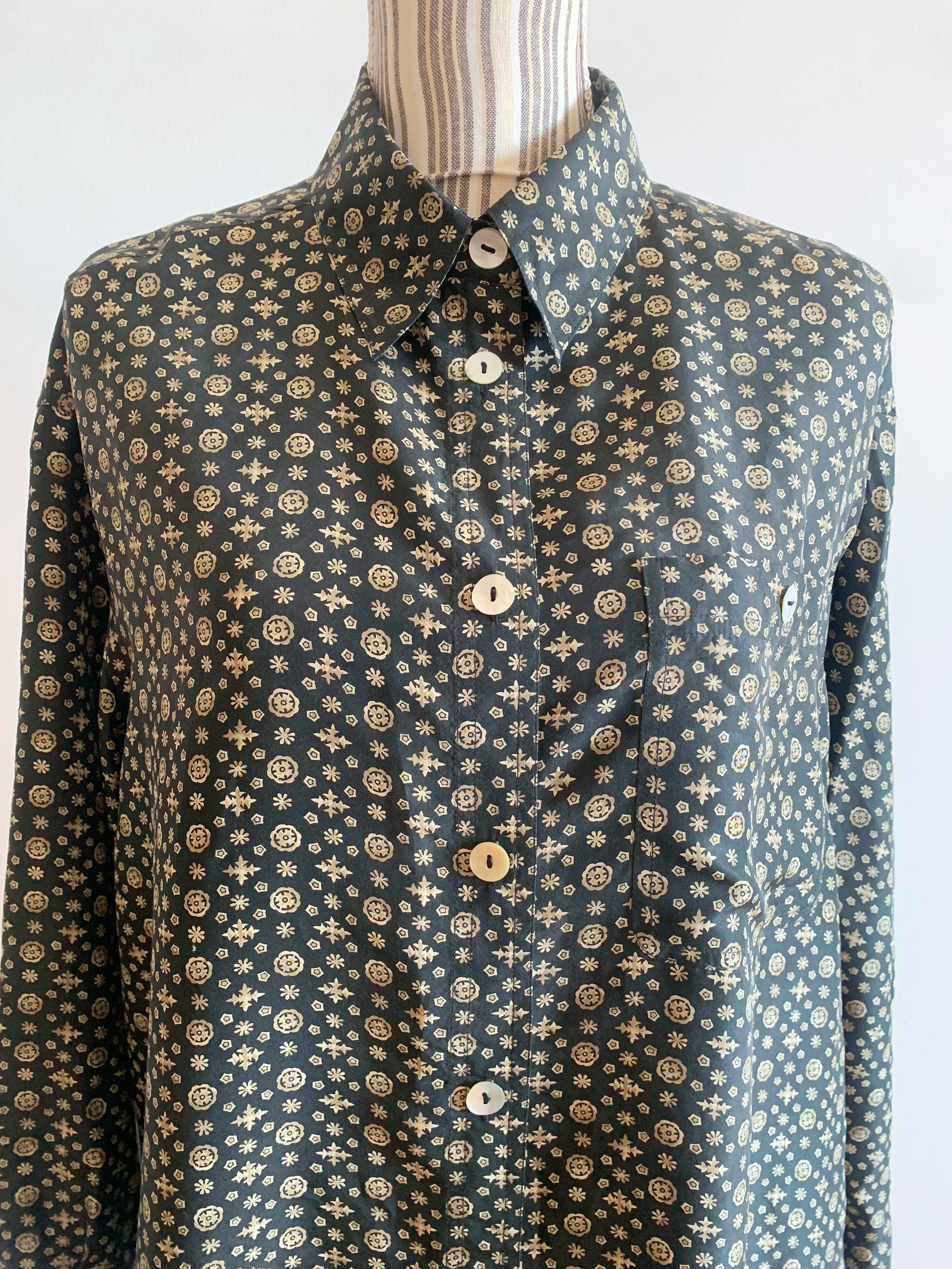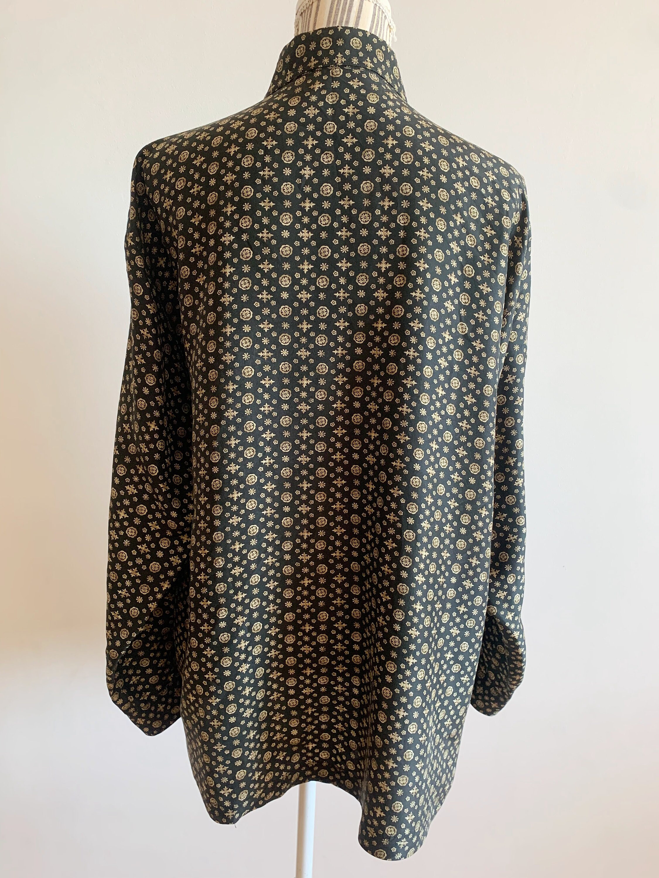 This is an amazing vintage 90s black pure silk button down shirt with tiny gold pale yellow abstract floral print. This pretty natural silk blouse is made of 100% silk fabric which has no stretch. This loose fit shirt has a relaxed boxy fit. It fits like size XL/ XXL womens. This collared shirt can be worn in so many different ways - you can wear it with elegant skirts or with simple jeans. It will look awesome and expensive anyway you want to wear it.