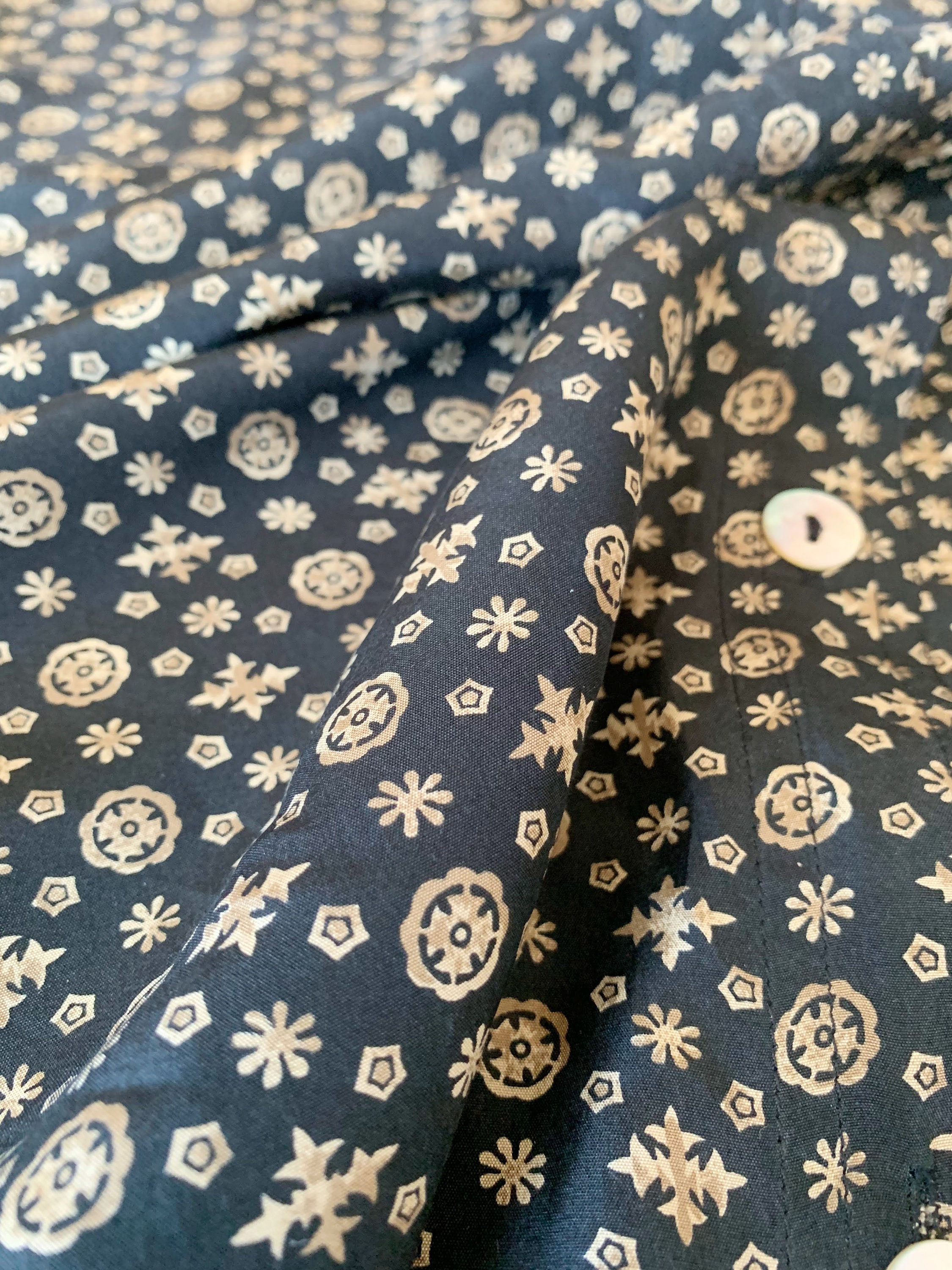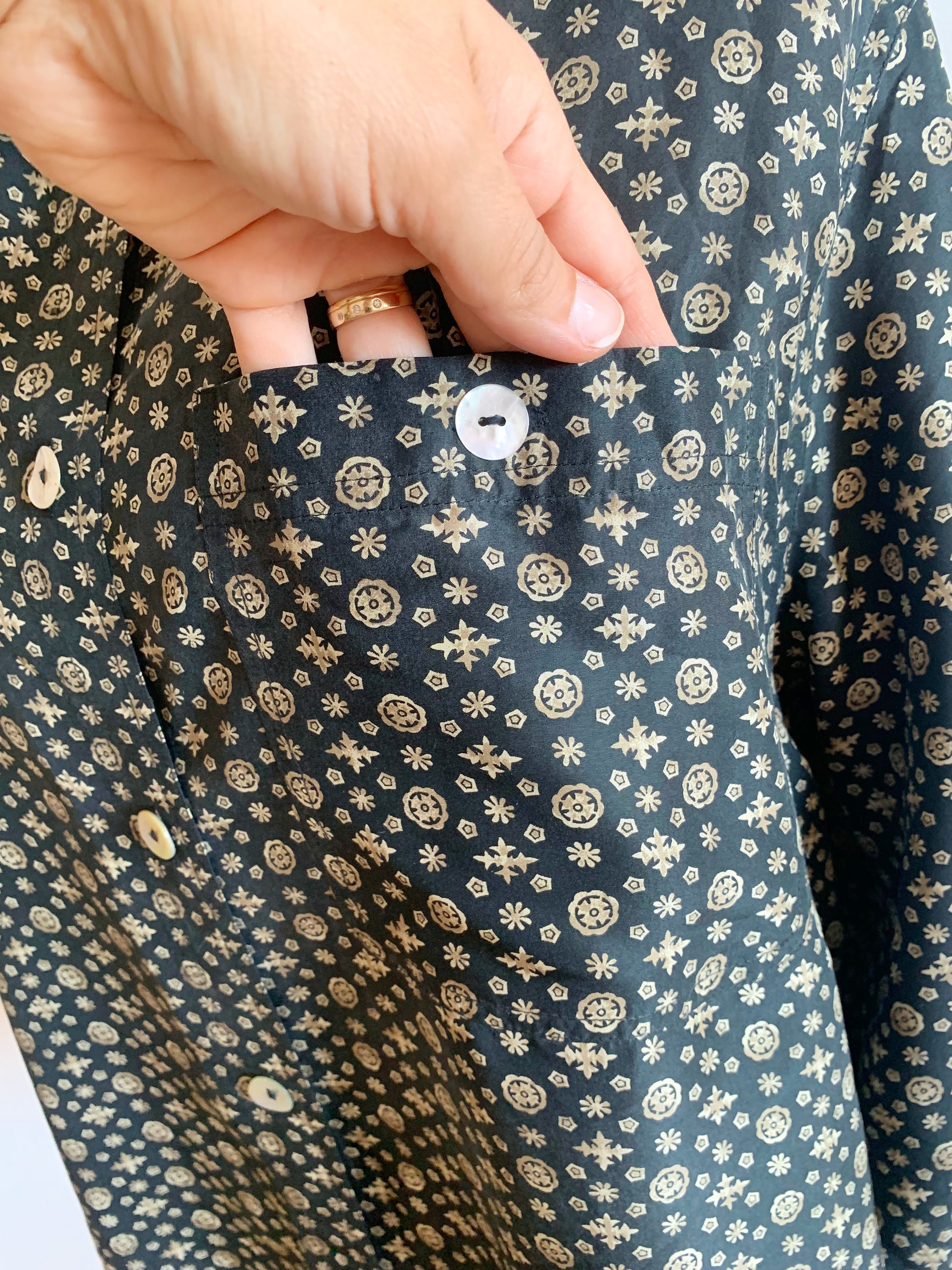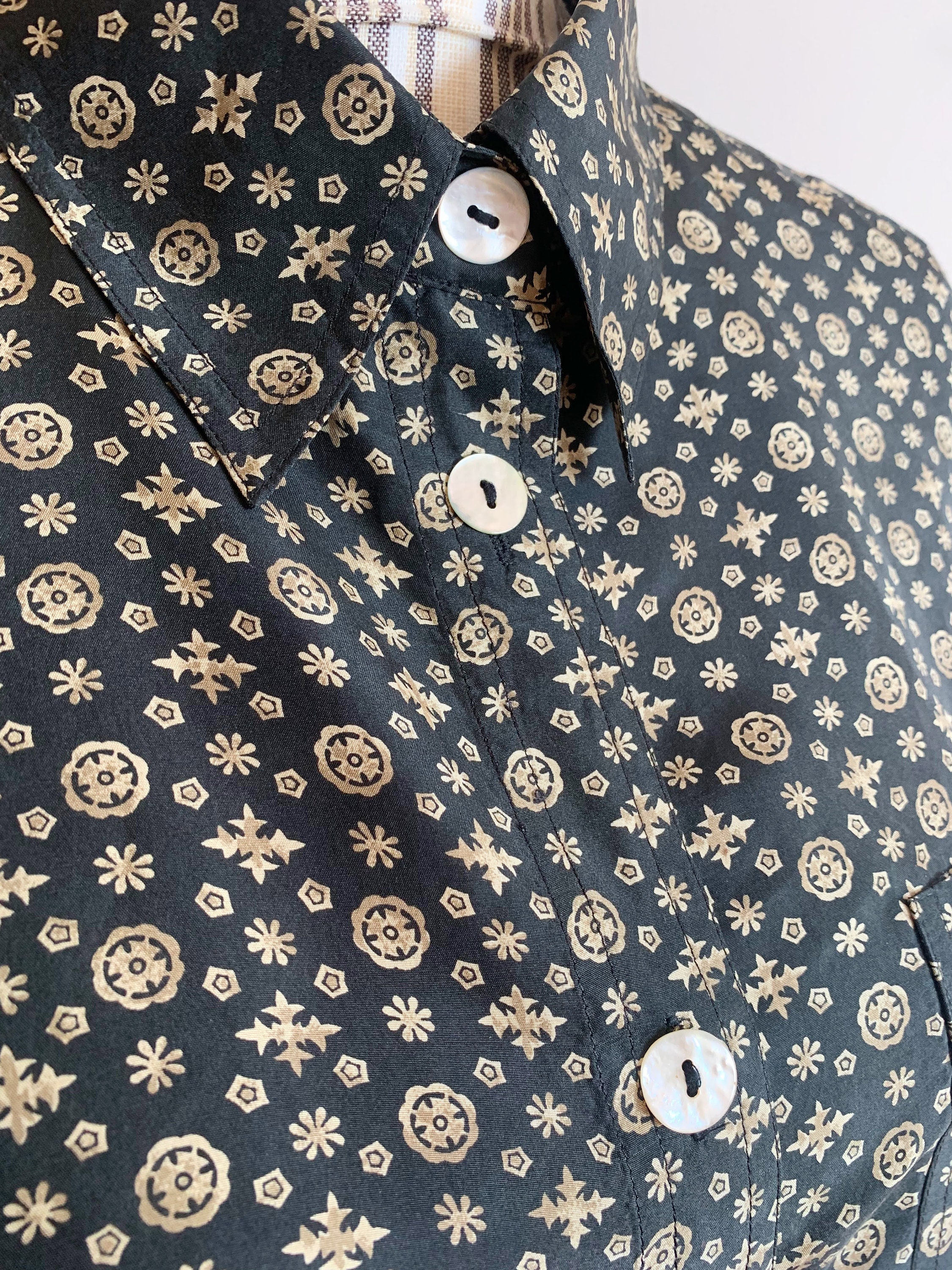 This is an amazing vintage 90s black pure silk button down shirt with tiny gold pale yellow abstract floral print. This pretty natural silk blouse is made of 100% silk fabric which has no stretch. This loose fit shirt has a relaxed boxy fit. It fits like size XL/ XXL womens. This collared shirt can be worn in so many different ways - you can wear it with elegant skirts or with simple jeans. It will look awesome and expensive anyway you want to wear it.