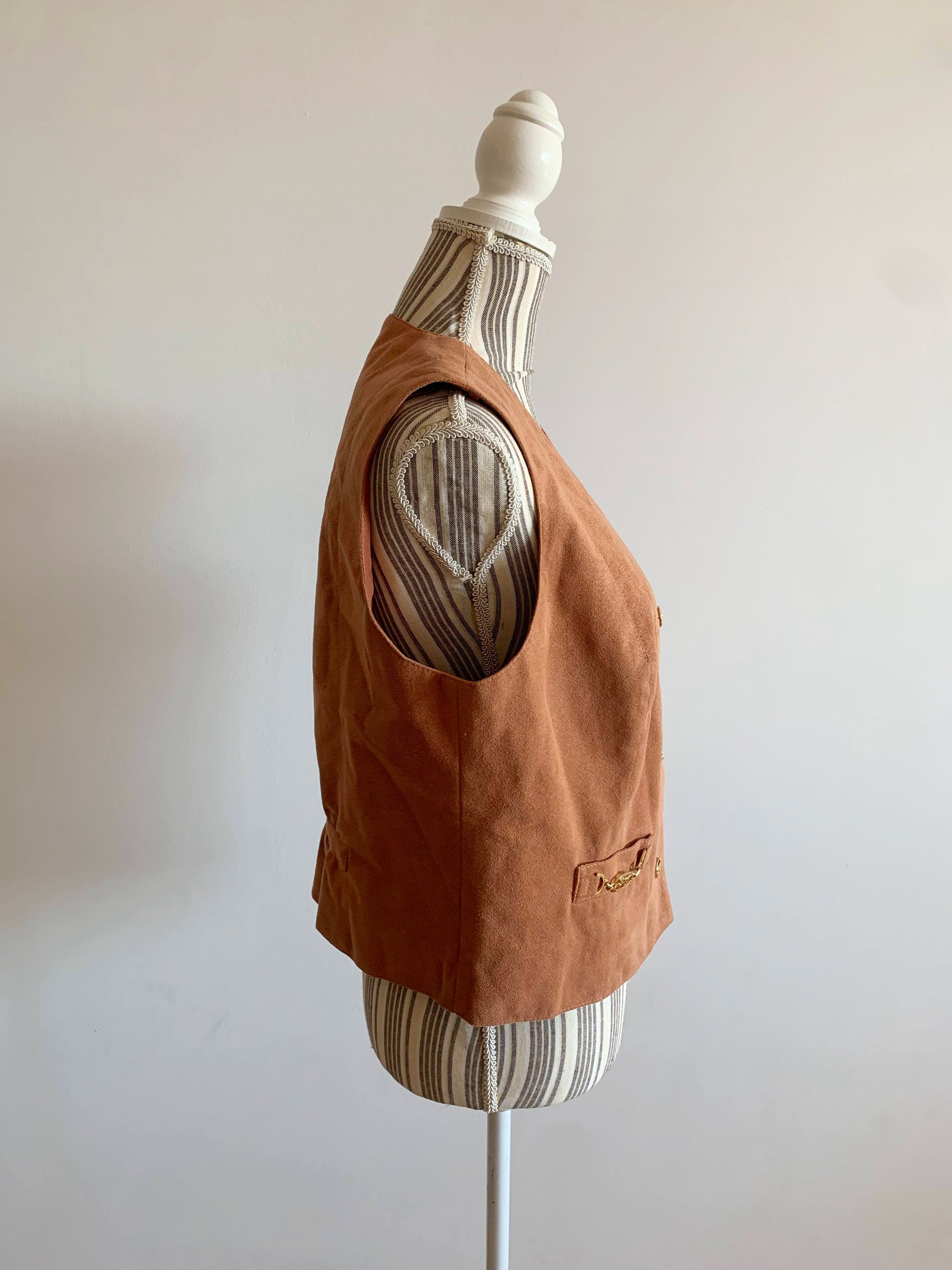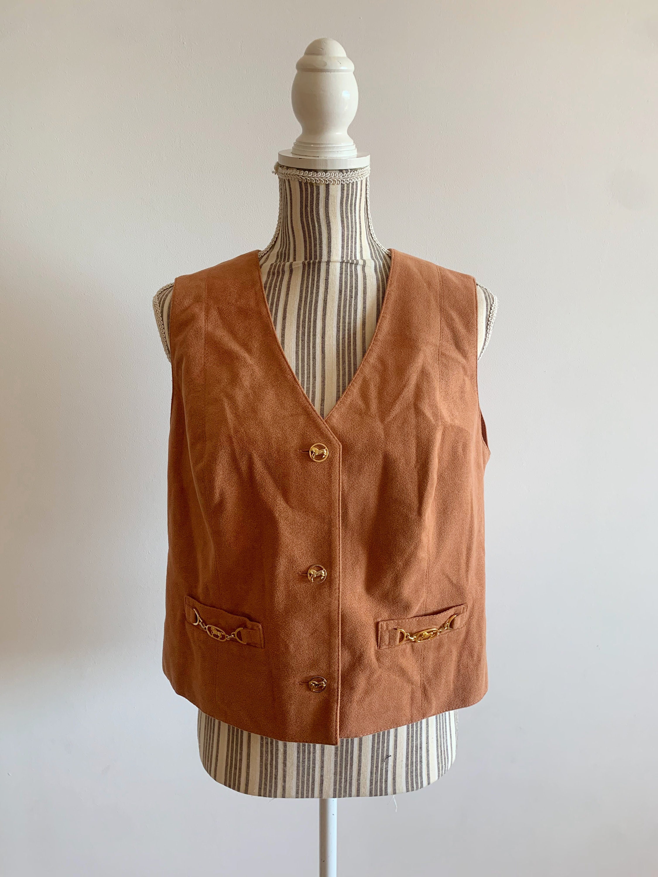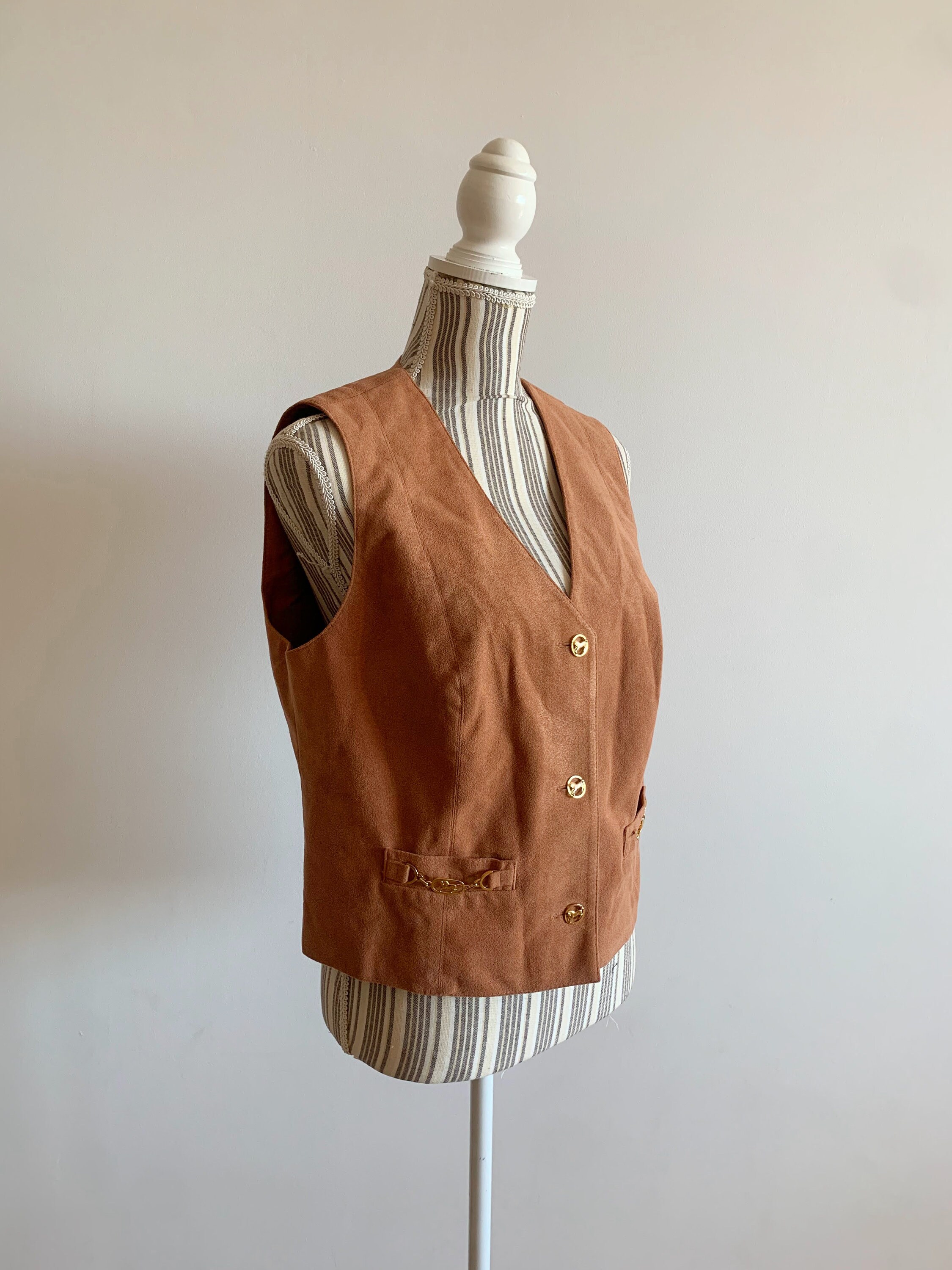 This is a beautiful camel brown waistcoat for women with gold tone equestrian buttons. This vintage 80s vest is made of polyester polyurethane blend fluffy fabric which feels a bit like faux suede. It has two front pockets and elasticated back. The size marked is 44 women's which fits like size M. Please check the measurements below.