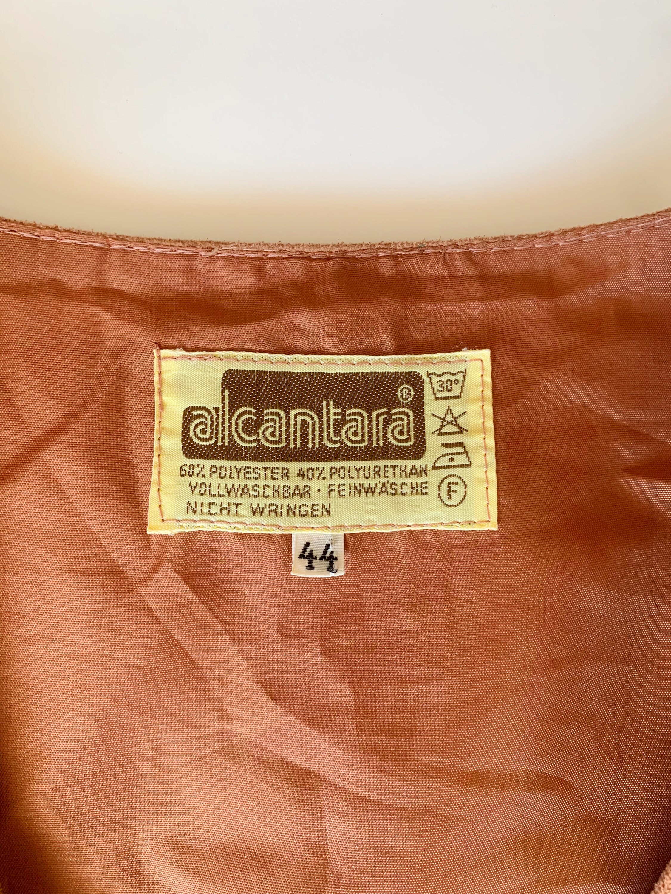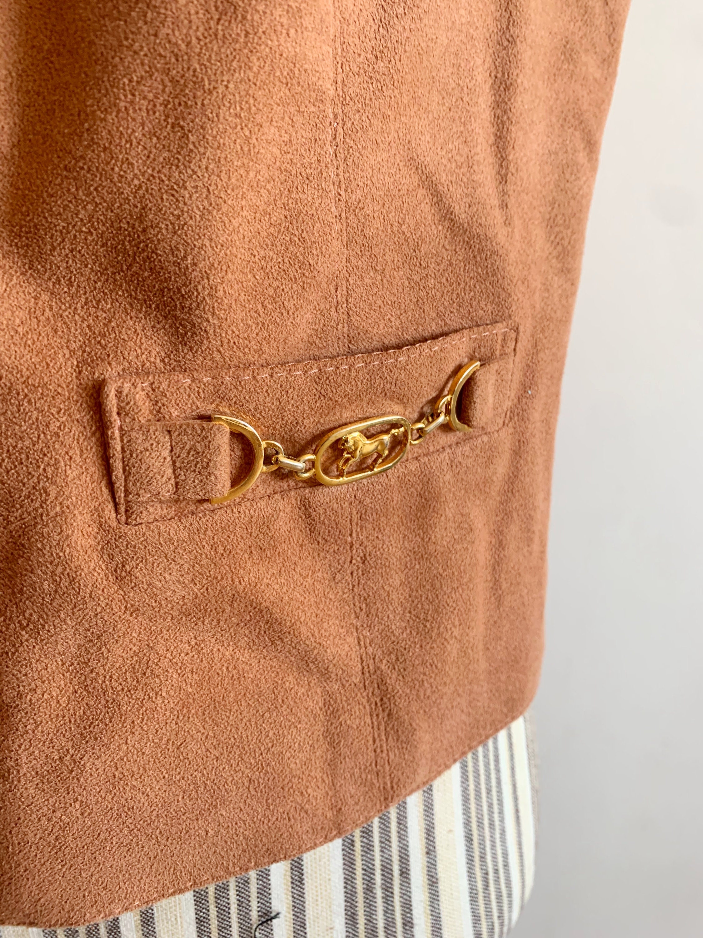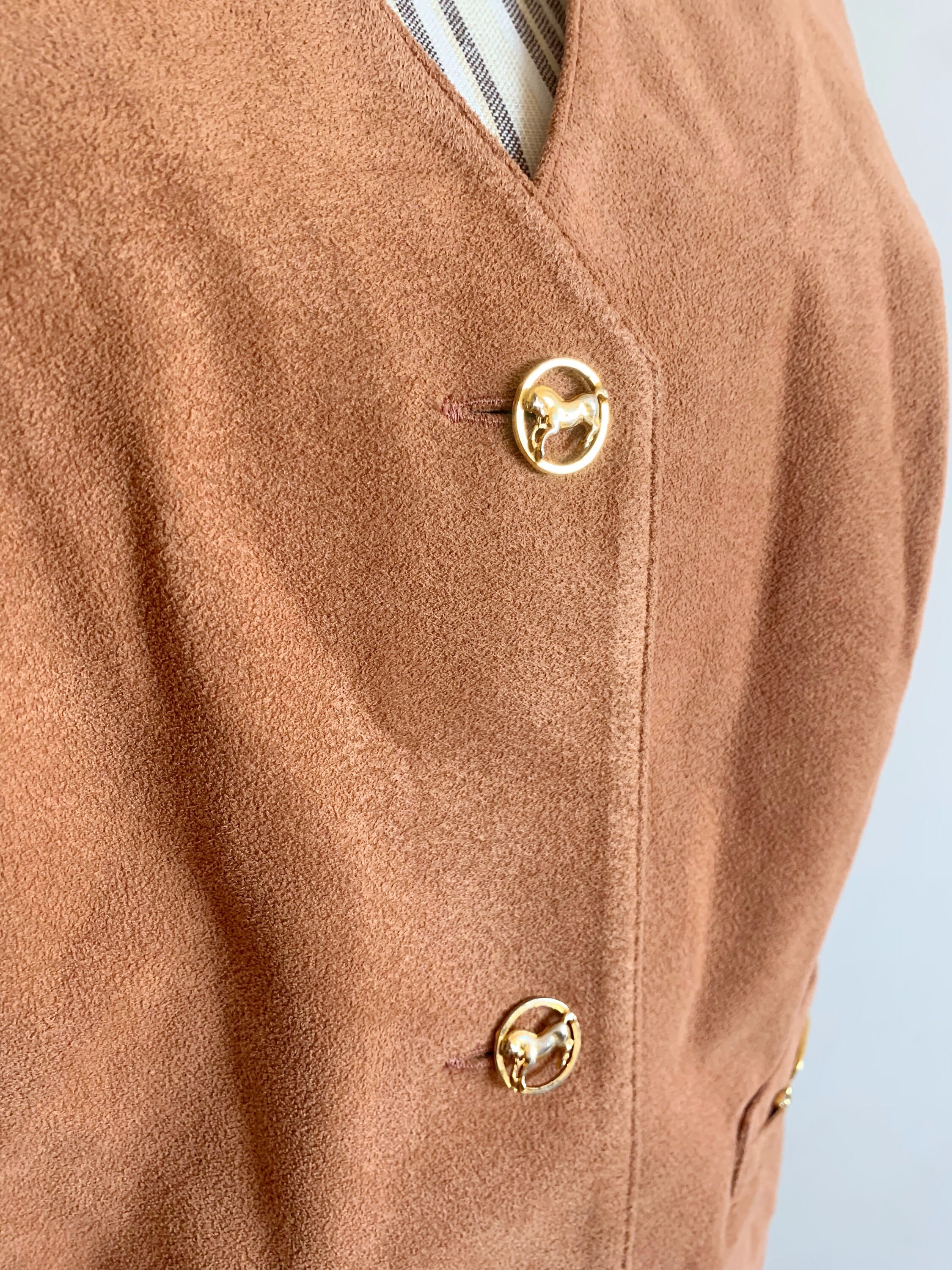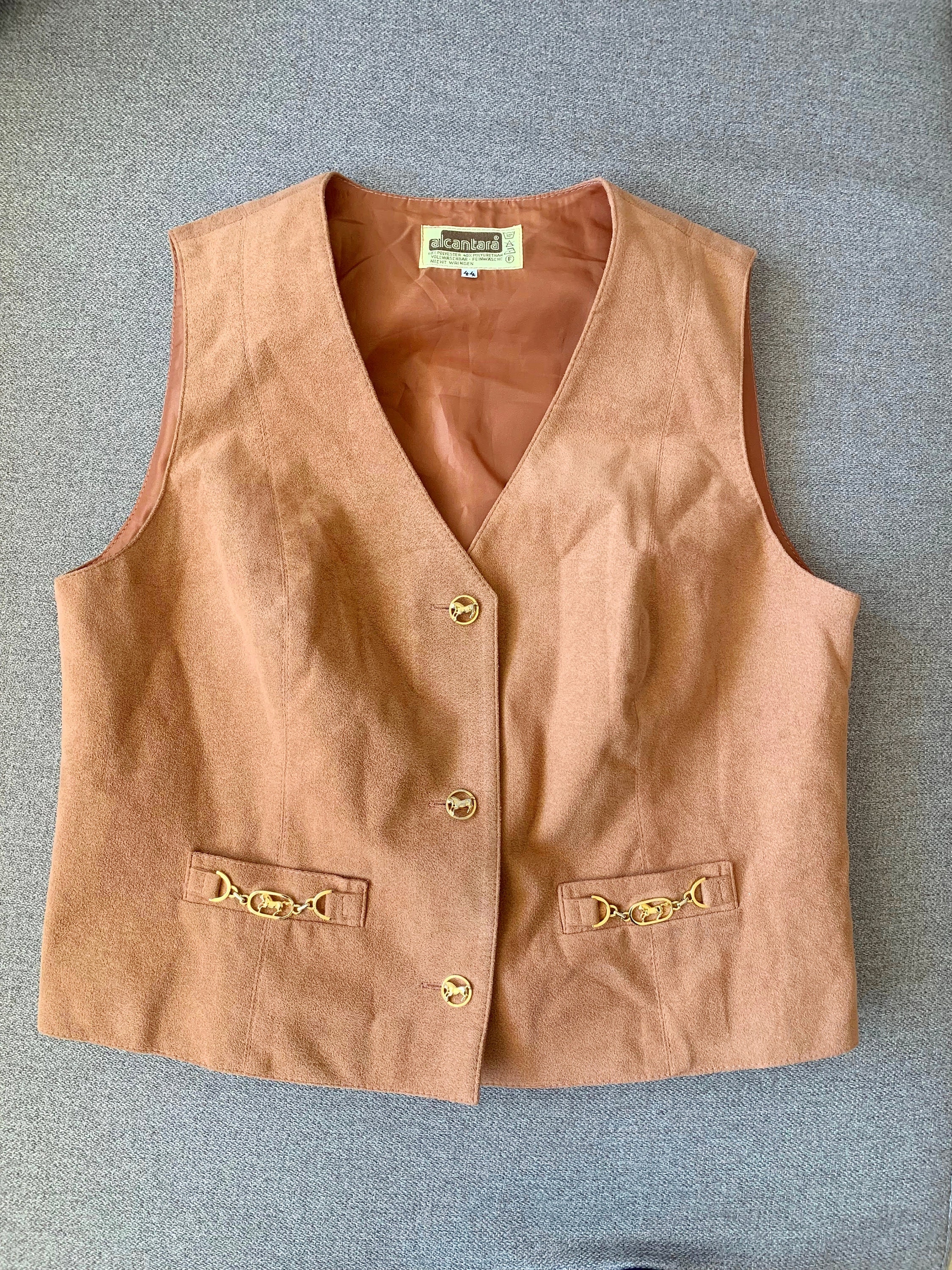 This is a beautiful camel brown waistcoat for women with gold tone equestrian buttons. This vintage 80s vest is made of polyester polyurethane blend fluffy fabric which feels a bit like faux suede. It has two front pockets and elasticated back. The size marked is 44 women's which fits like size M. Please check the measurements below.